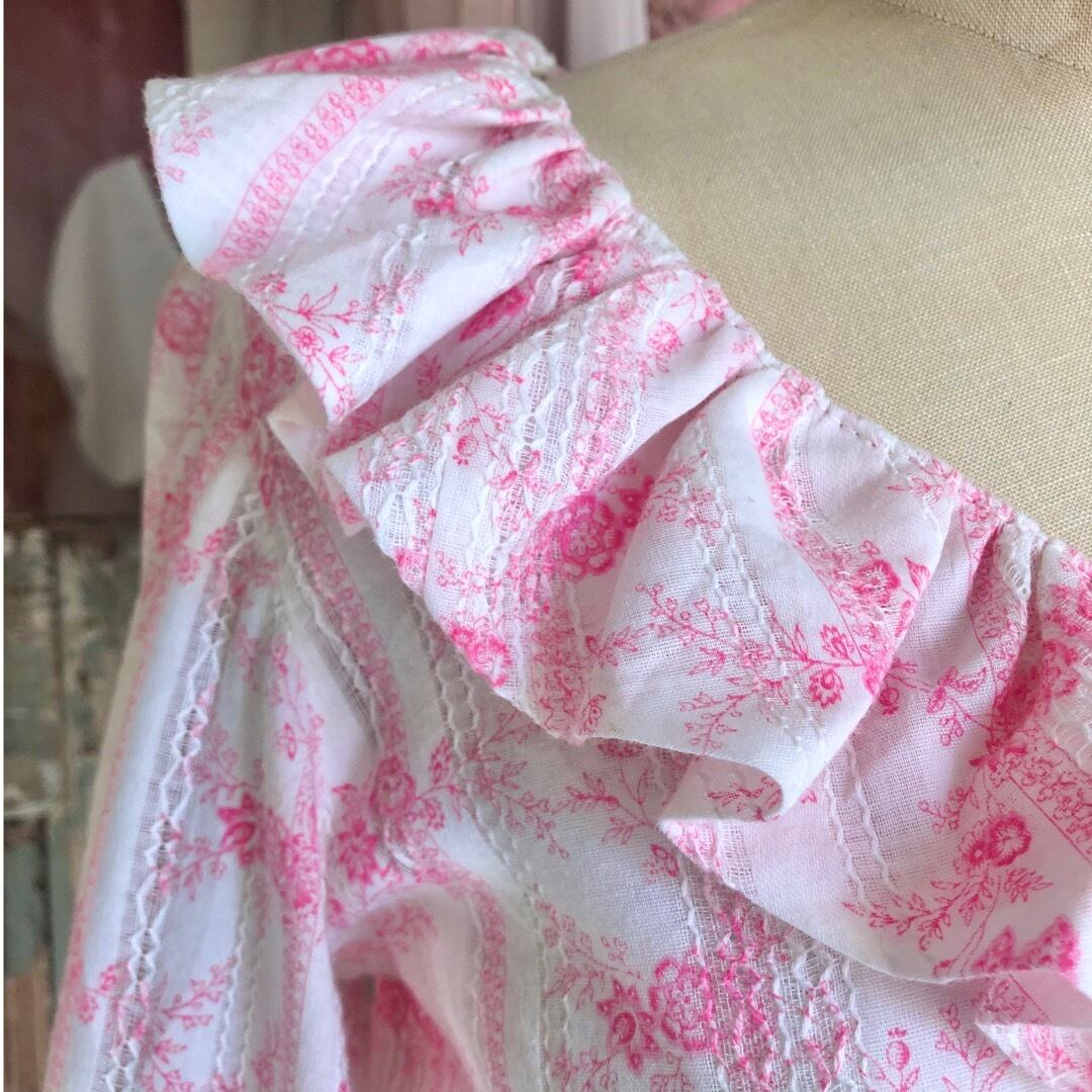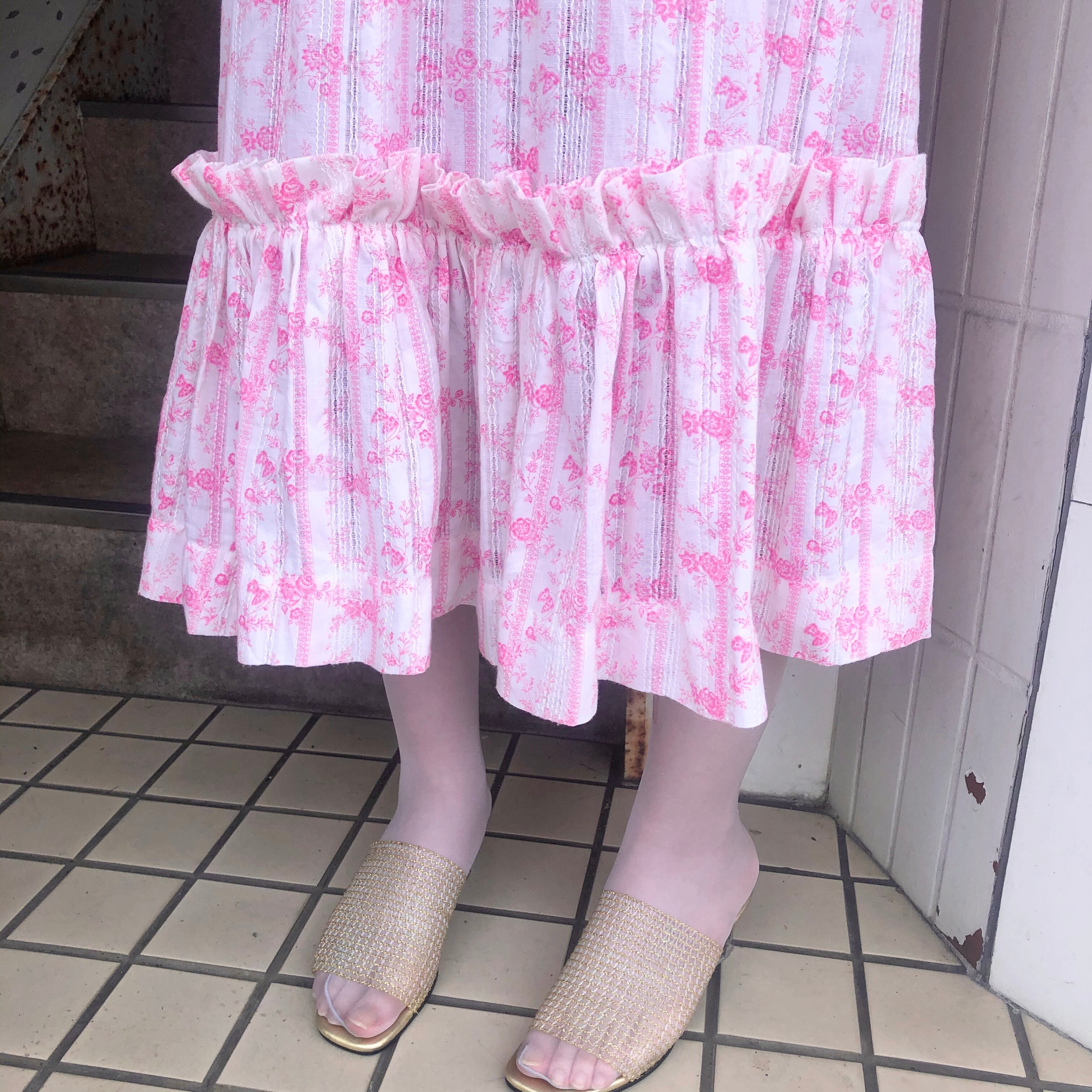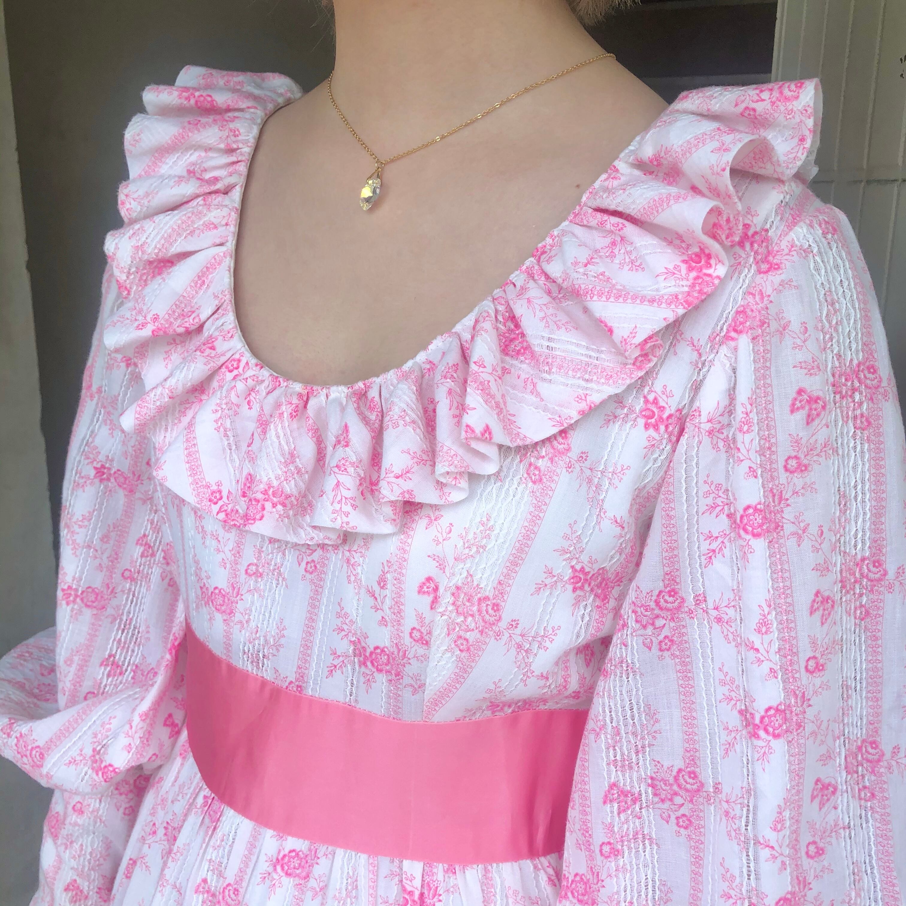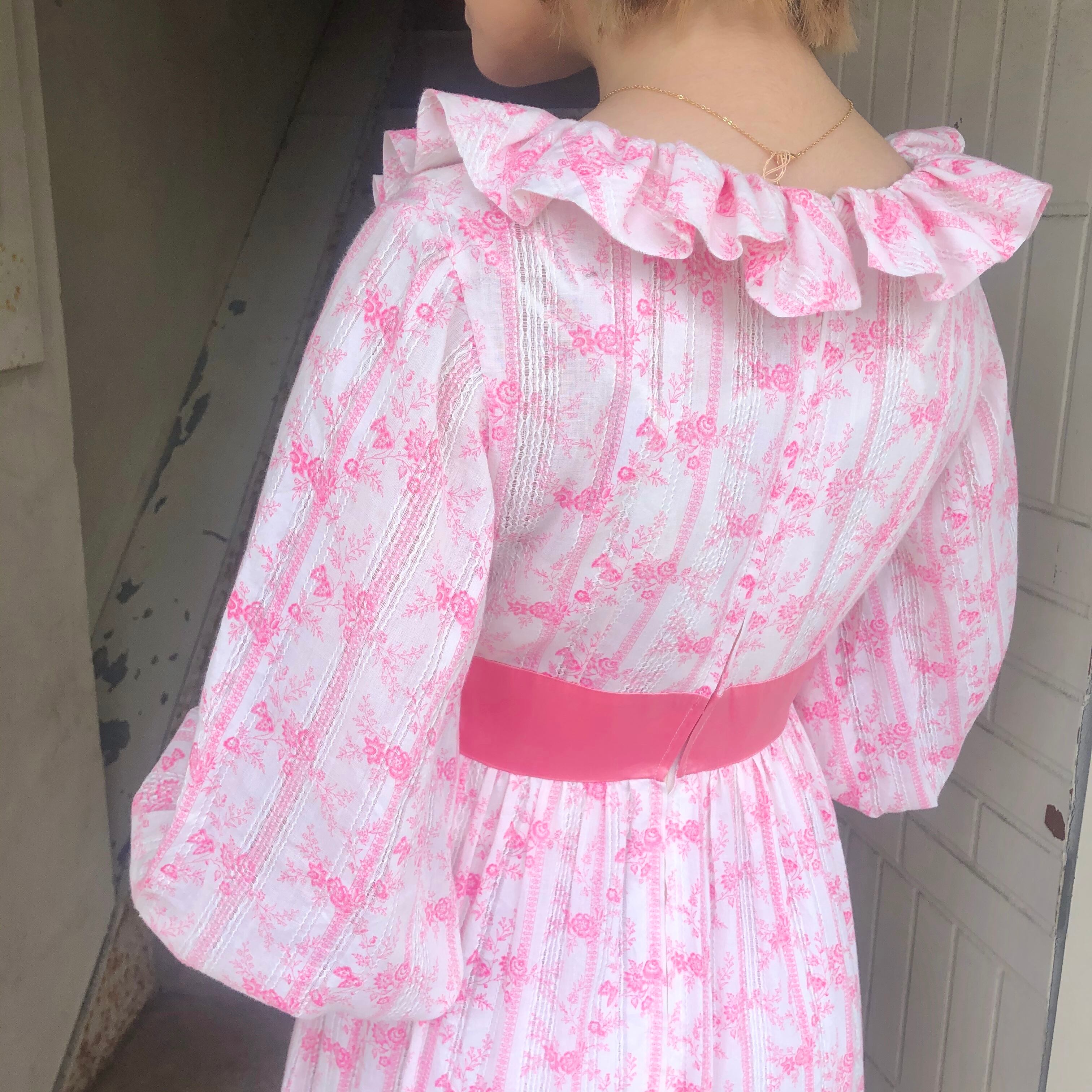 ウエストマークした幅広なサテンリボンとピエロカラーのような襟がポイントのワンピースです。