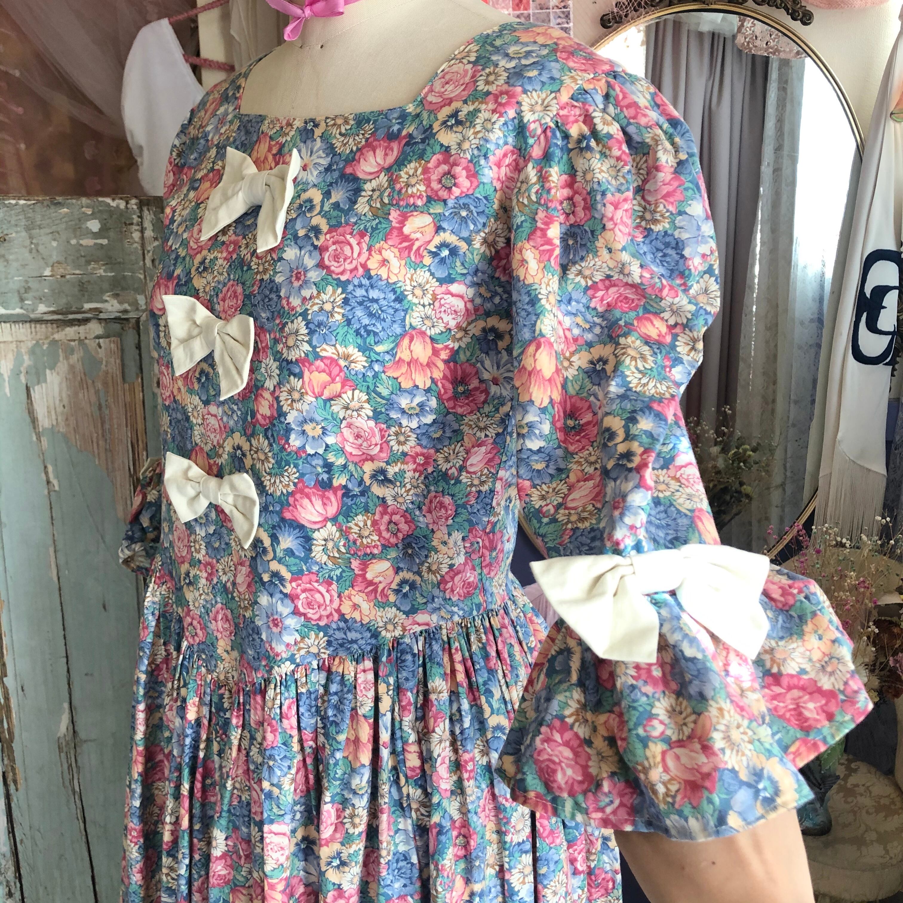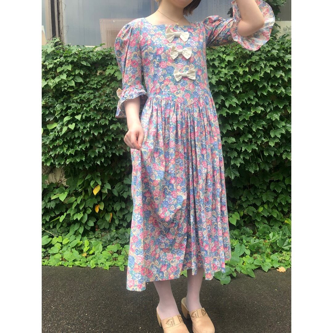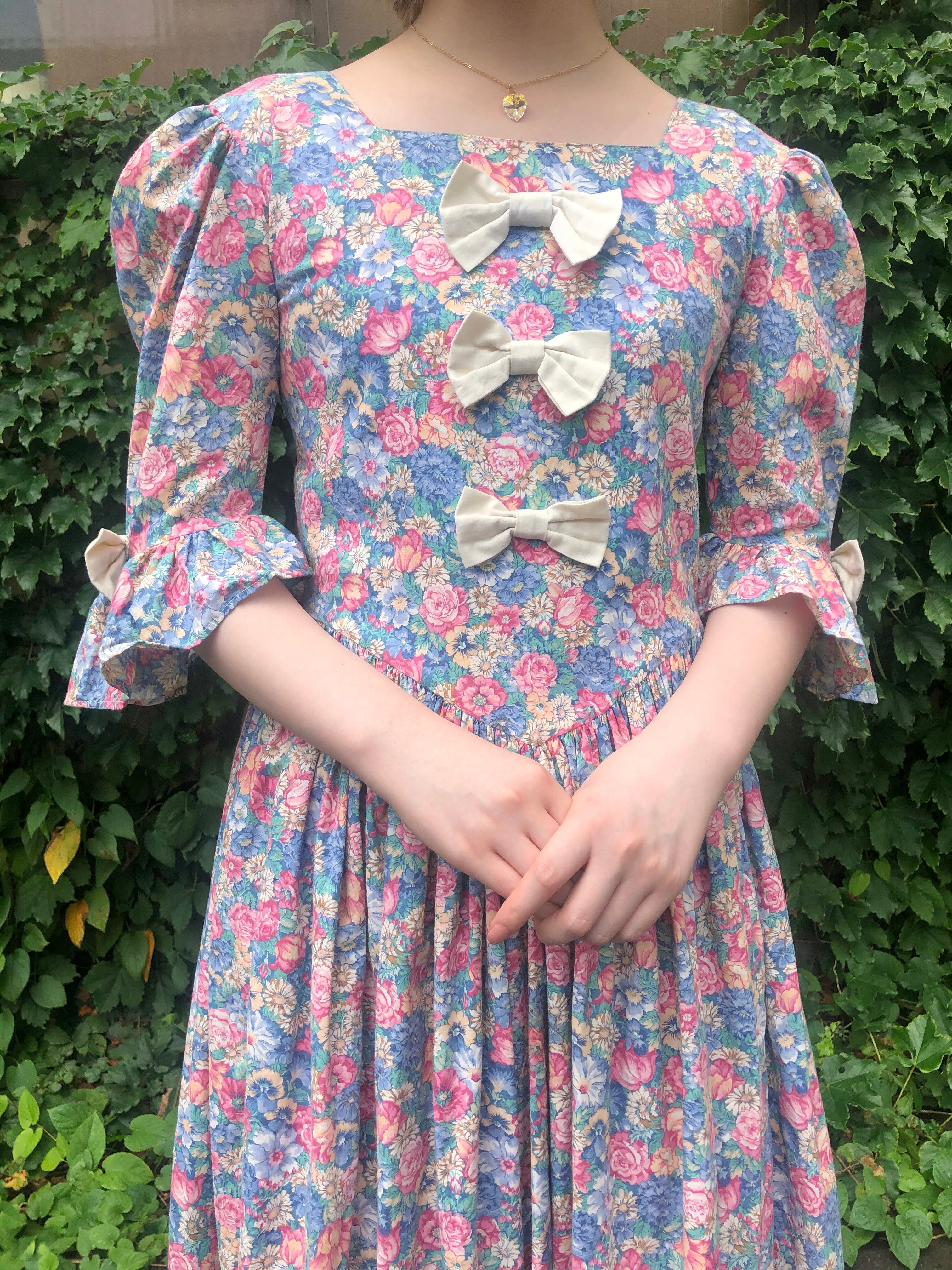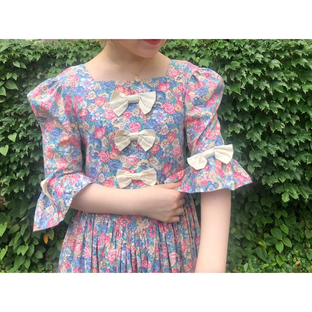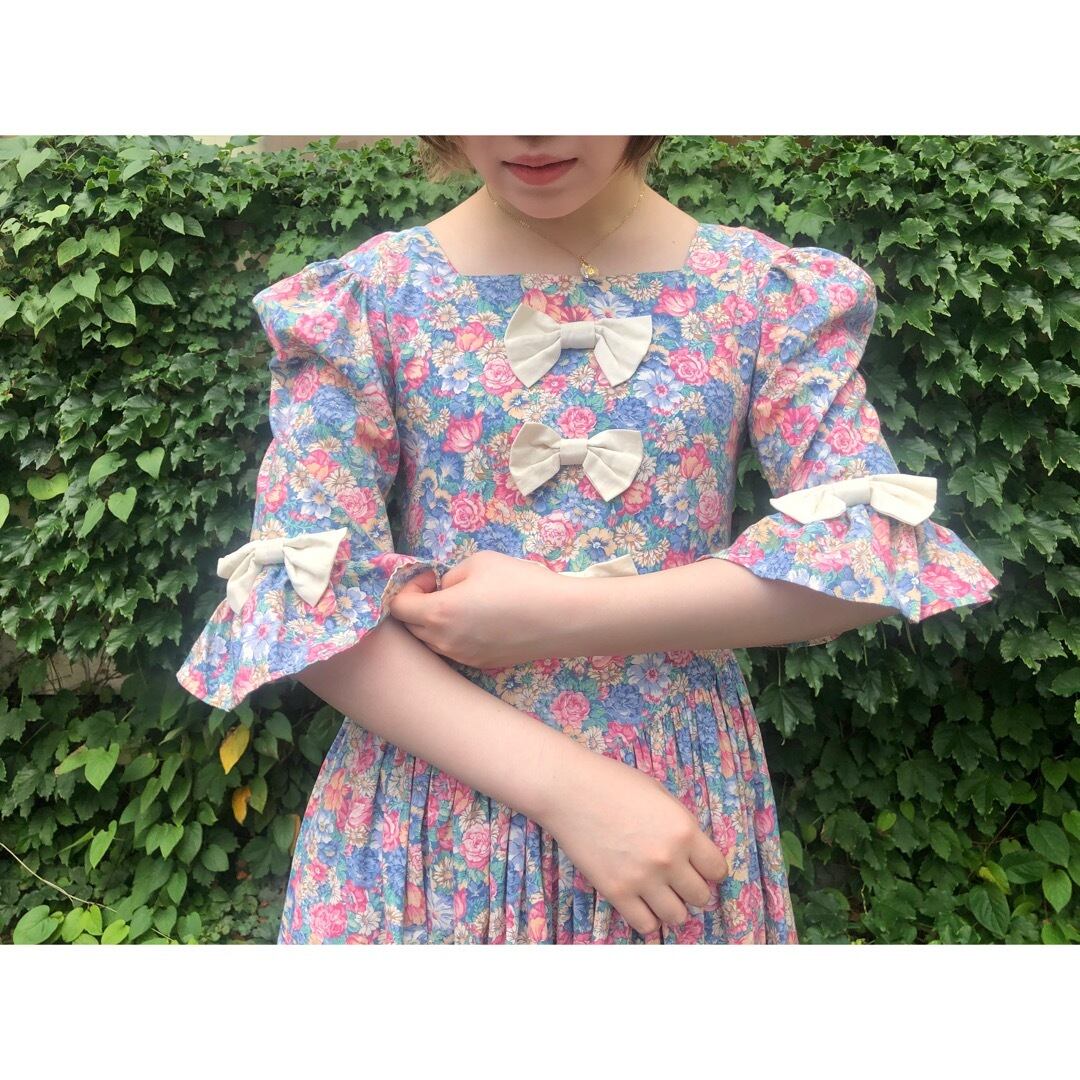 フロント部分に3つ、両袖に2つリボンのついた花柄ワンピースです。