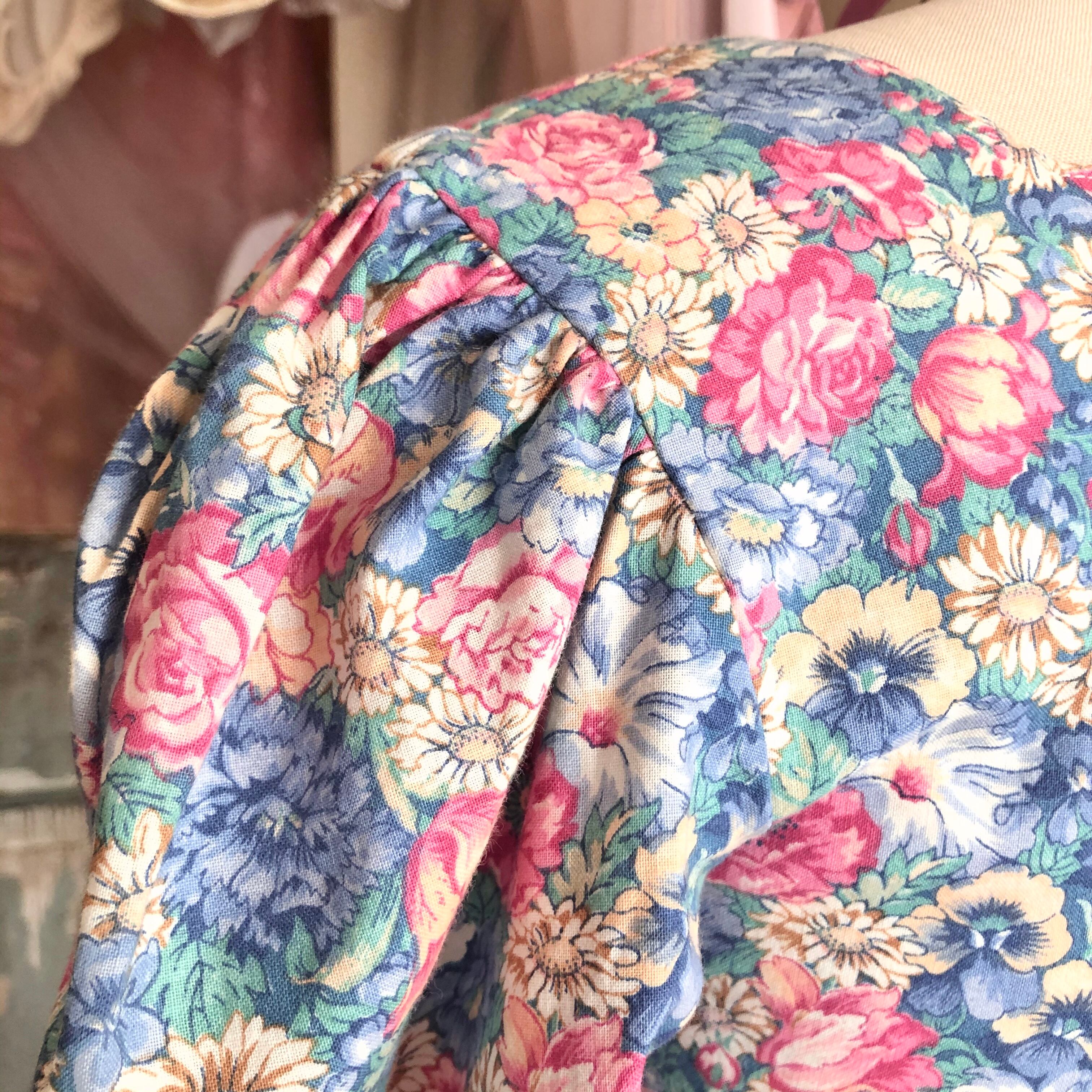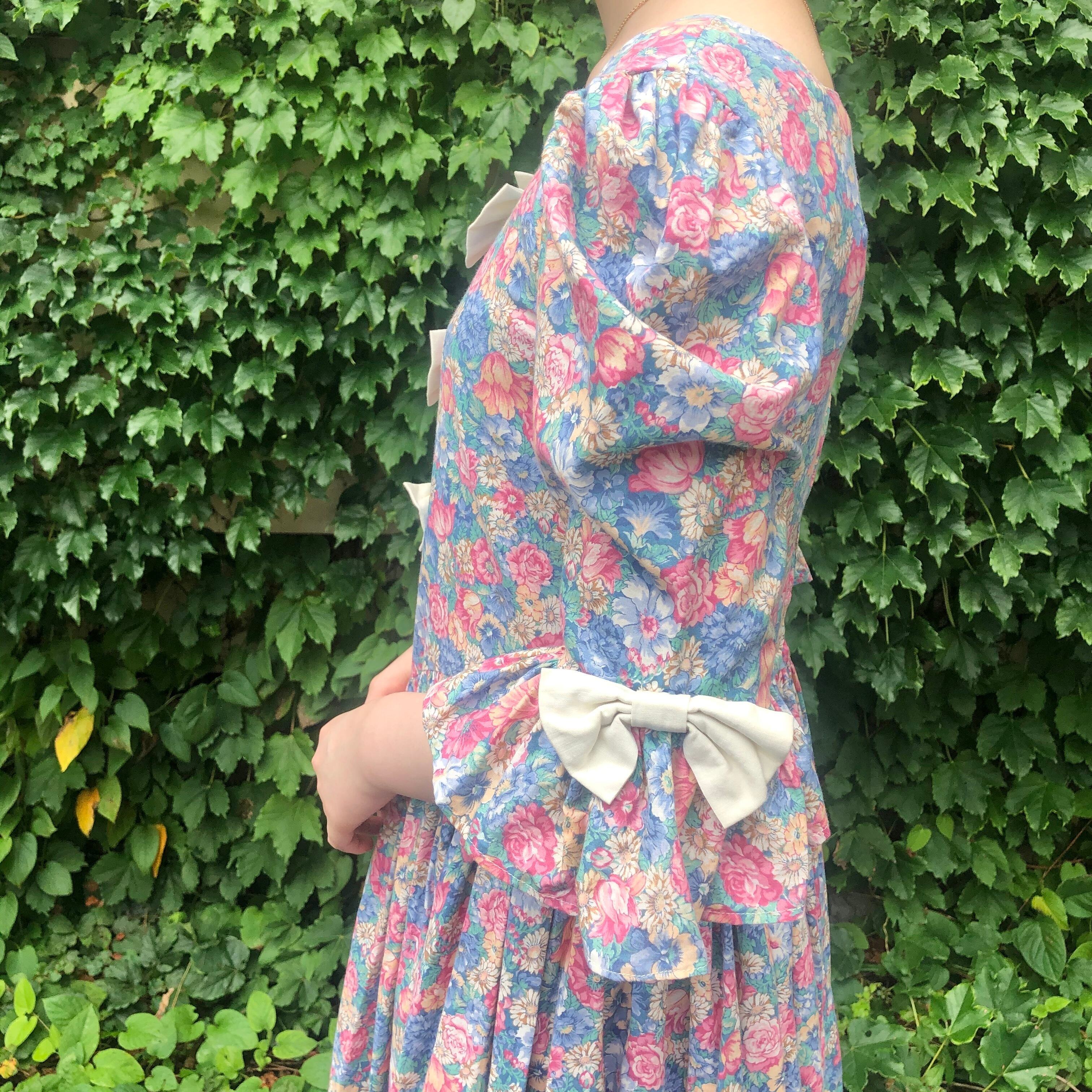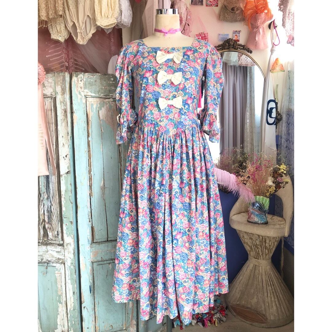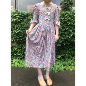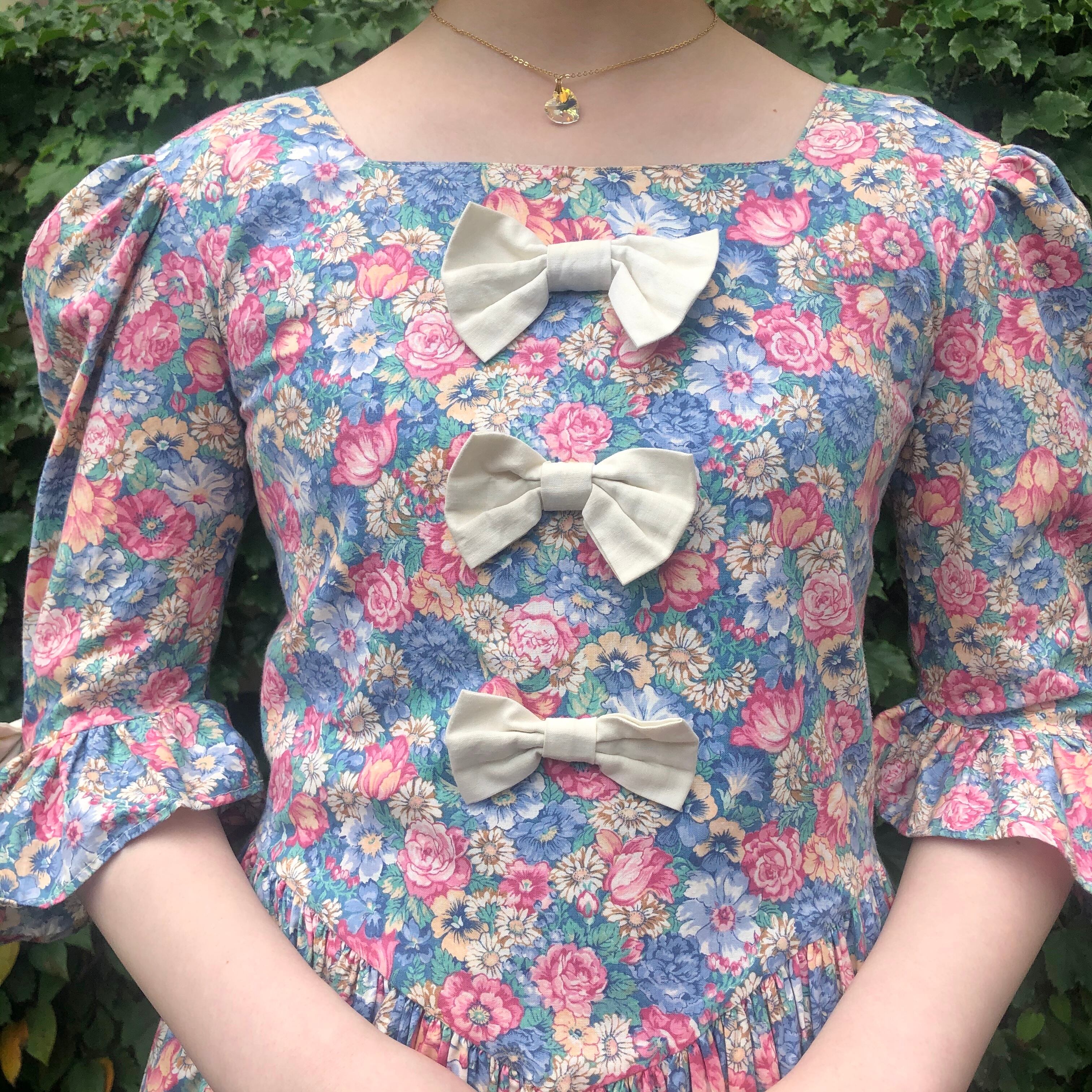 フロント部分に3つ、両袖に2つリボンのついた花柄ワンピースです。