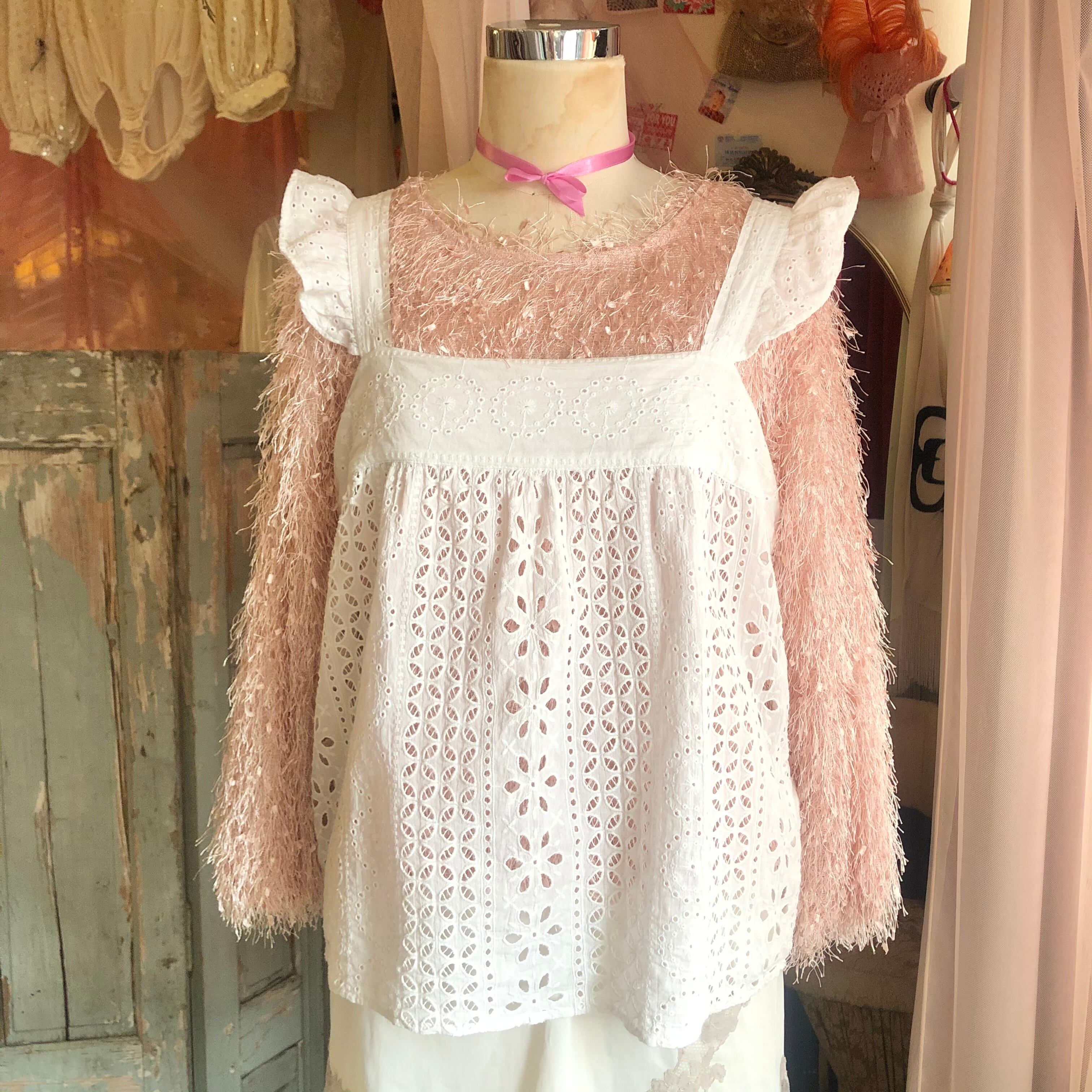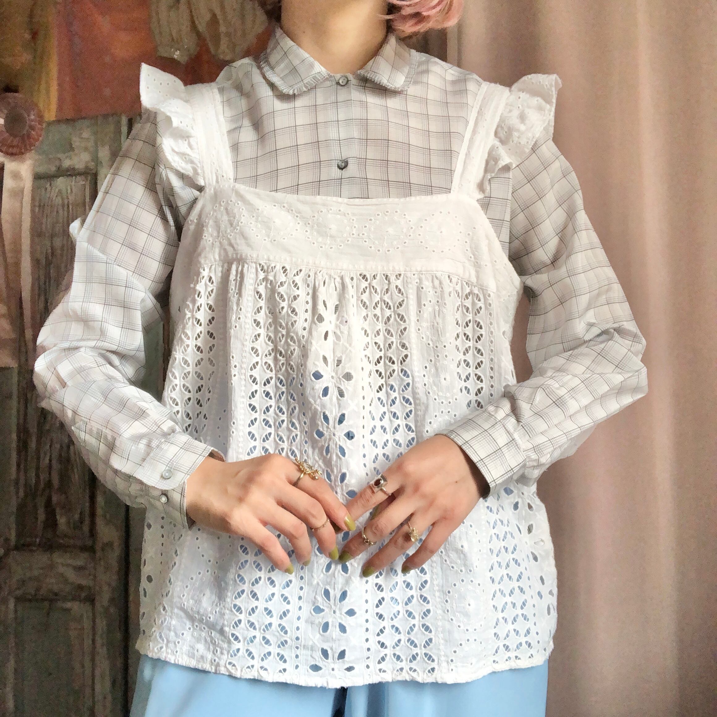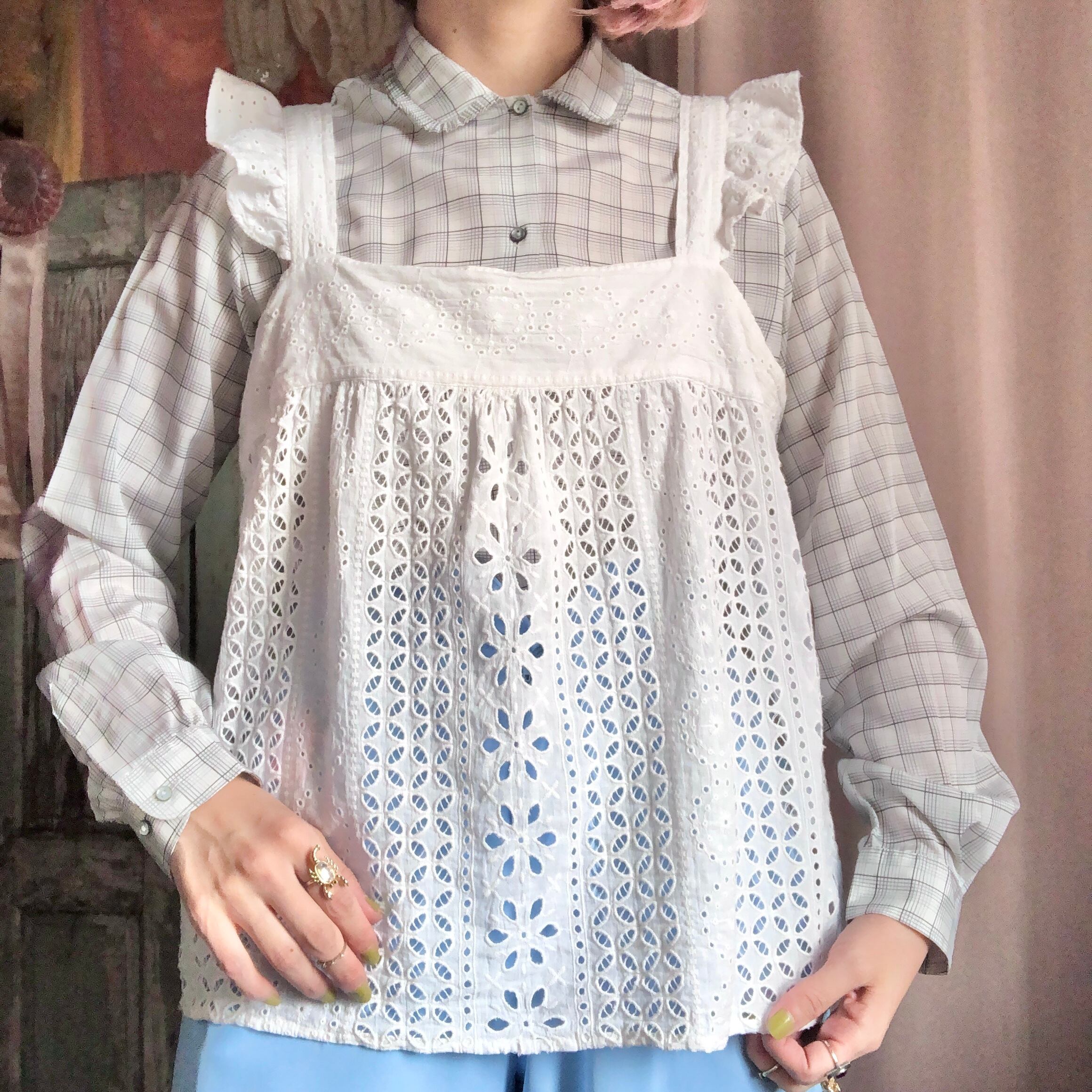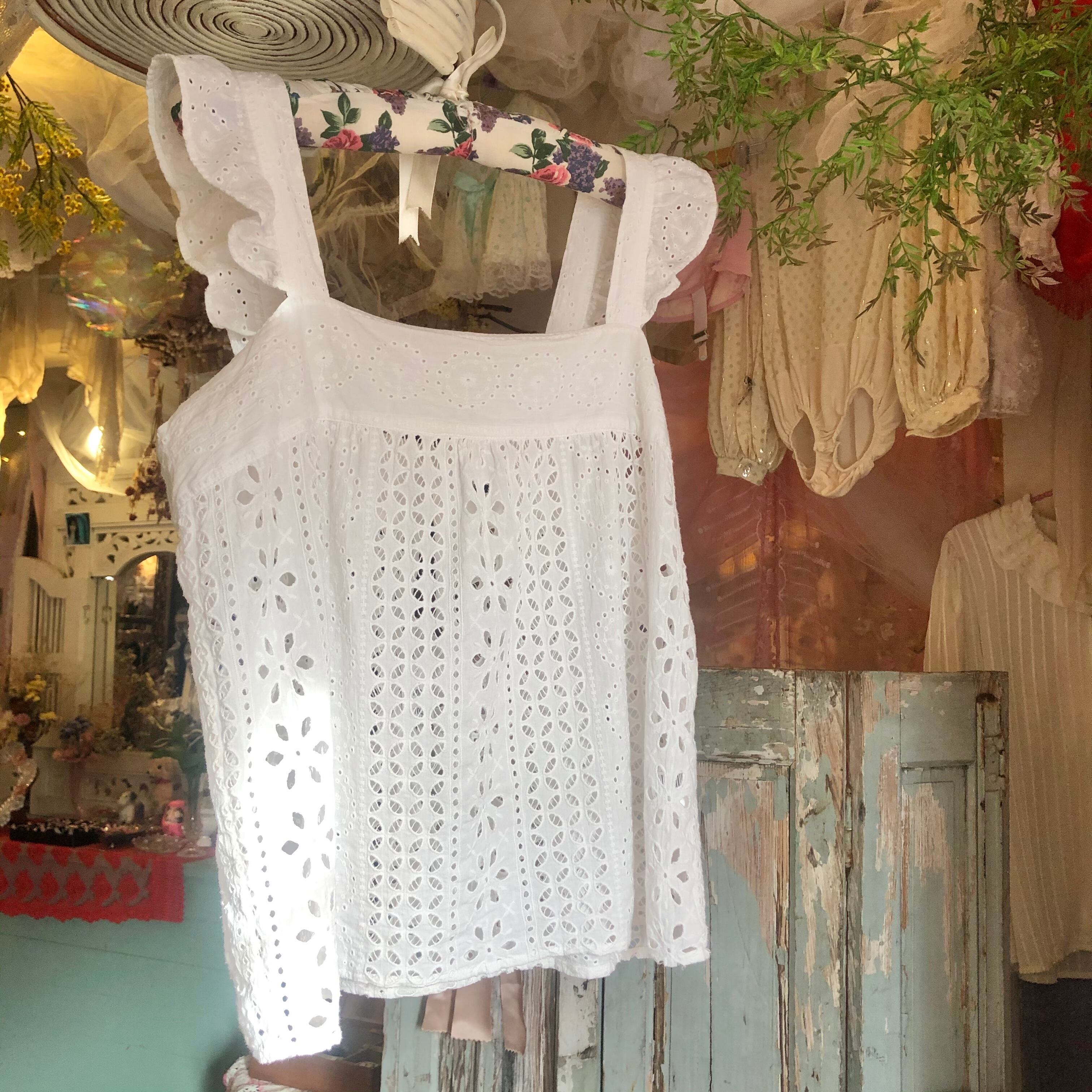 エプロンのような可愛さがある肩フリルのコットントップス