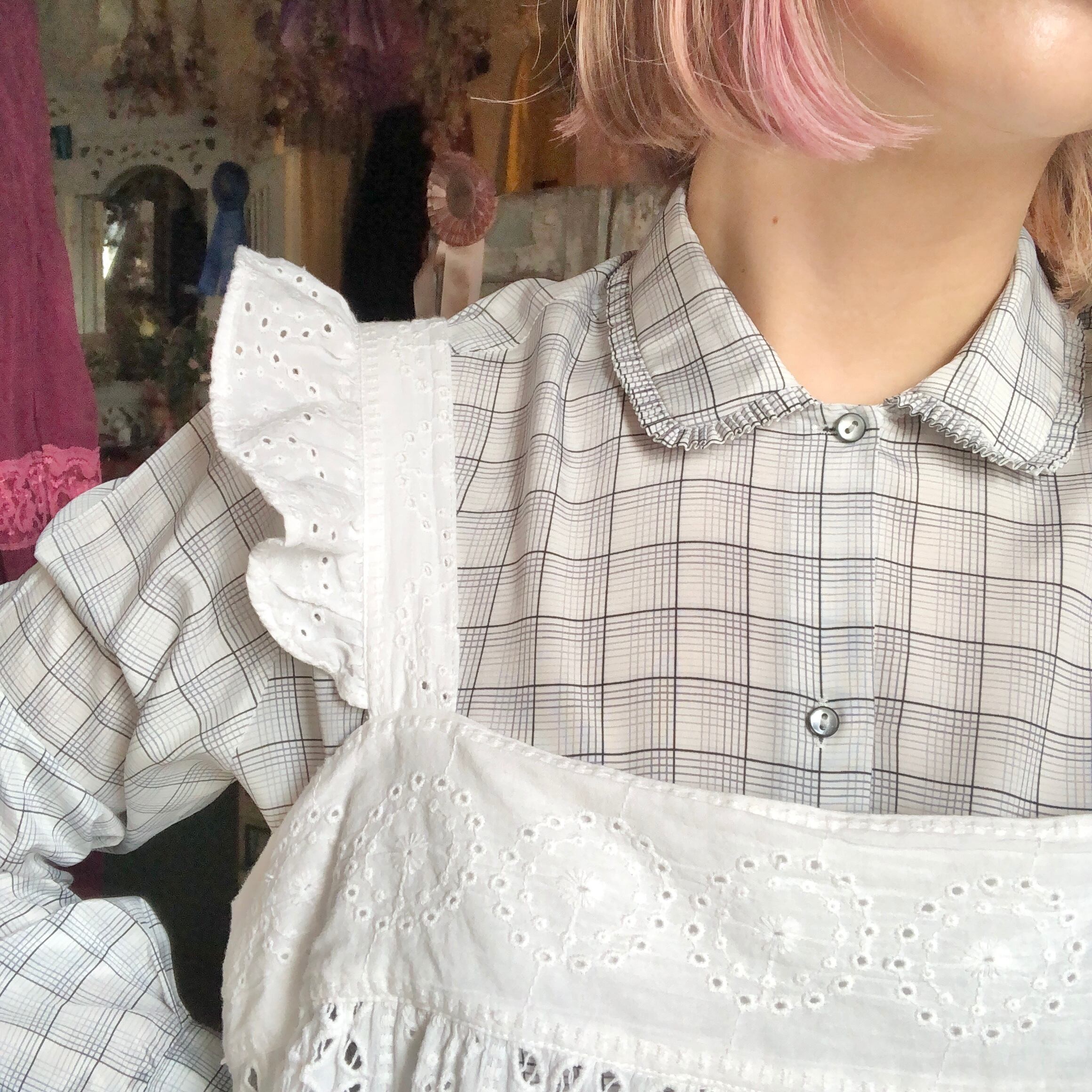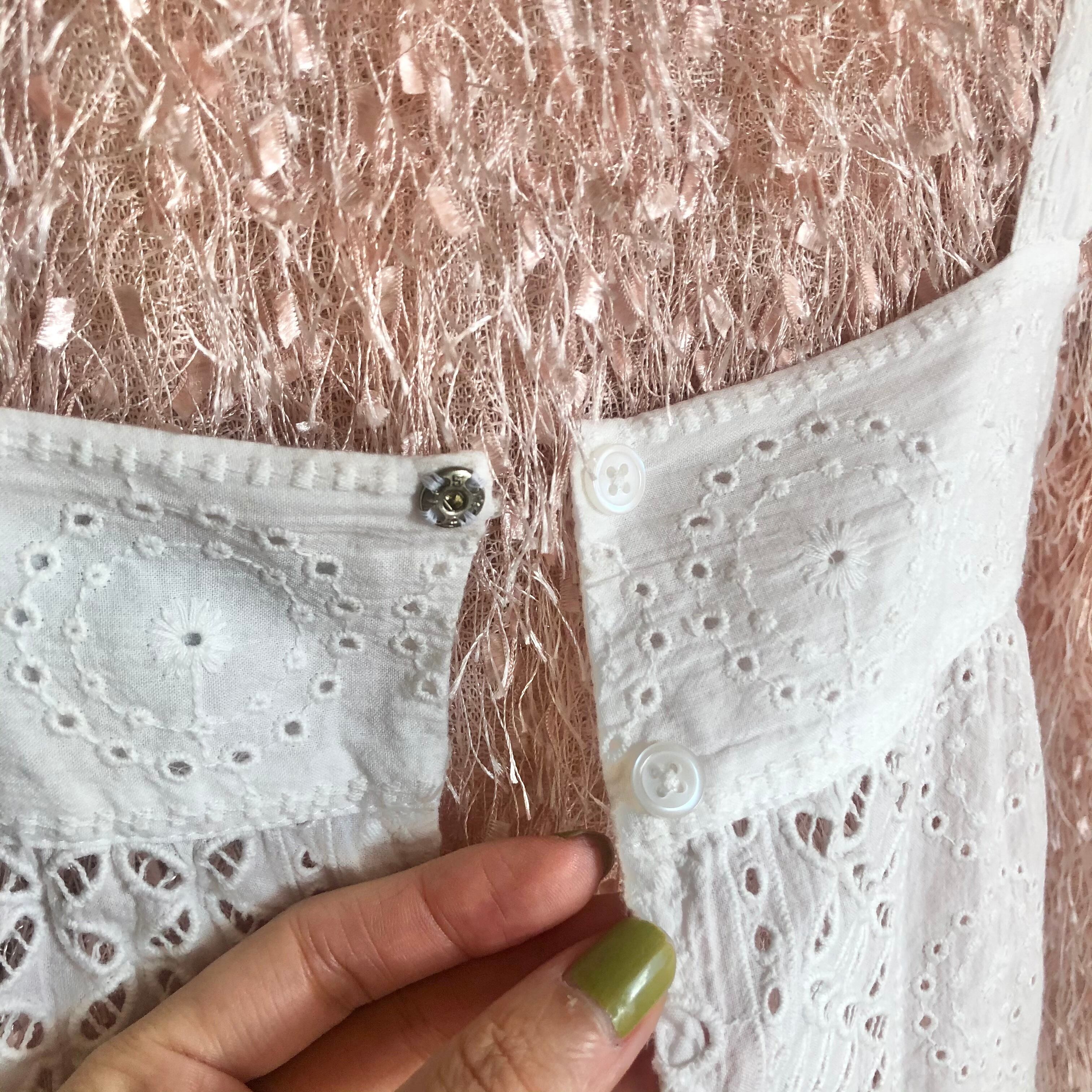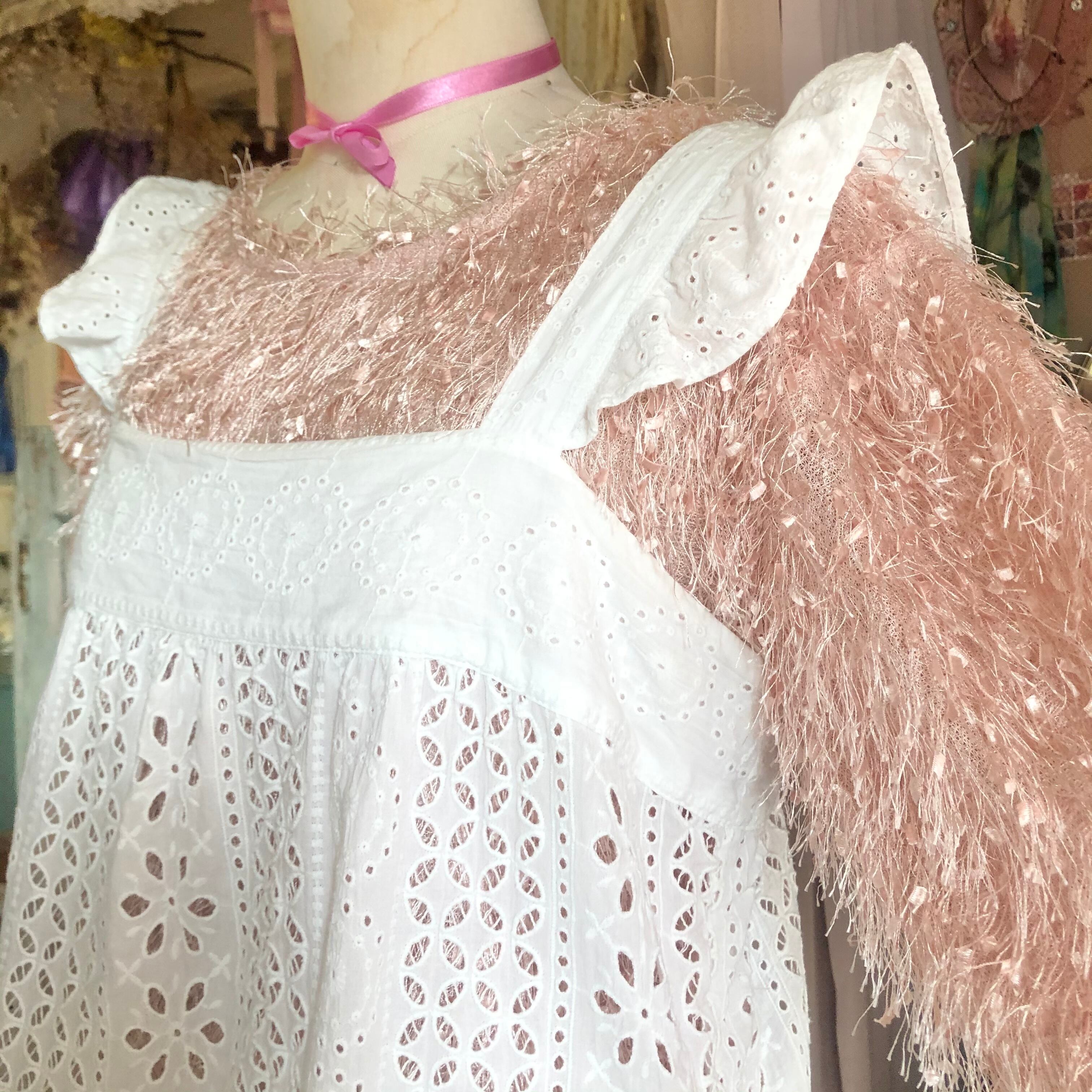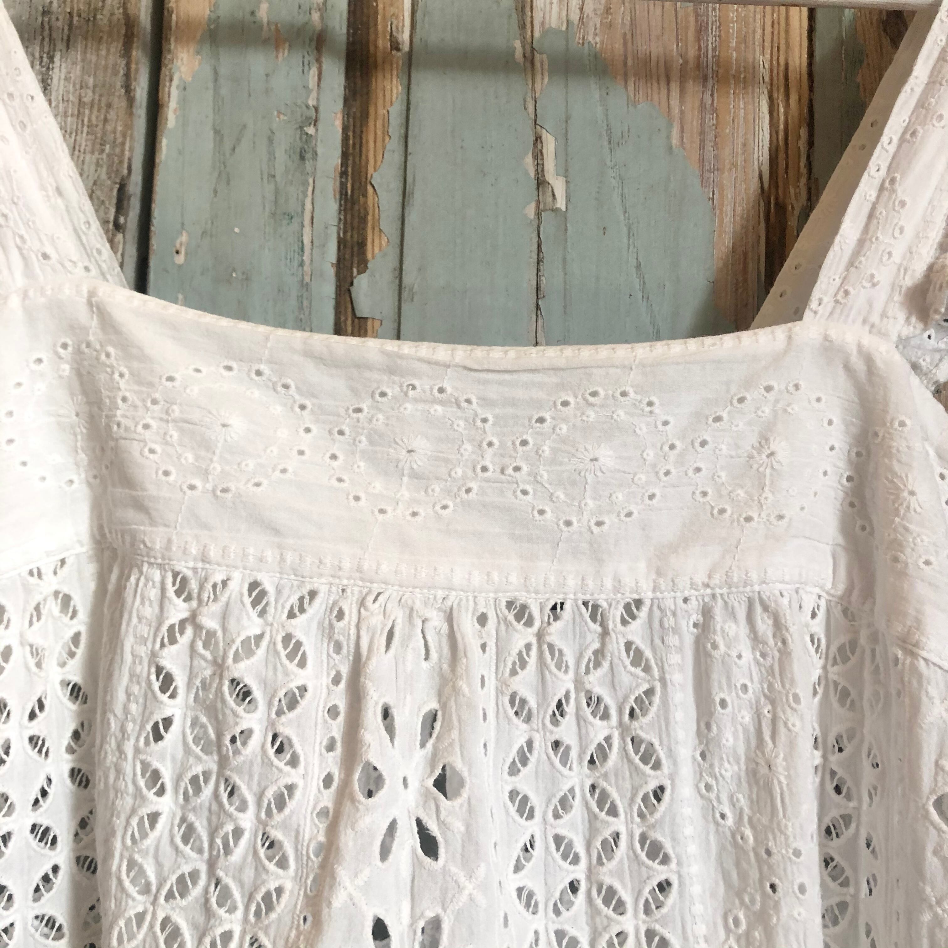 エプロンのような可愛さがある肩フリルのコットントップス