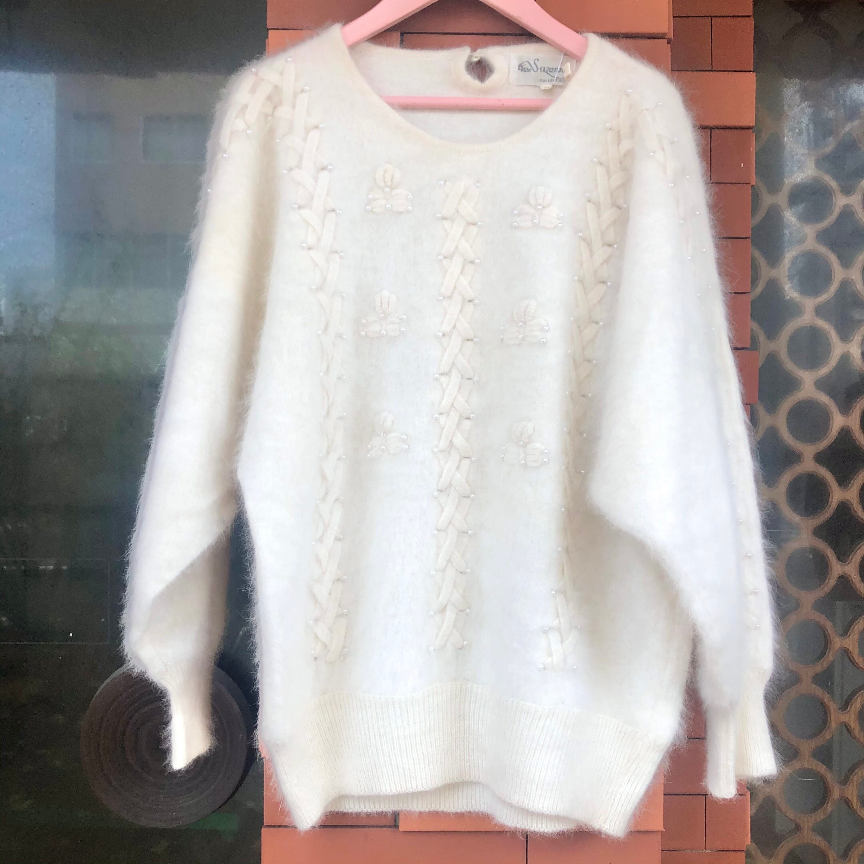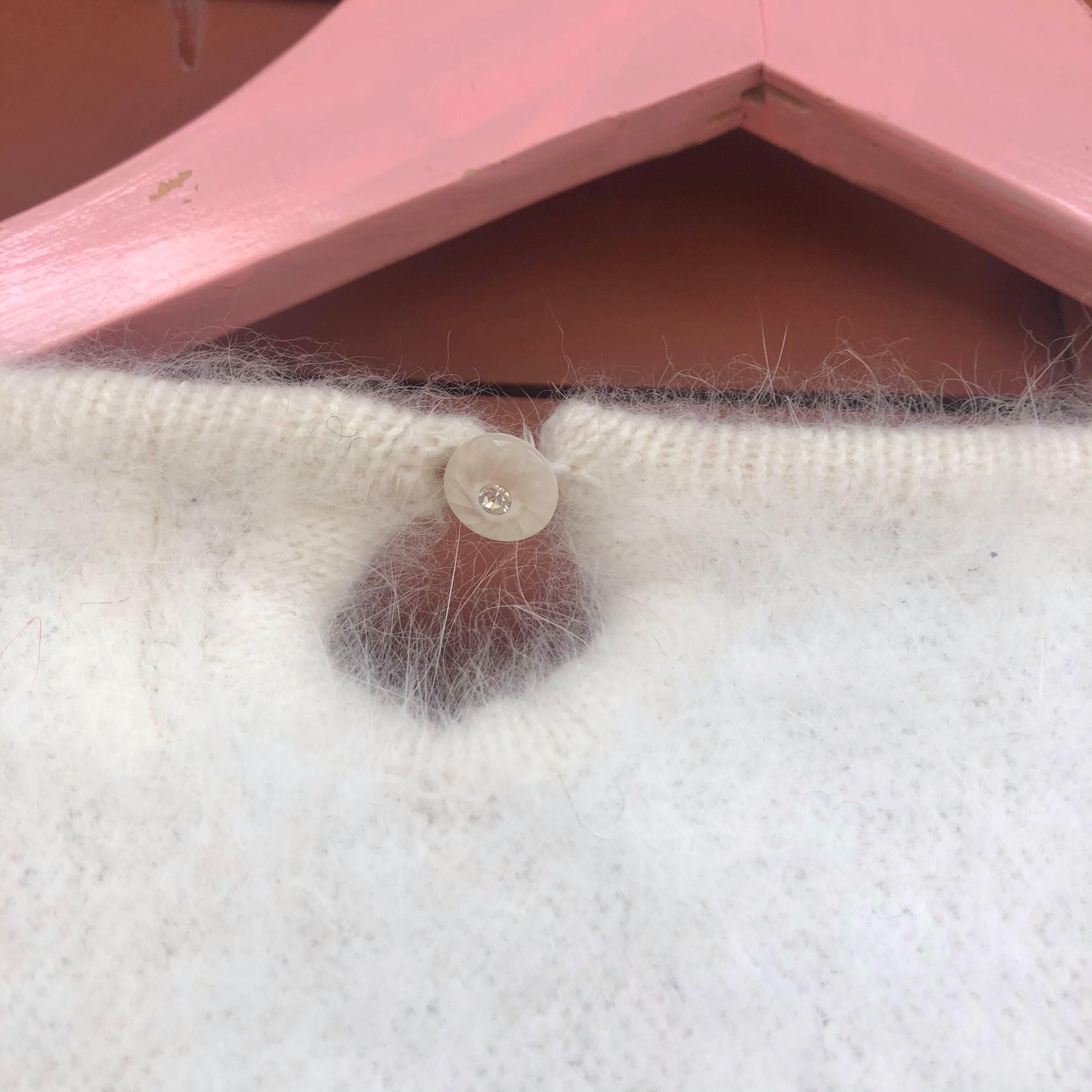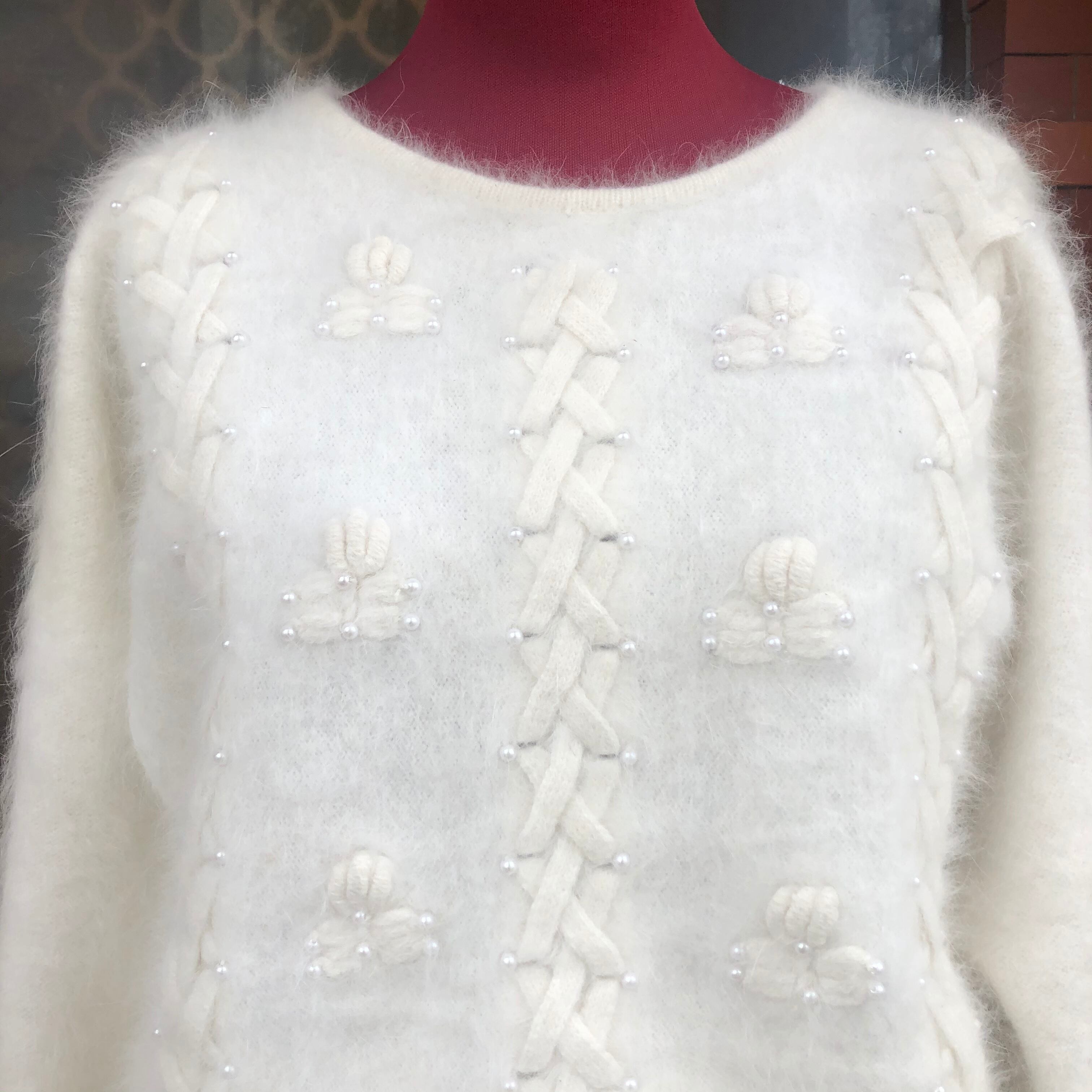 パールやクロスモチーフの装飾がされたアンゴラセーターです。