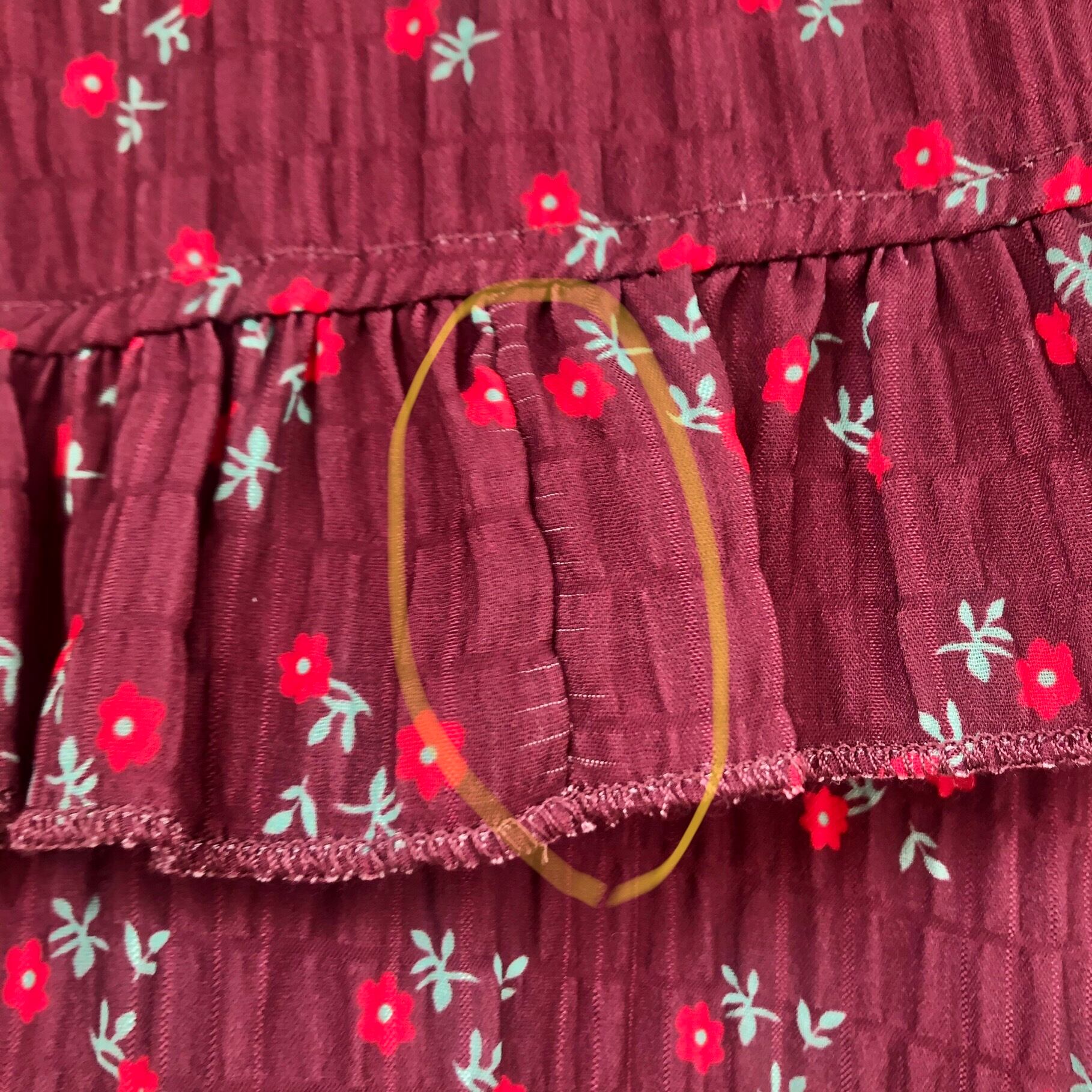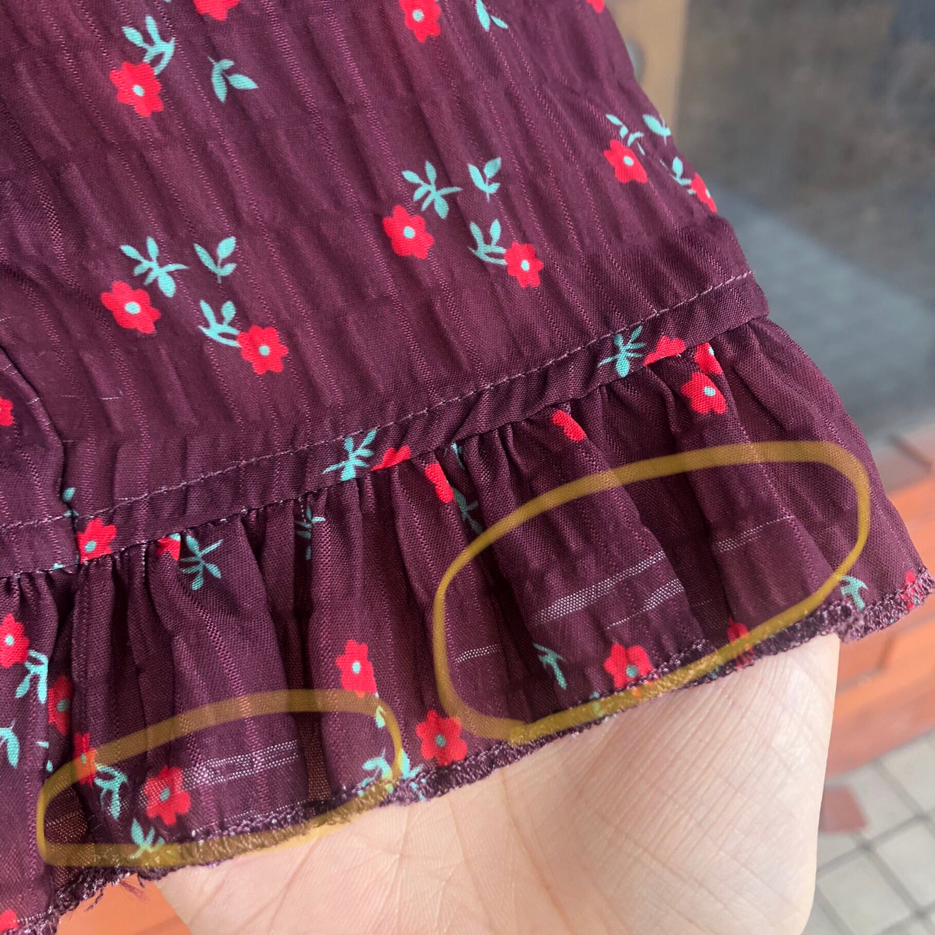 茶色と紫を混ぜたような絶妙なお色のボディーに赤い花柄がかわいらしい一枚。