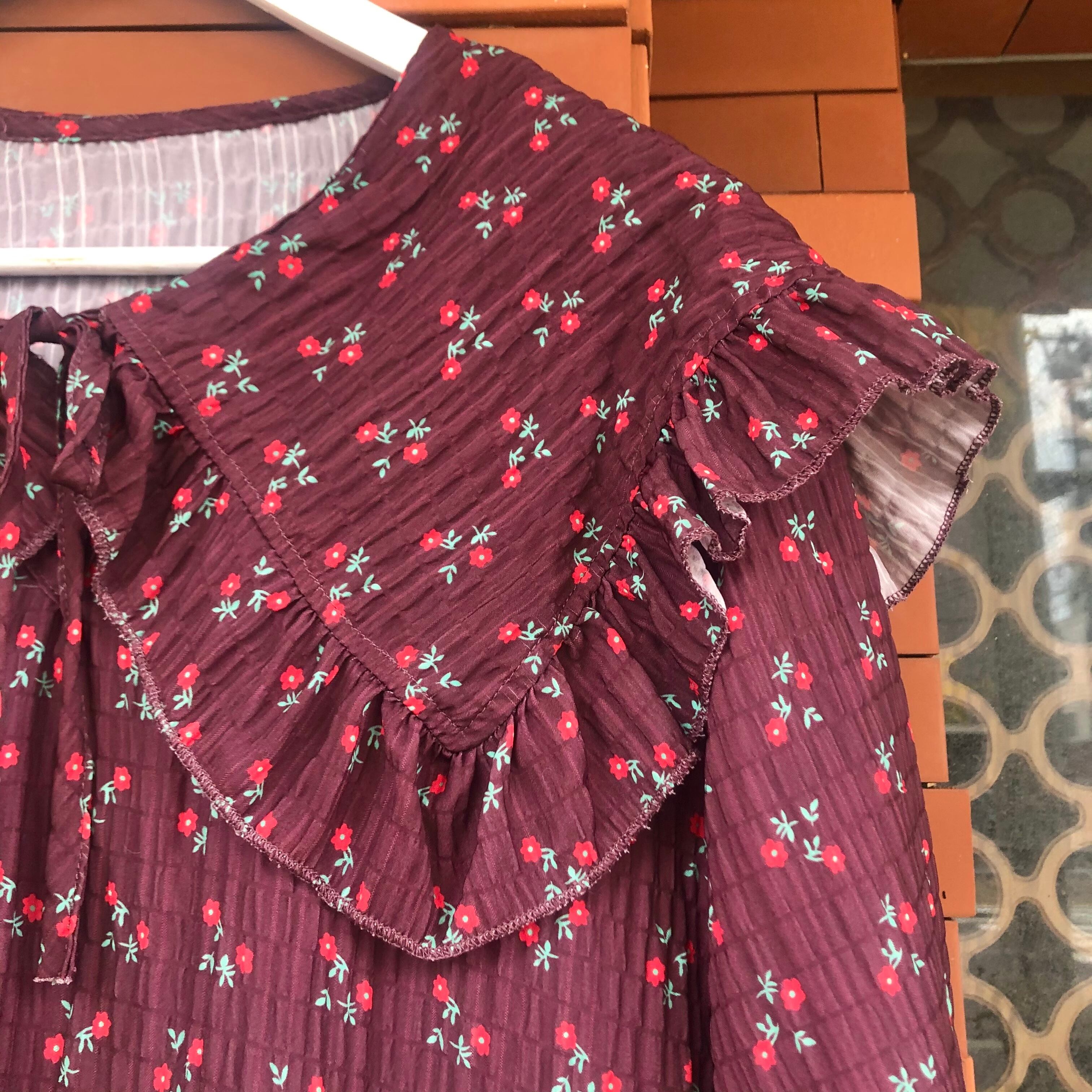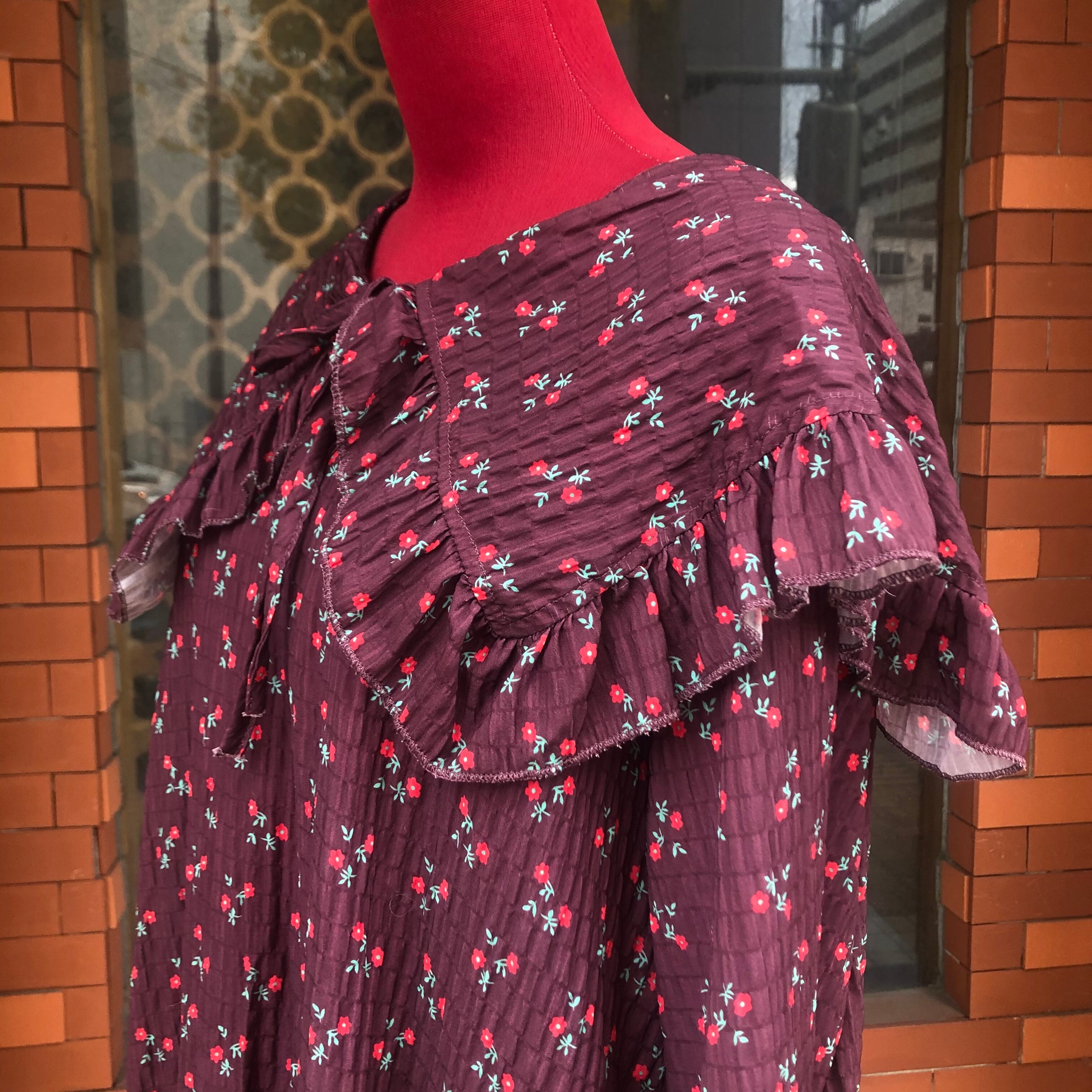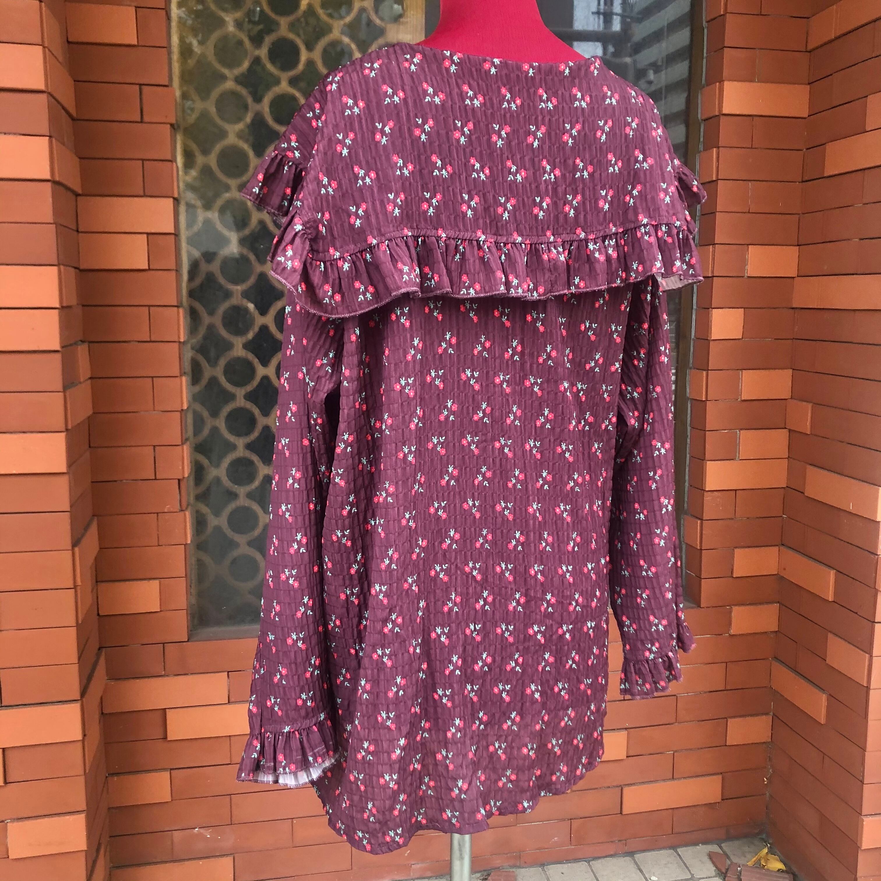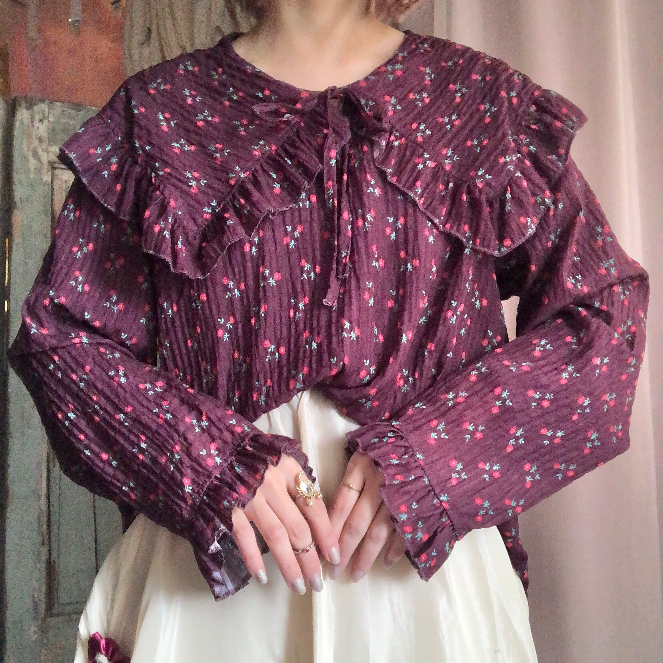肩まわりをぐるりと覆う大きなセーラーカラーの花柄ブラウス。
