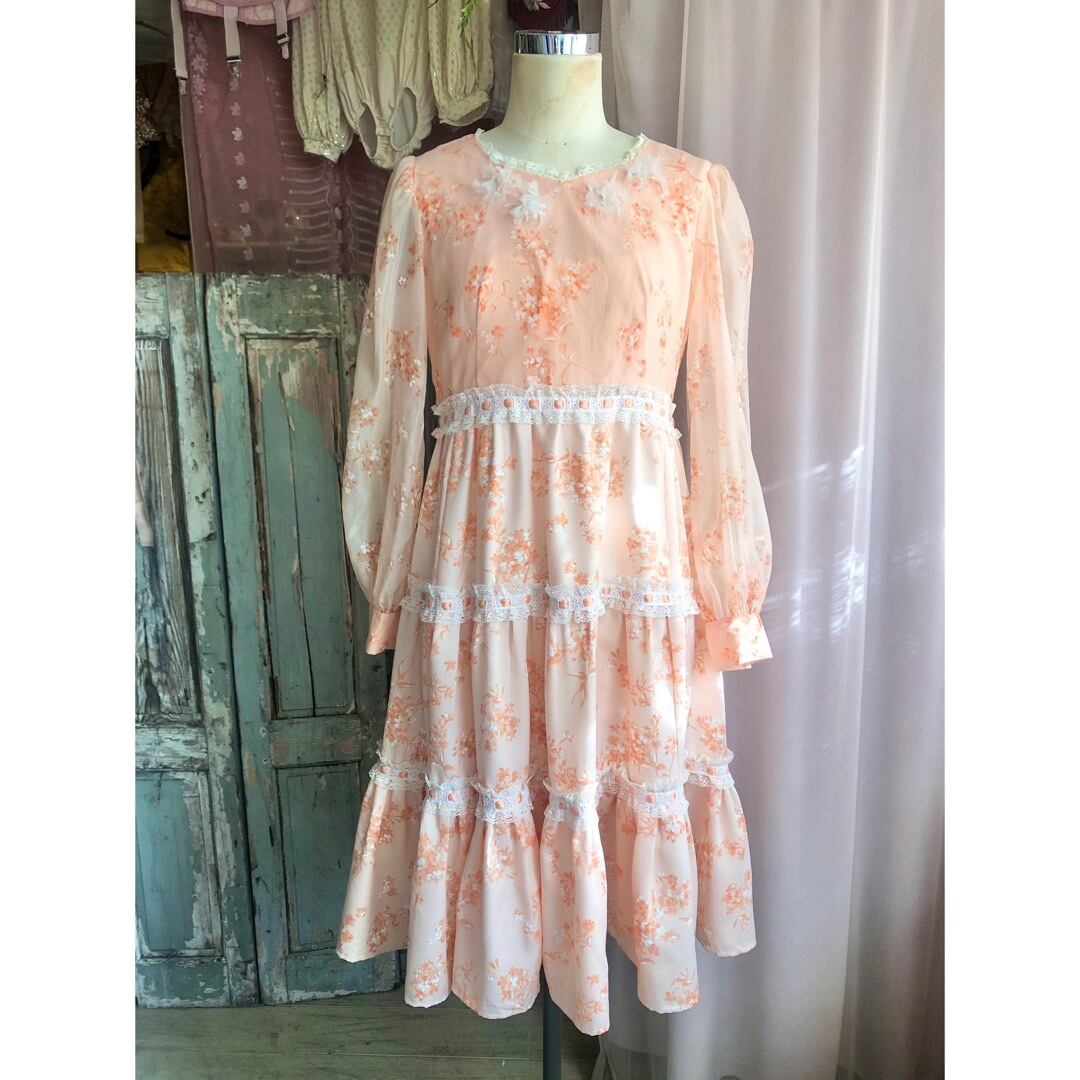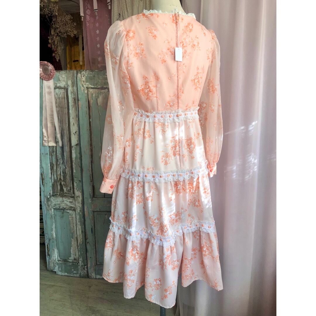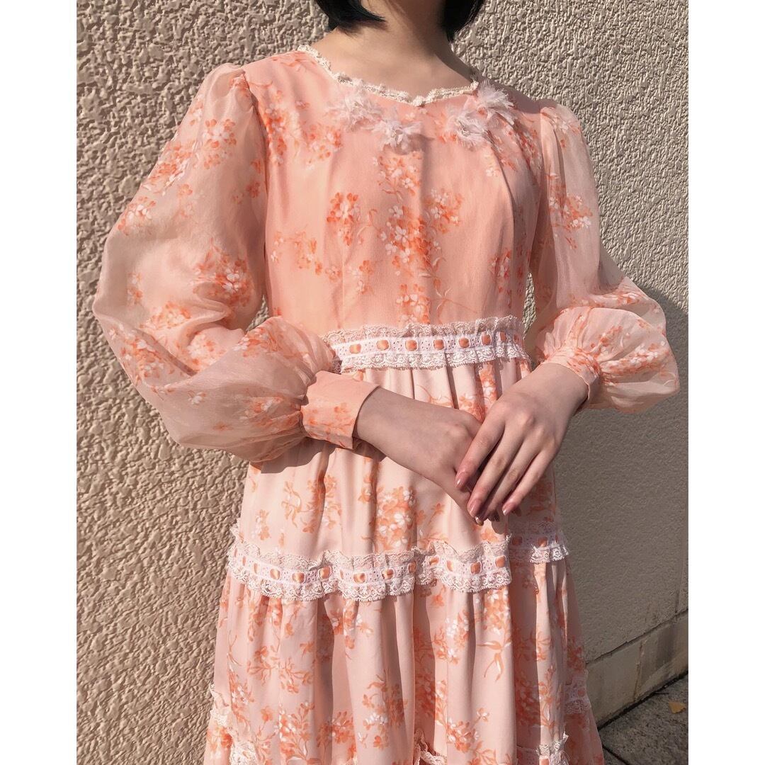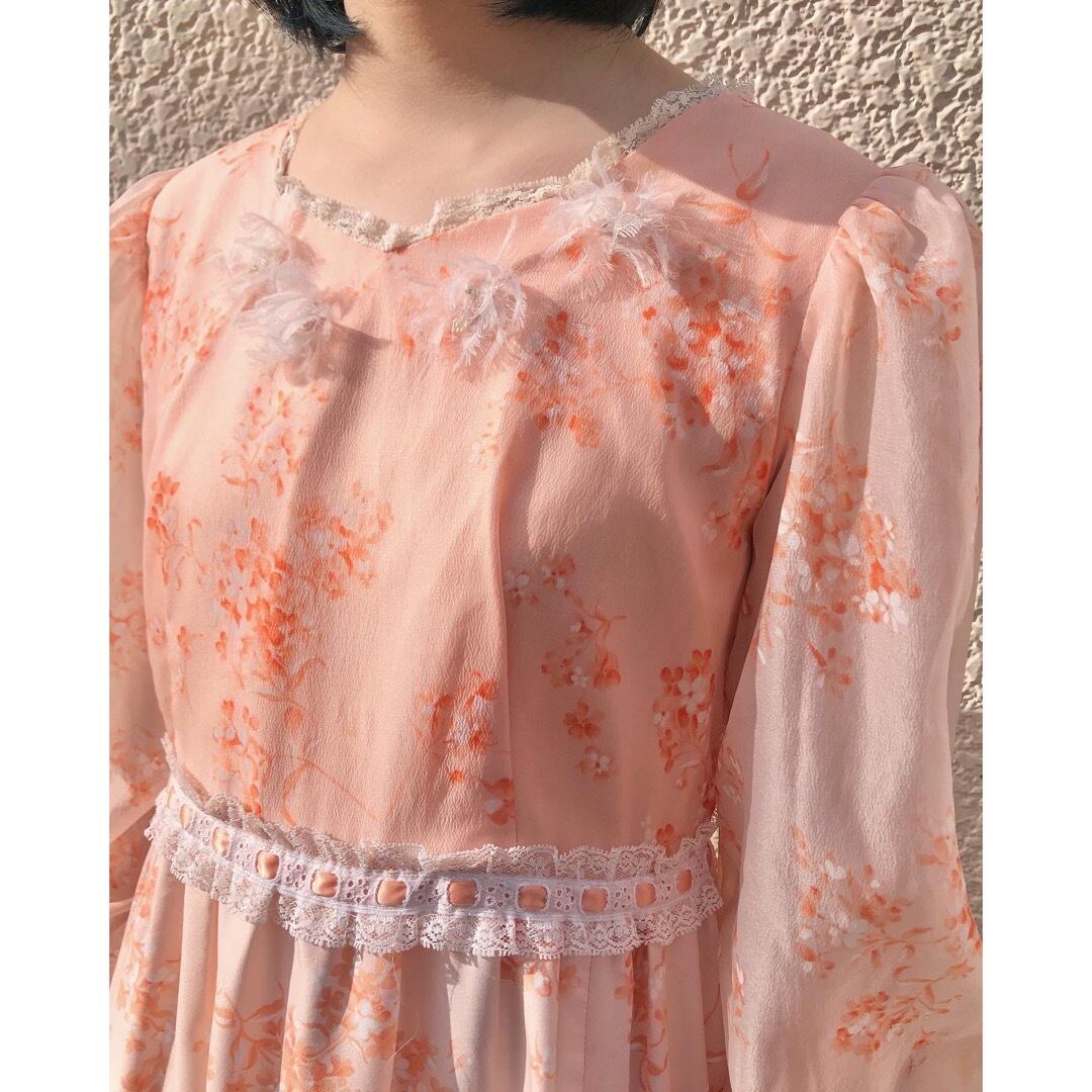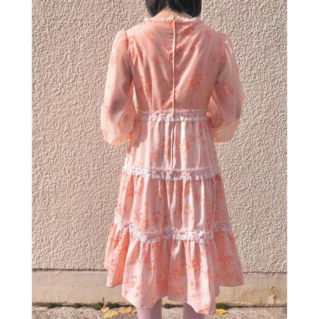 肌馴染みの良いサーモンピンクの花柄ワンピース。