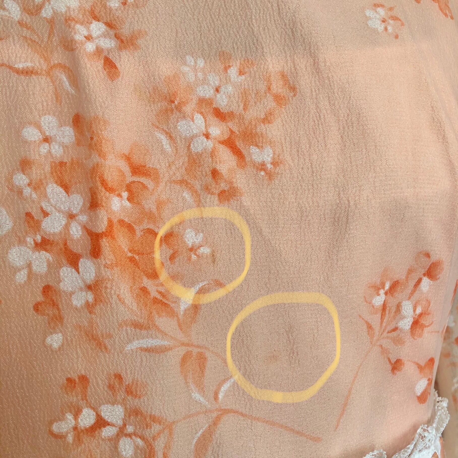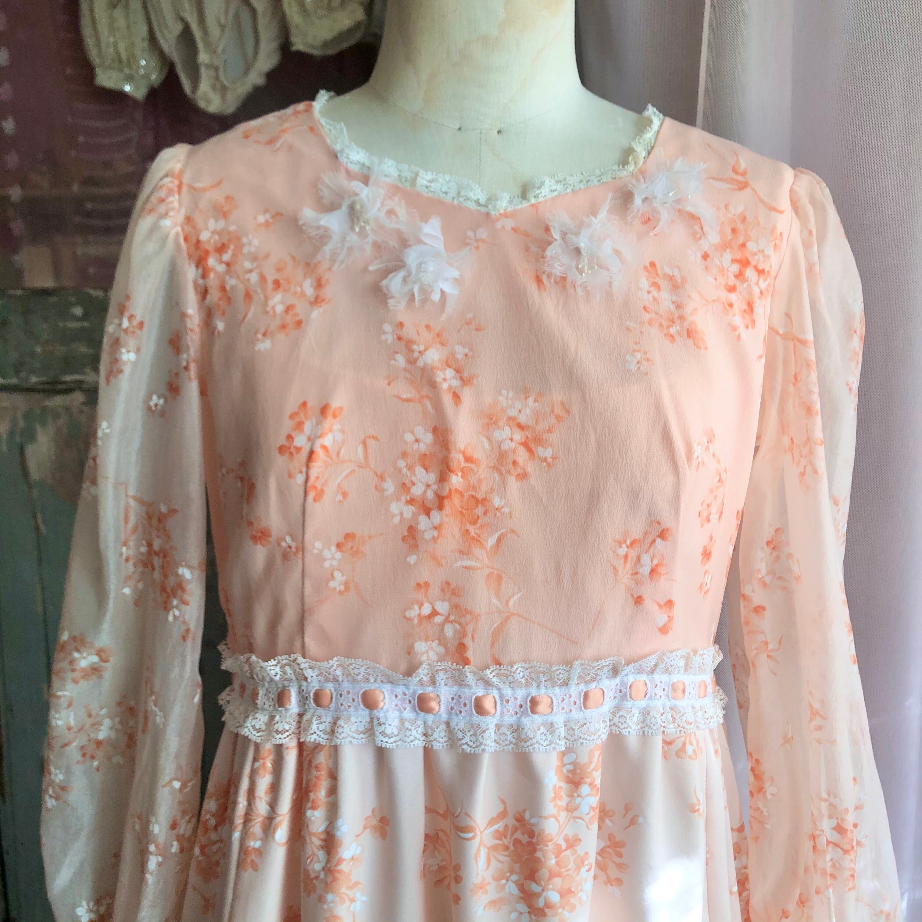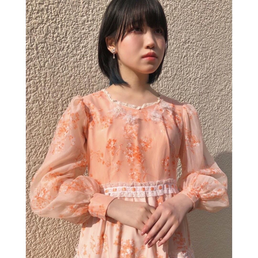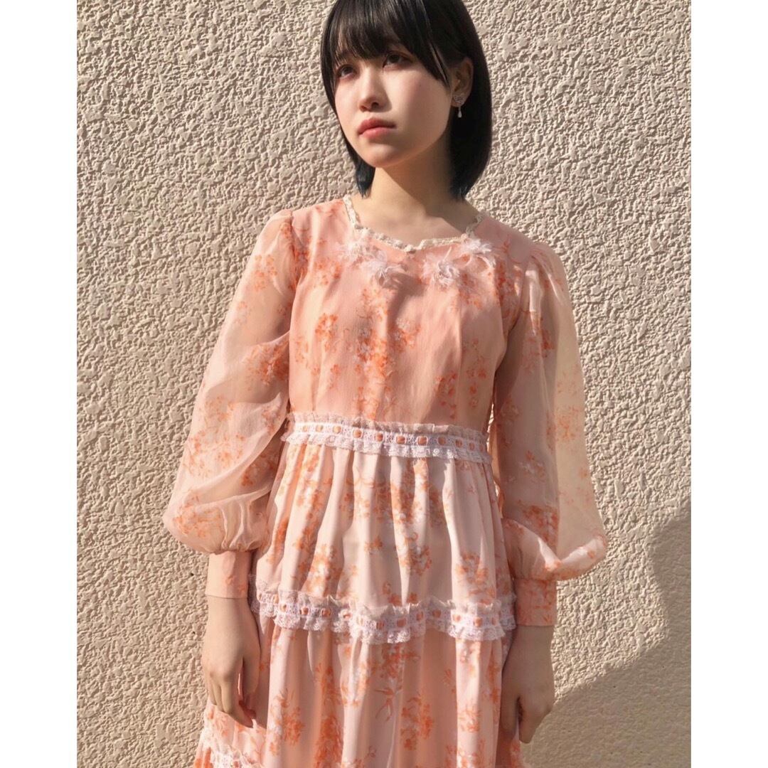 肌馴染みの良いサーモンピンクの花柄ワンピース。