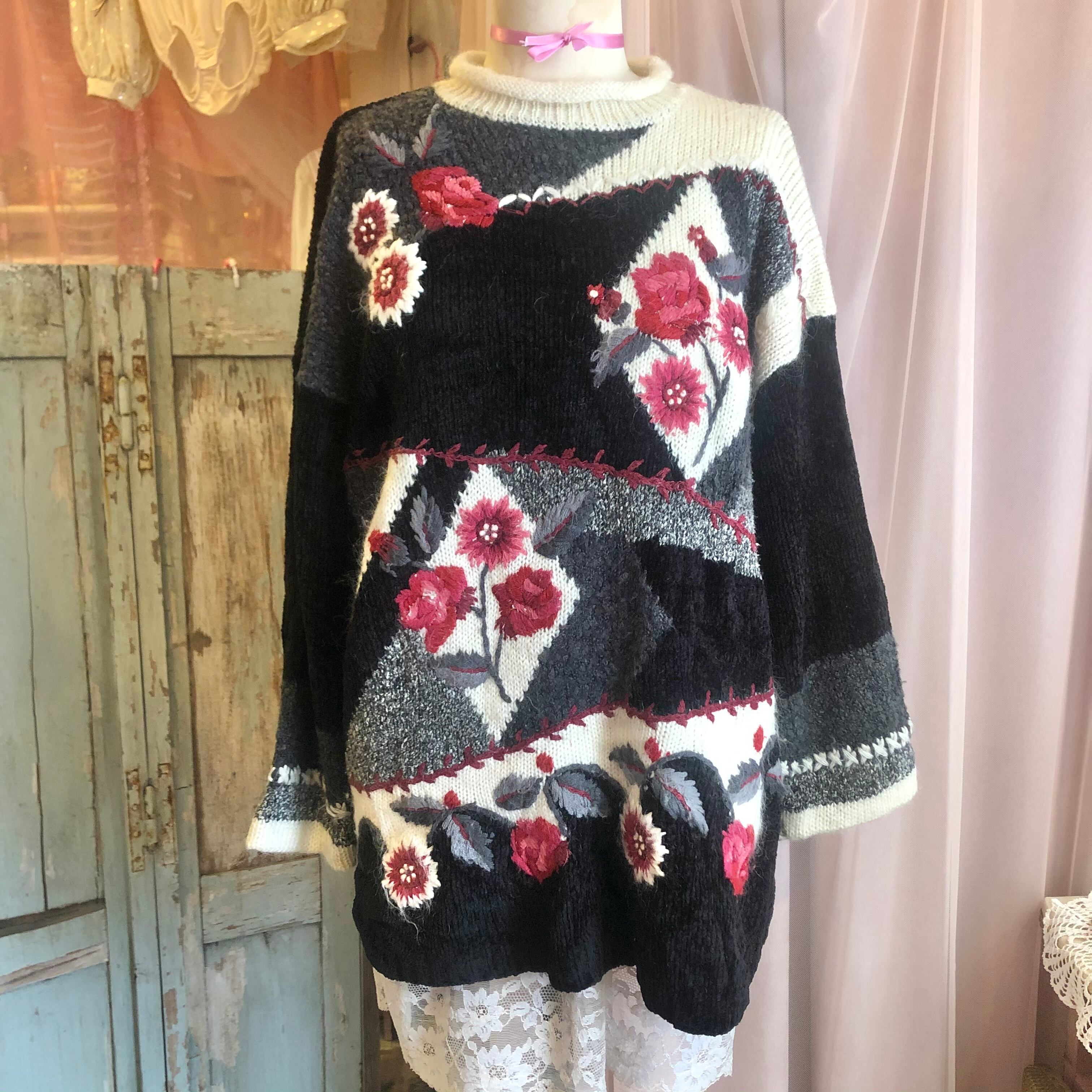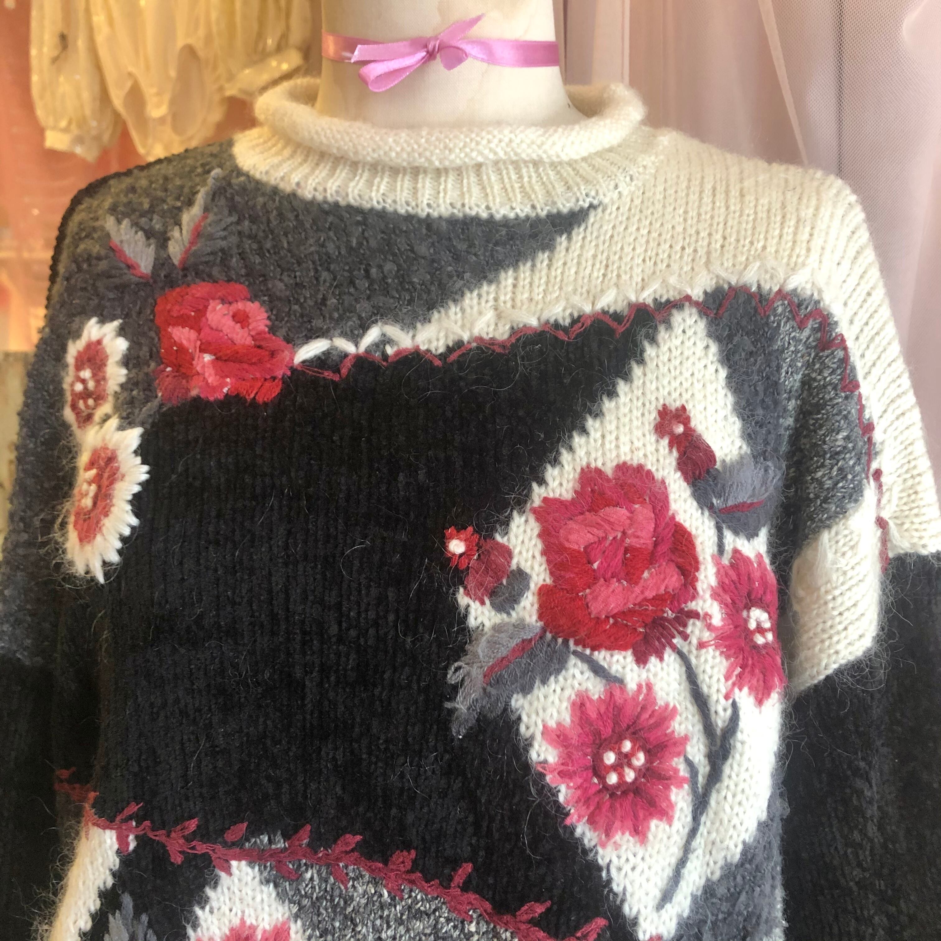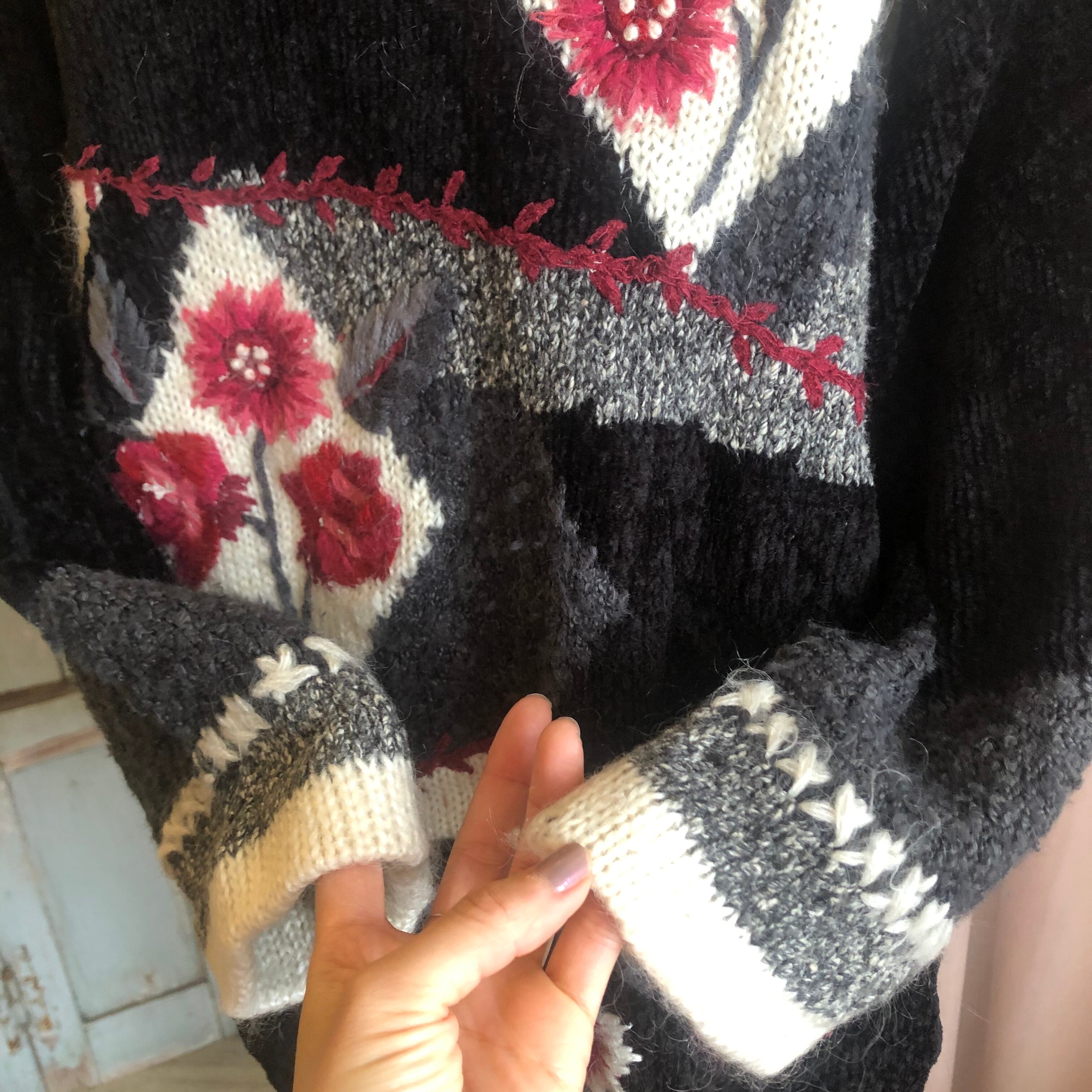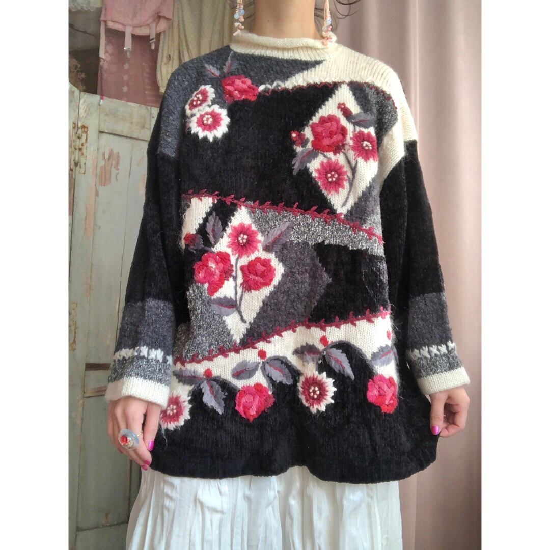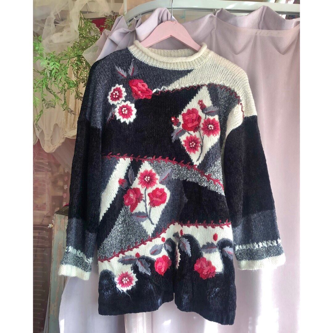 黒ベースに鮮やかな赤いお花が目を惹くニットセーター。