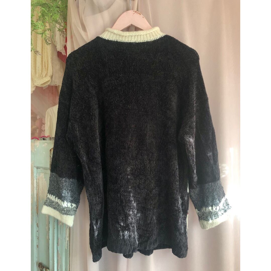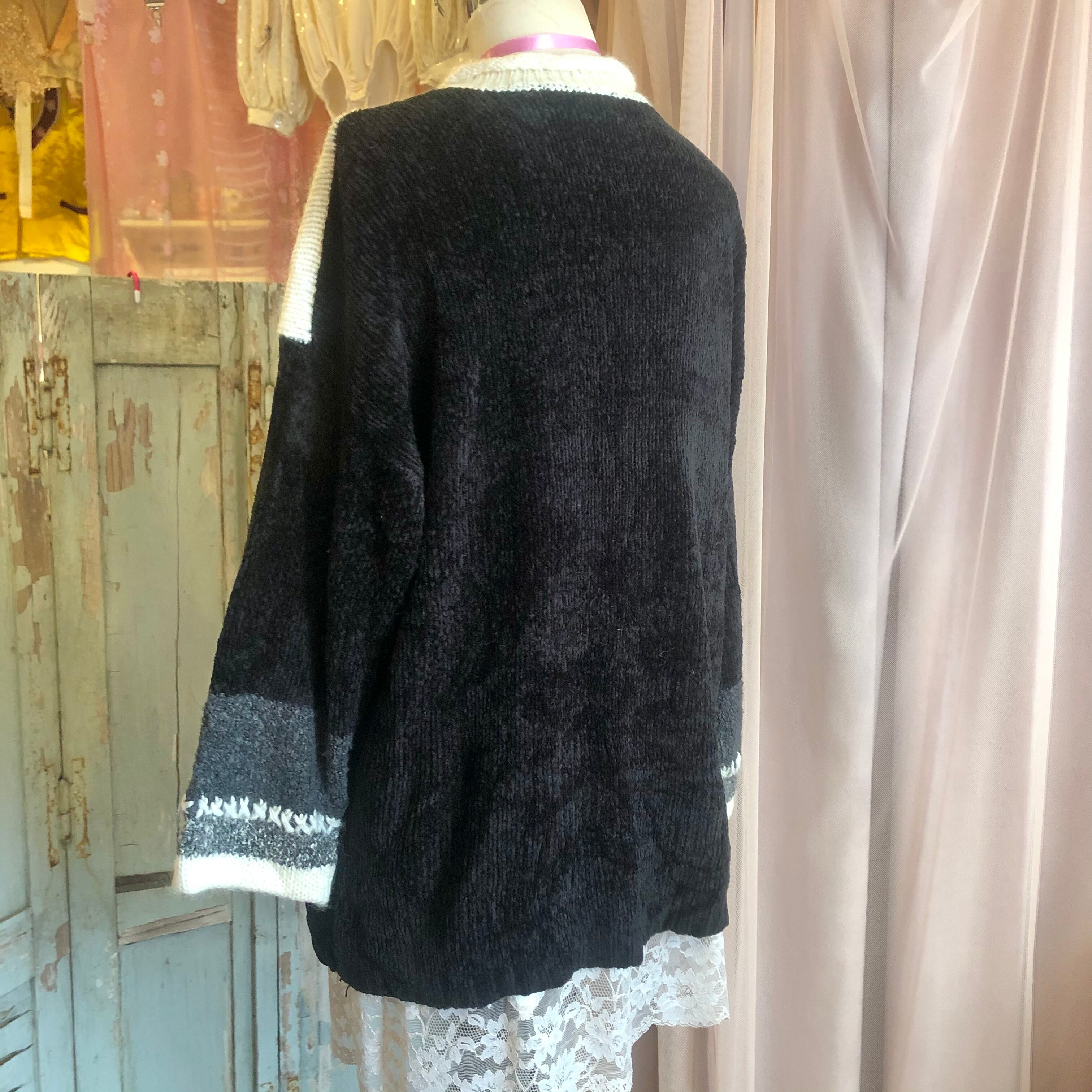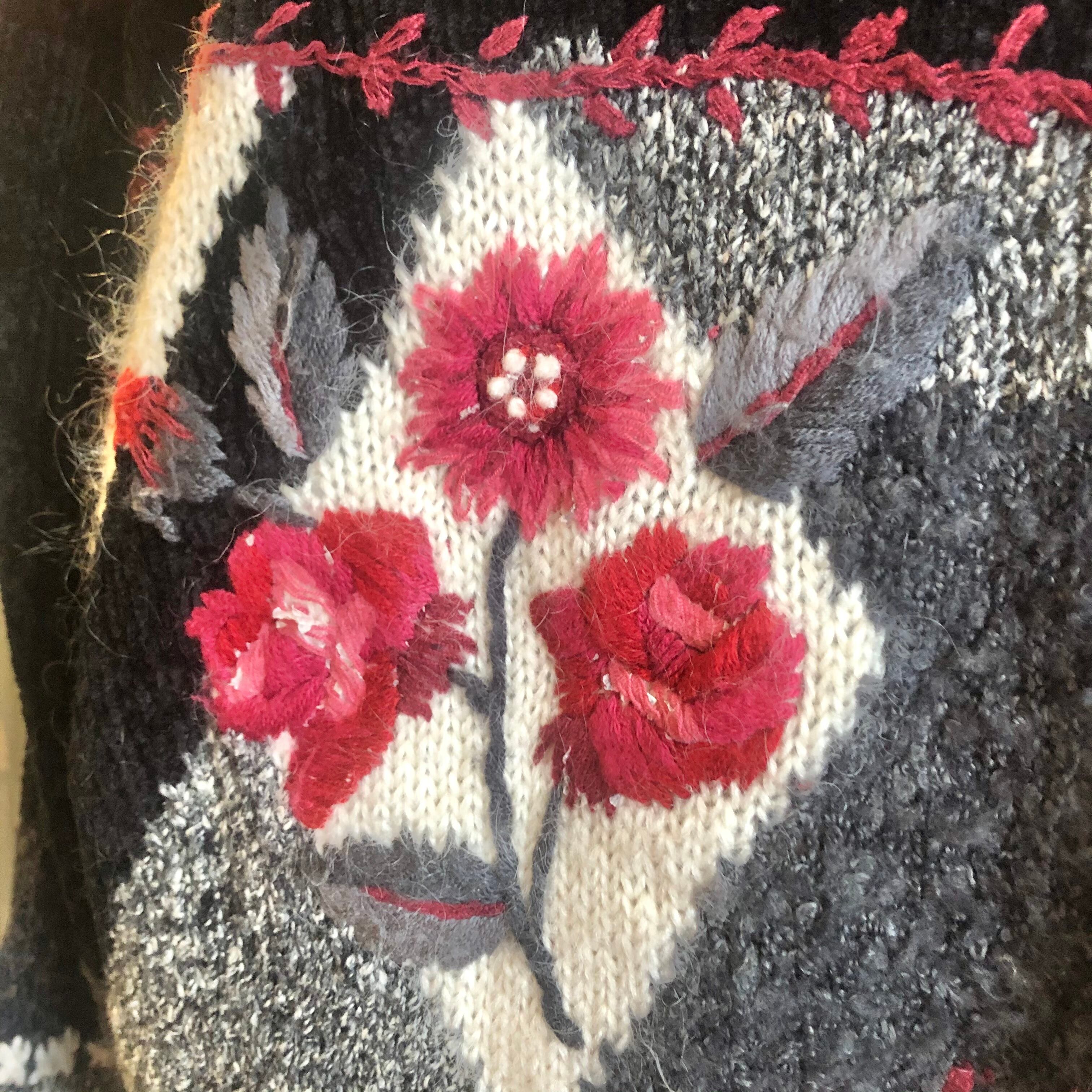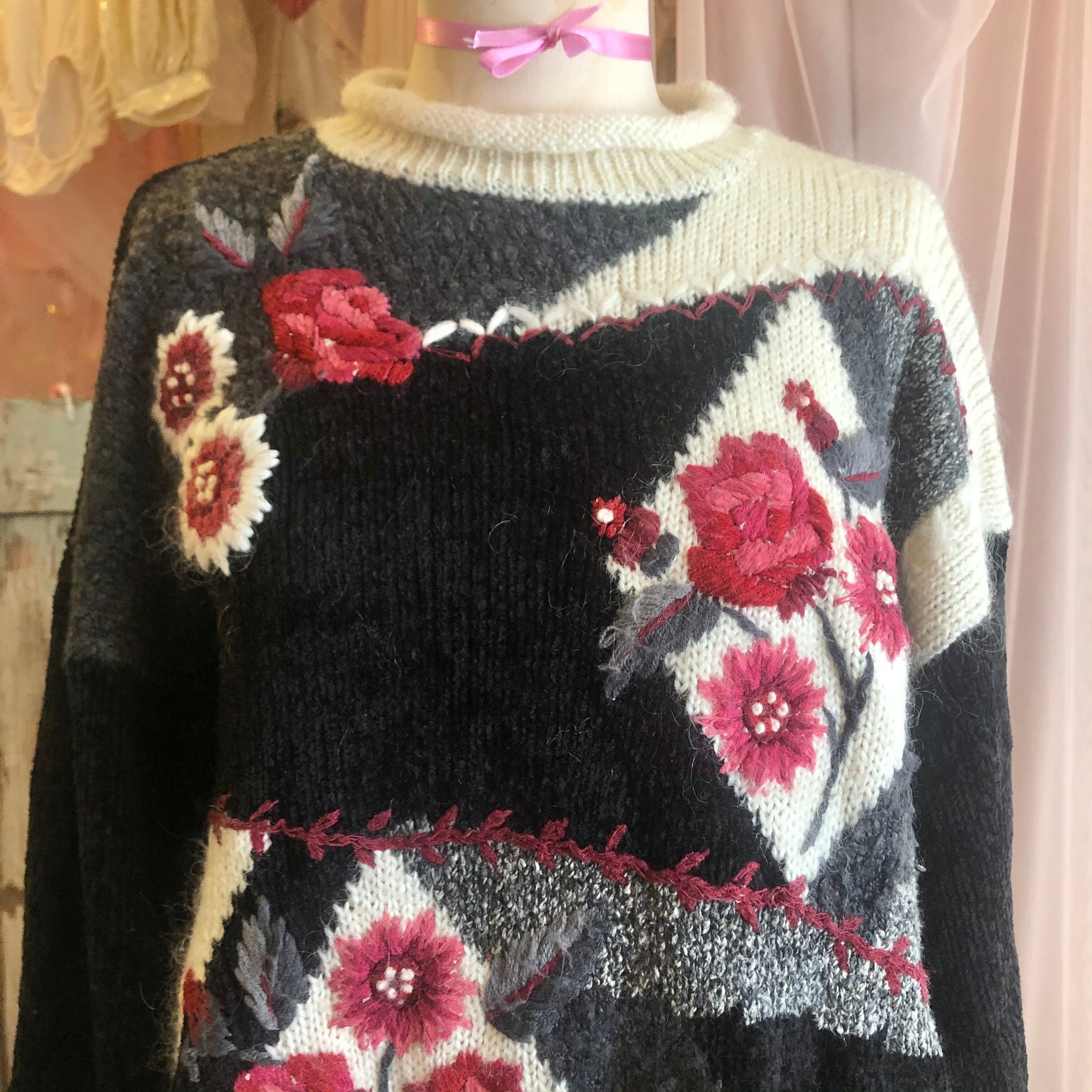 黒ベースに鮮やかな赤いお花が目を惹くニットセーター。