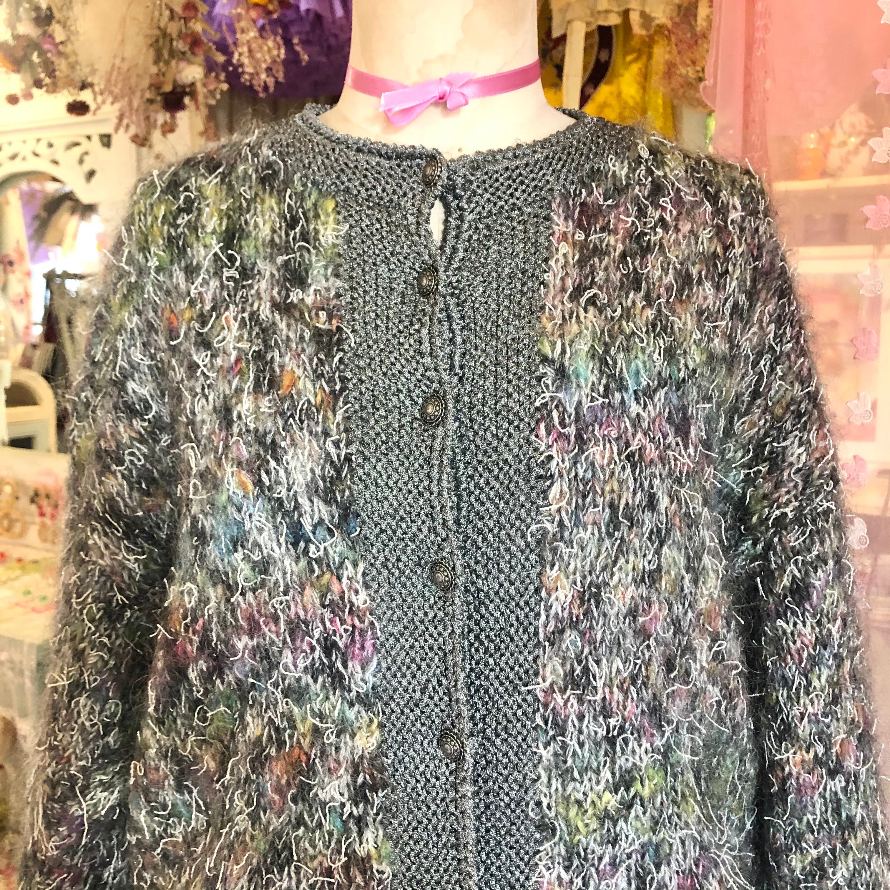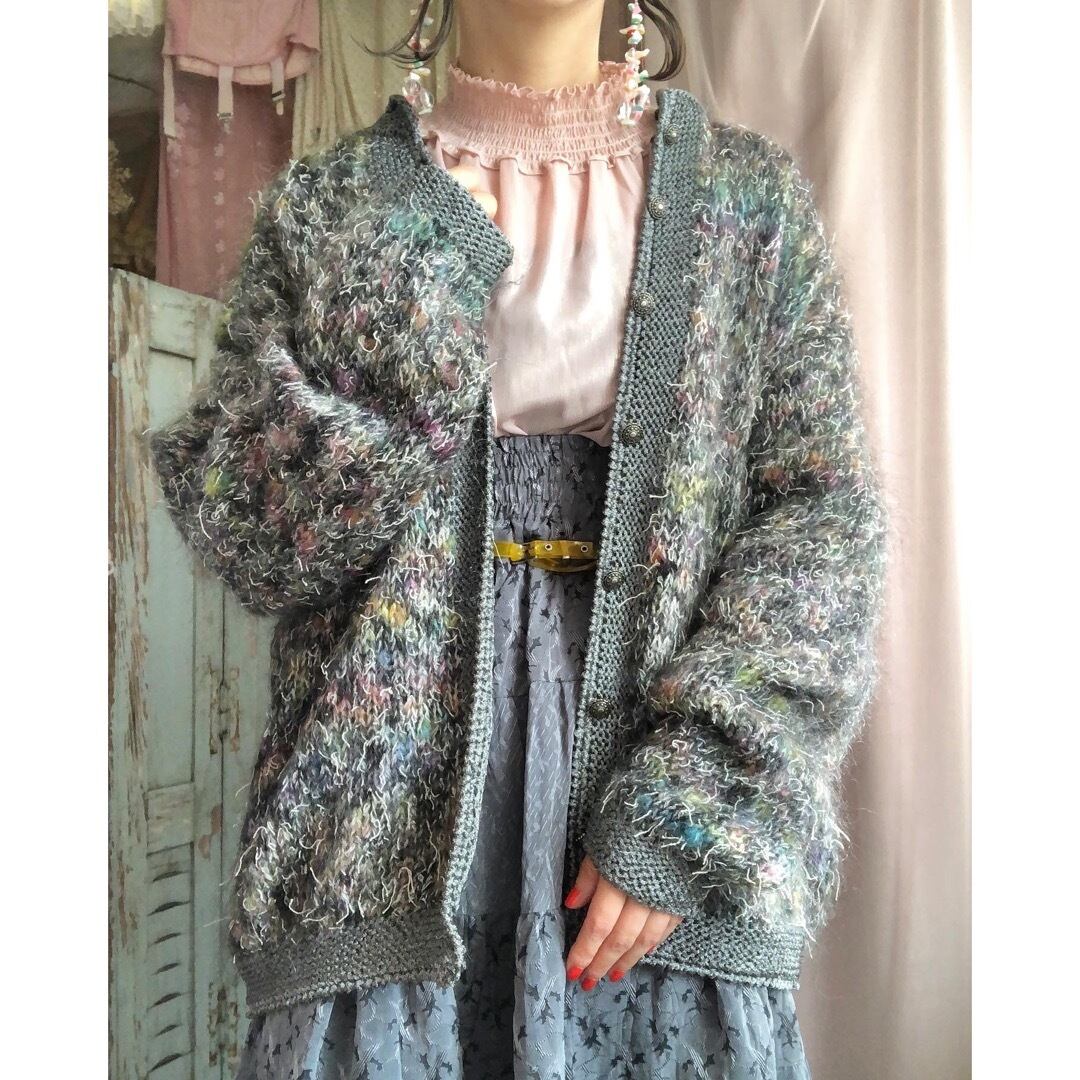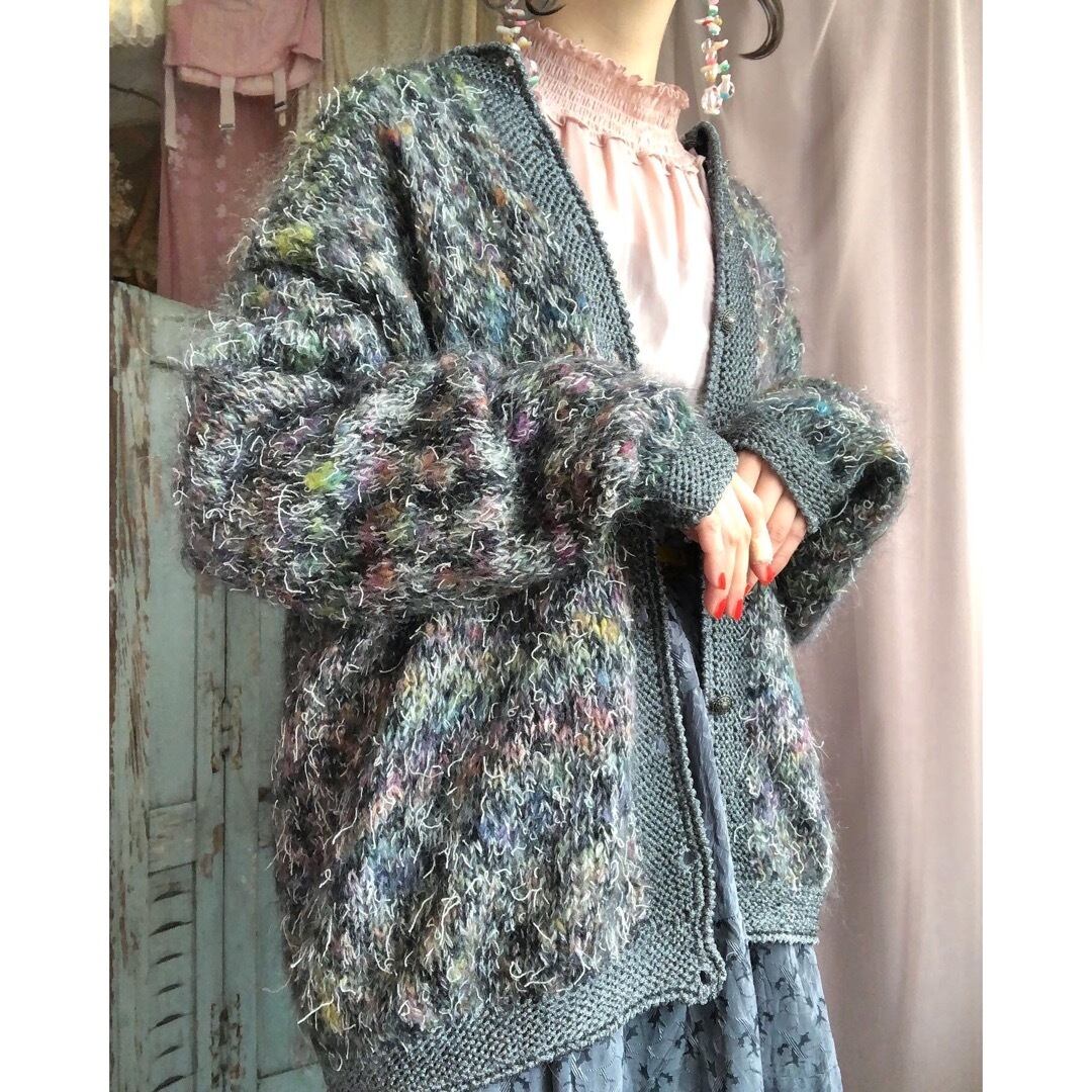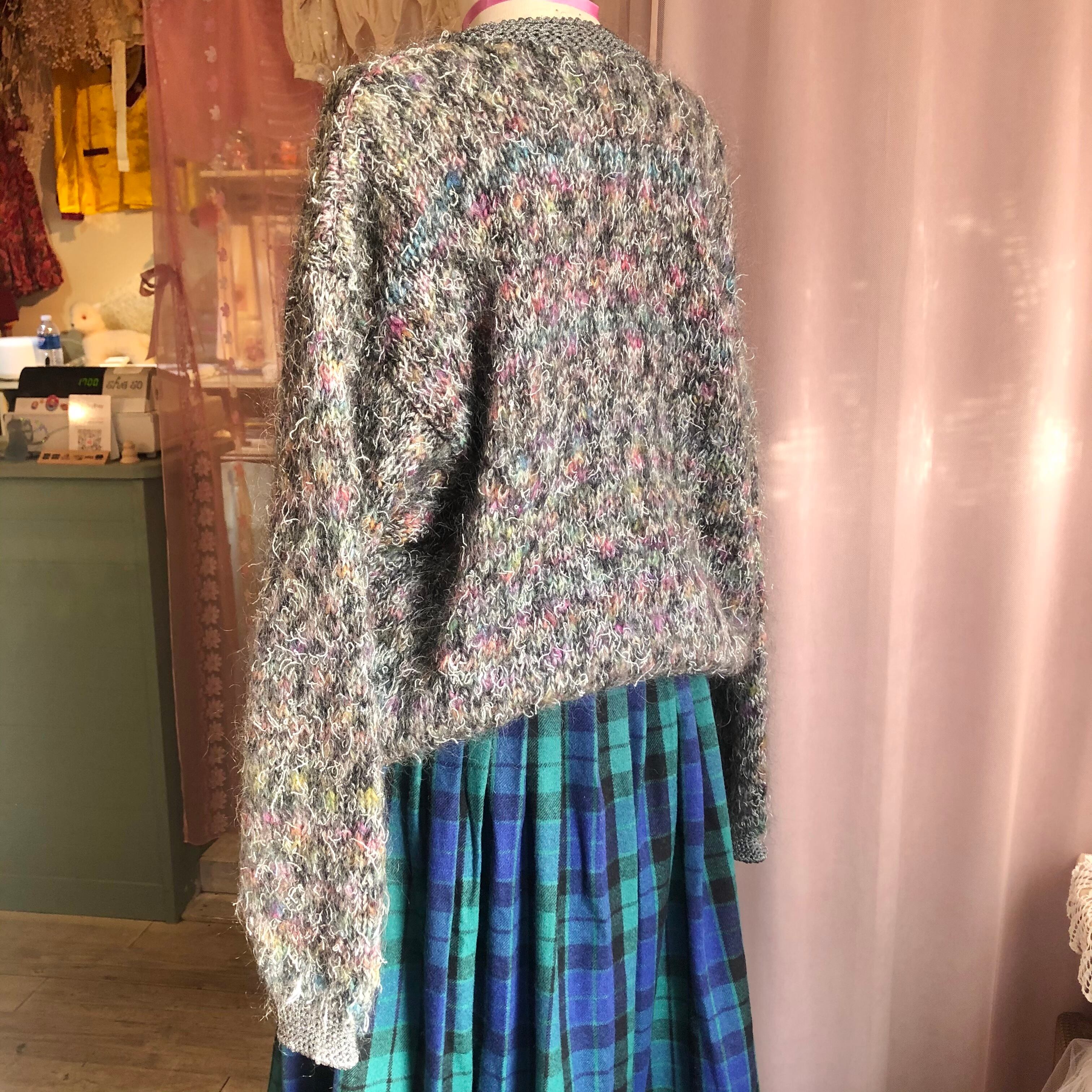 袖、裾や首もとからフロントにかけて編まれたシルバーのラメ糸がさりげなくきらめいて素敵です。