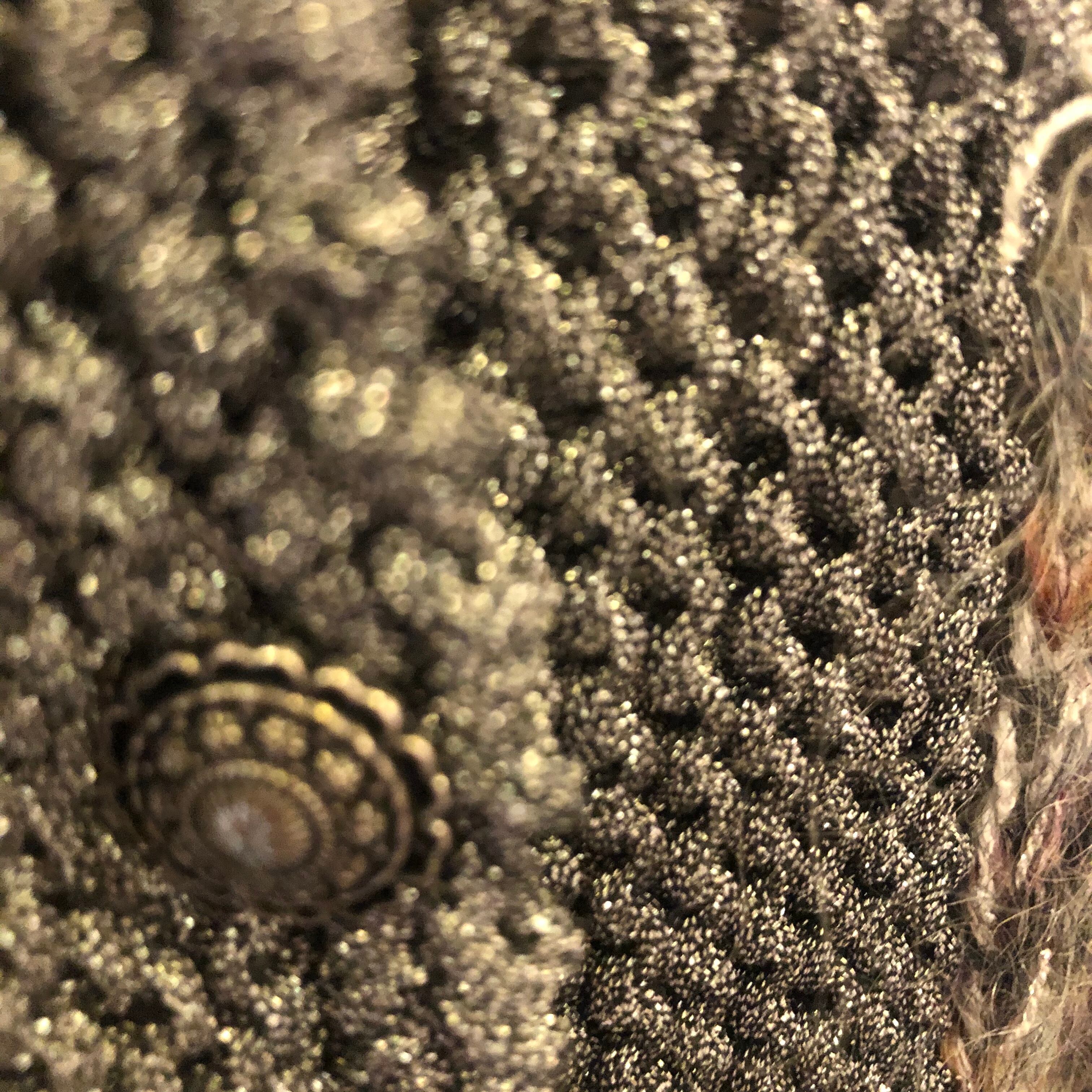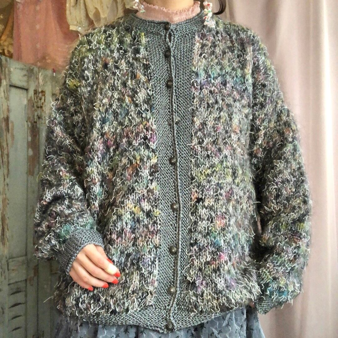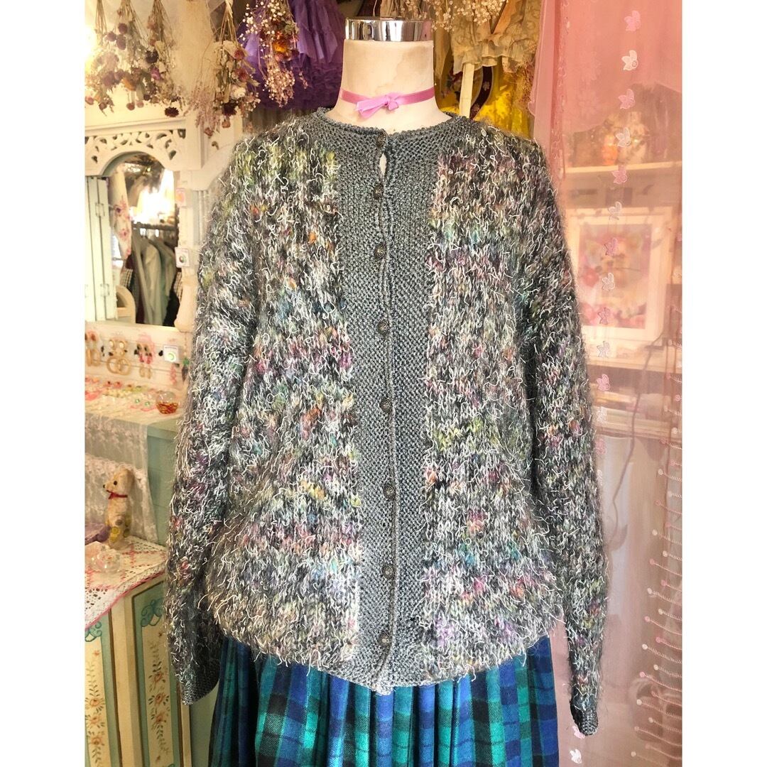 袖、裾や首もとからフロントにかけて編まれたシルバーのラメ糸がさりげなくきらめいて素敵です。