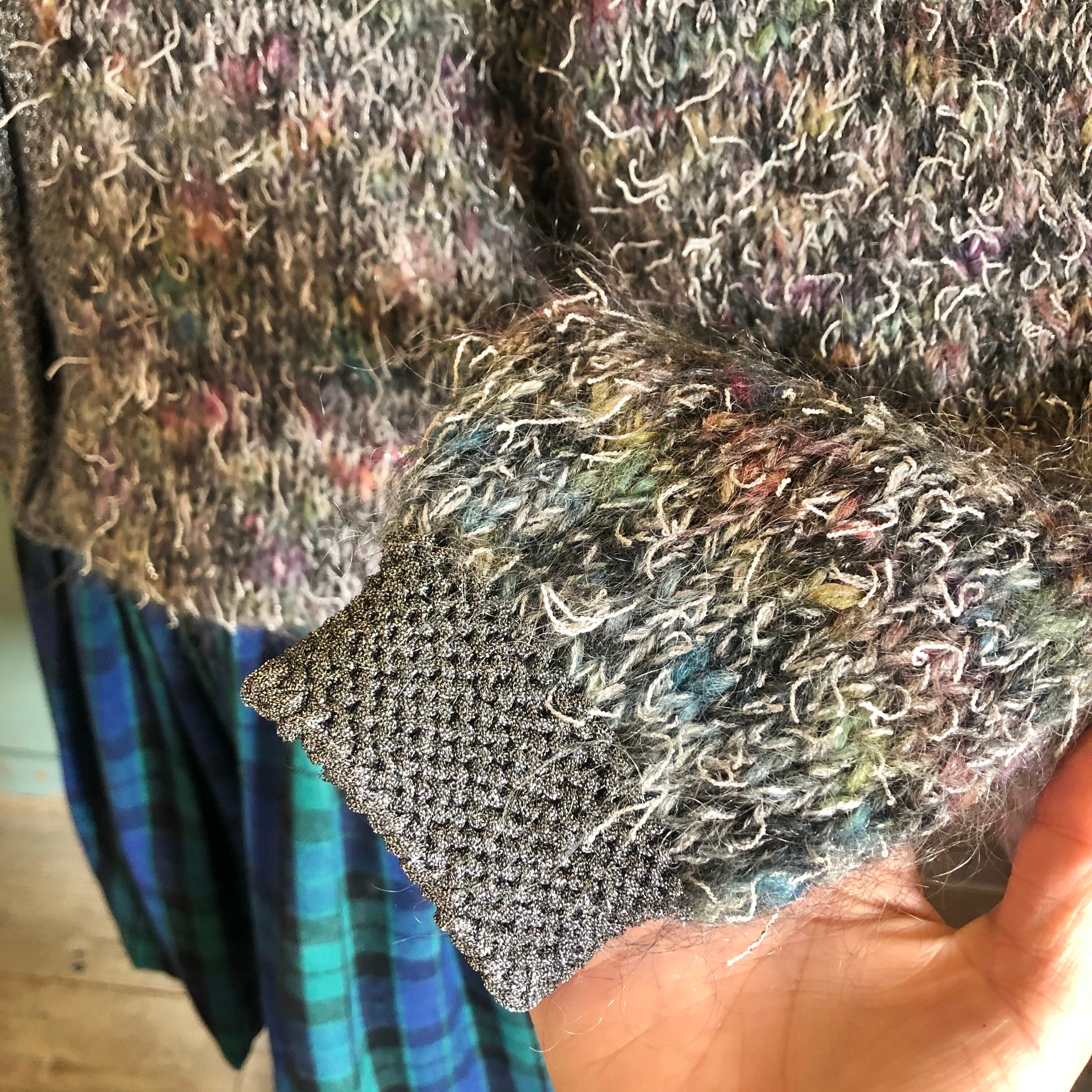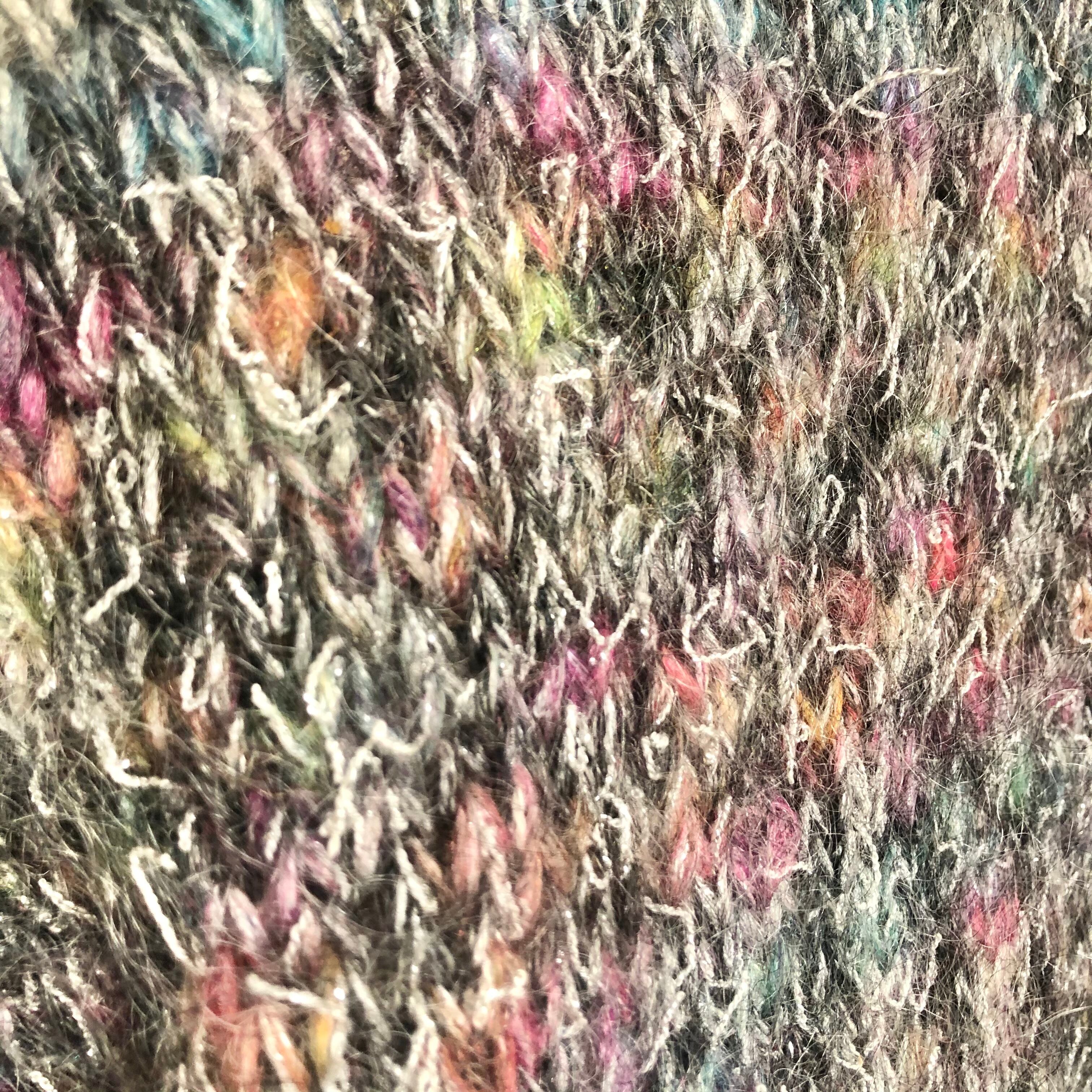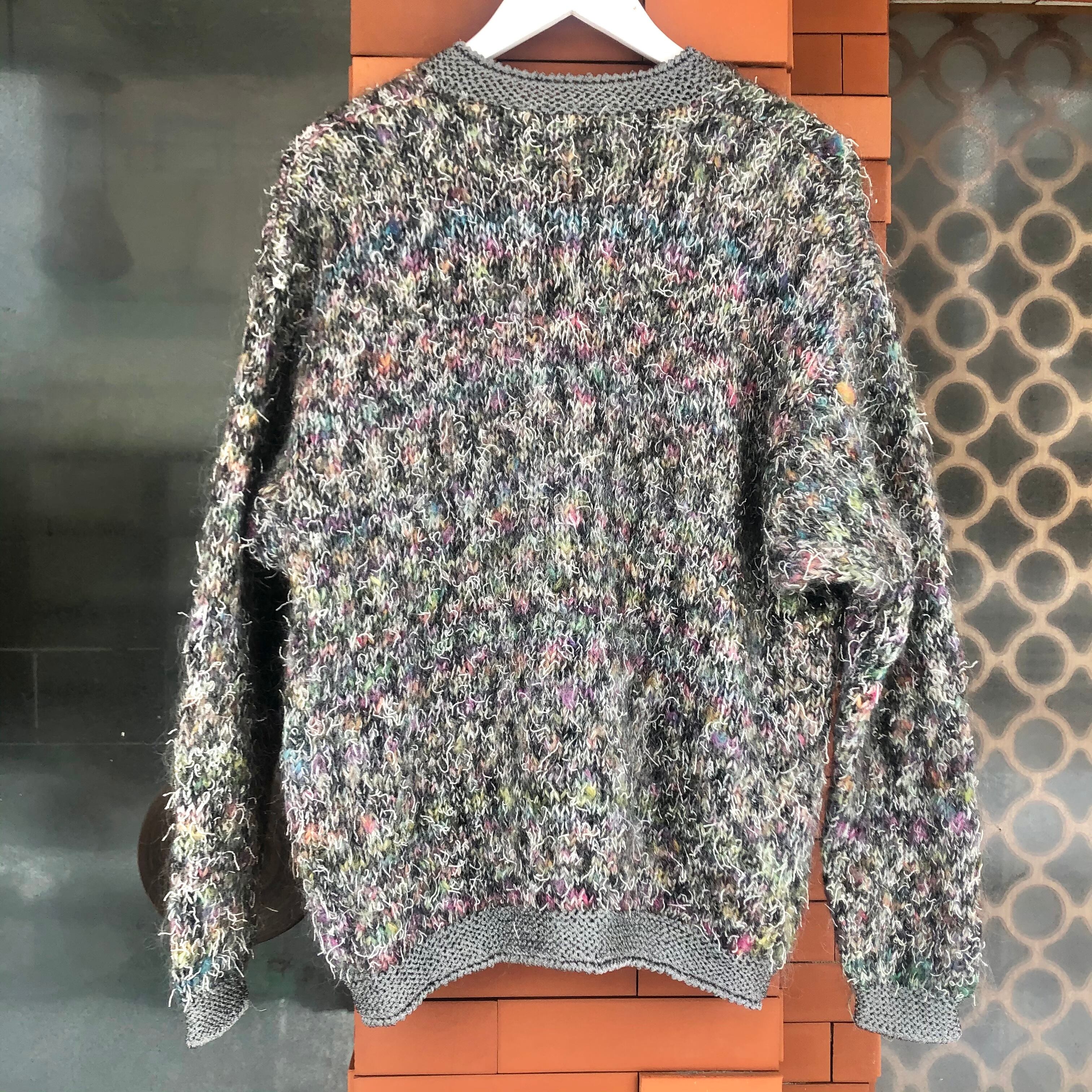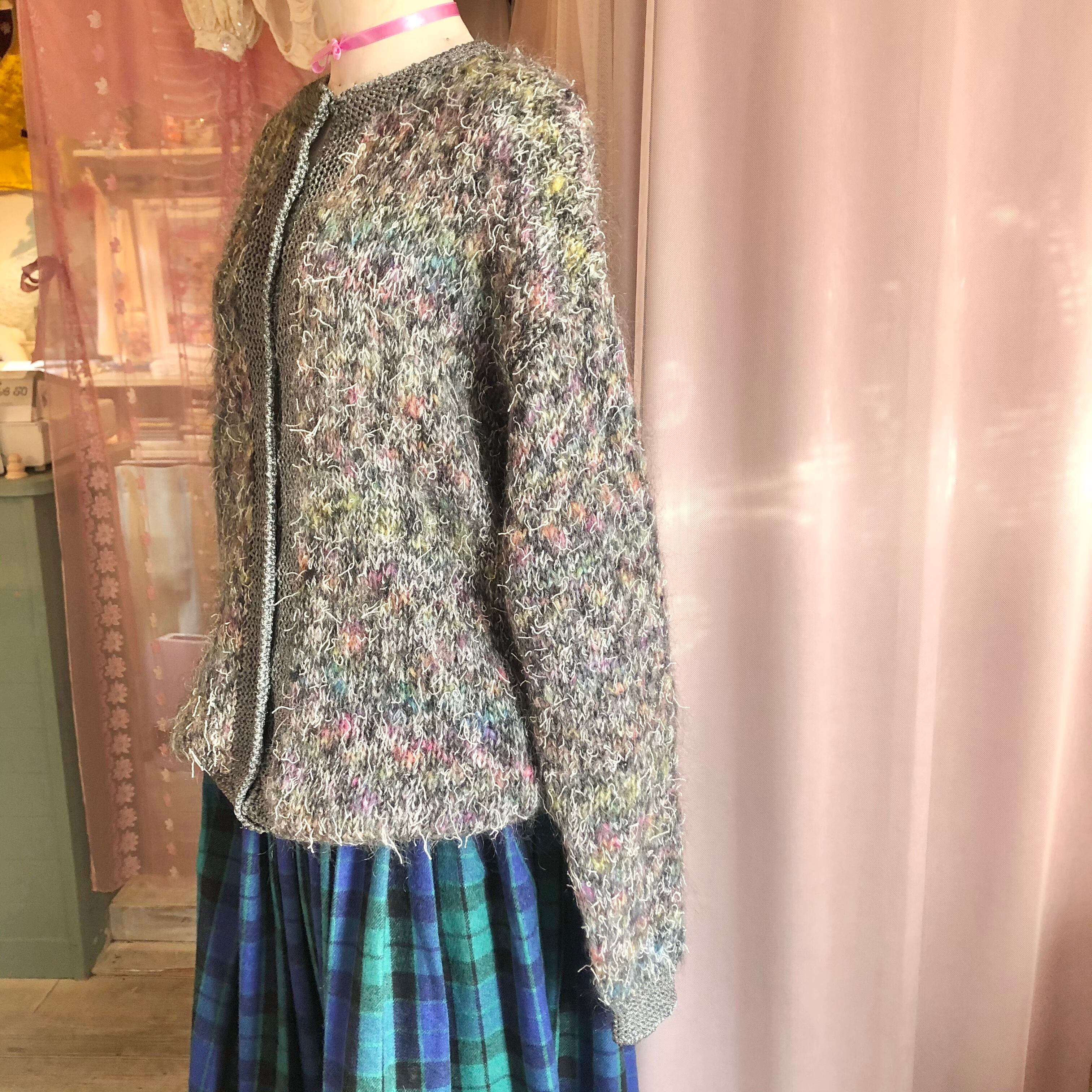 袖、裾や首もとからフロントにかけて編まれたシルバーのラメ糸がさりげなくきらめいて素敵です。