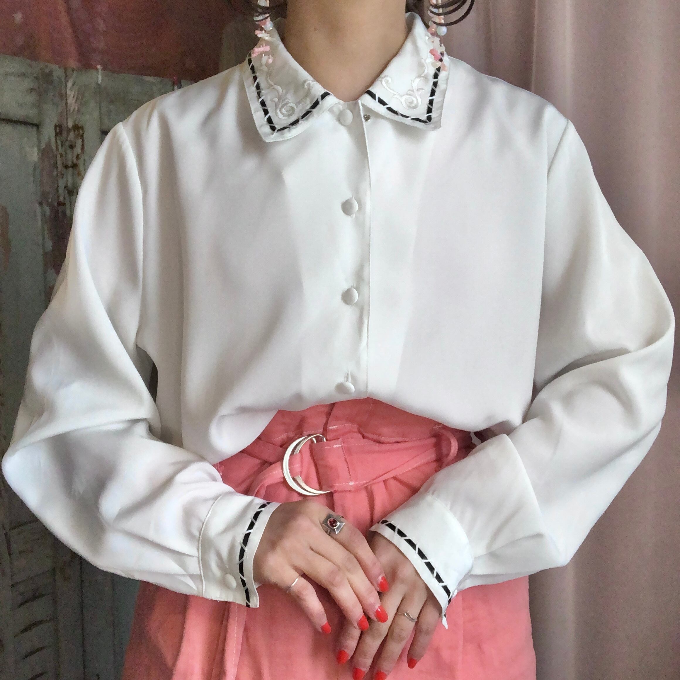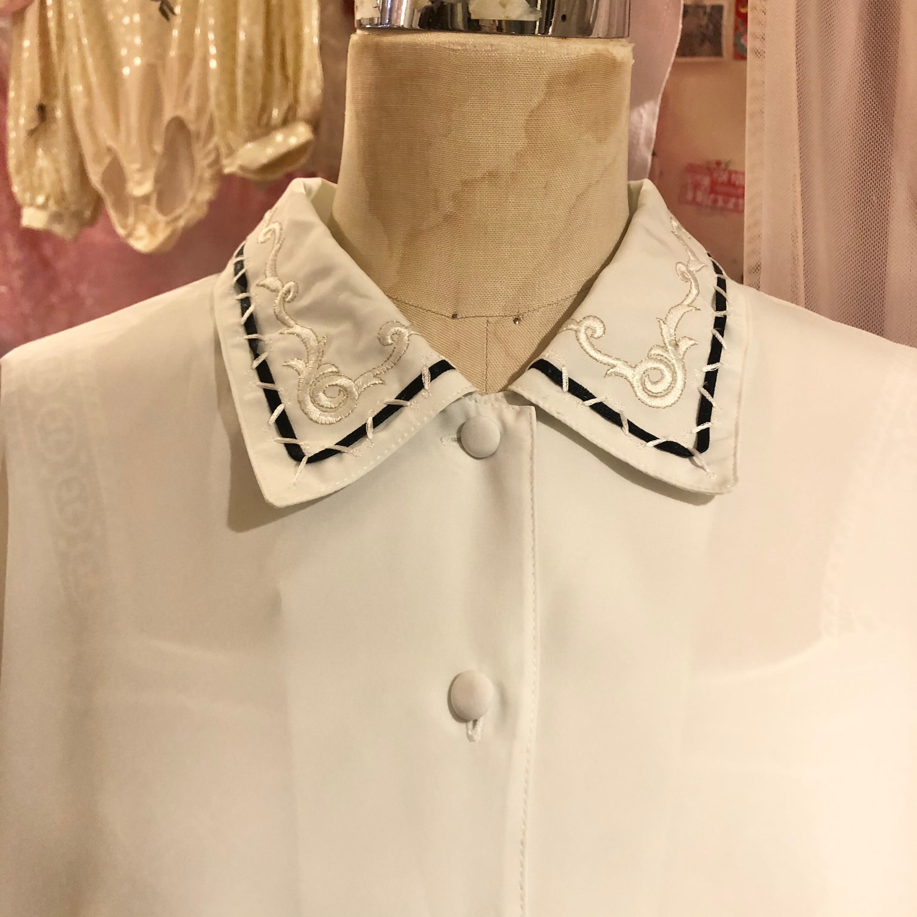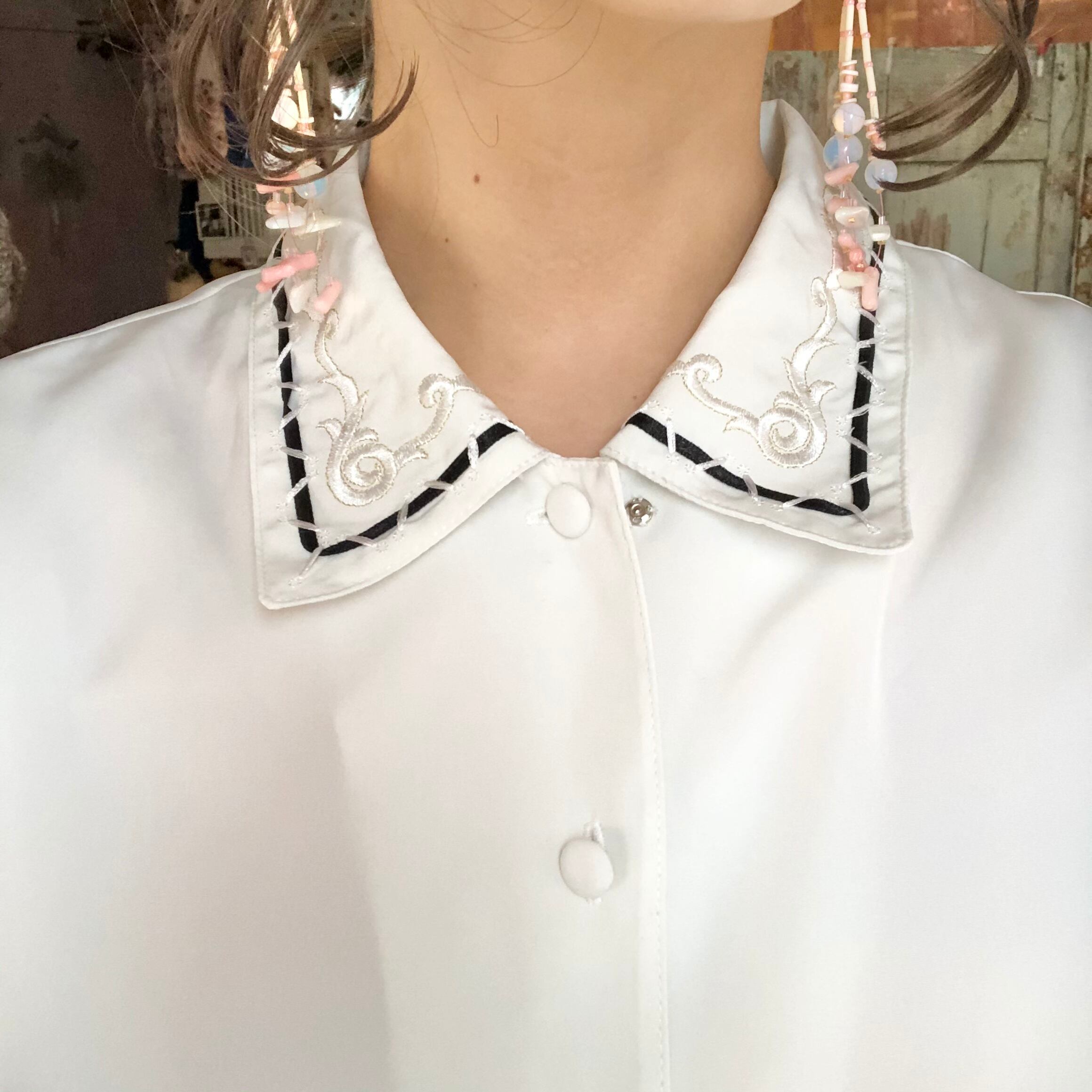 草木模様のような刺繍が襟に施された白シャツです。よくみるとゴールドの糸が使われていたり、細部まで凝ったデザインです 。