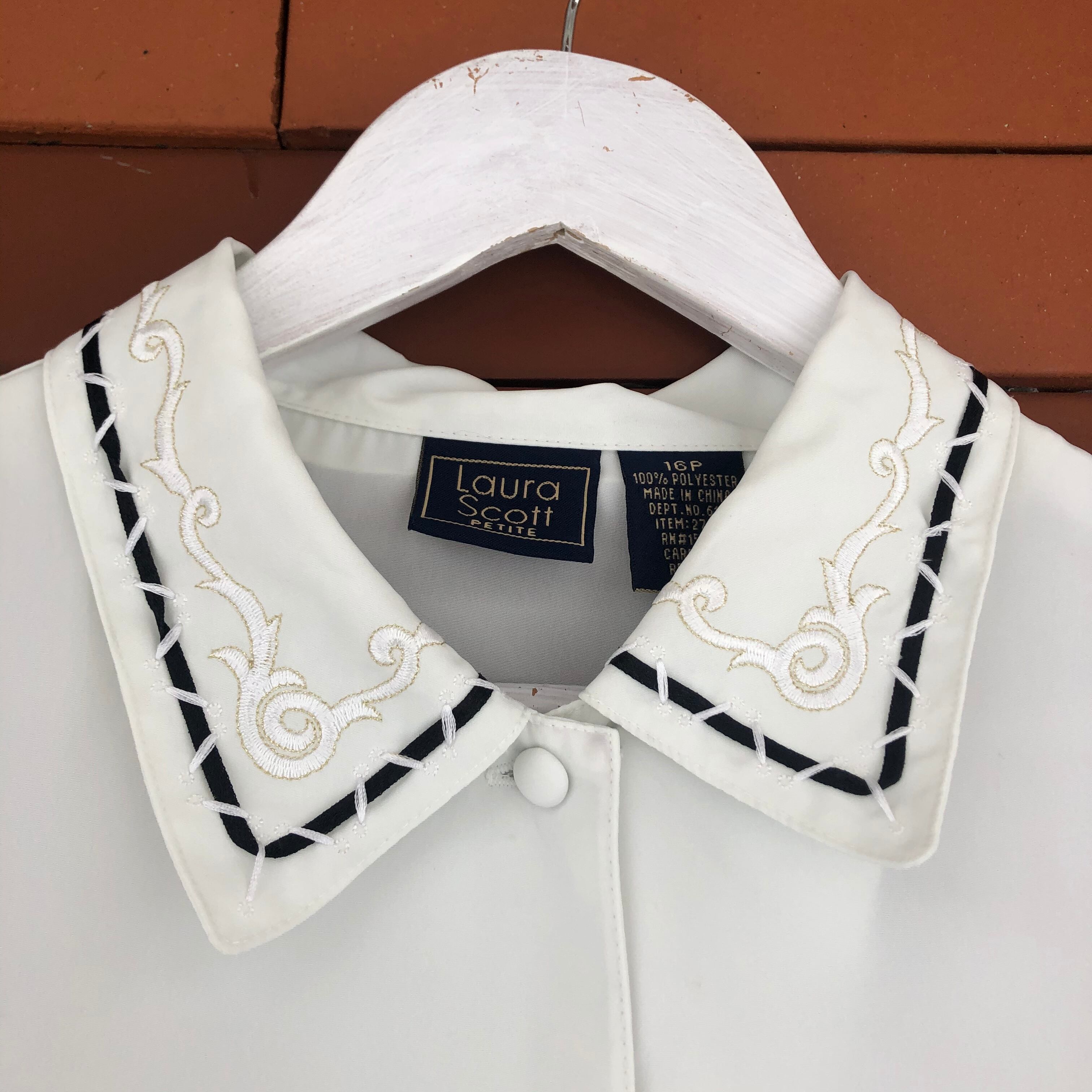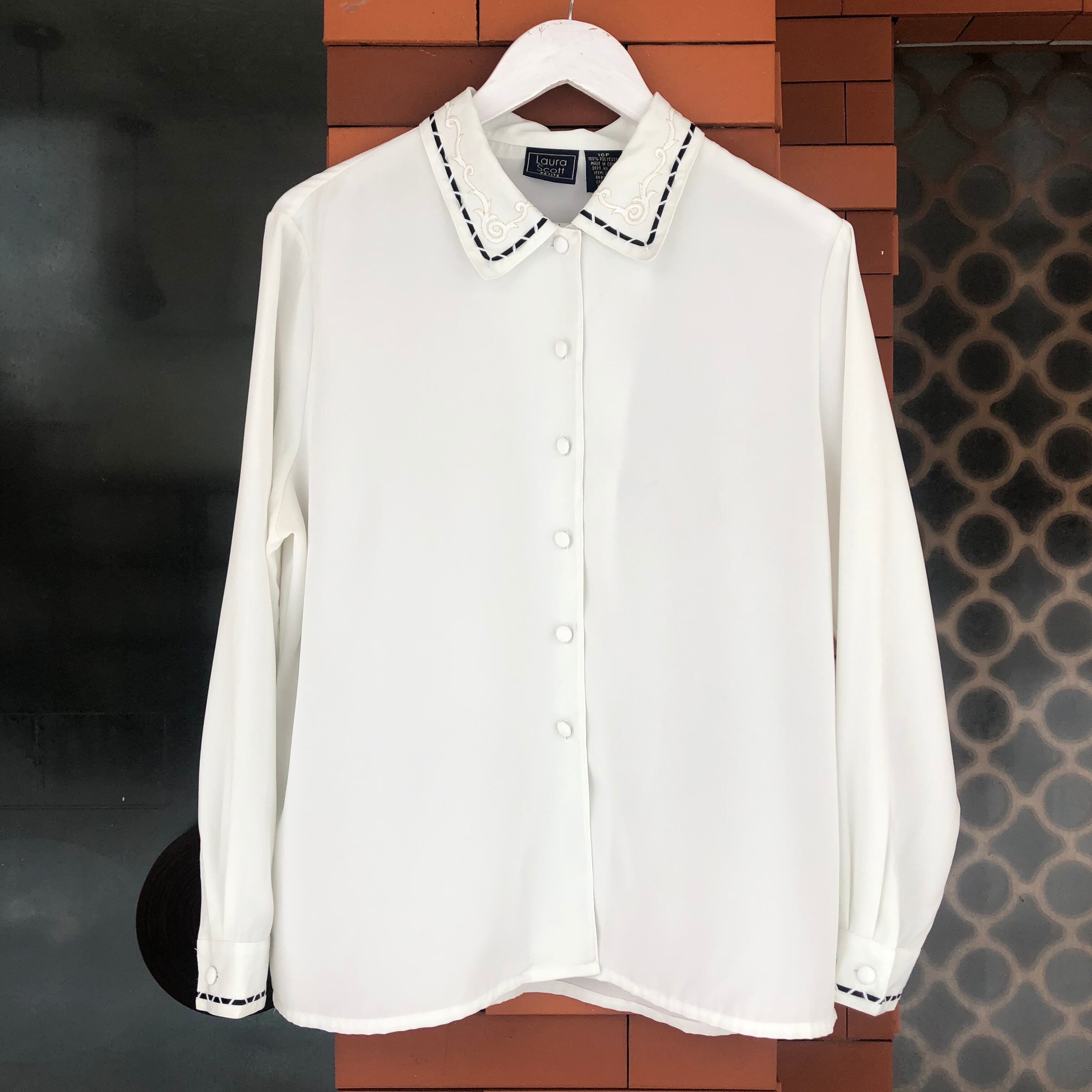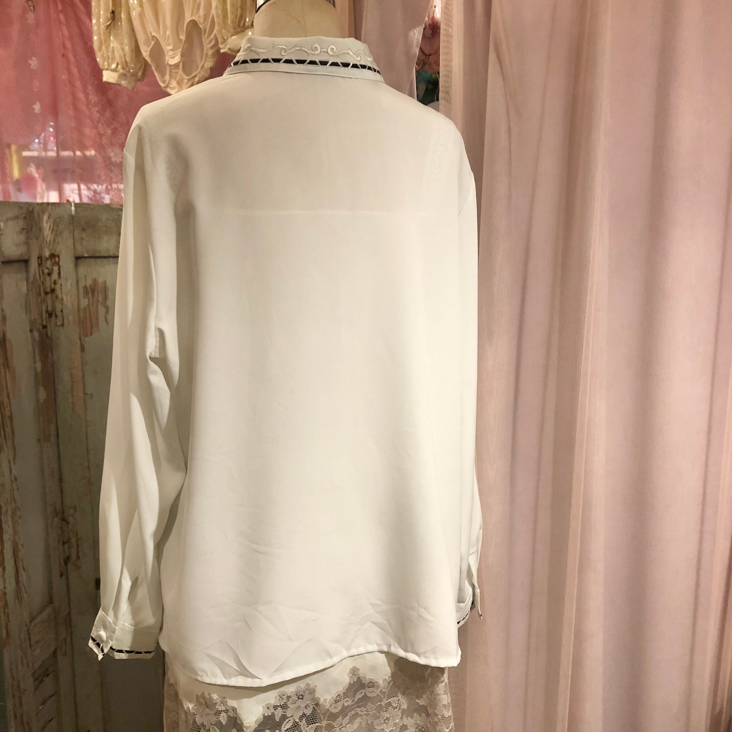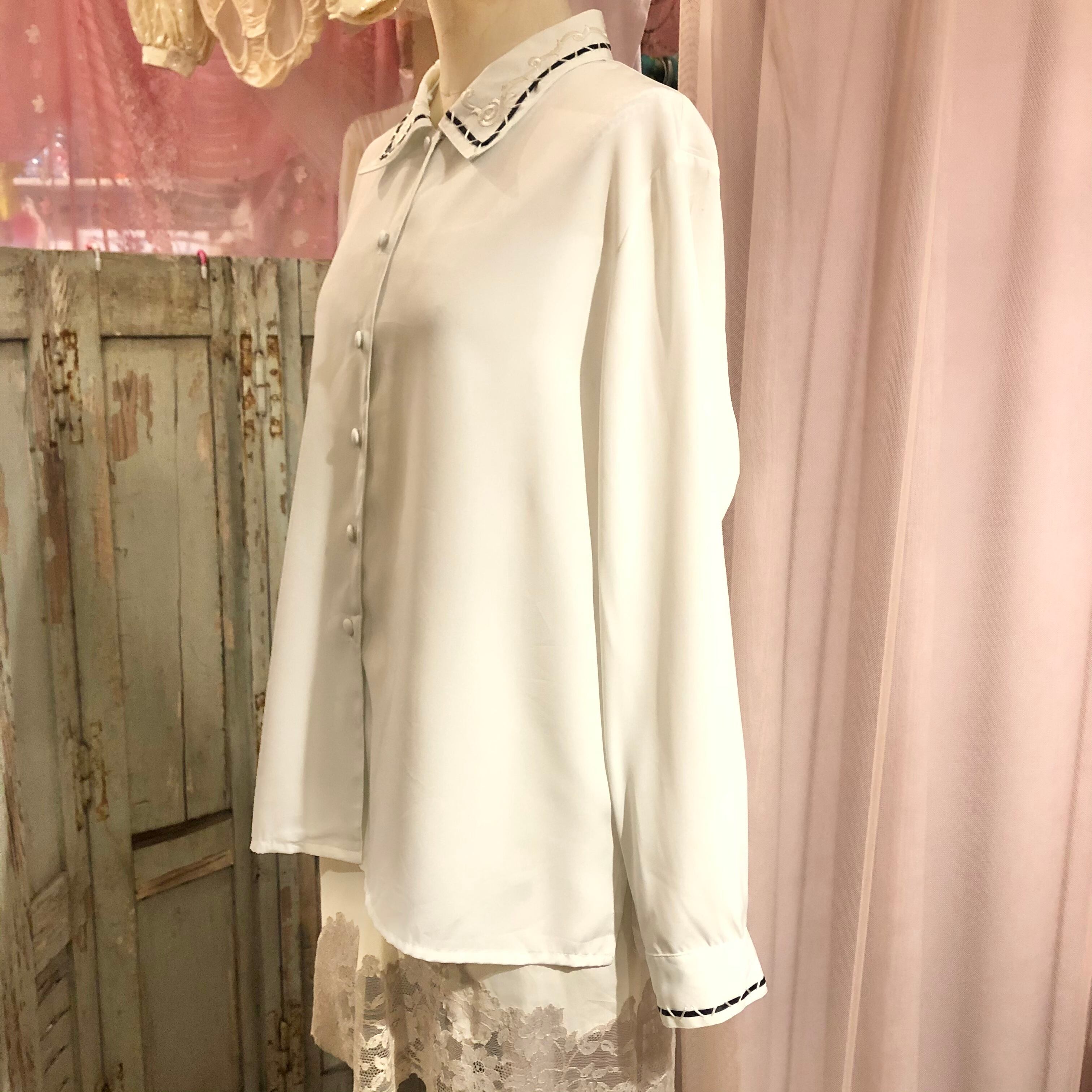 草木模様のような刺繍が襟に施された白シャツです。よくみるとゴールドの糸が使われていたり、細部まで凝ったデザインです 。