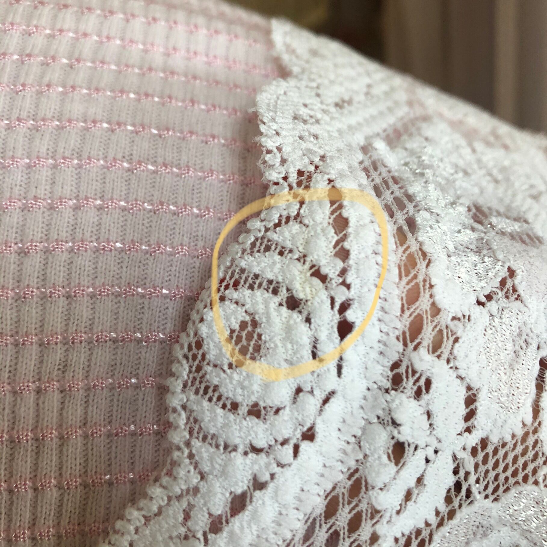 ランジェリーにみられるひきつれたような跡が数箇所あり、破れなどはありません。