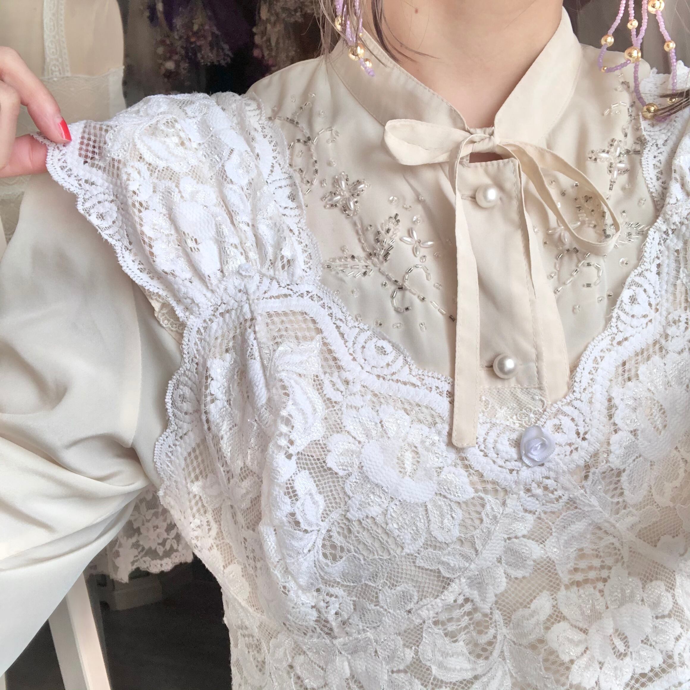 レースの部分はストレッチが効いており伸縮性があります。季節を選ばず、重ね着がたのしめるアイテムです 。