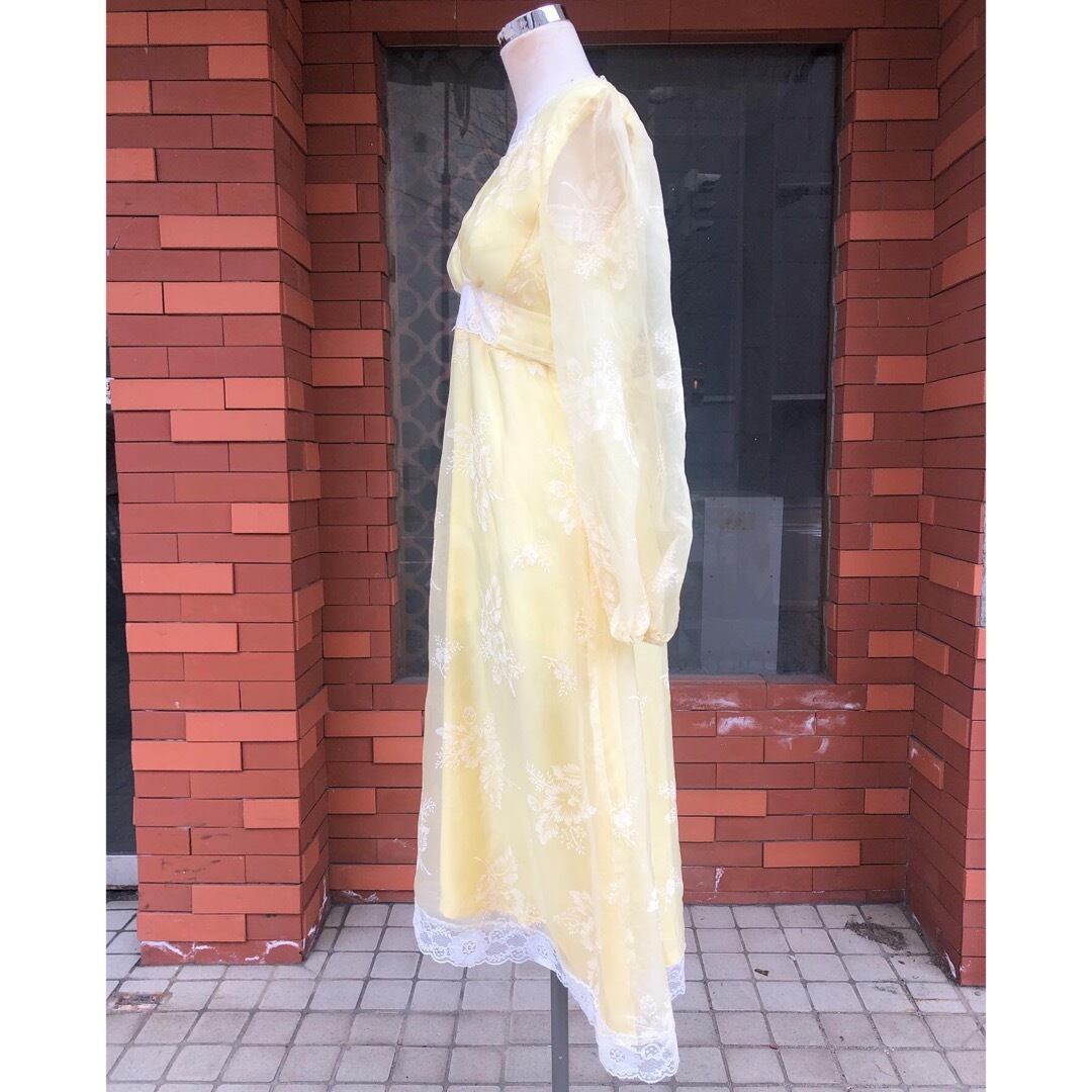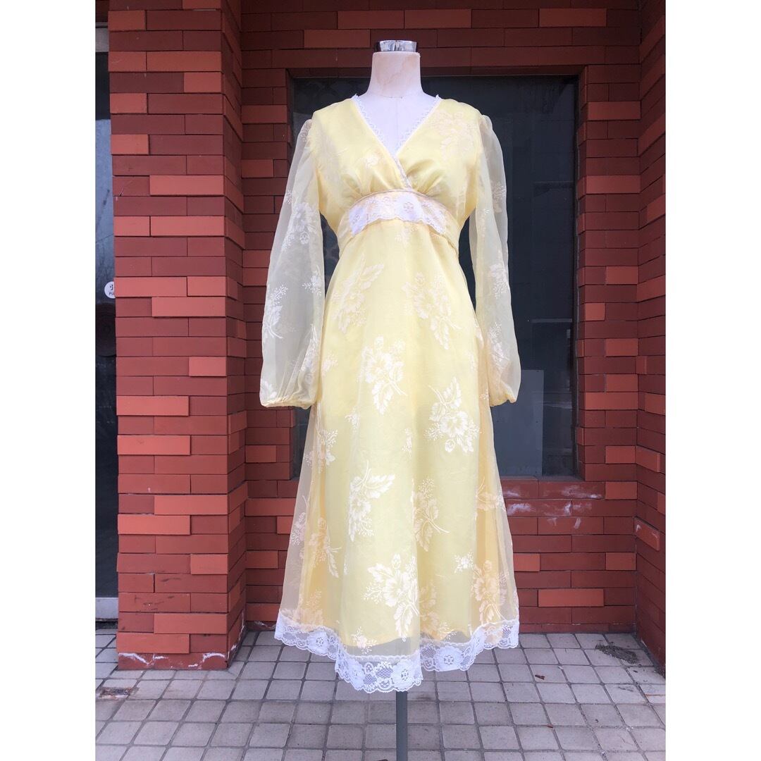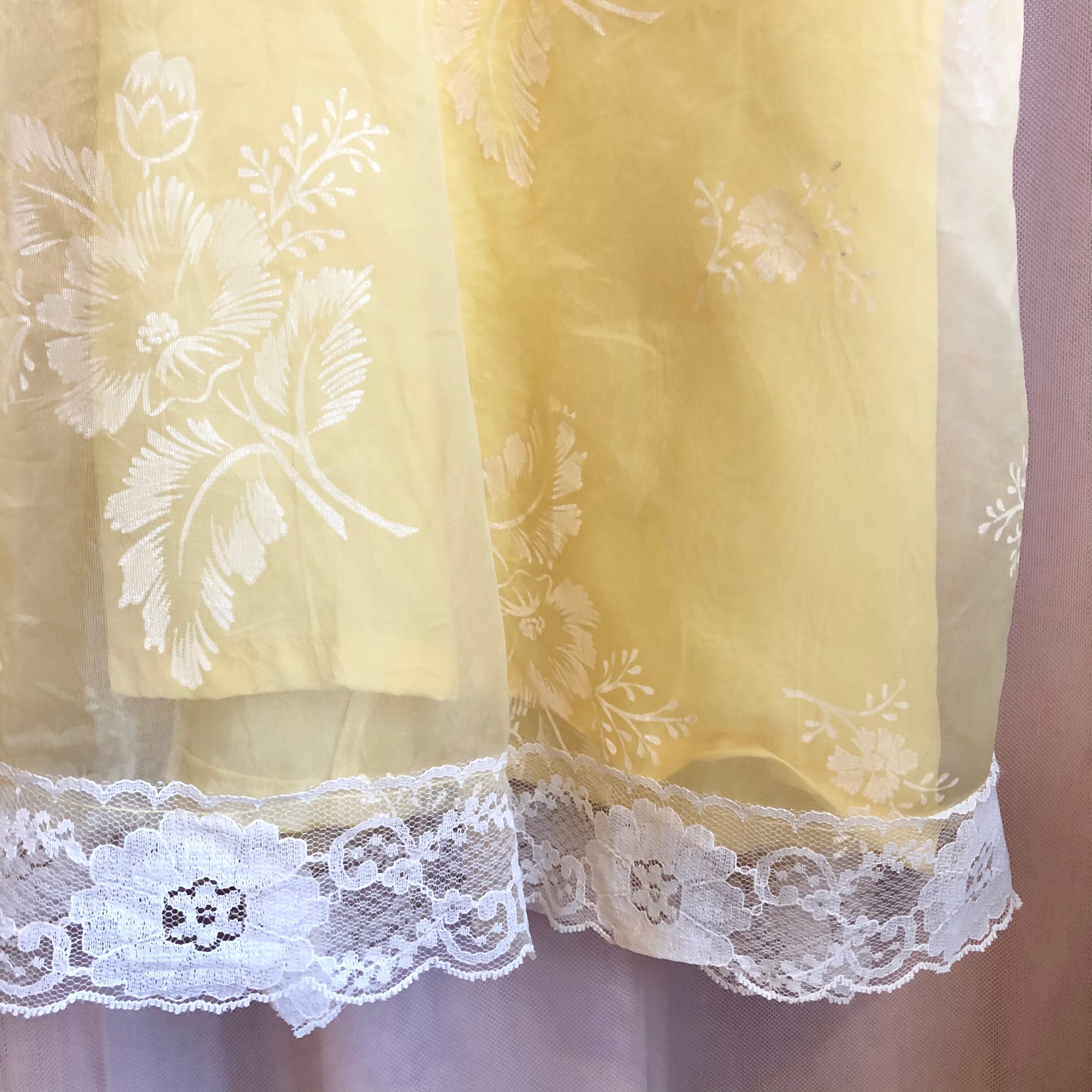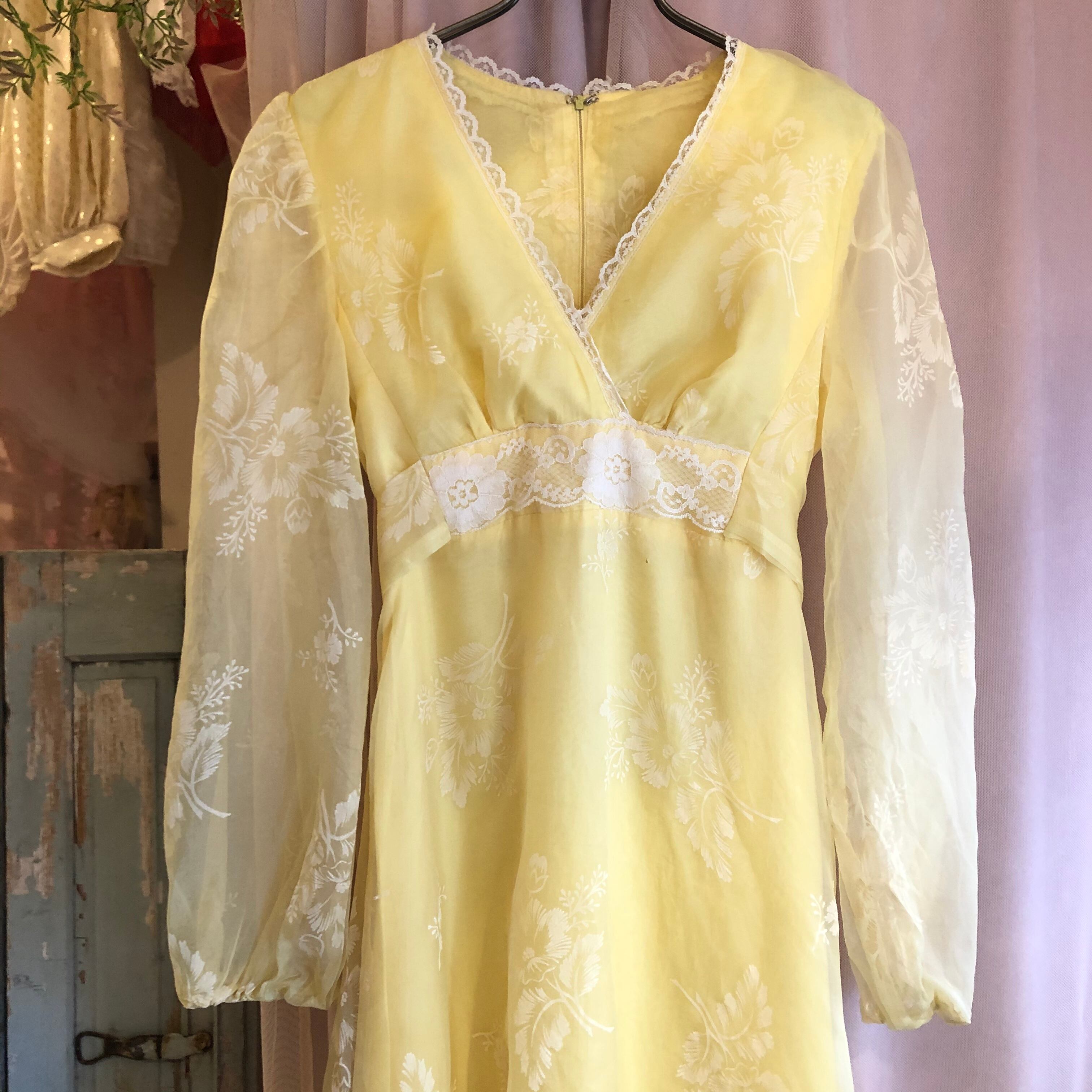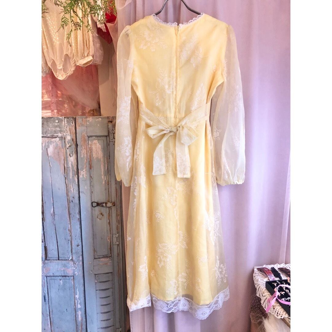 フロッキープリントのお花がぼんやり浮かび上がったイエローのシアーワンピース。