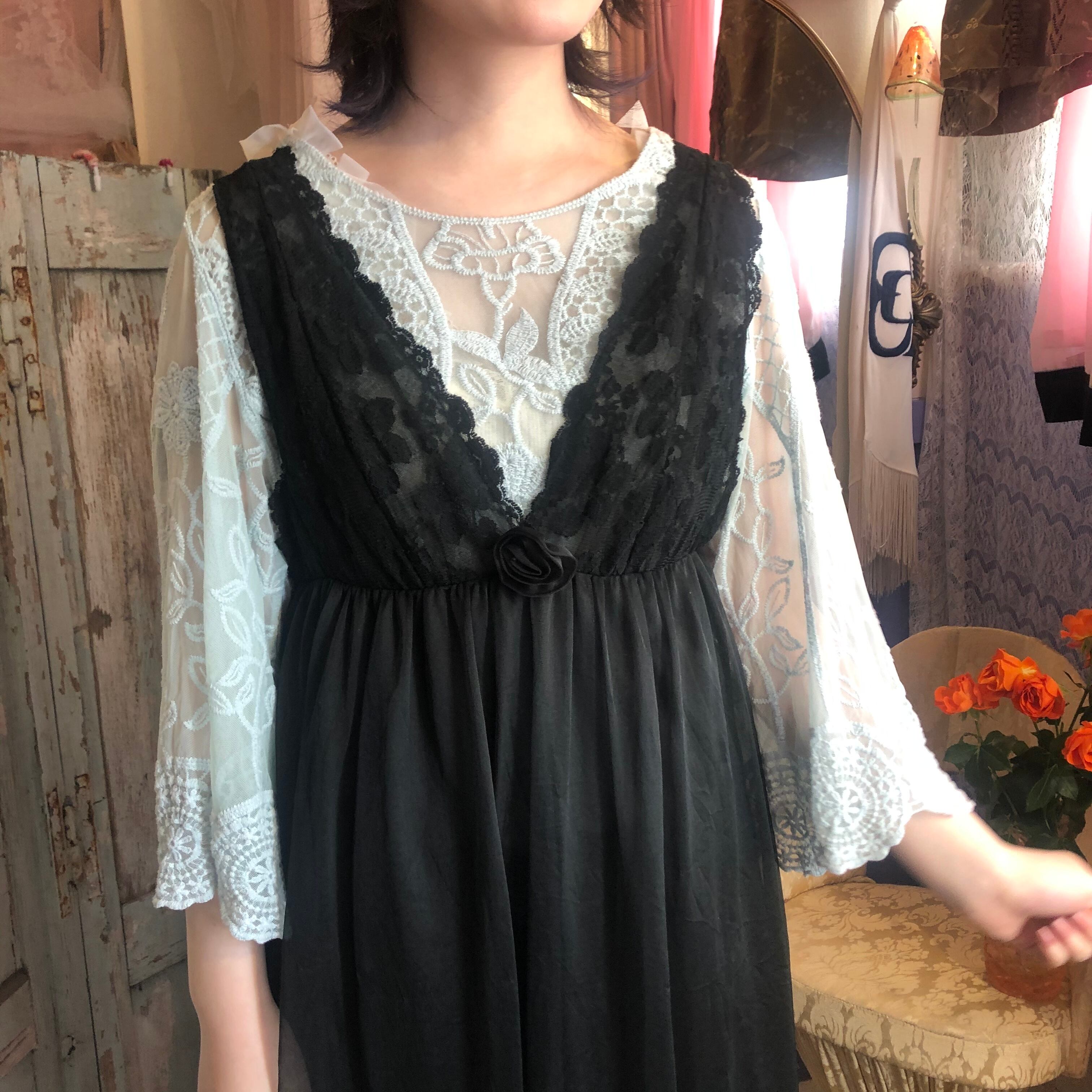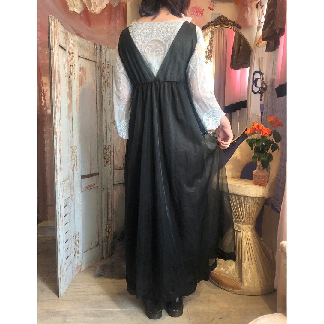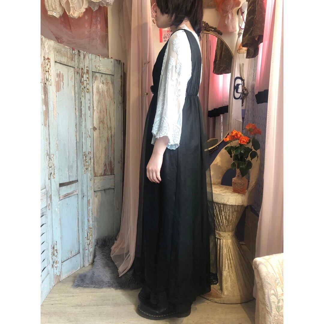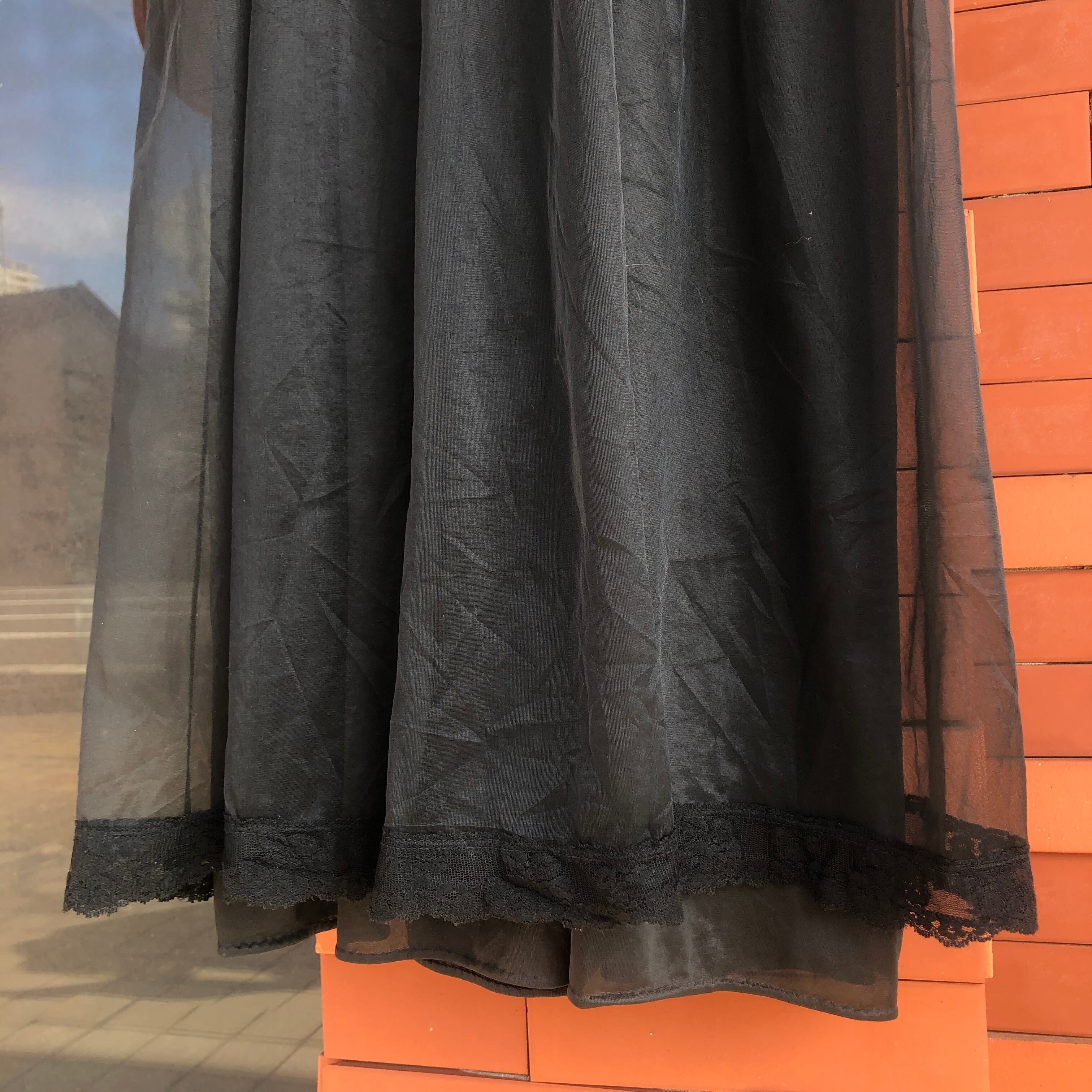 胸、肩のストラップ部分の前面がレースでスカート部分は裏地付きのシアースカートになっています。黒ですが透け感があるので重くならず、風に揺れるさまは軽やかです。