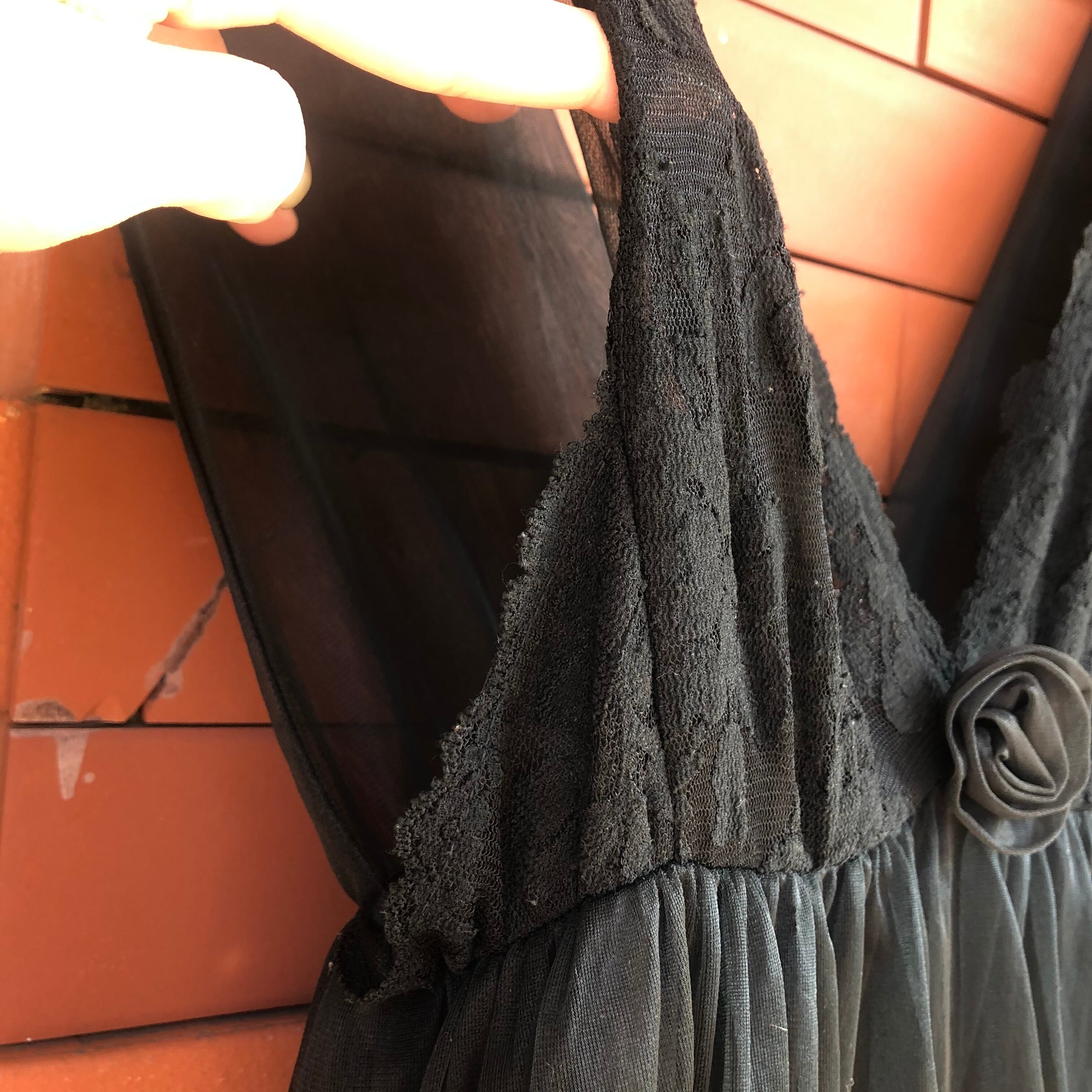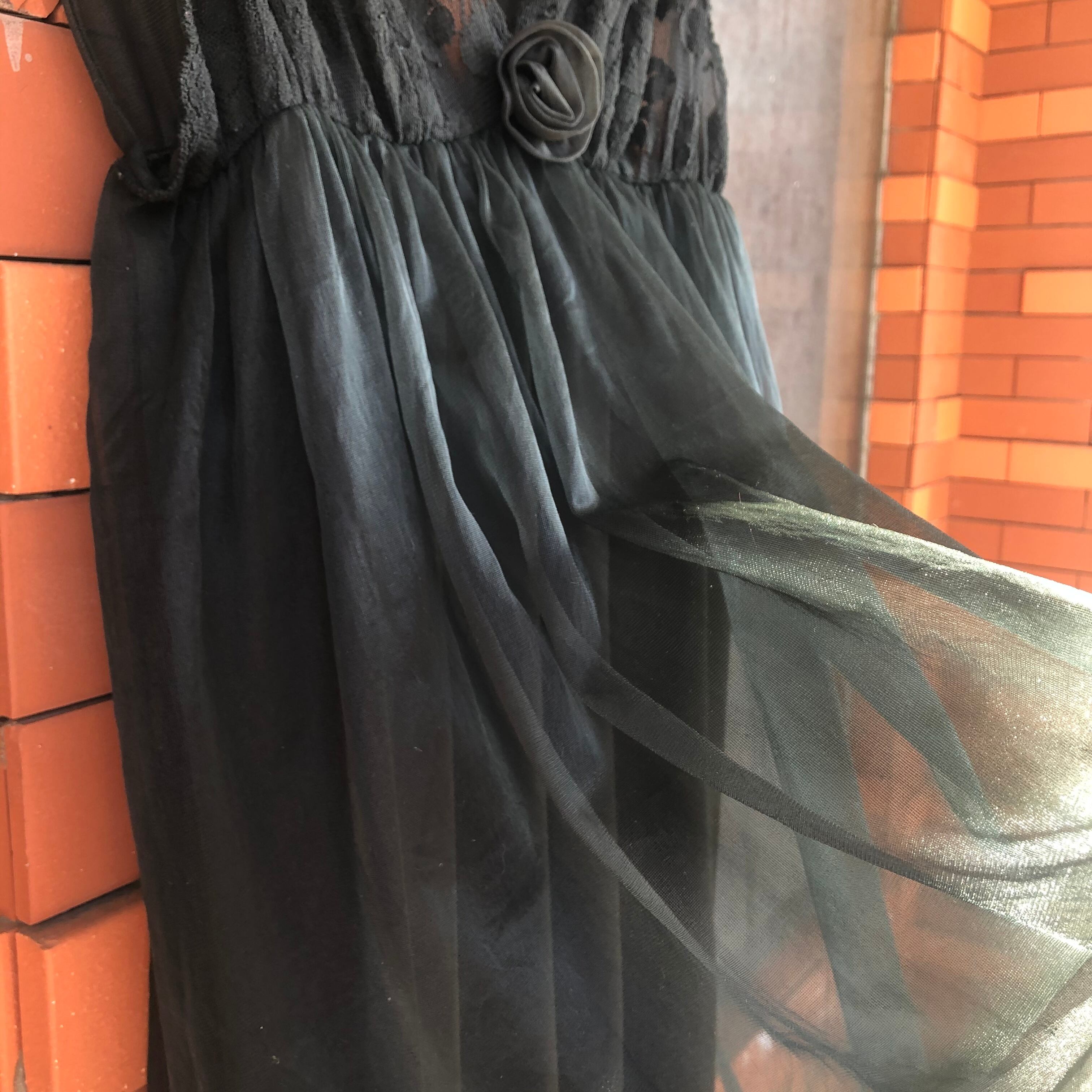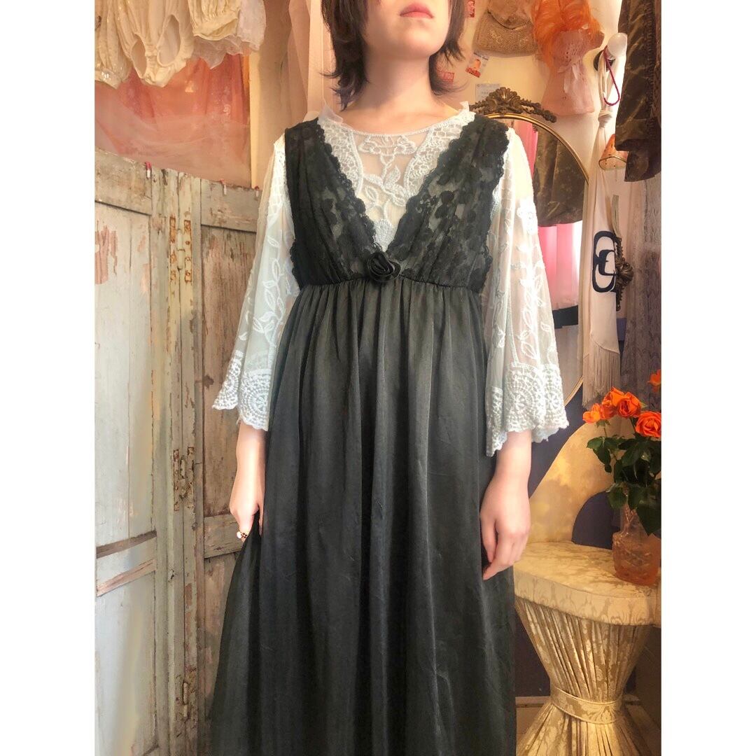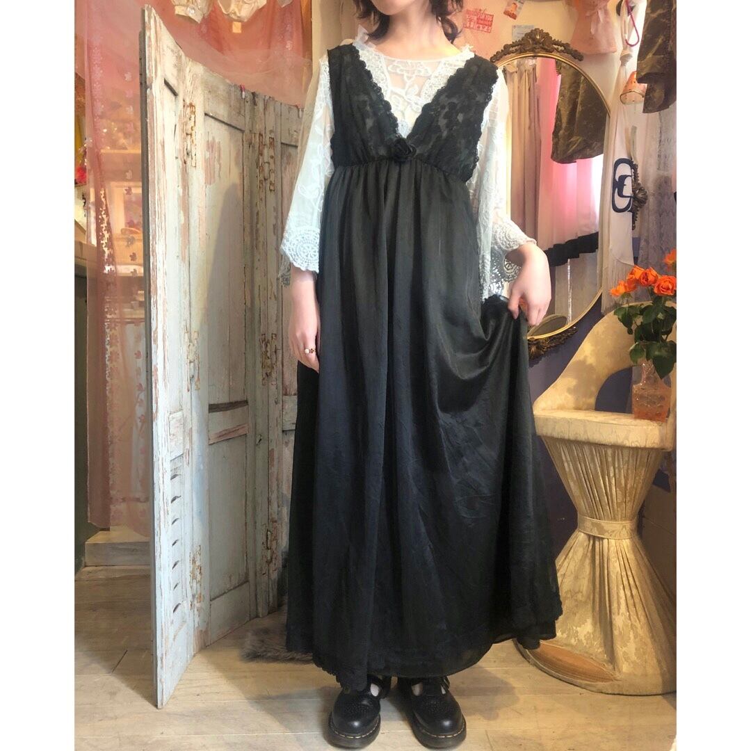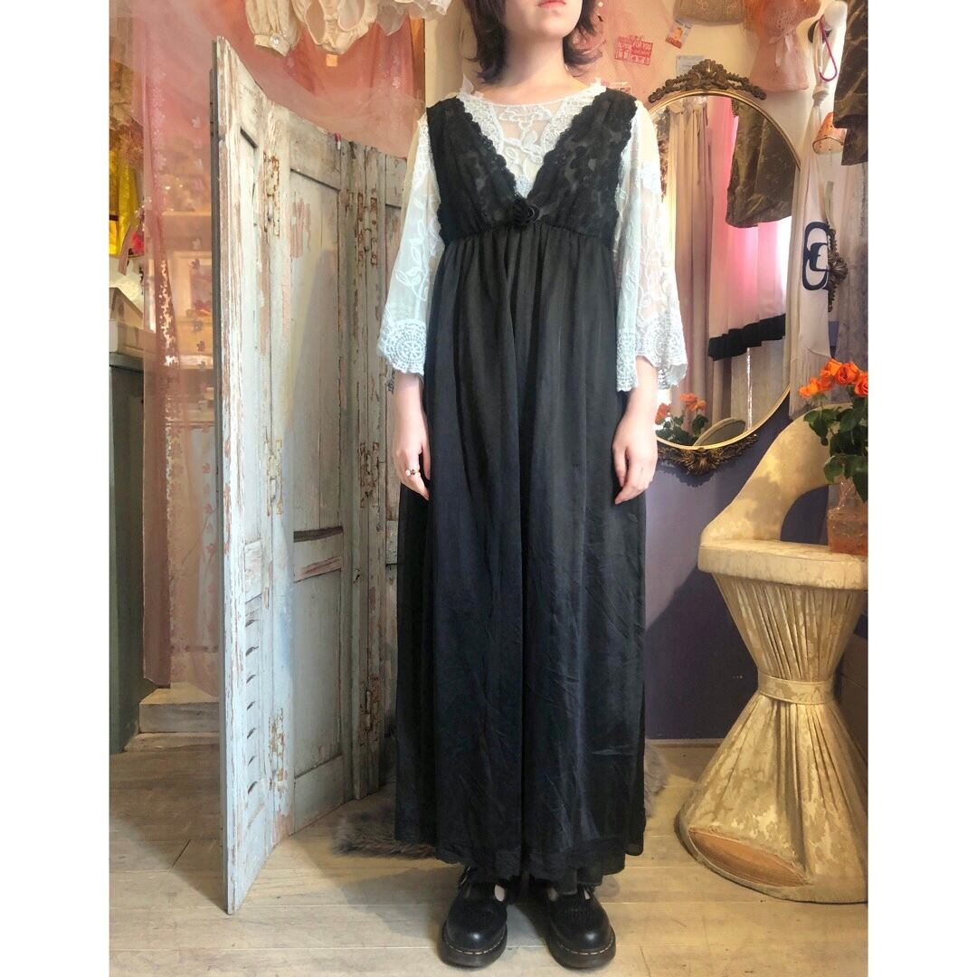 胸、肩のストラップ部分の前面がレースでスカート部分は裏地付きのシアースカートになっています。黒ですが透け感があるので重くならず、風に揺れるさまは軽やかです。