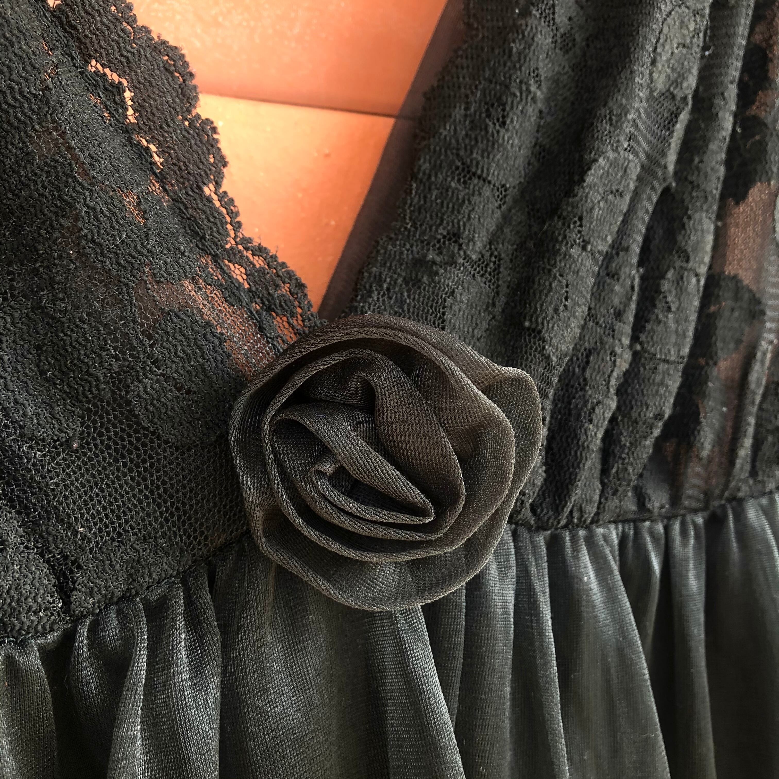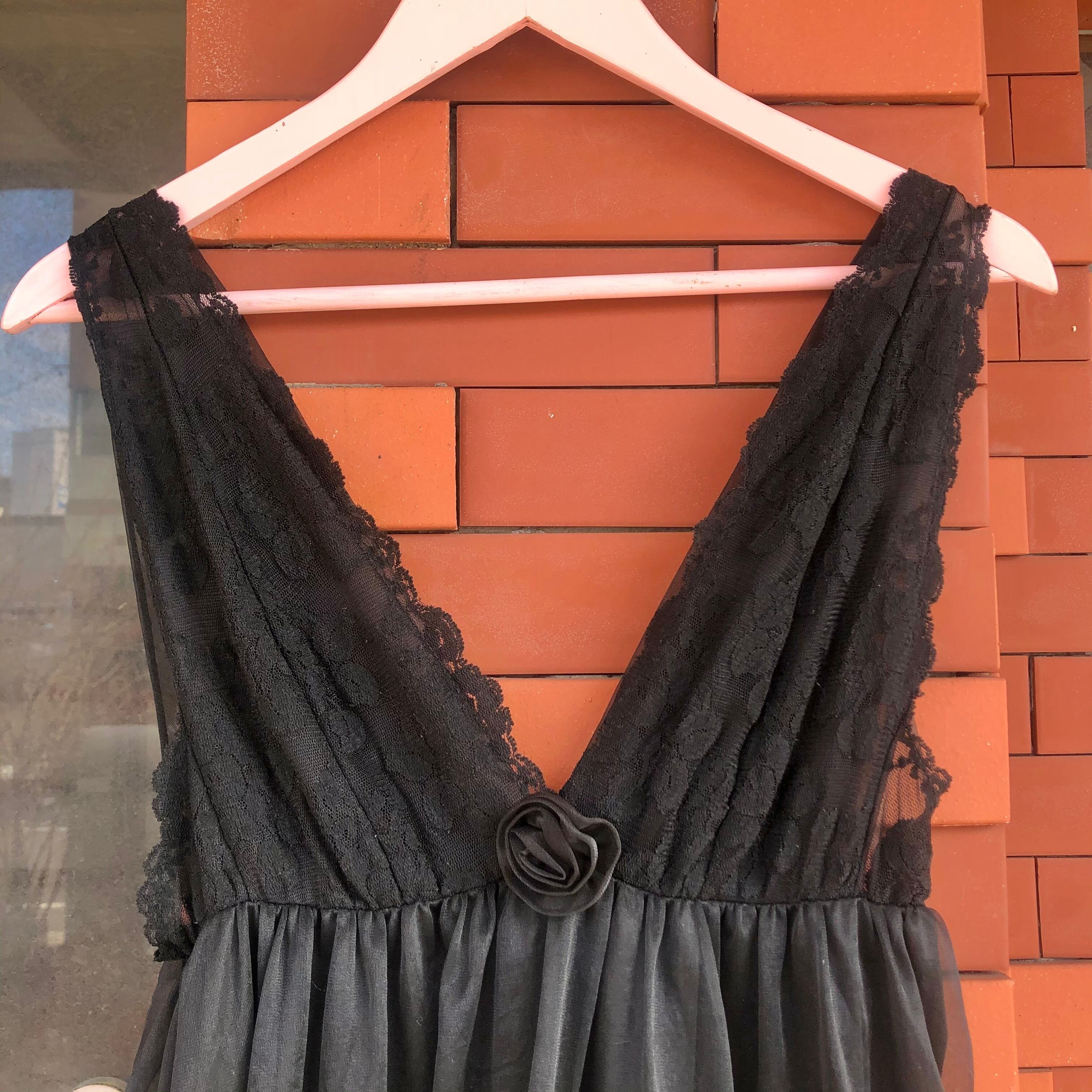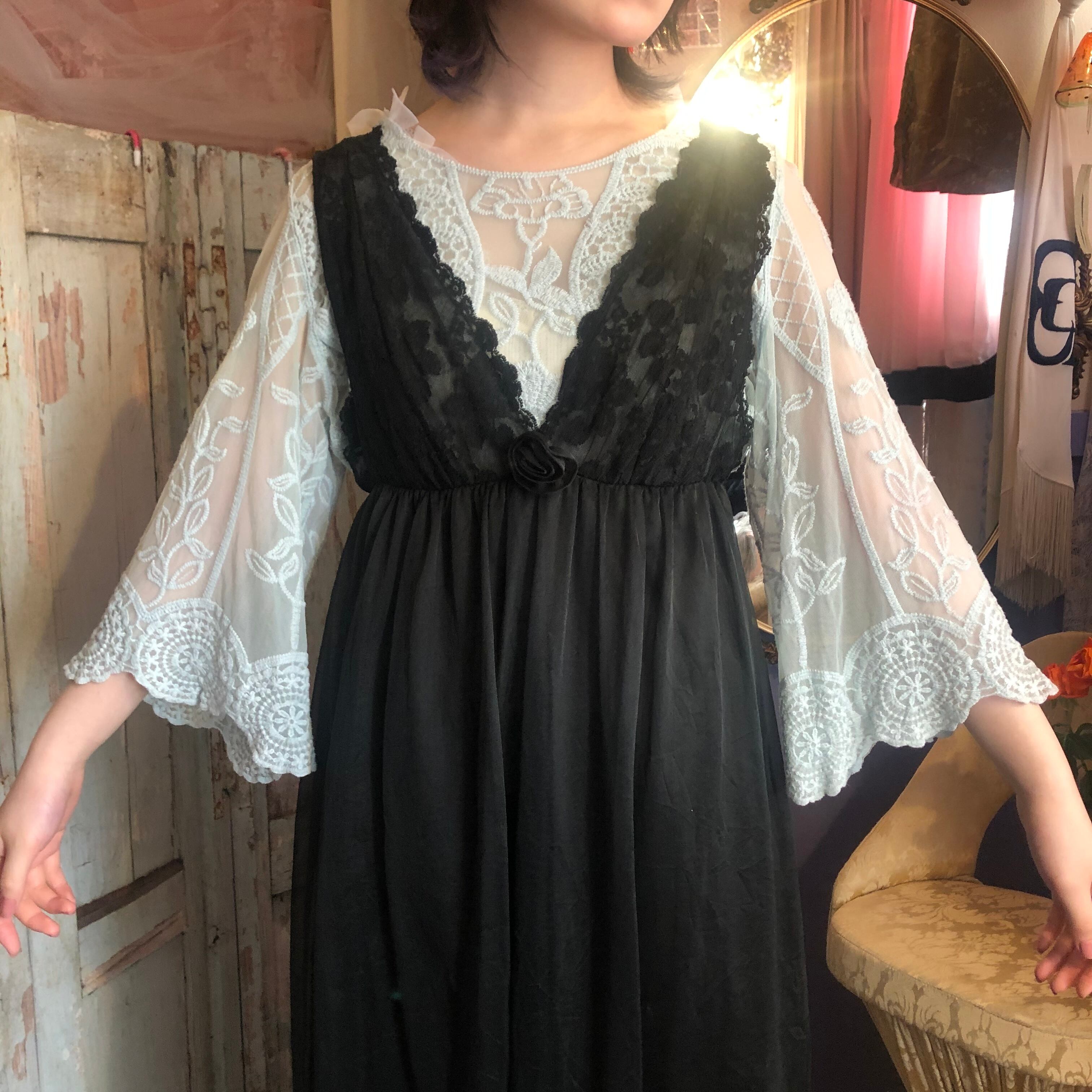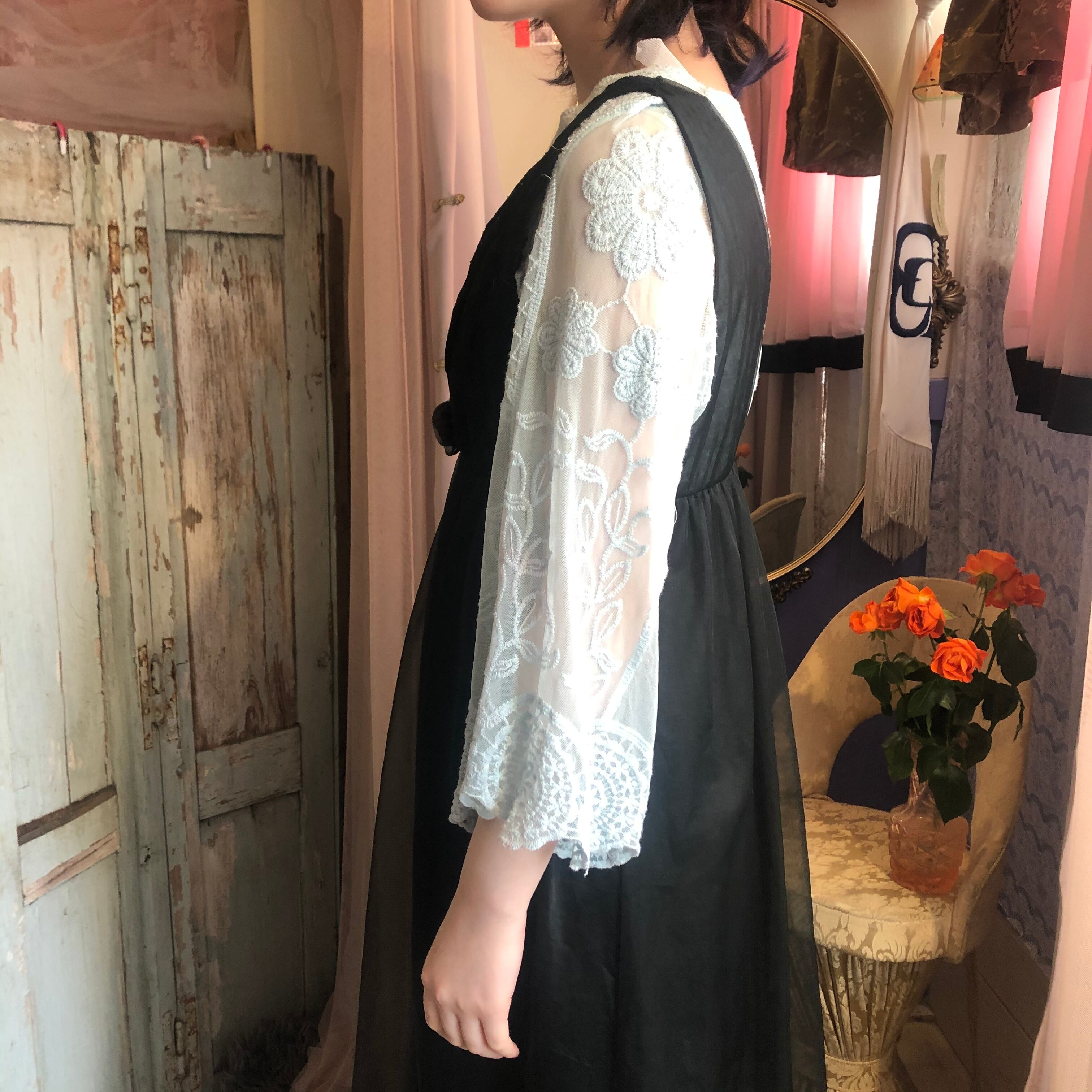 胸、肩のストラップ部分の前面がレースでスカート部分は裏地付きのシアースカートになっています。黒ですが透け感があるので重くならず、風に揺れるさまは軽やかです。