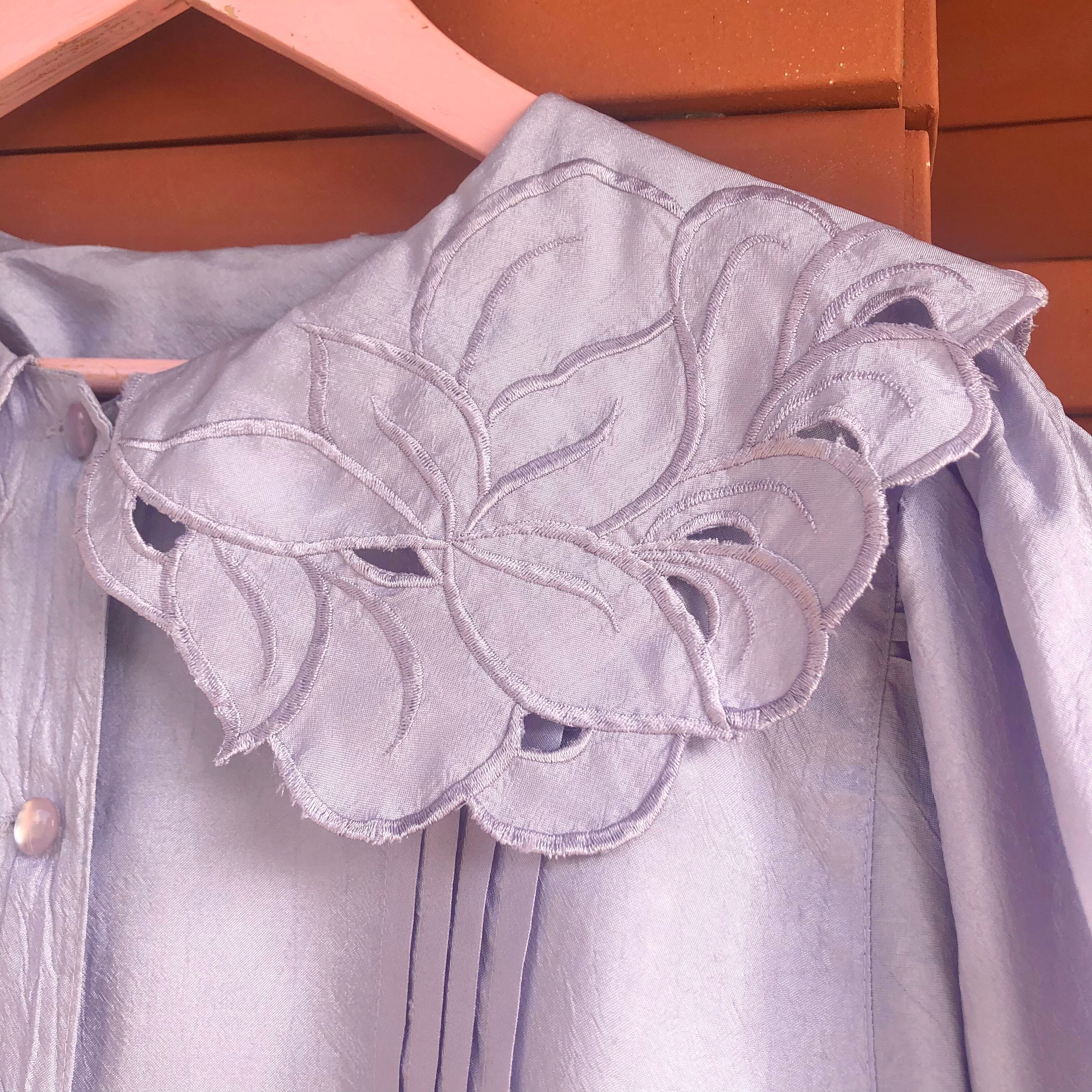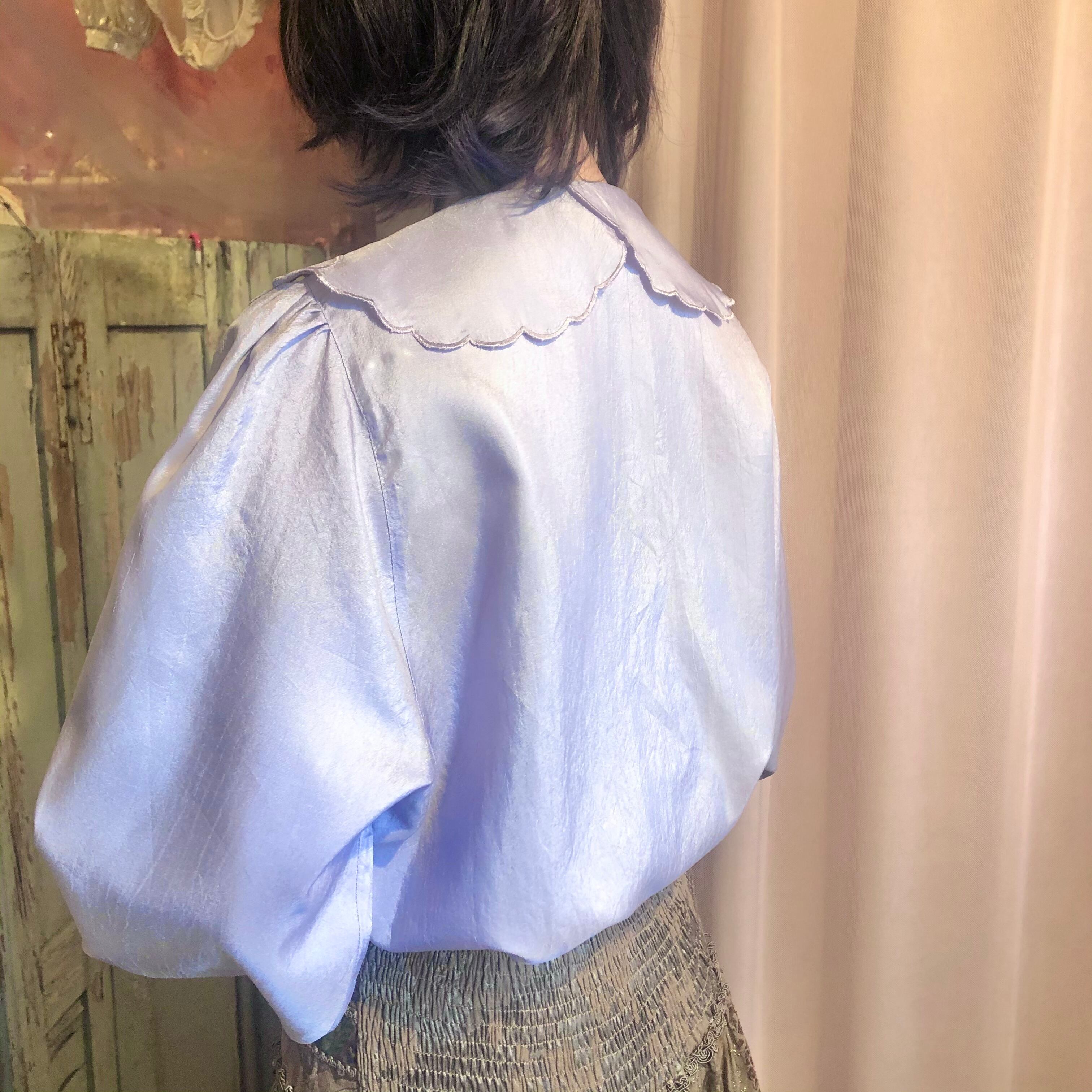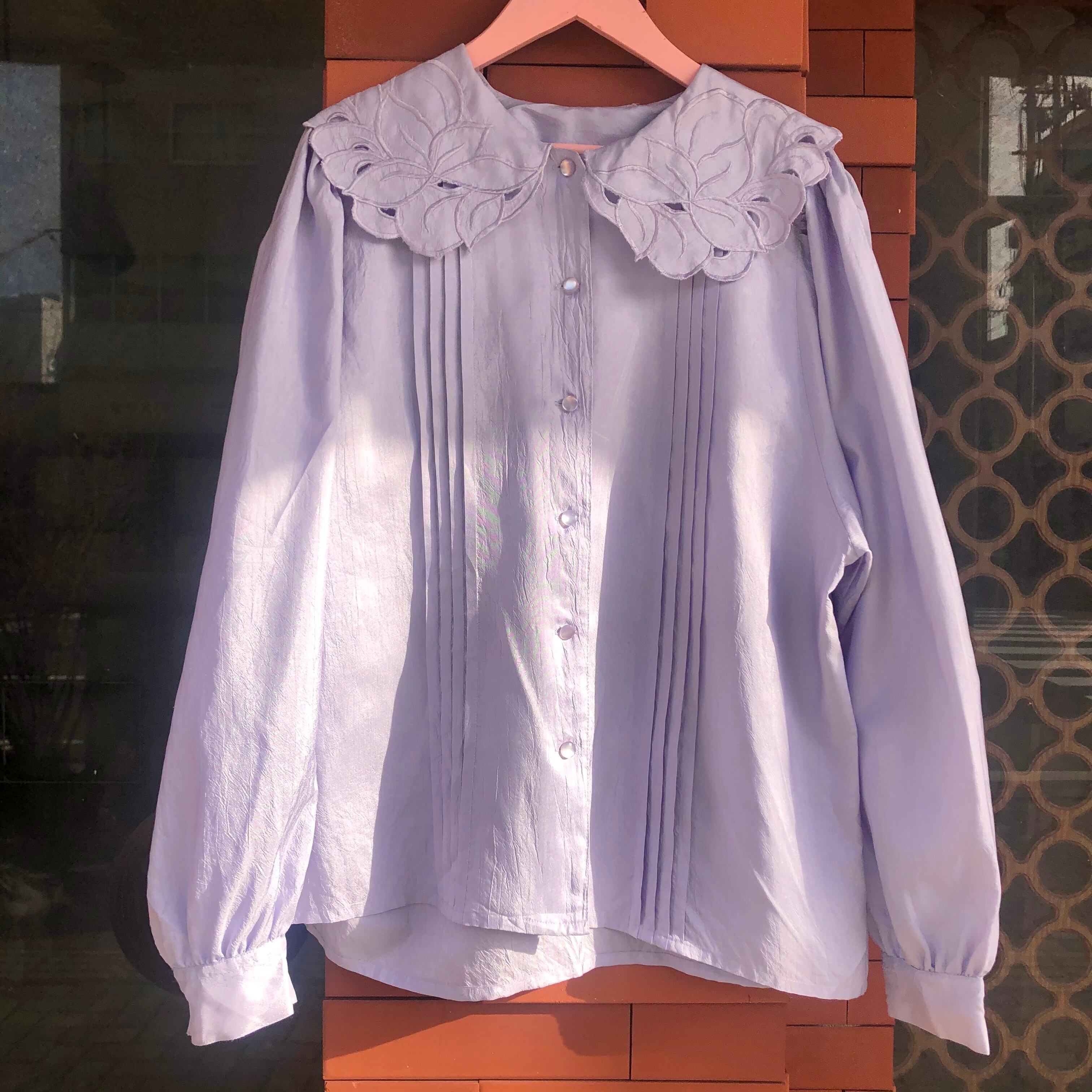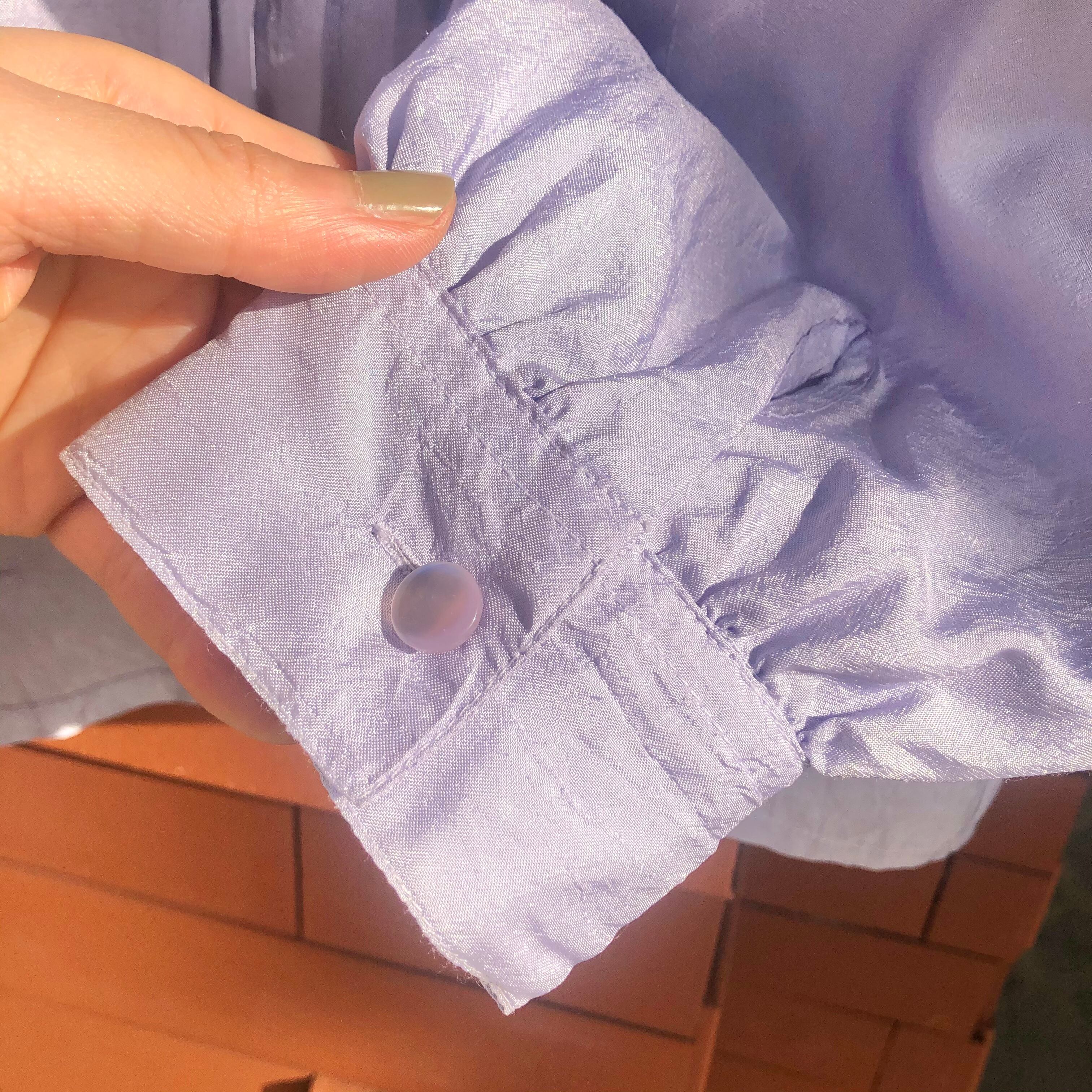程よい光沢としゃりっとした質感です。光るボタンもラベンダー。