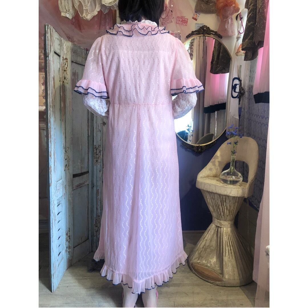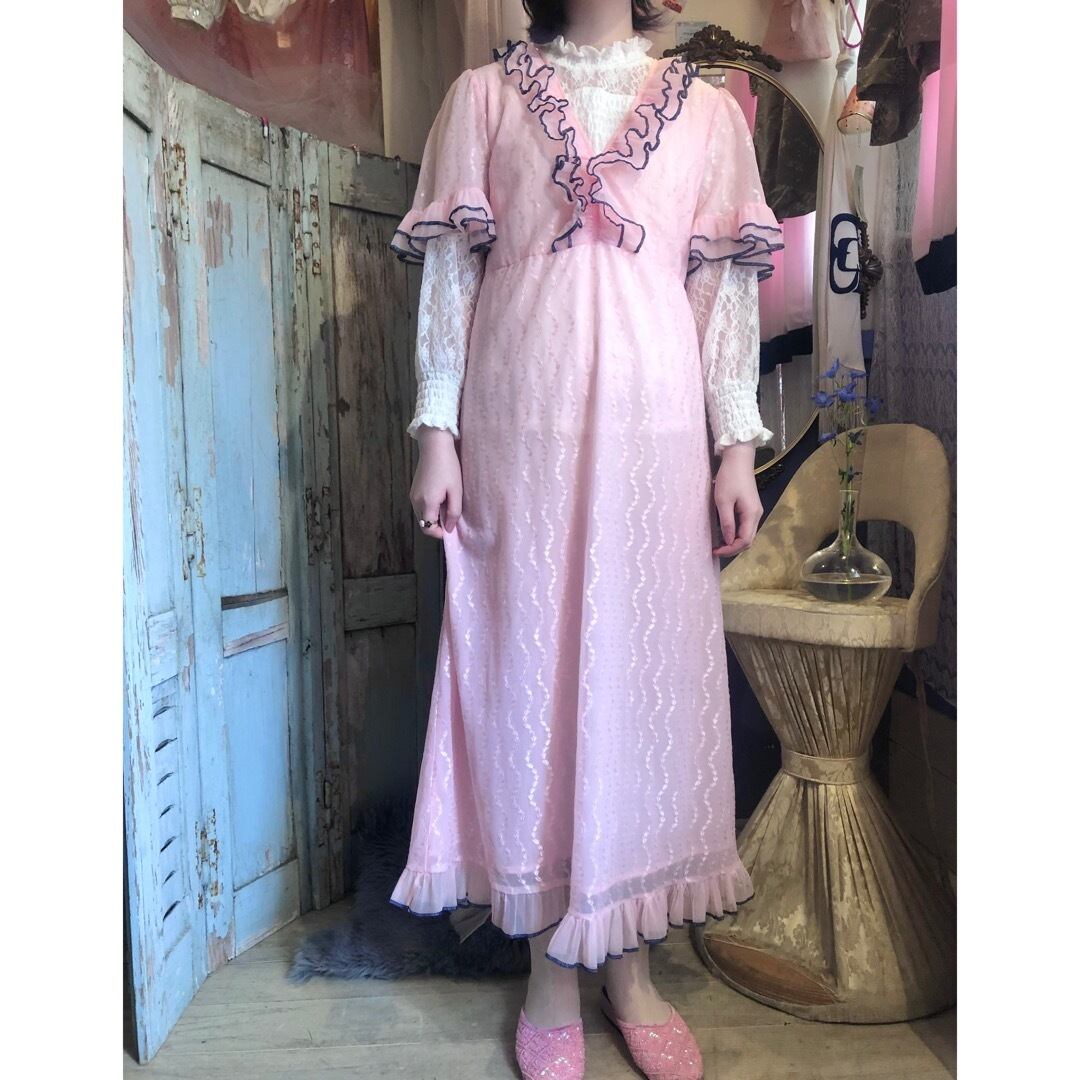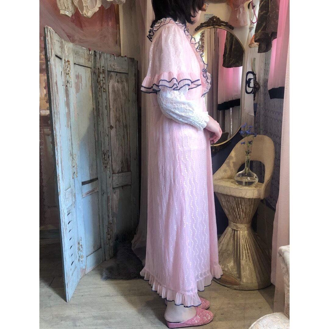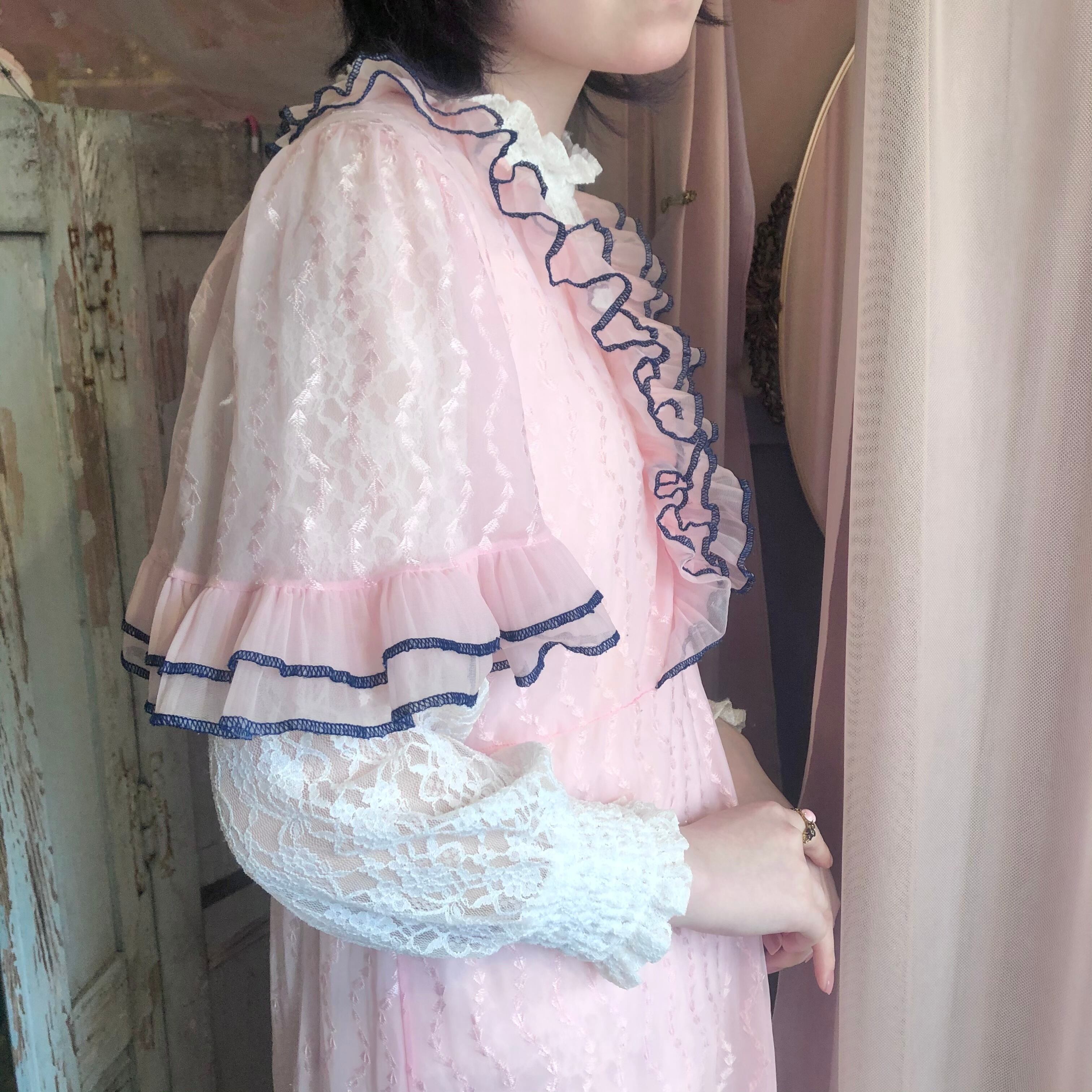 淡い桜ピンクにネイビーの縁取りのコントラストが目を惹くランジェリーワンピースです。