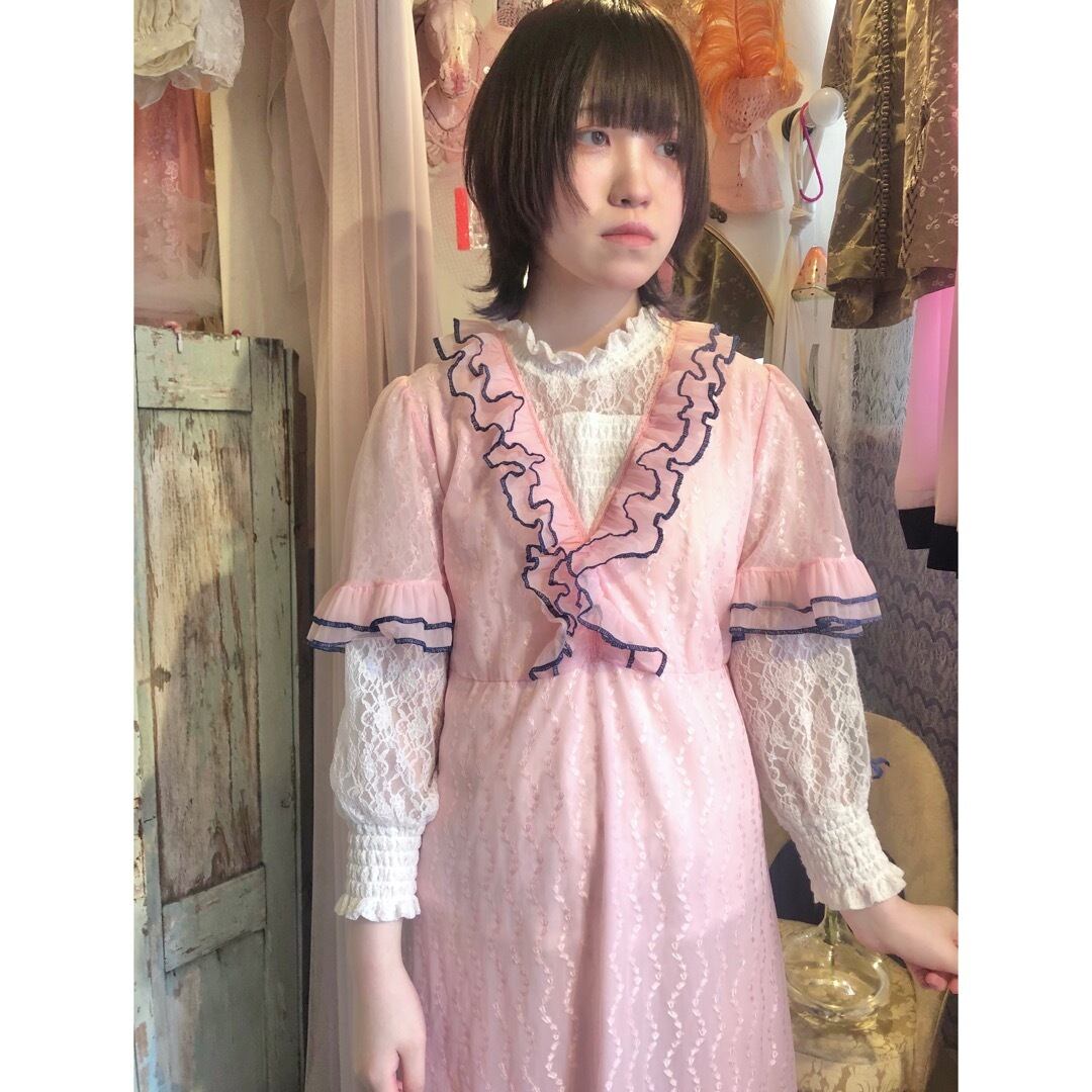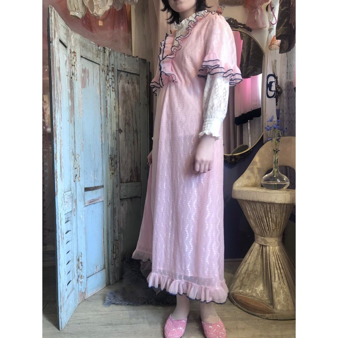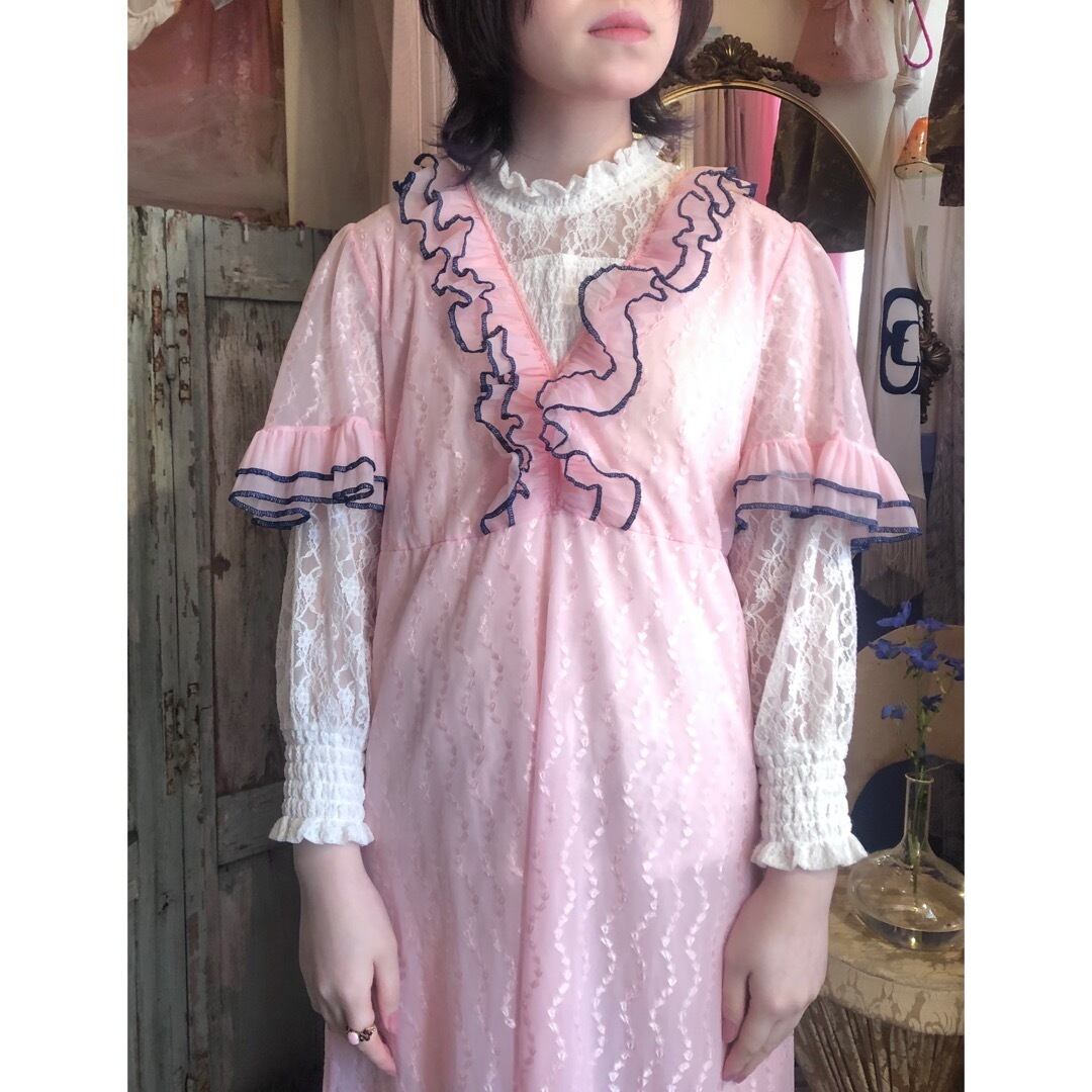 淡い桜ピンクにネイビーの縁取りのコントラストが目を惹くランジェリーワンピースです。