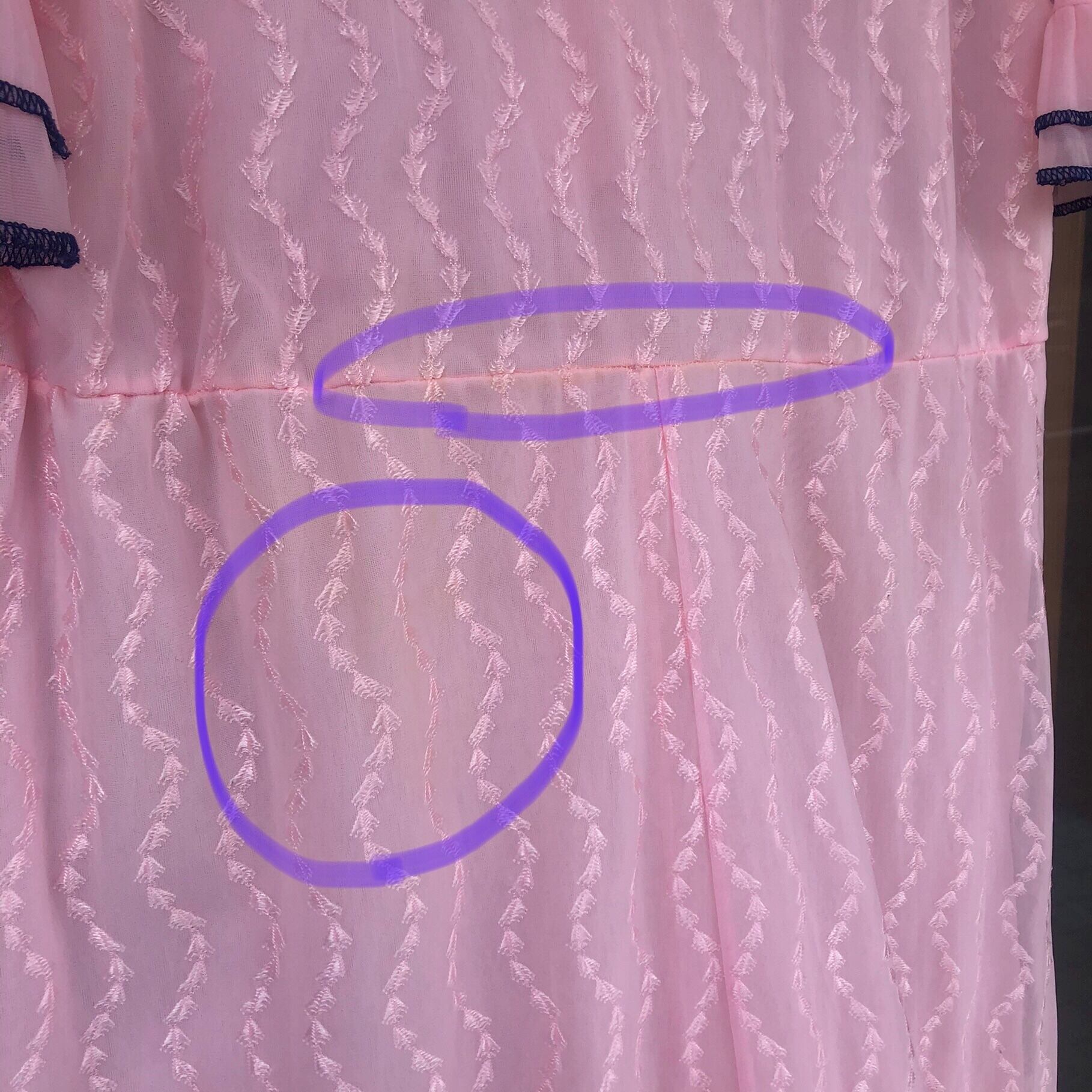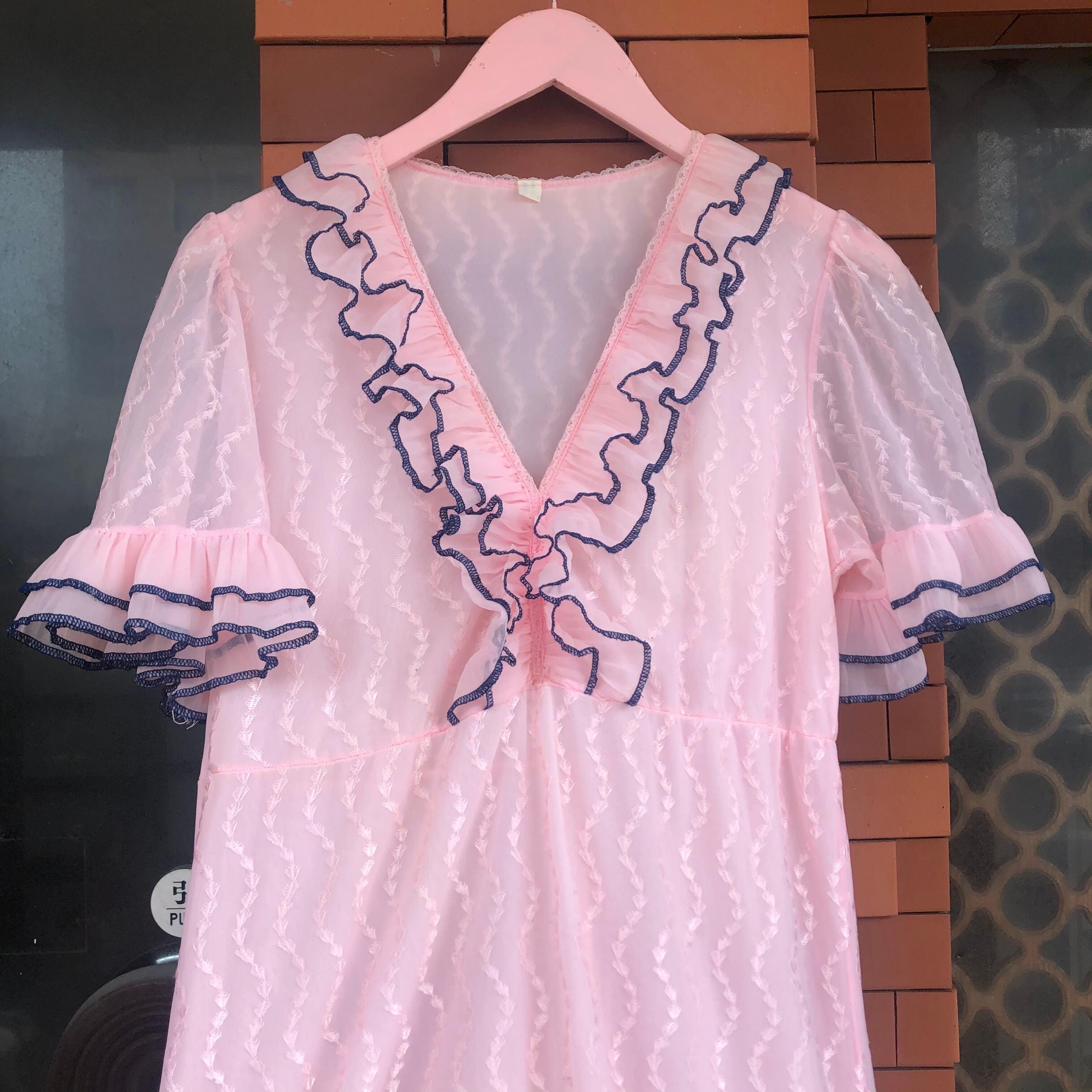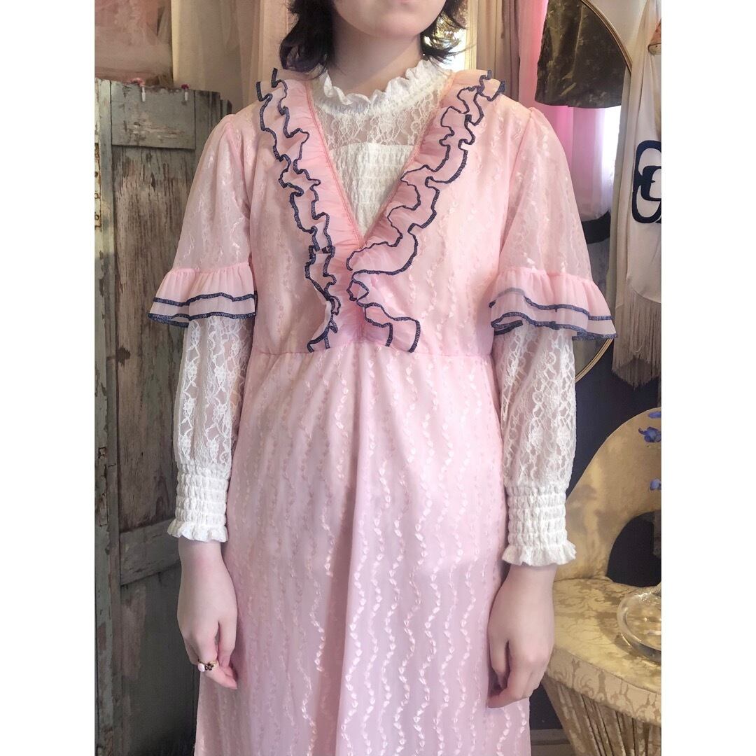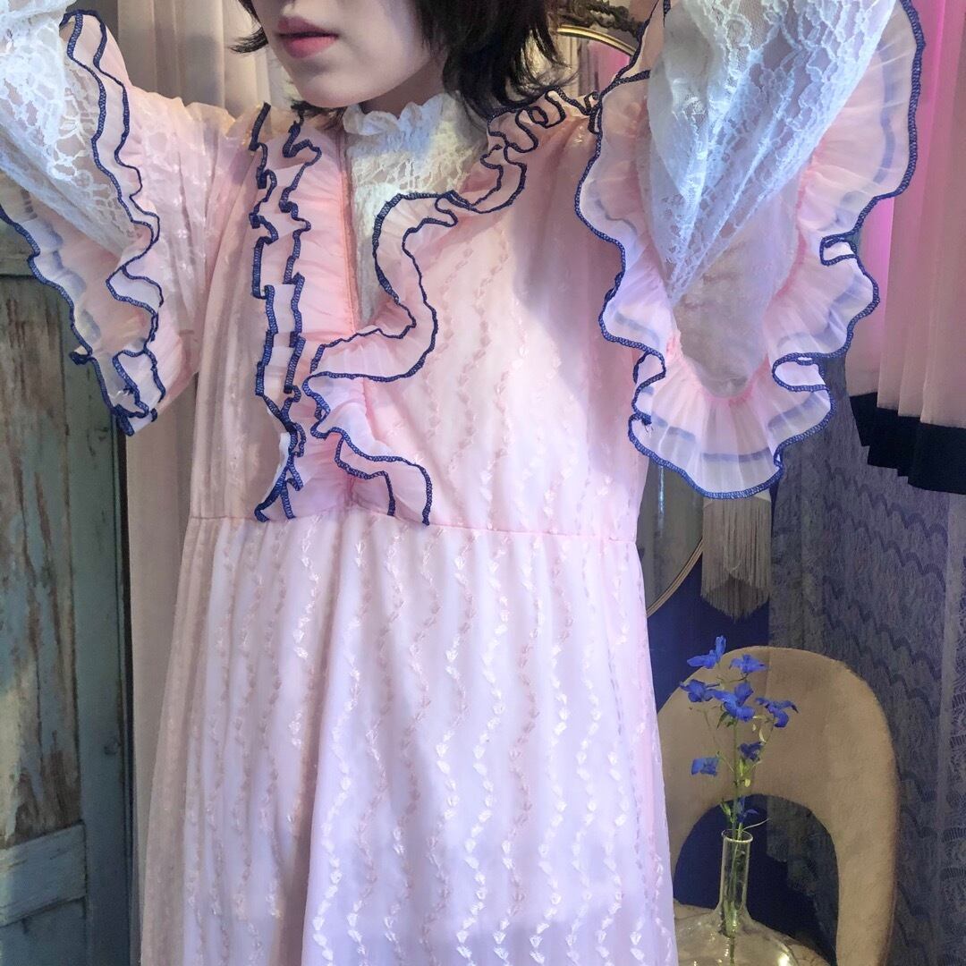 淡い桜ピンクにネイビーの縁取りのコントラストが目を惹くランジェリーワンピースです。