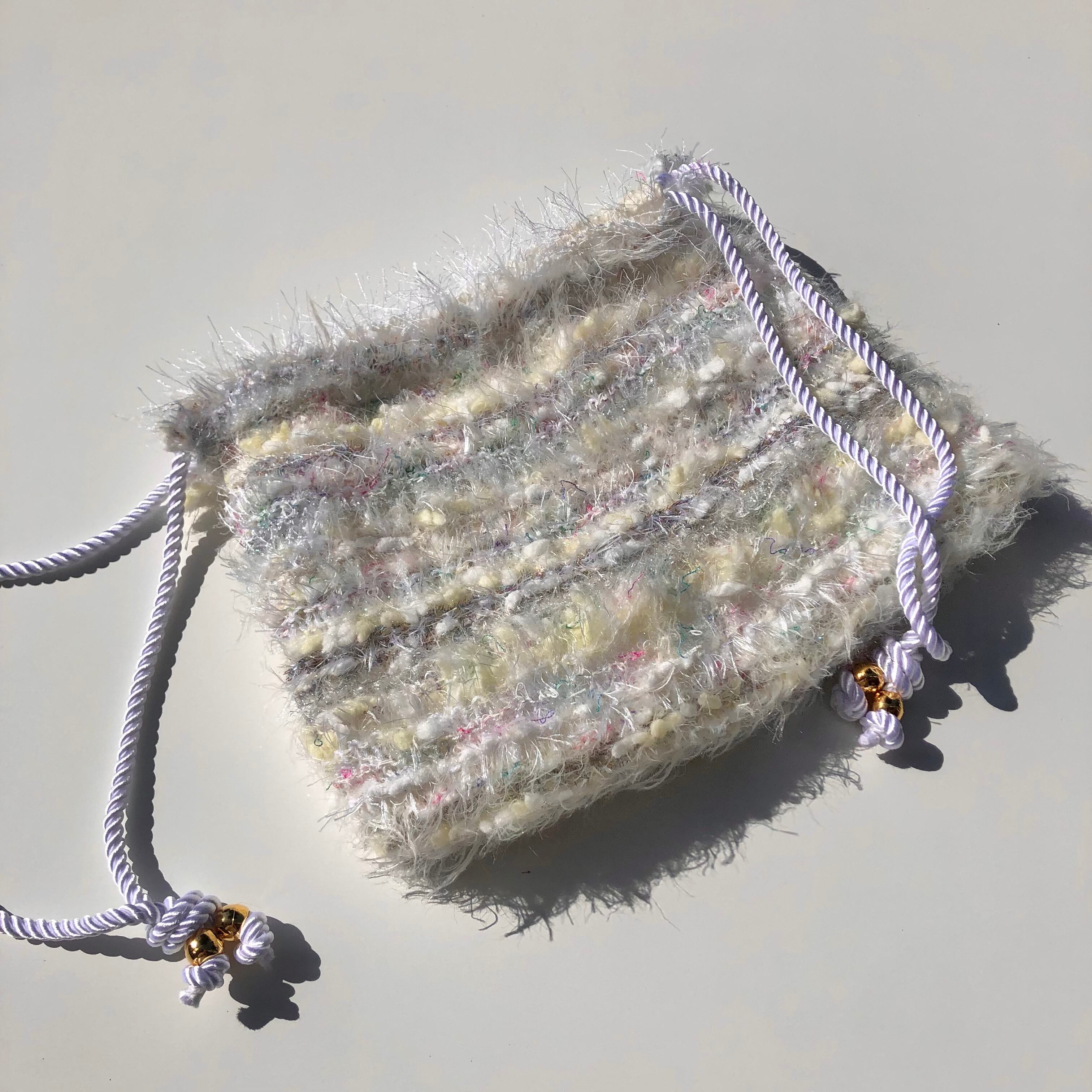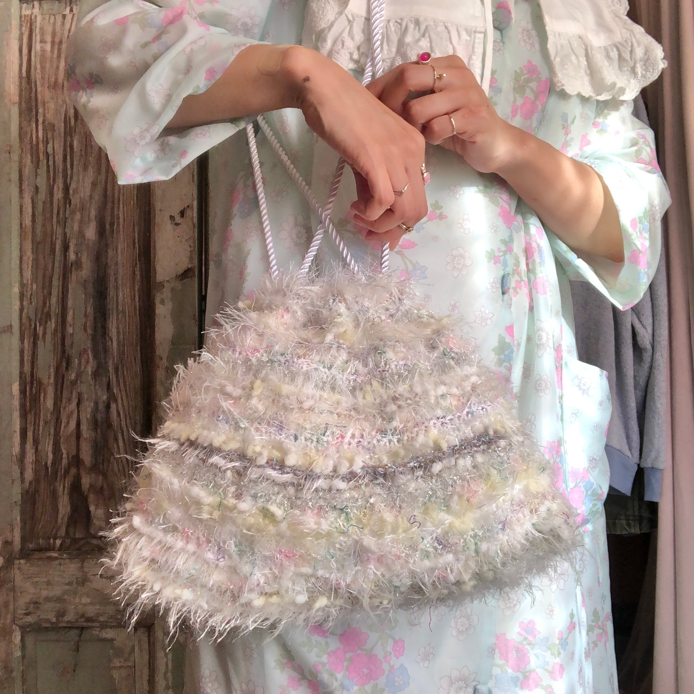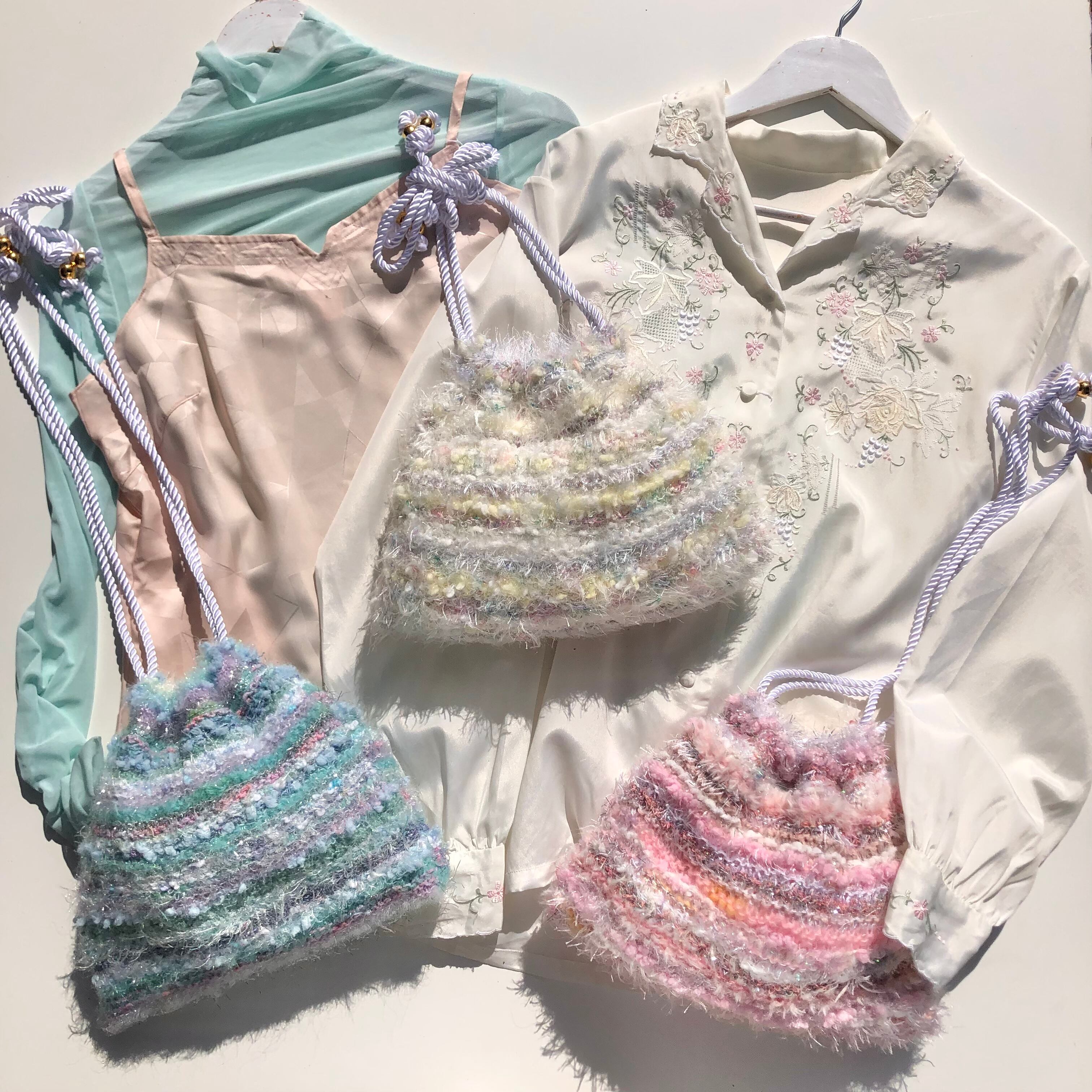 海外で仕入れた糸を使い、店主が1点ずつ編んだshe so定番のハンドニットバッグです。