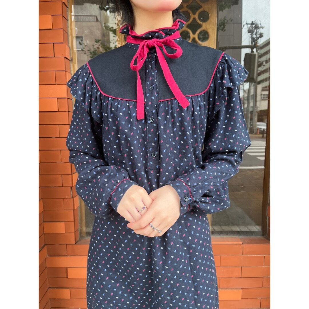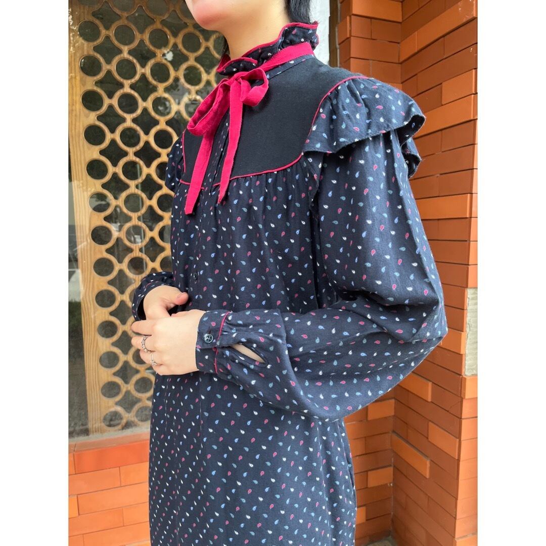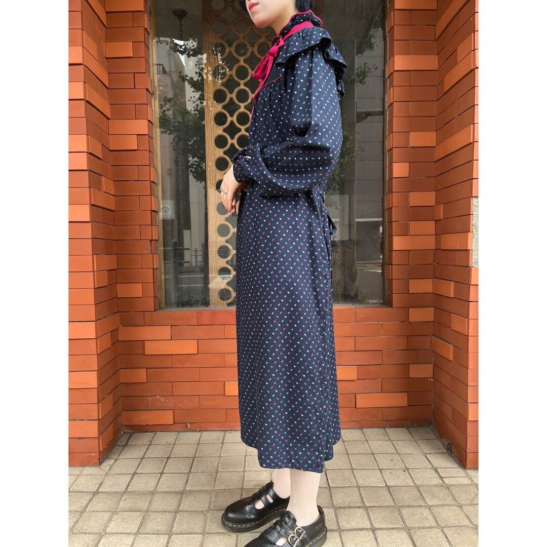 ネイビーのペイズリー柄ワンピース.