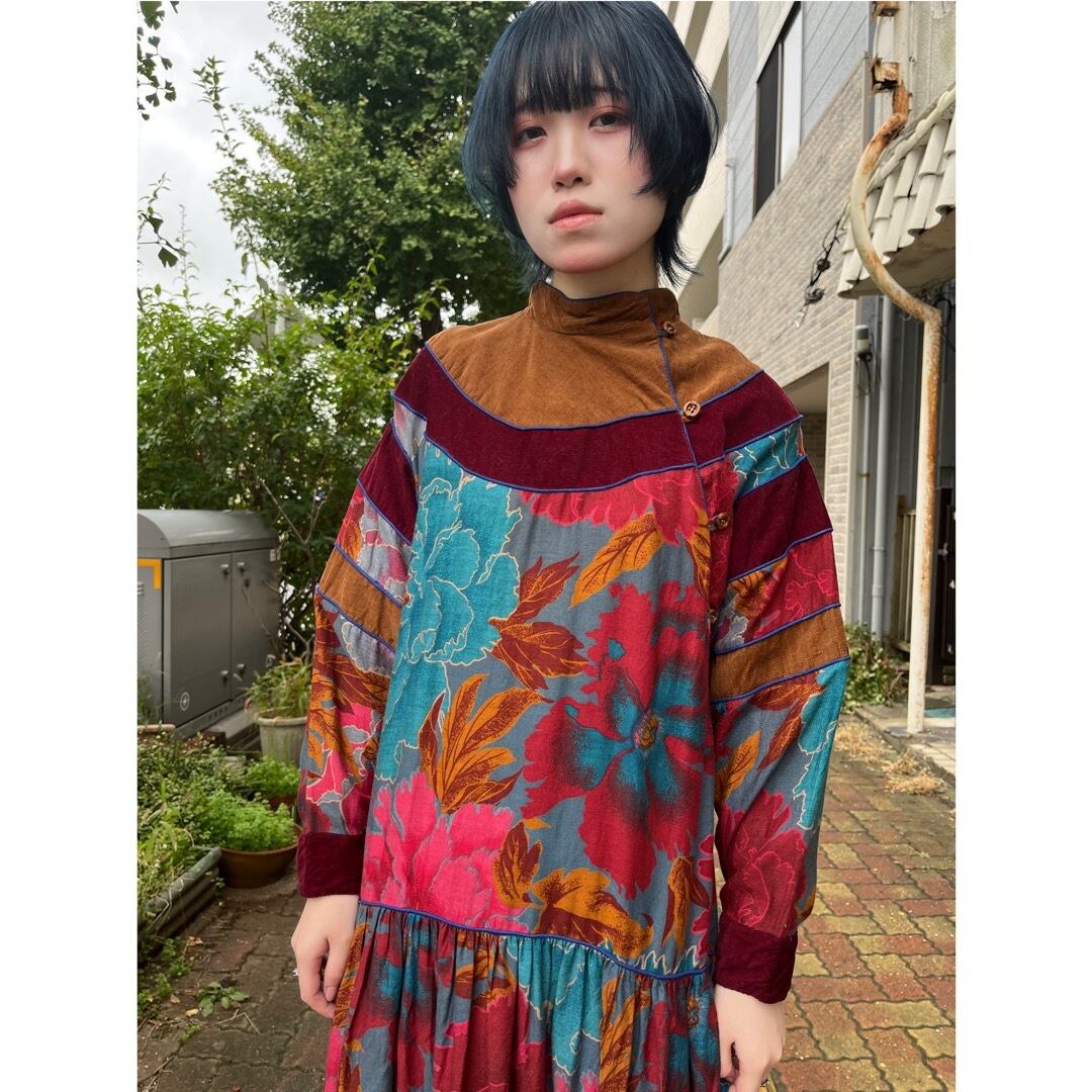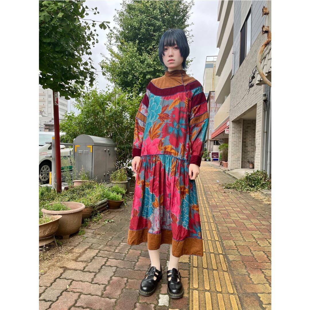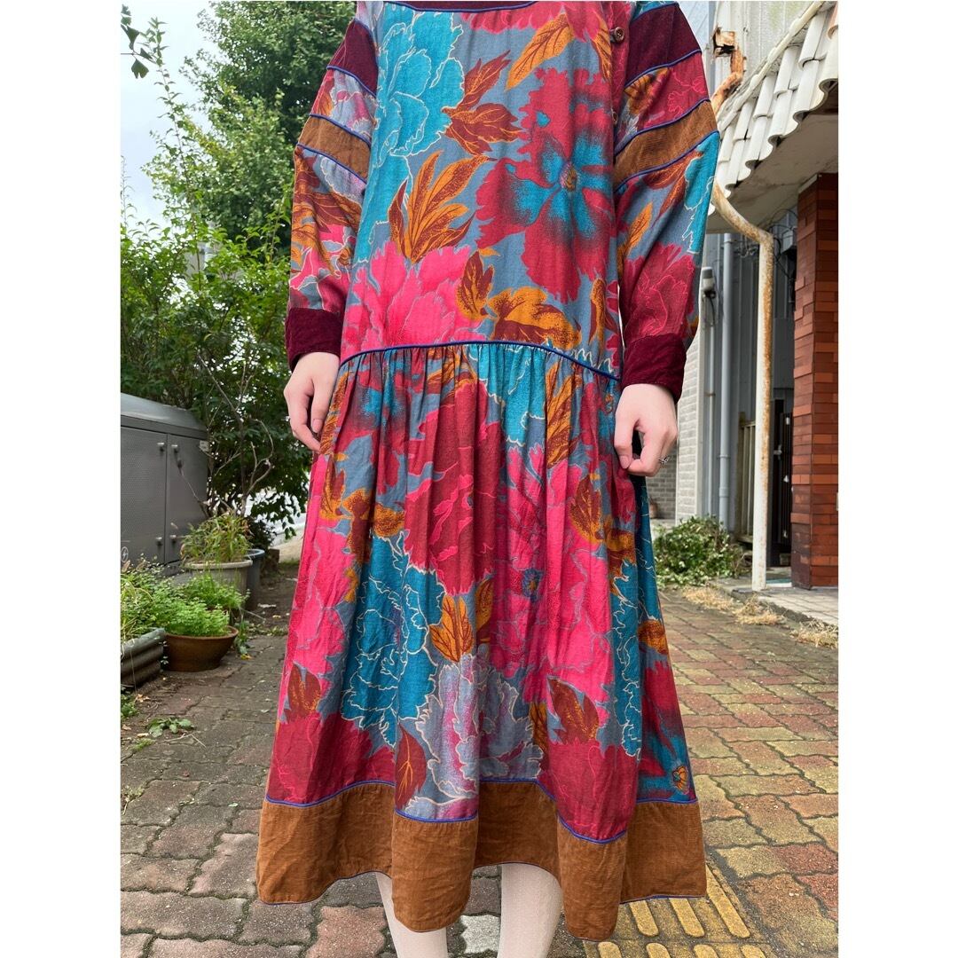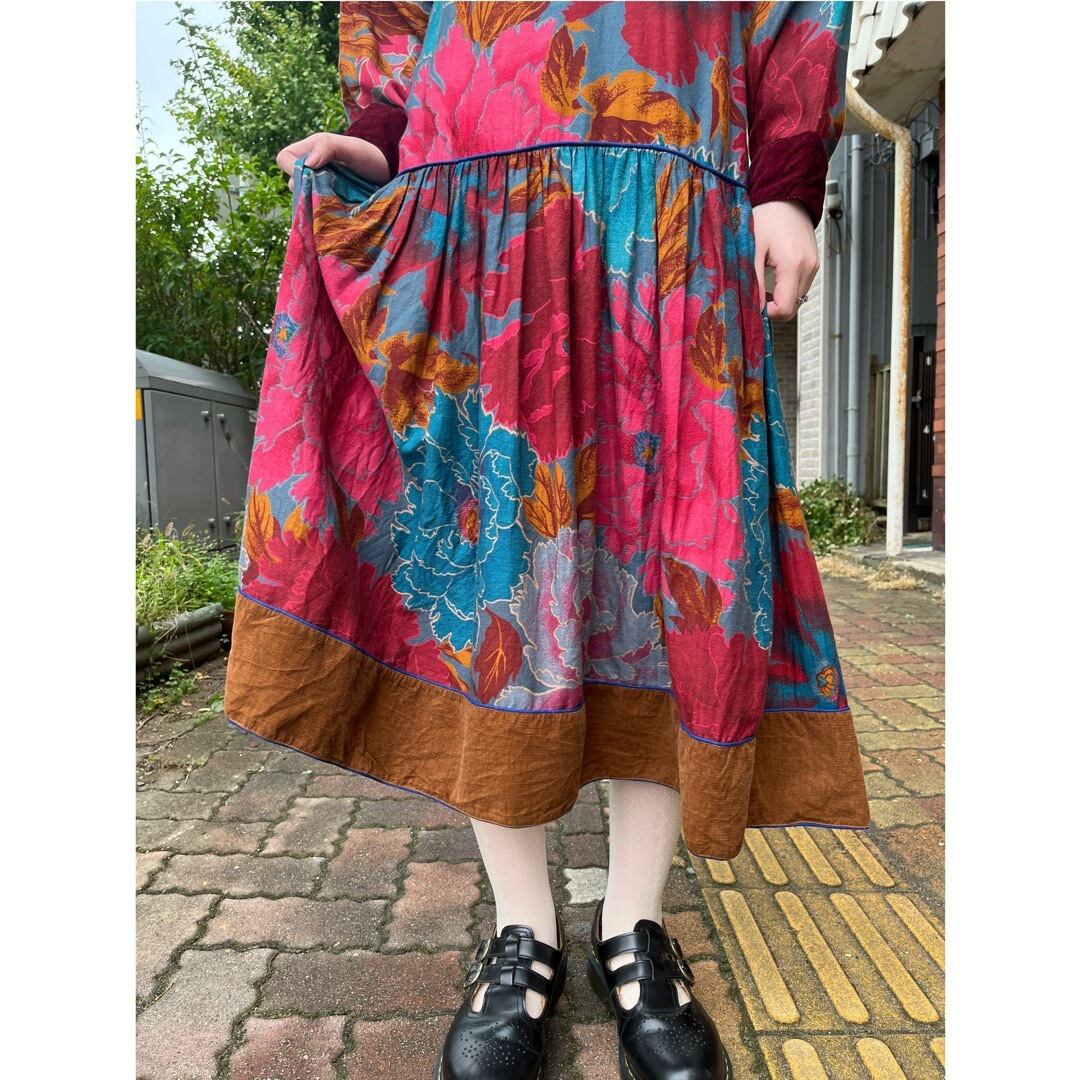 大花柄の、おそらく椿のお花が咲いたワンピース。一枚で存在感を放ちます。