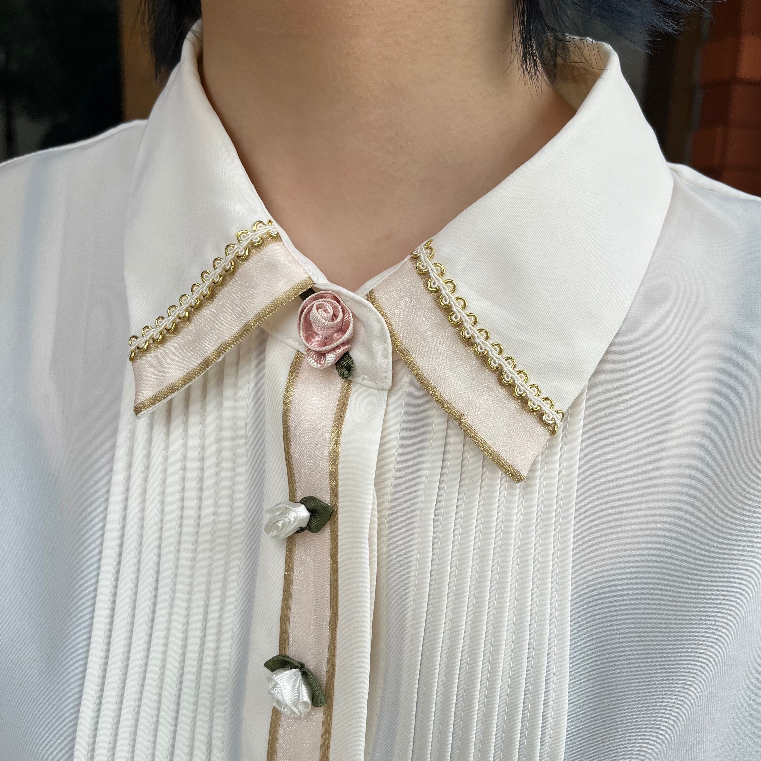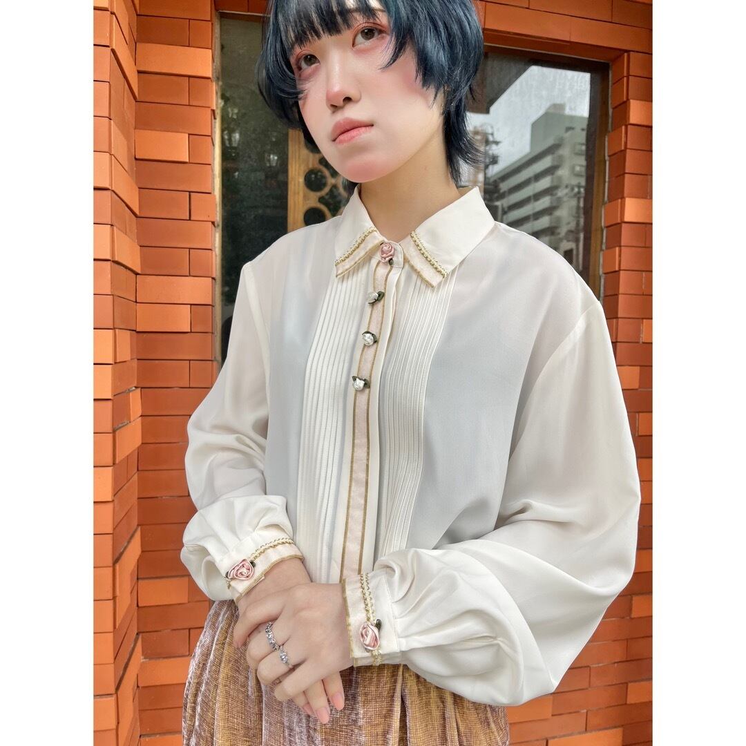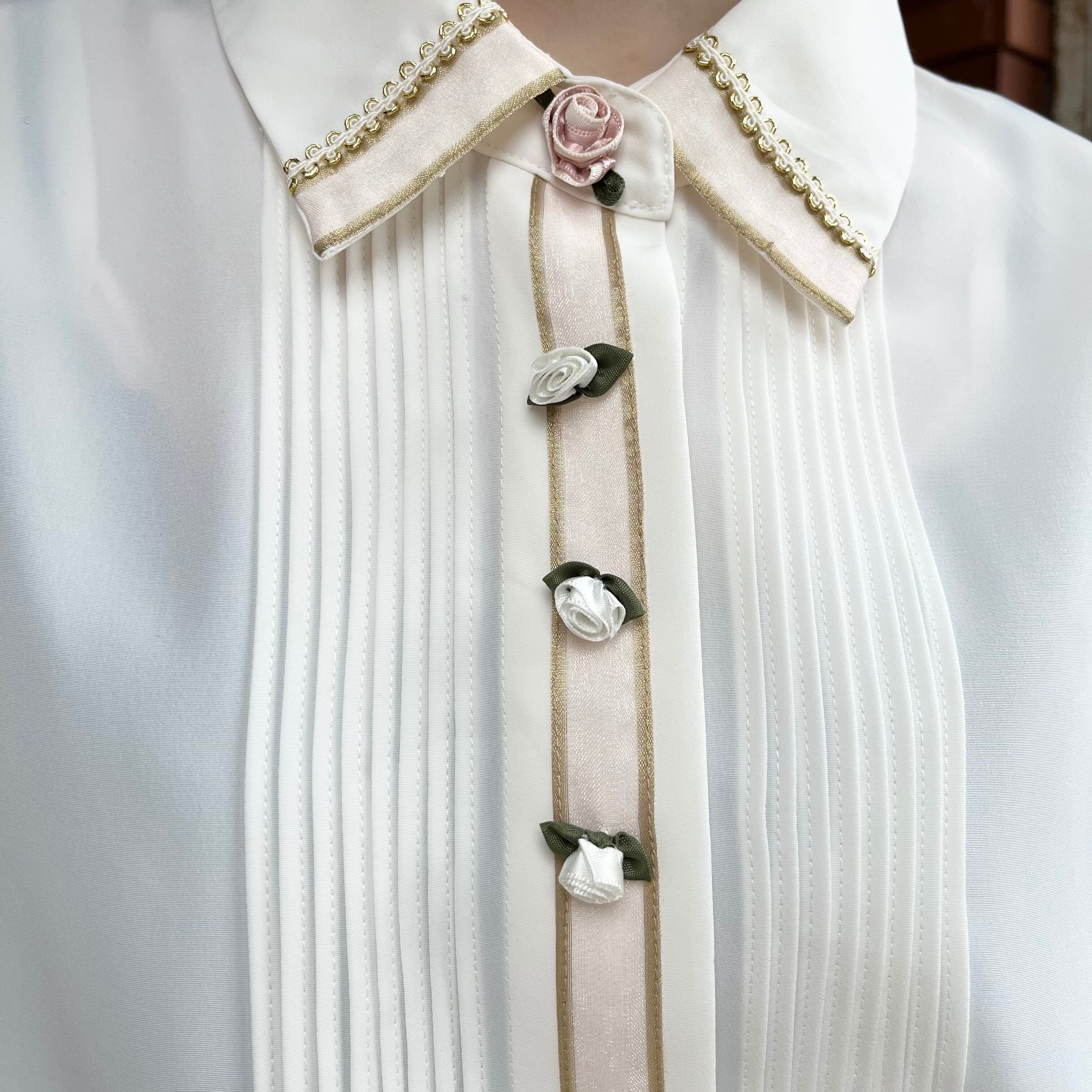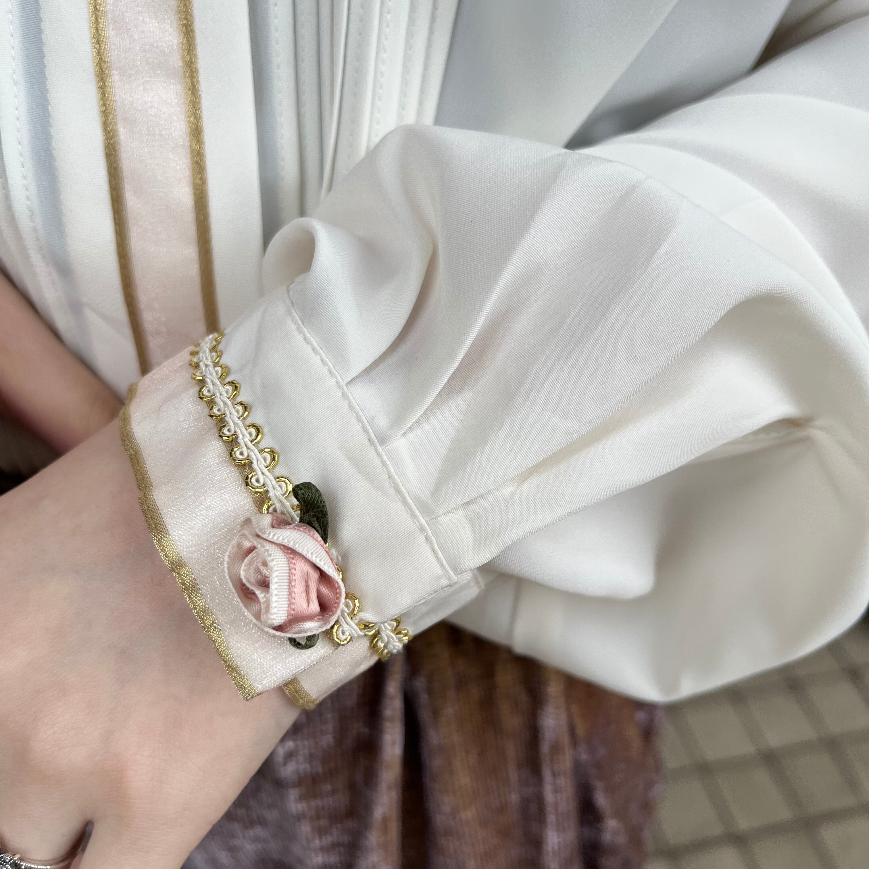 プレゼントのラッピングについていたら嬉しいあのバラのリボンがボタンになったブラウスです。