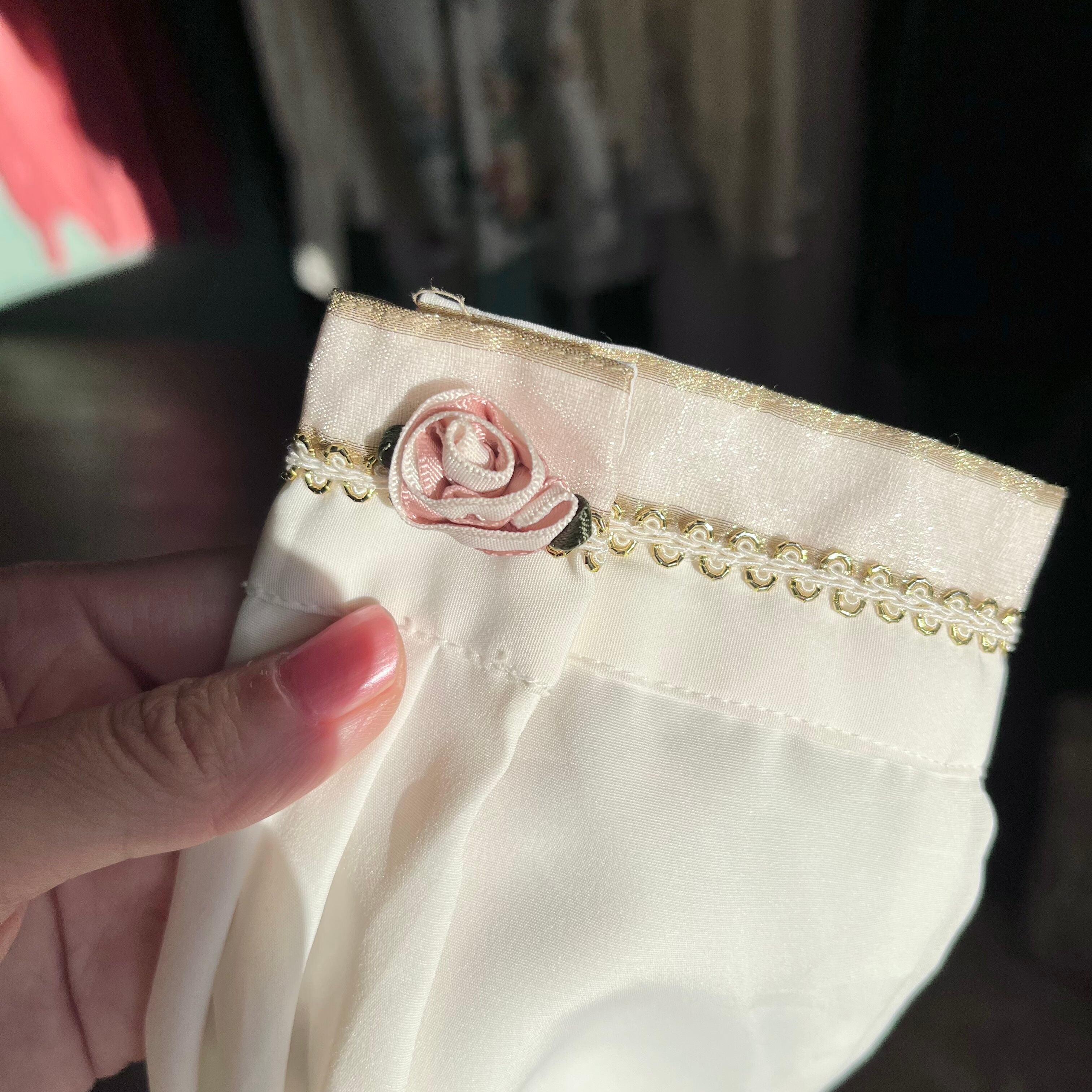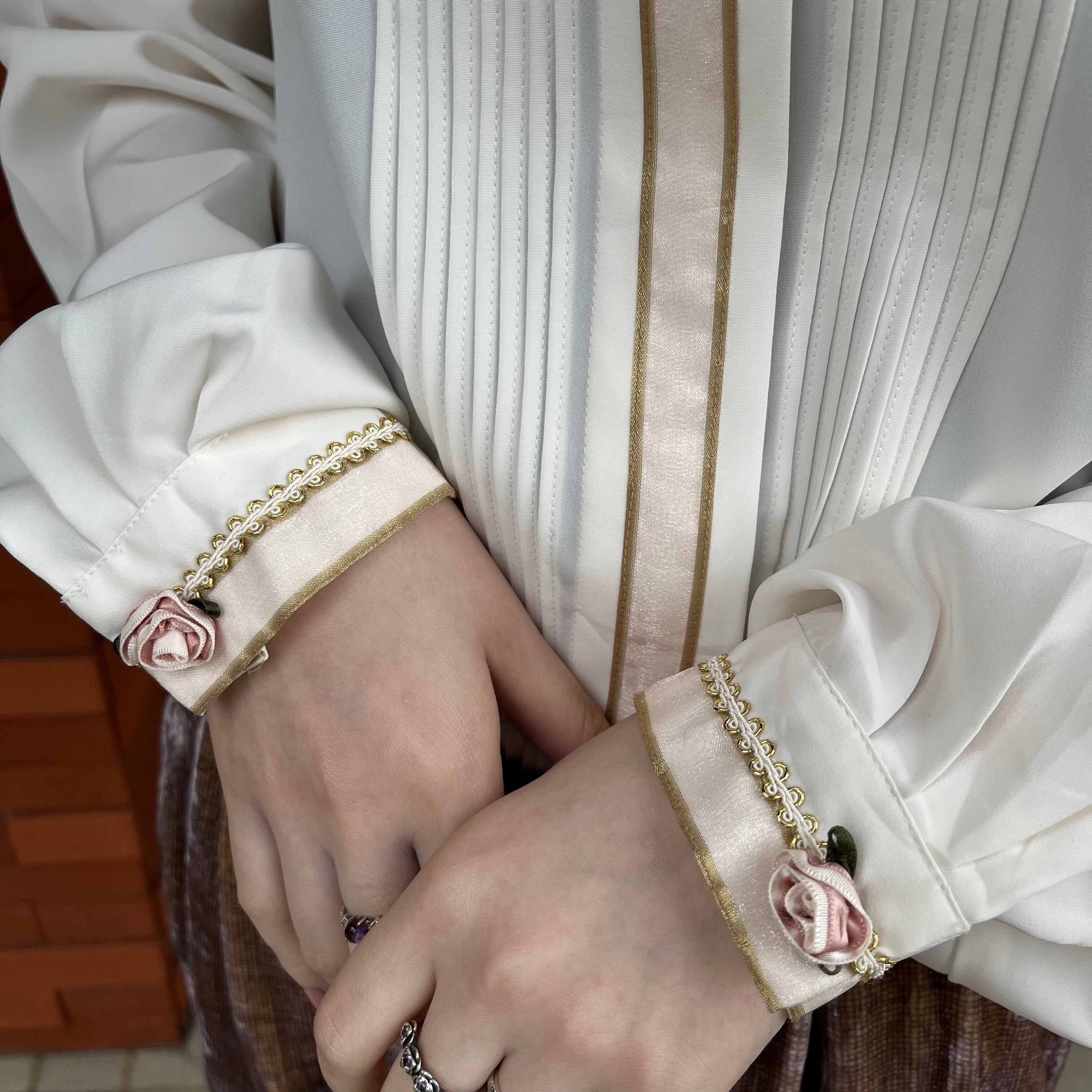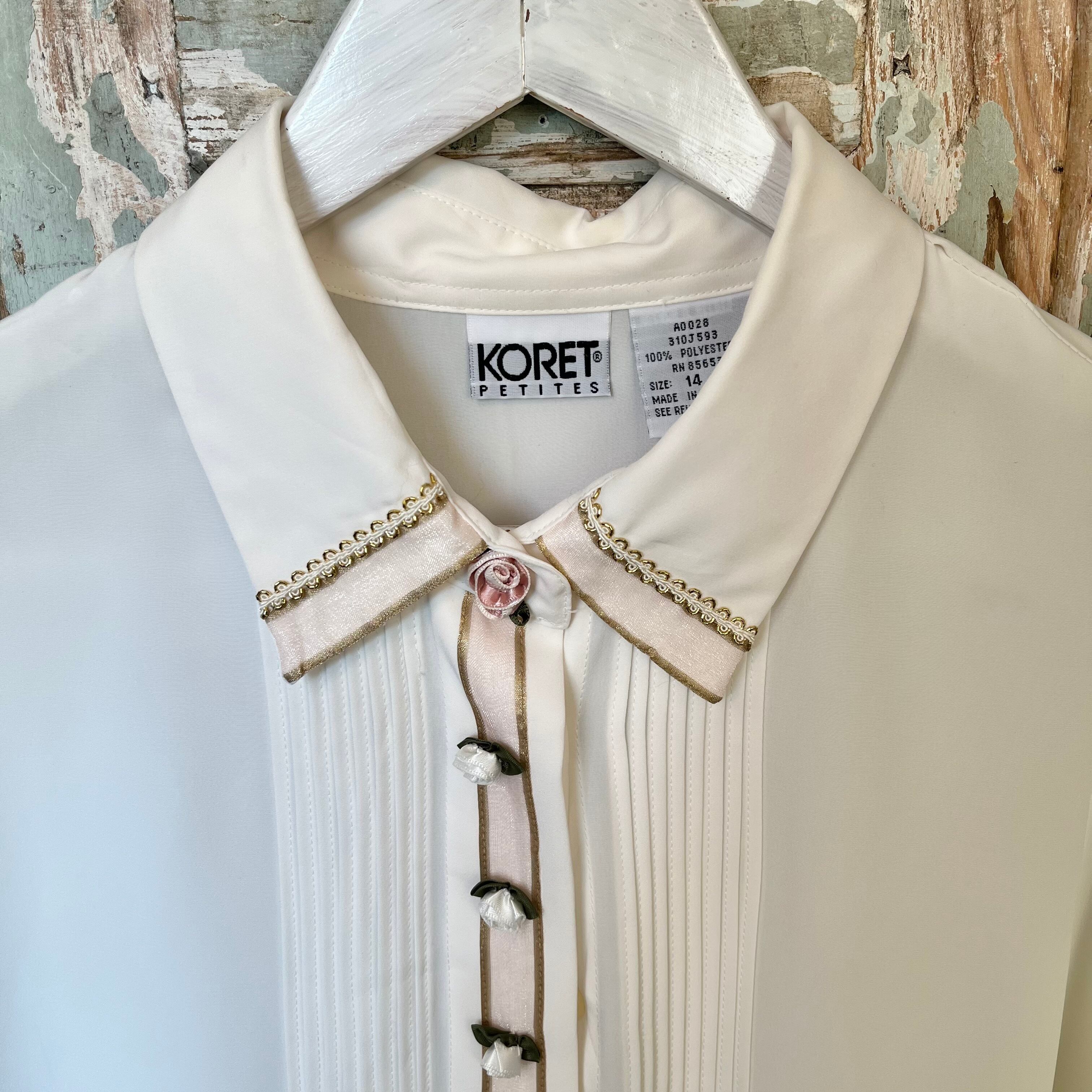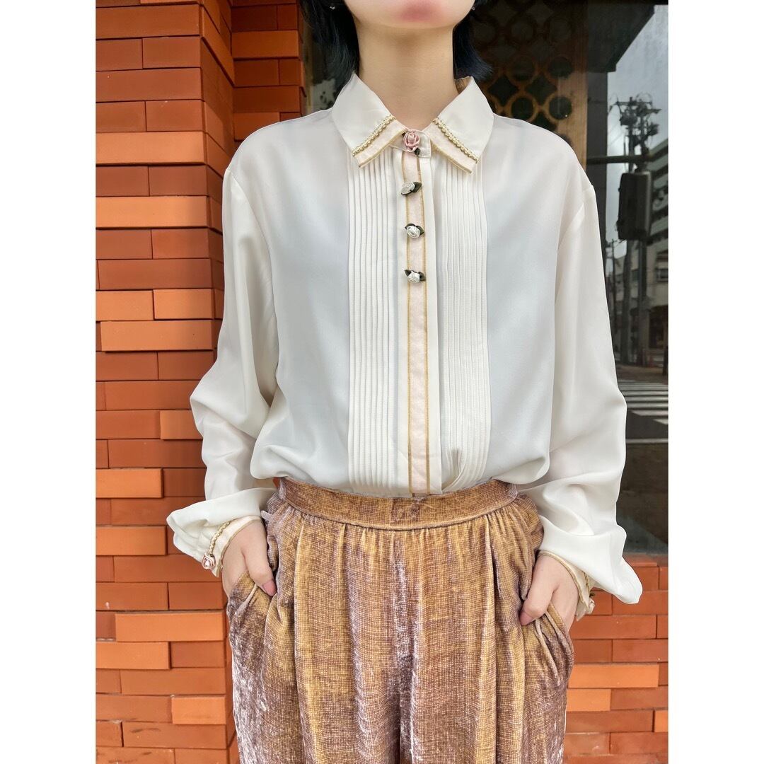 プレゼントのラッピングについていたら嬉しいあのバラのリボンがボタンになったブラウスです。