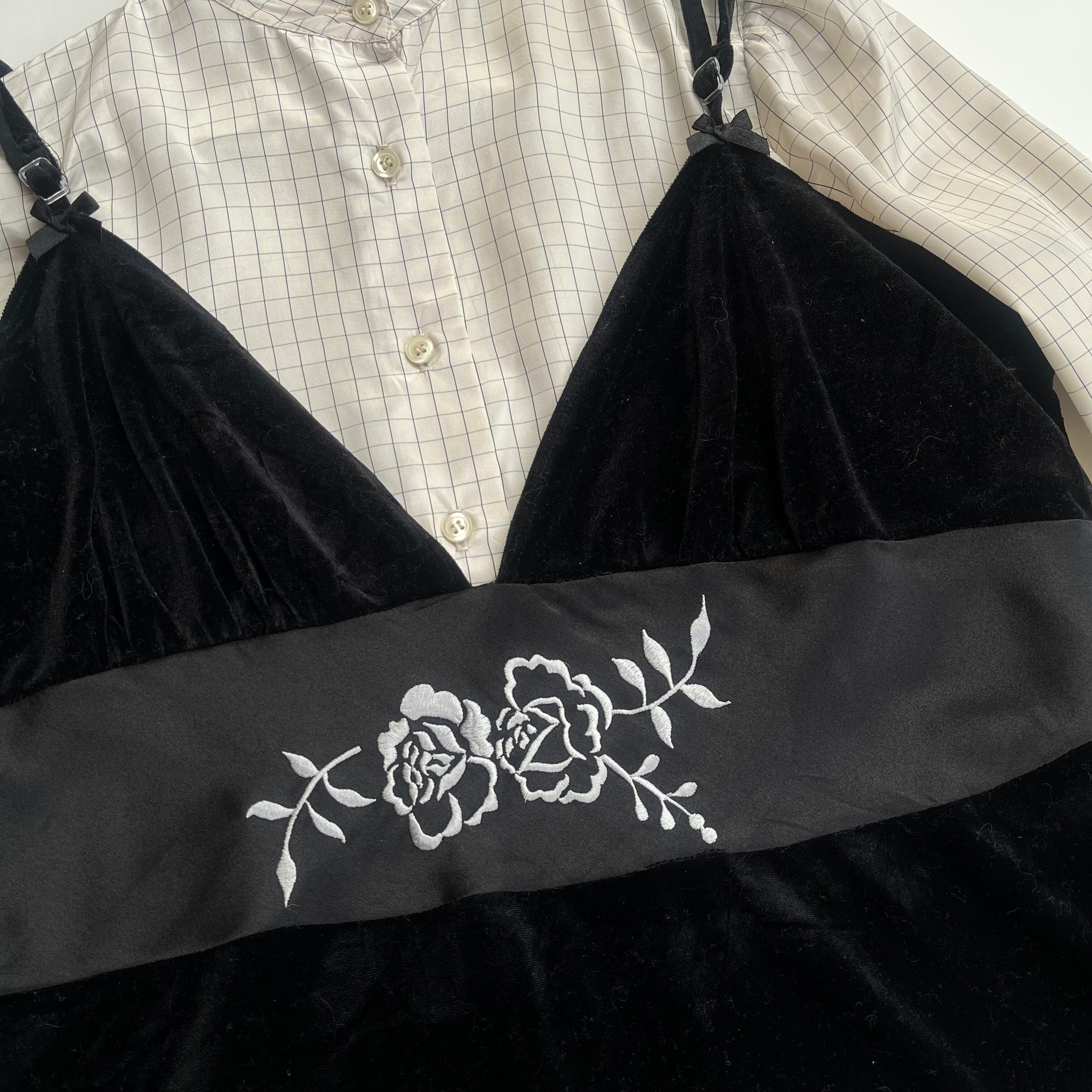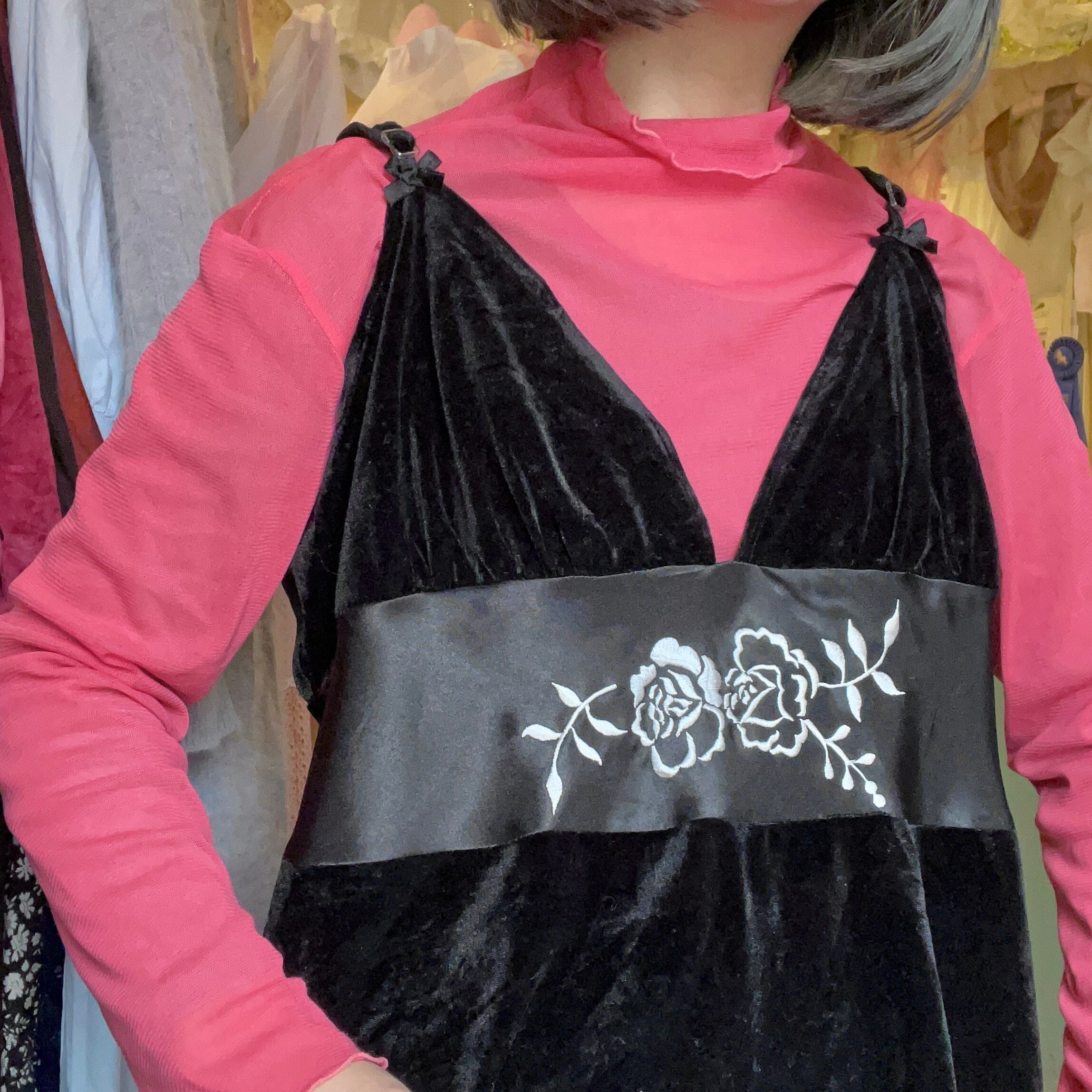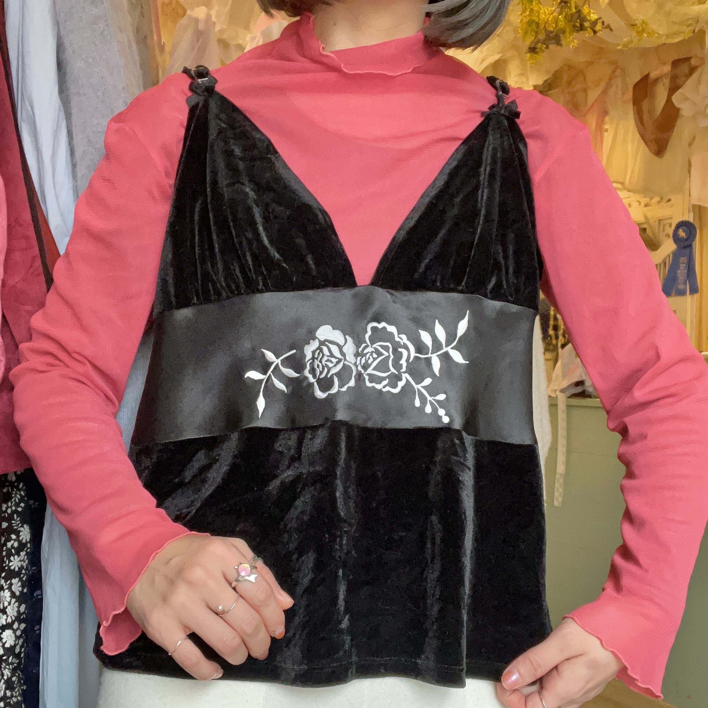 真ん中のお花刺繍と肩紐についた小さなリボンがポイント。