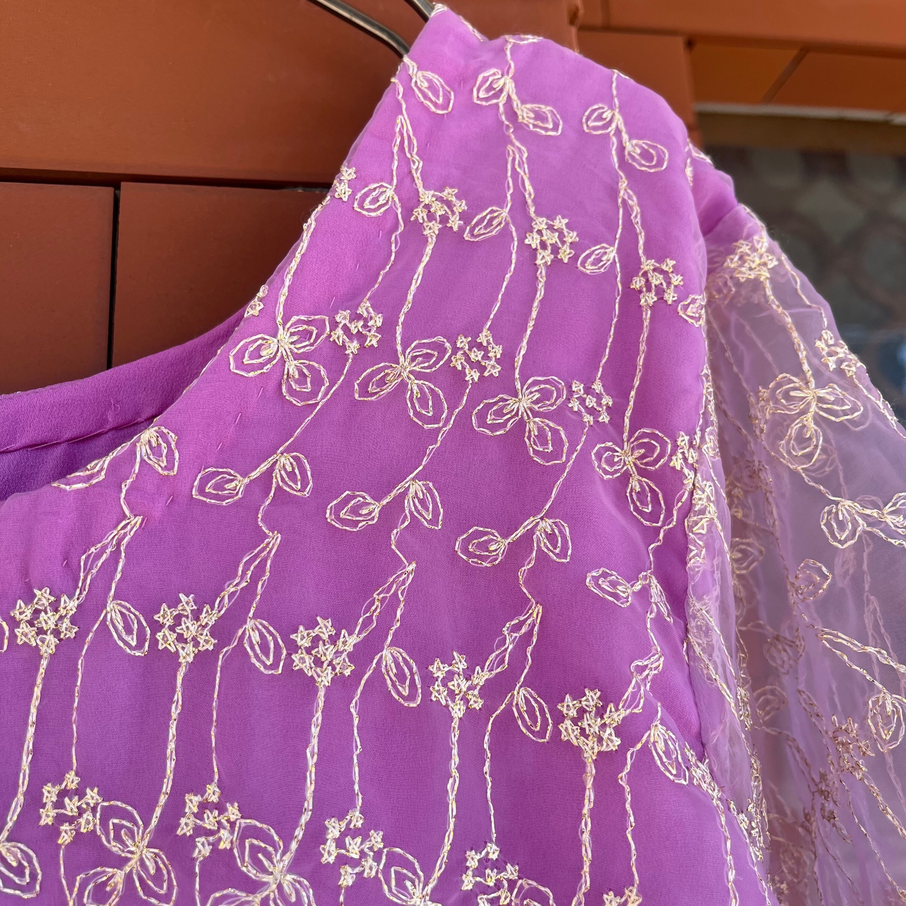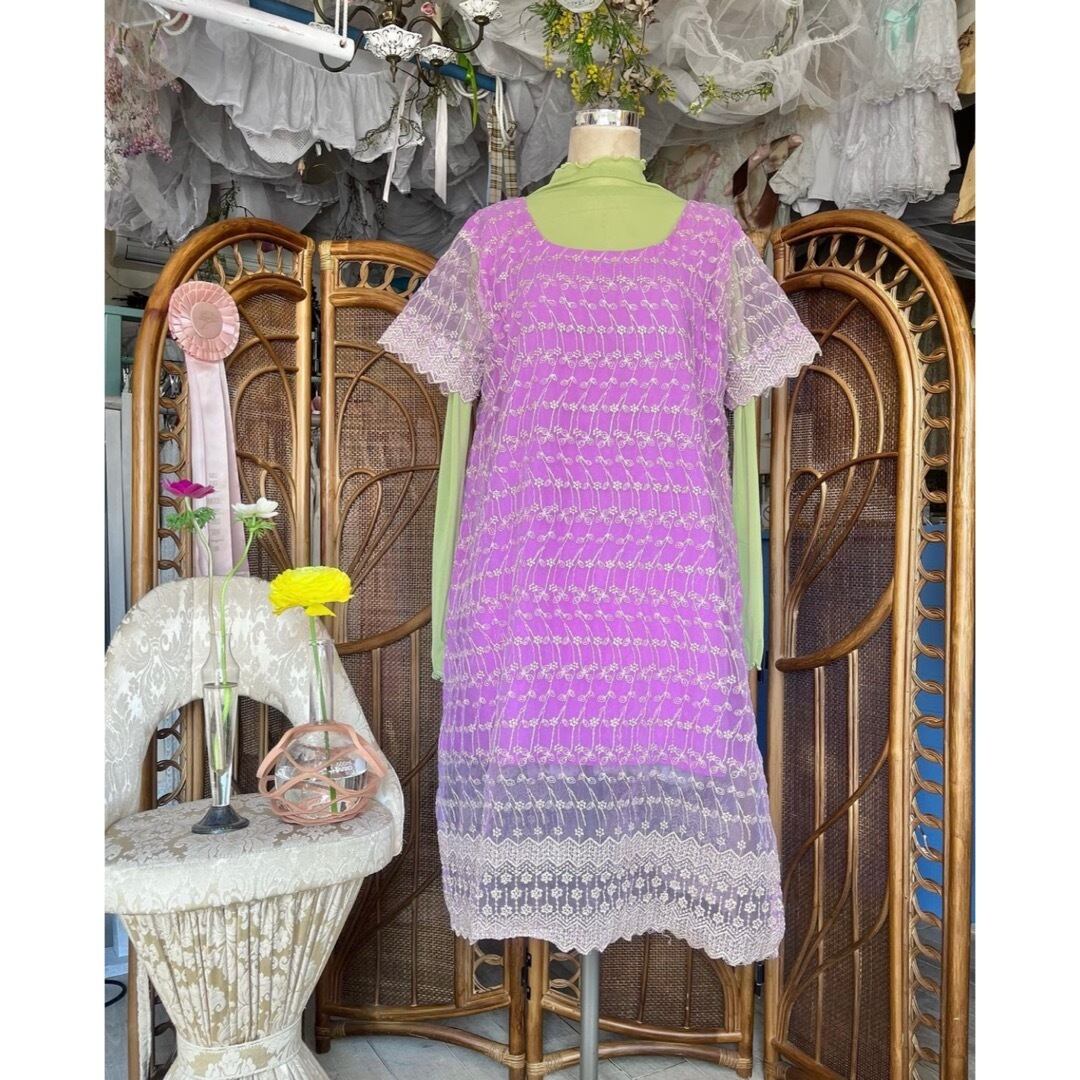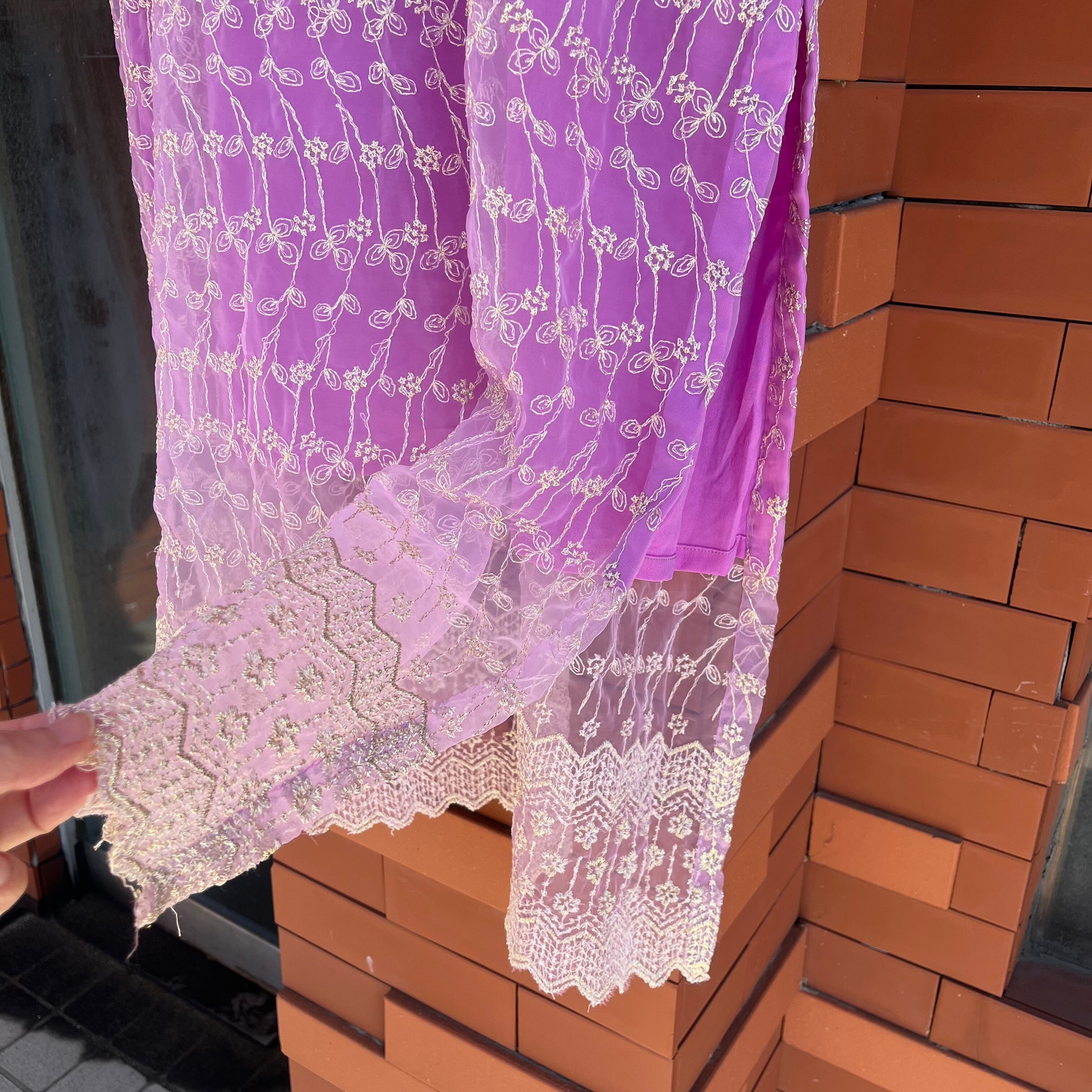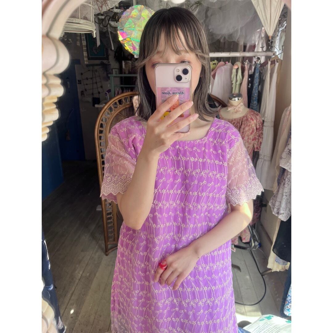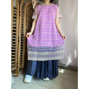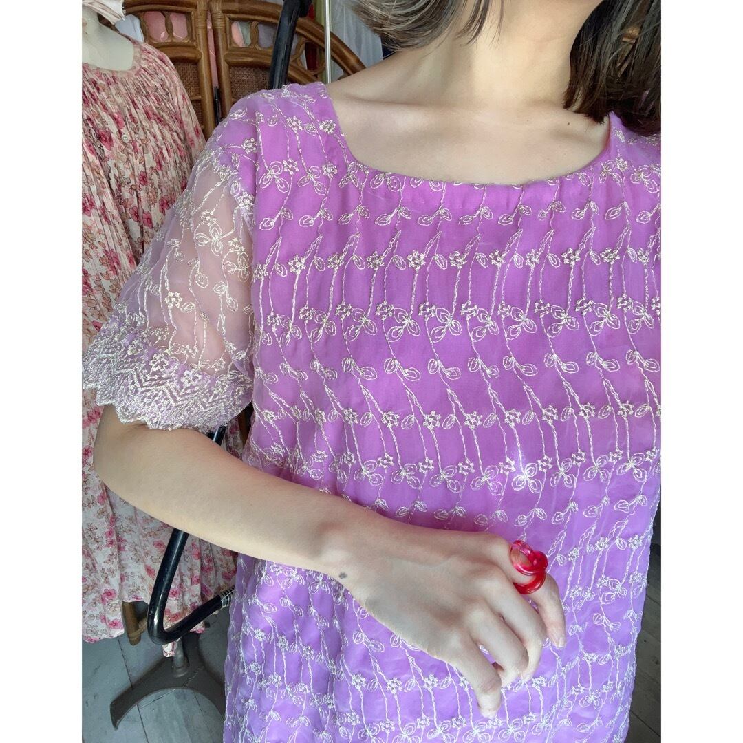 紫の裏地とゴールドの華やかな刺繍がお目立ちのエスニックワンピース。こちらはハンドメイドです。