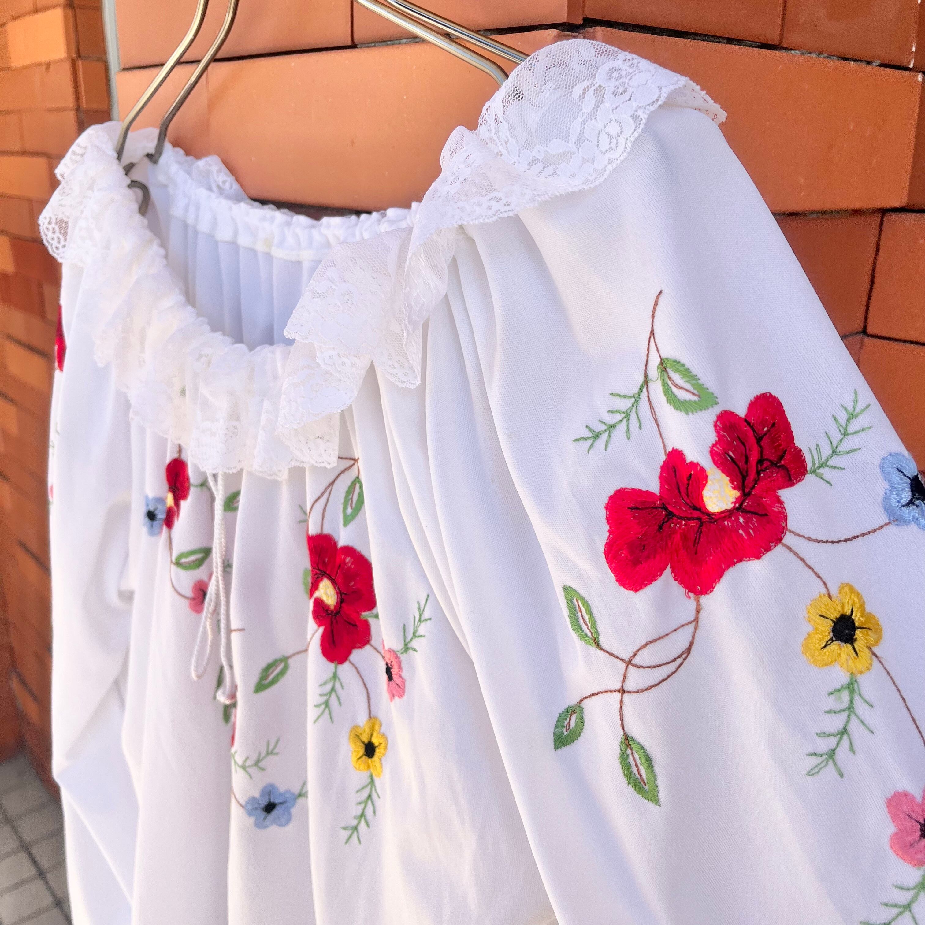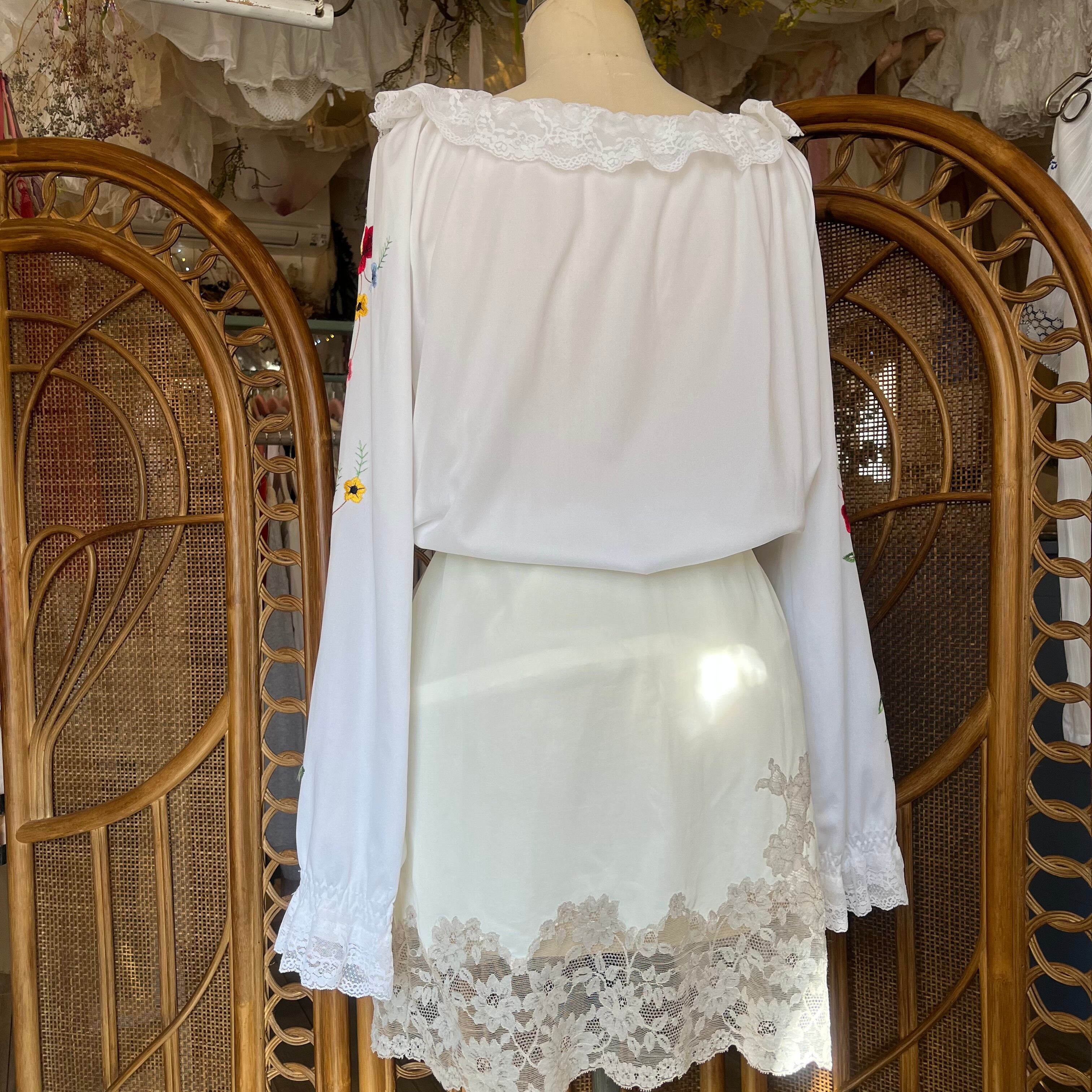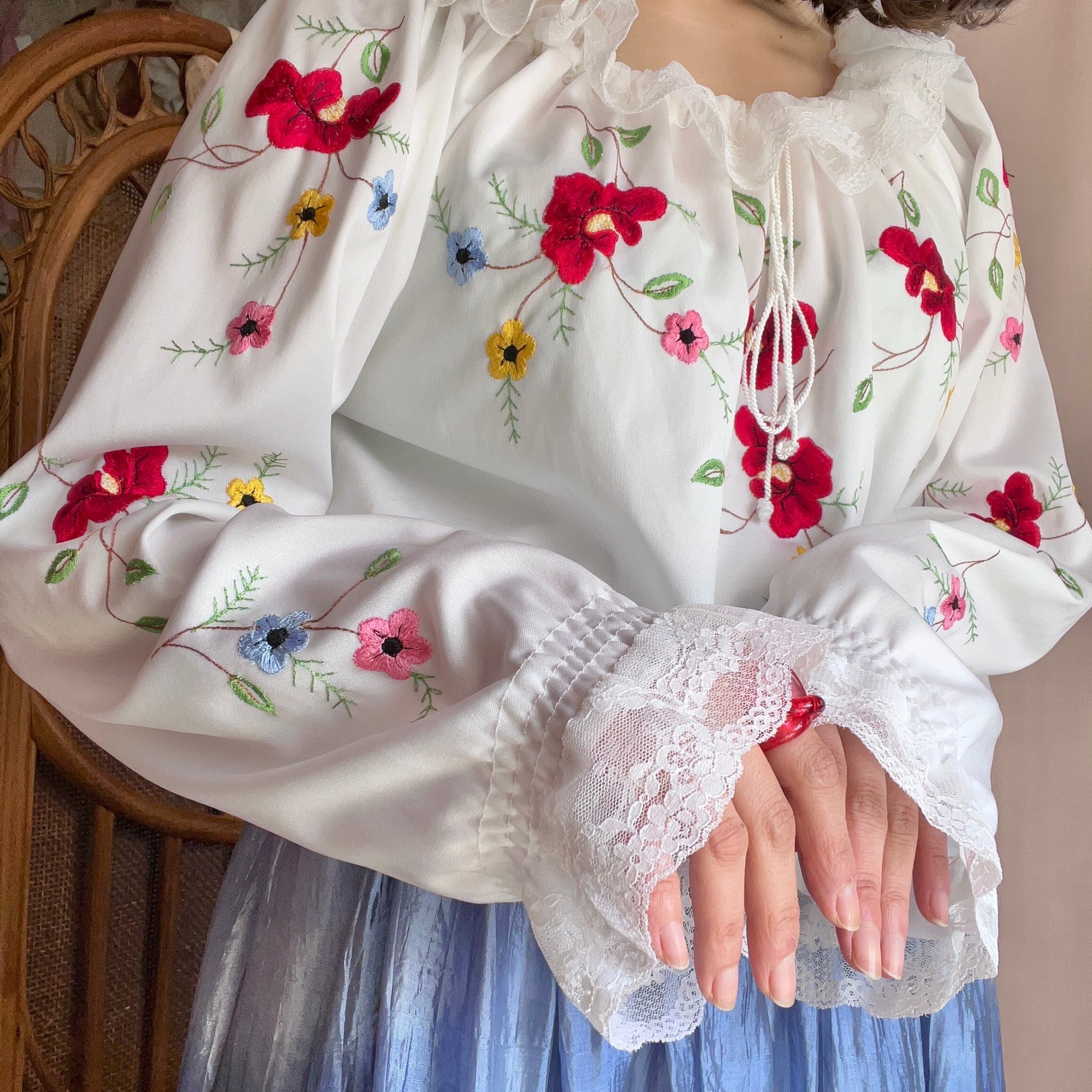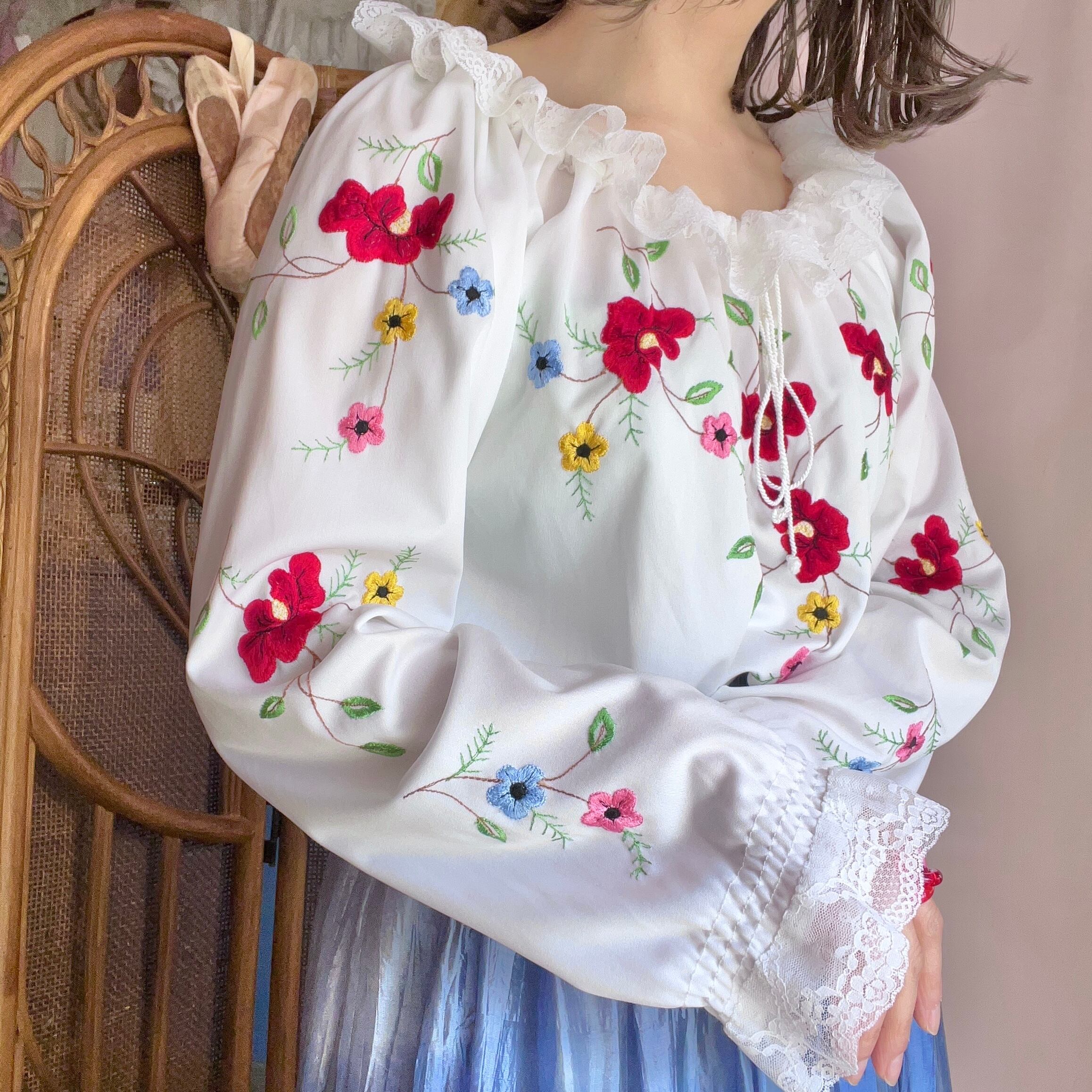 春気分を盛り上げてくれるお花刺繍の鮮やかなチュニック。両腕にも刺繍が入っていることや首もとや袖口のレースが甘く贅沢です。