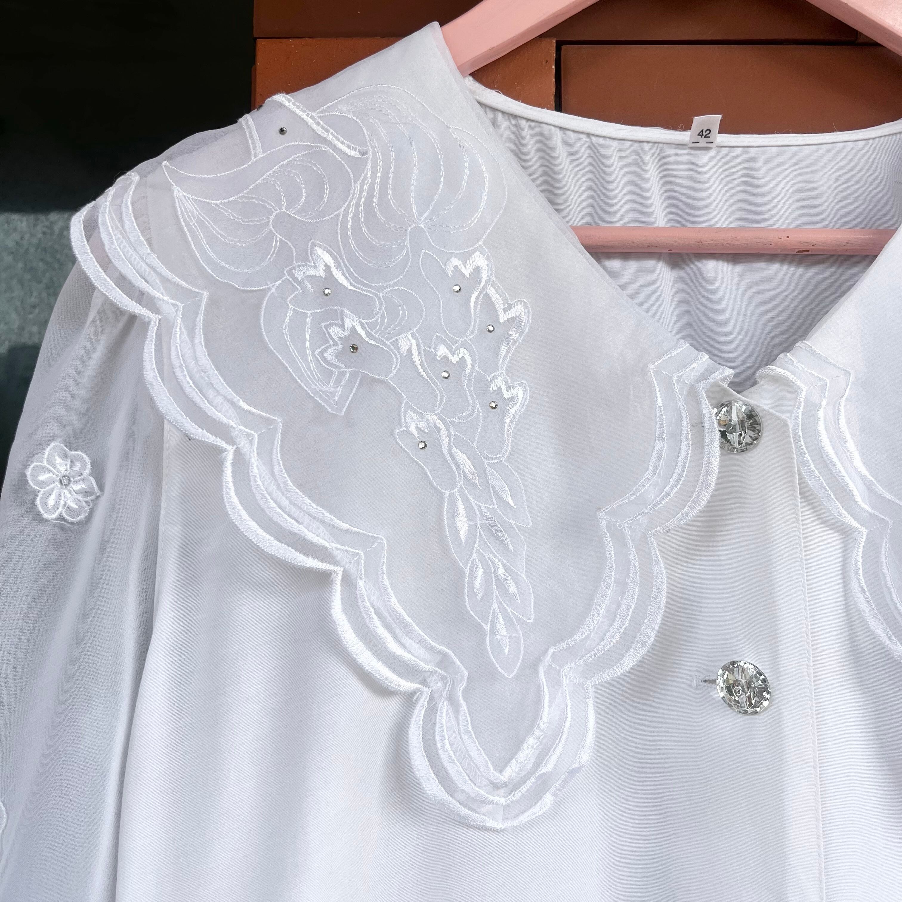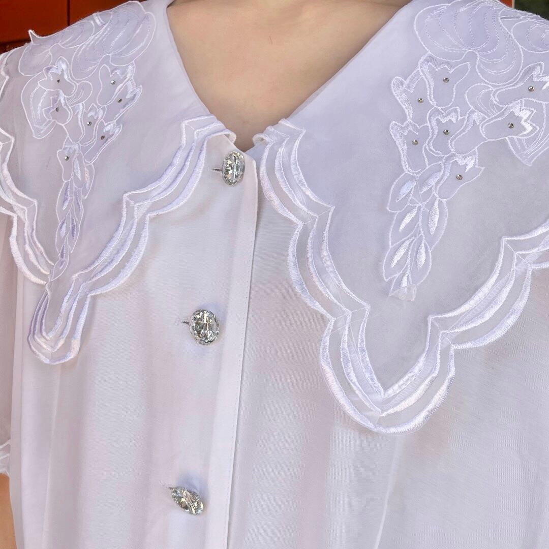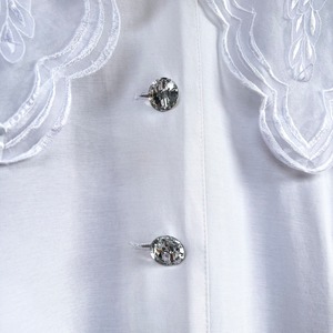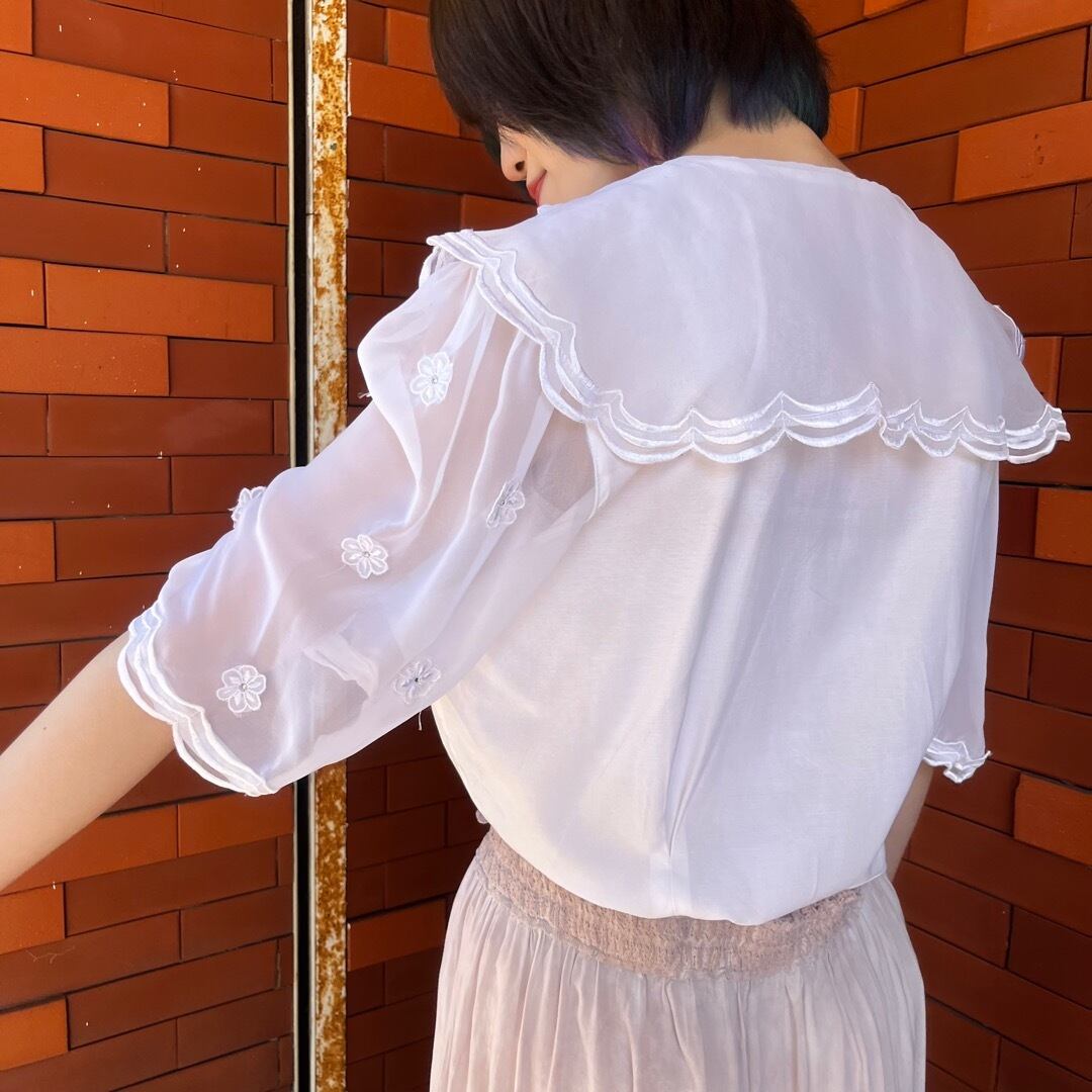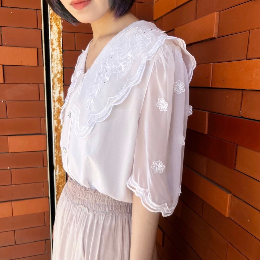 大きくシアーな襟とお花があしらわれたお袖、きらきらのビジューボタン。どこを切り取ってもロマンチックな主役ブラウスです。