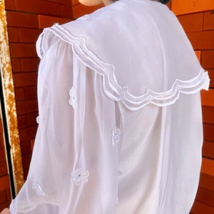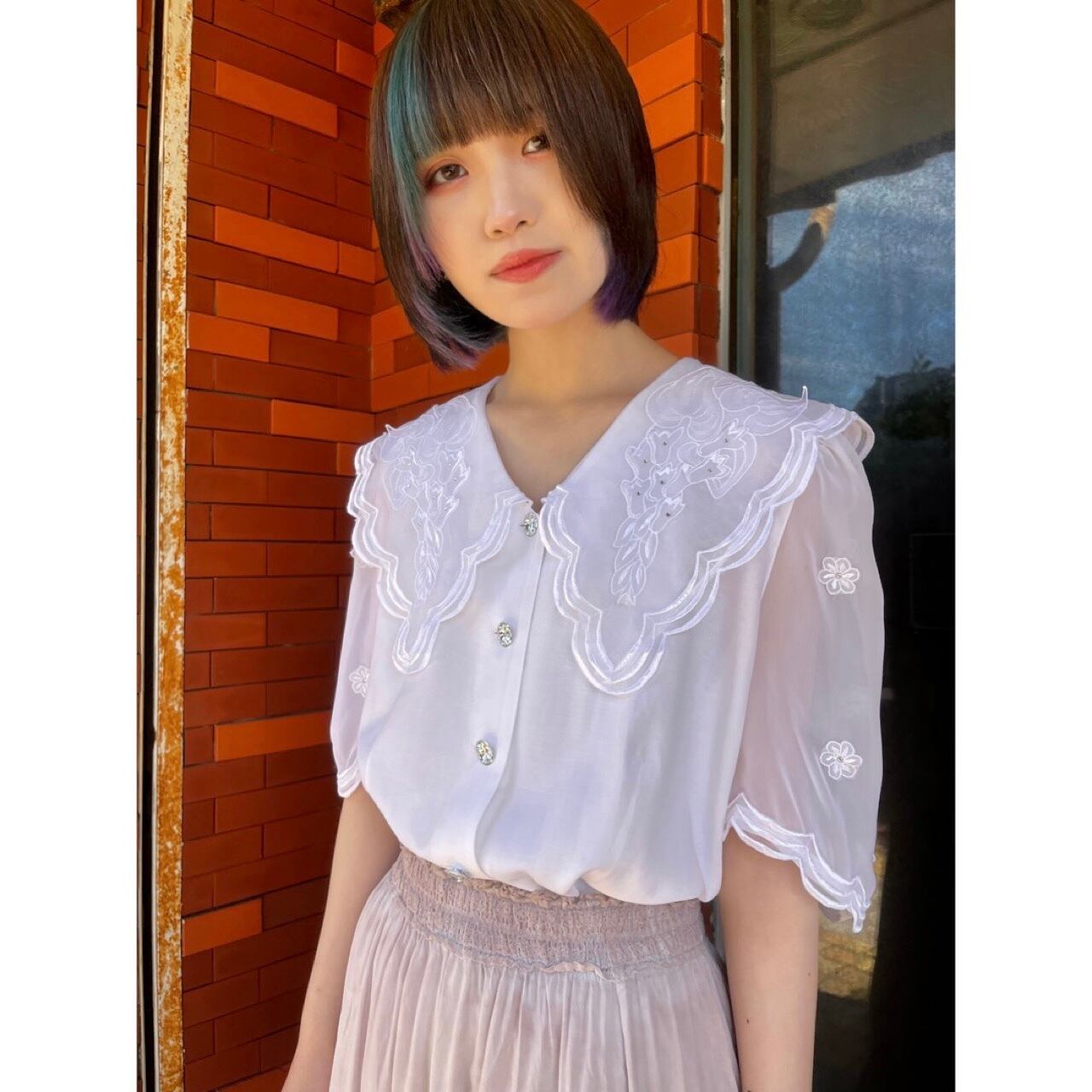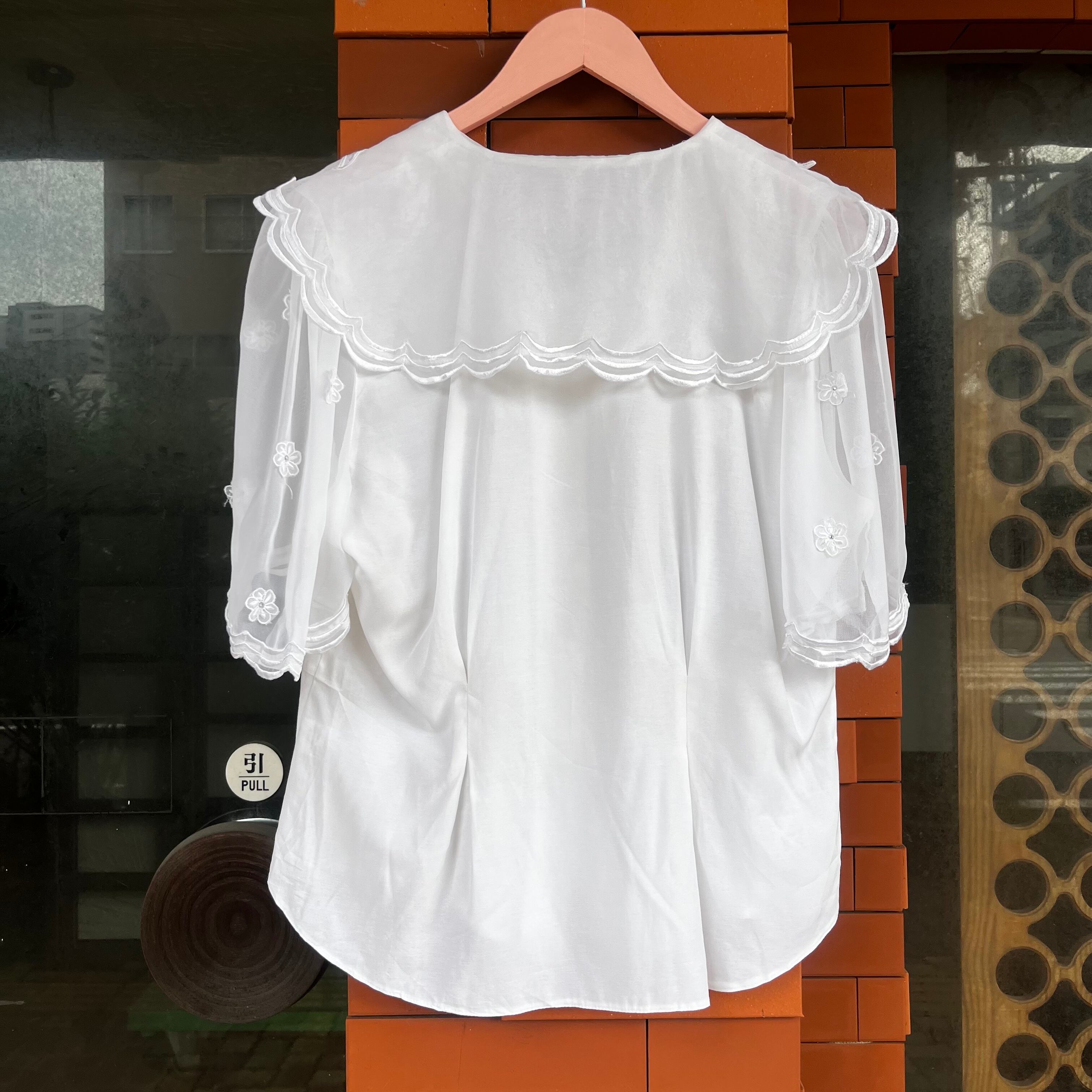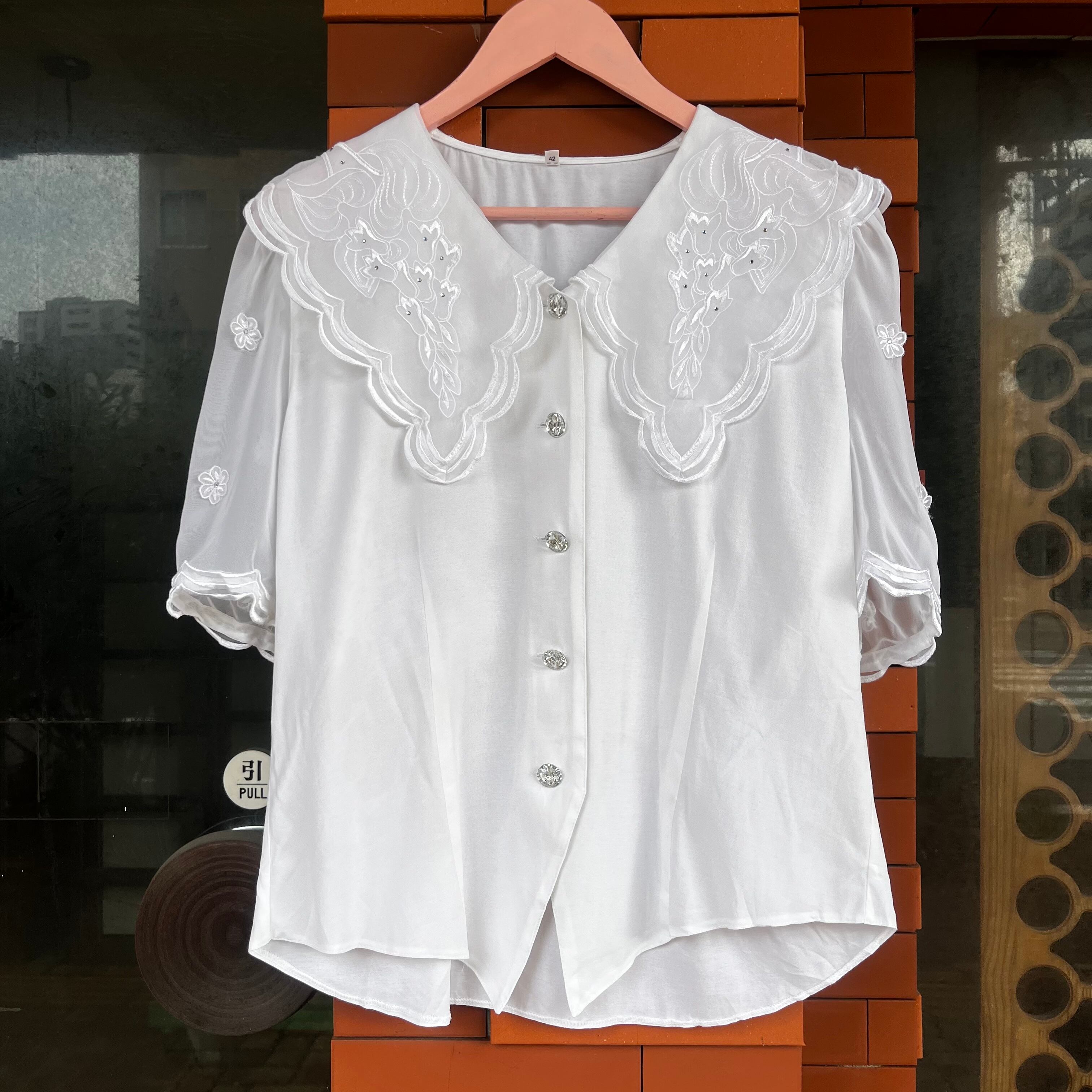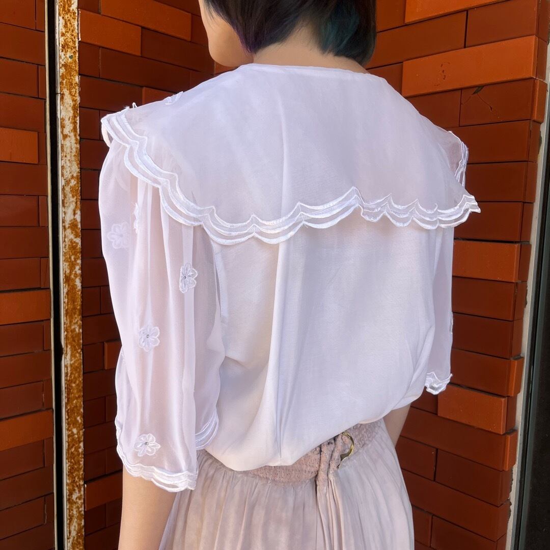 大きくシアーな襟とお花があしらわれたお袖、きらきらのビジューボタン。どこを切り取ってもロマンチックな主役ブラウスです。