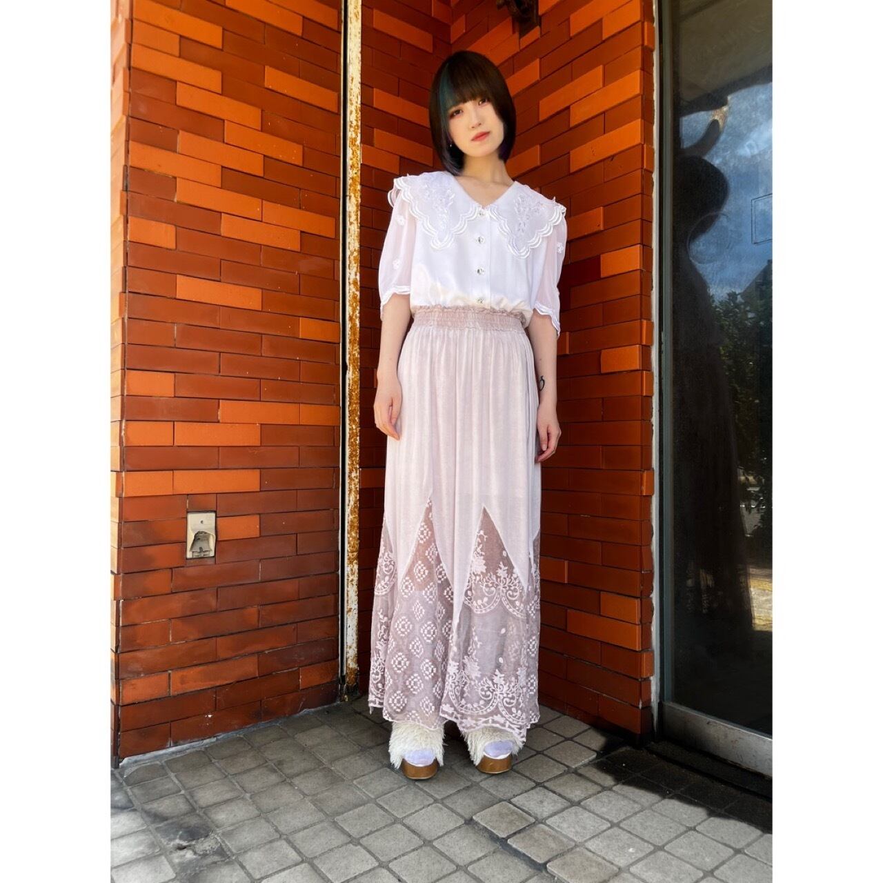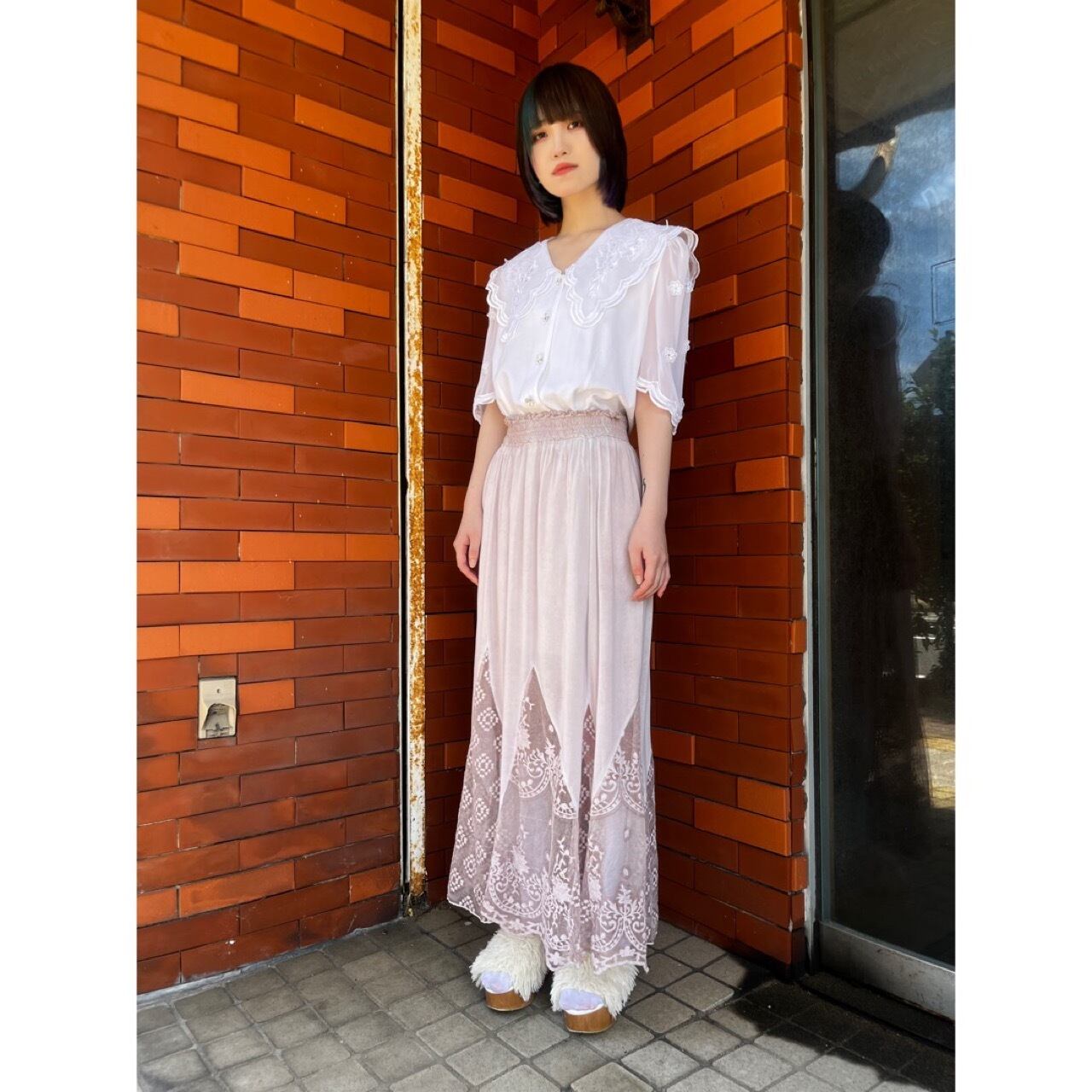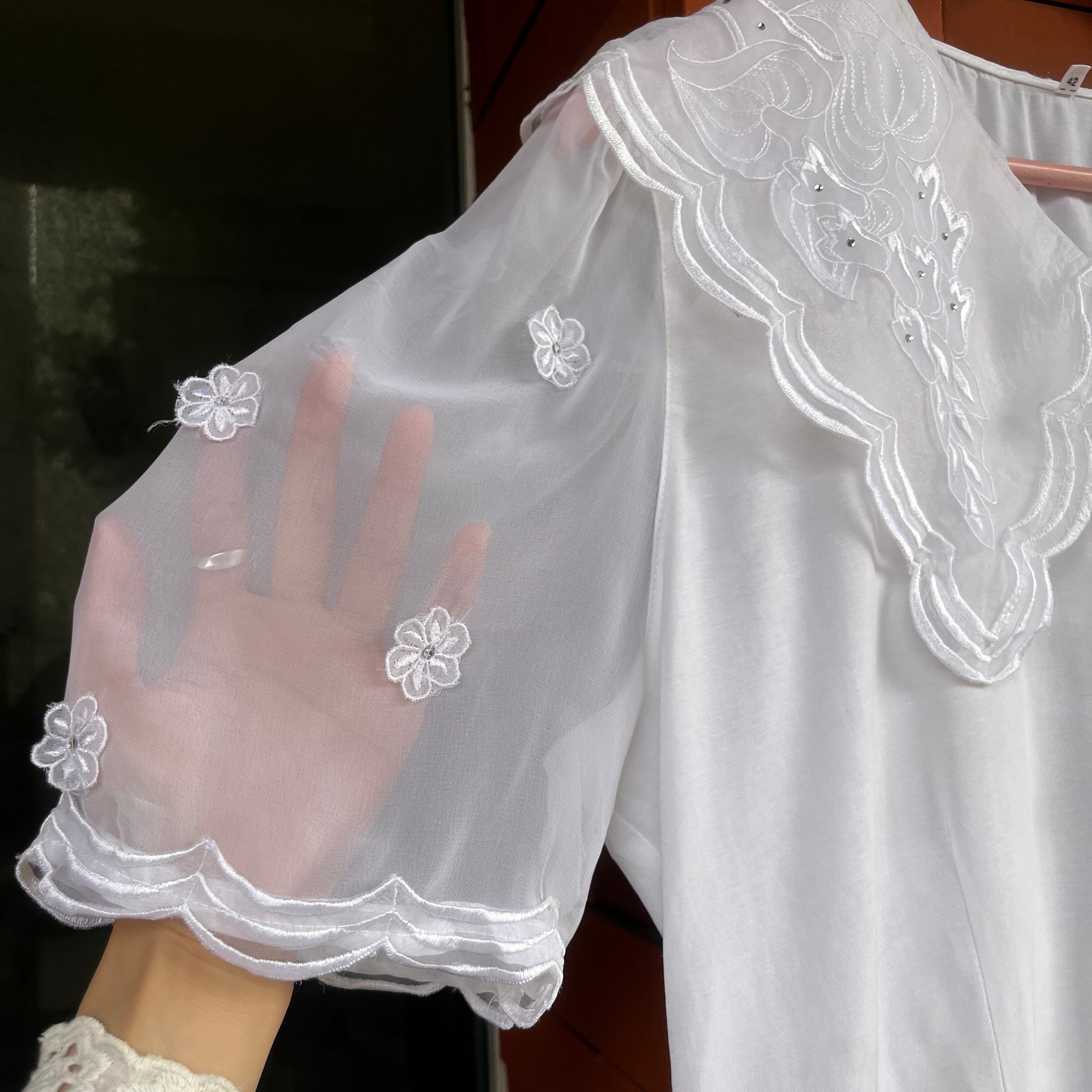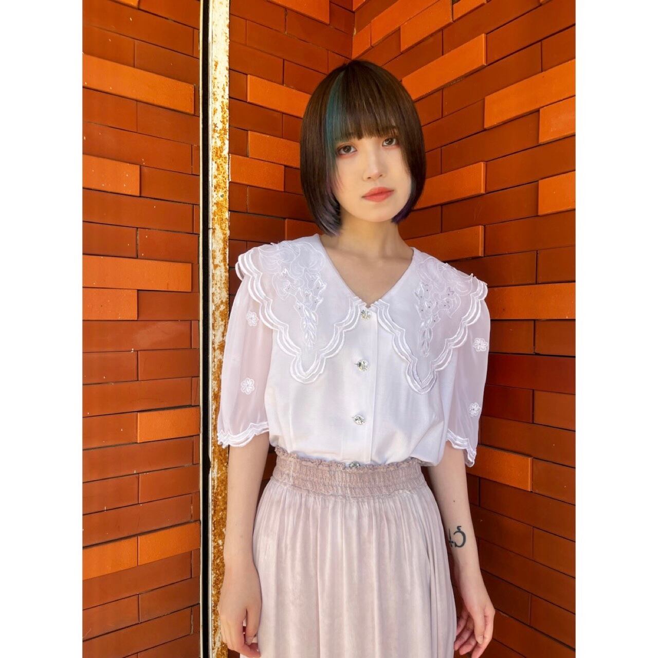 大きくシアーな襟とお花があしらわれたお袖、きらきらのビジューボタン。どこを切り取ってもロマンチックな主役ブラウスです。