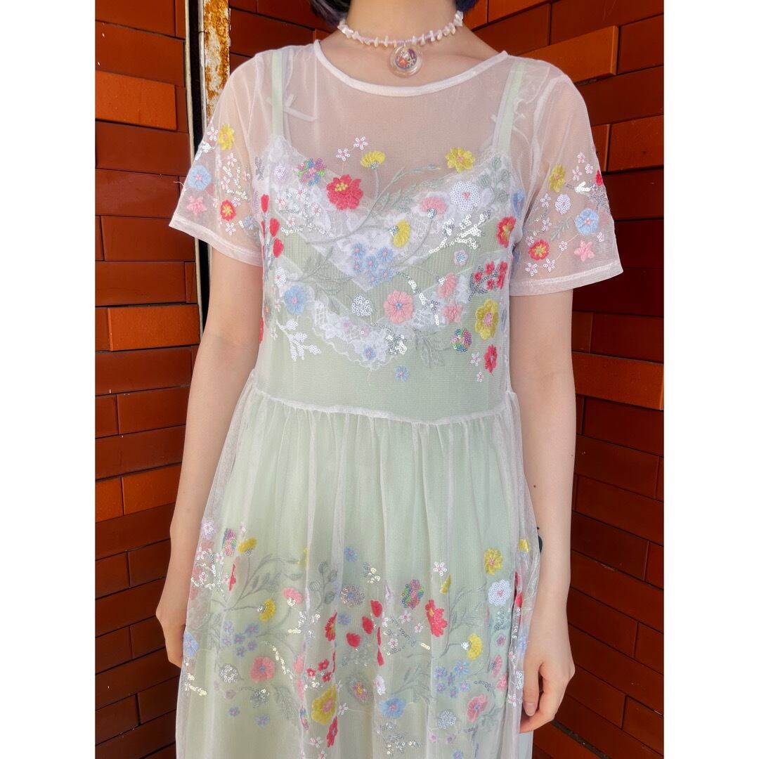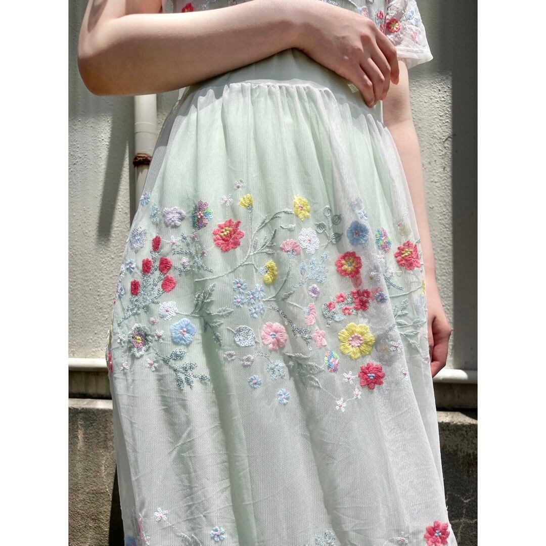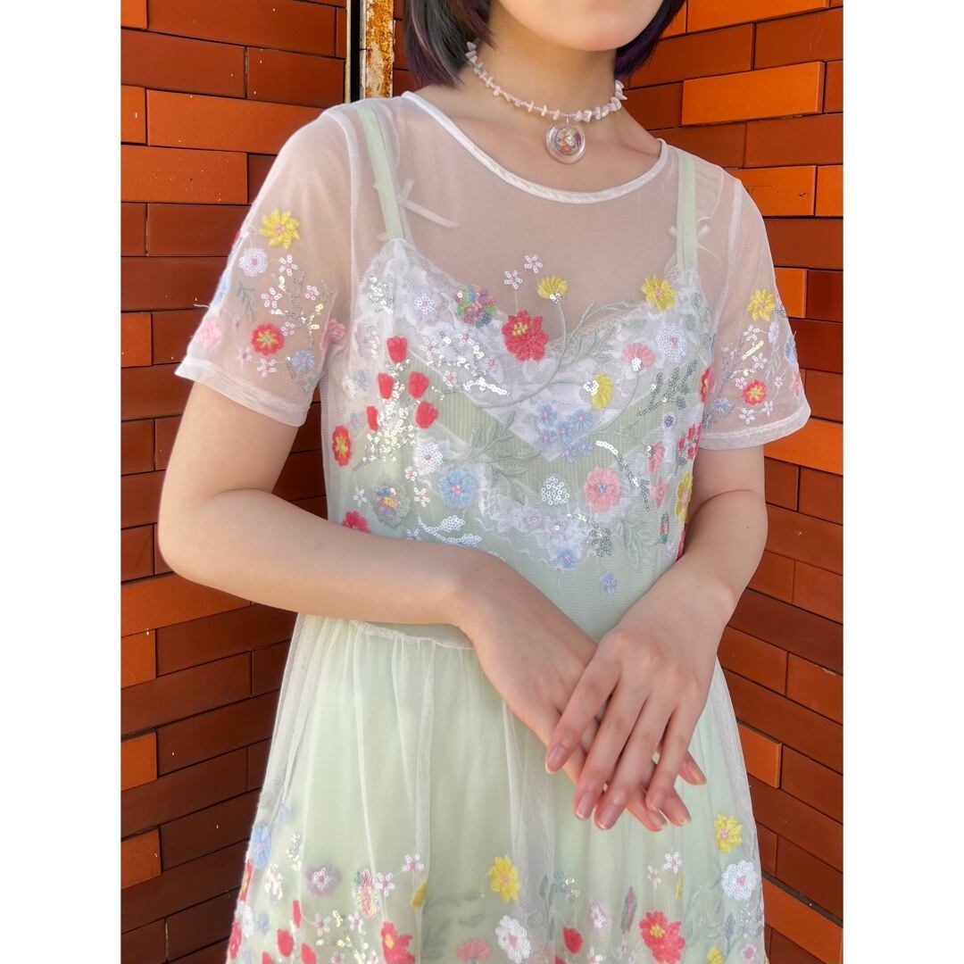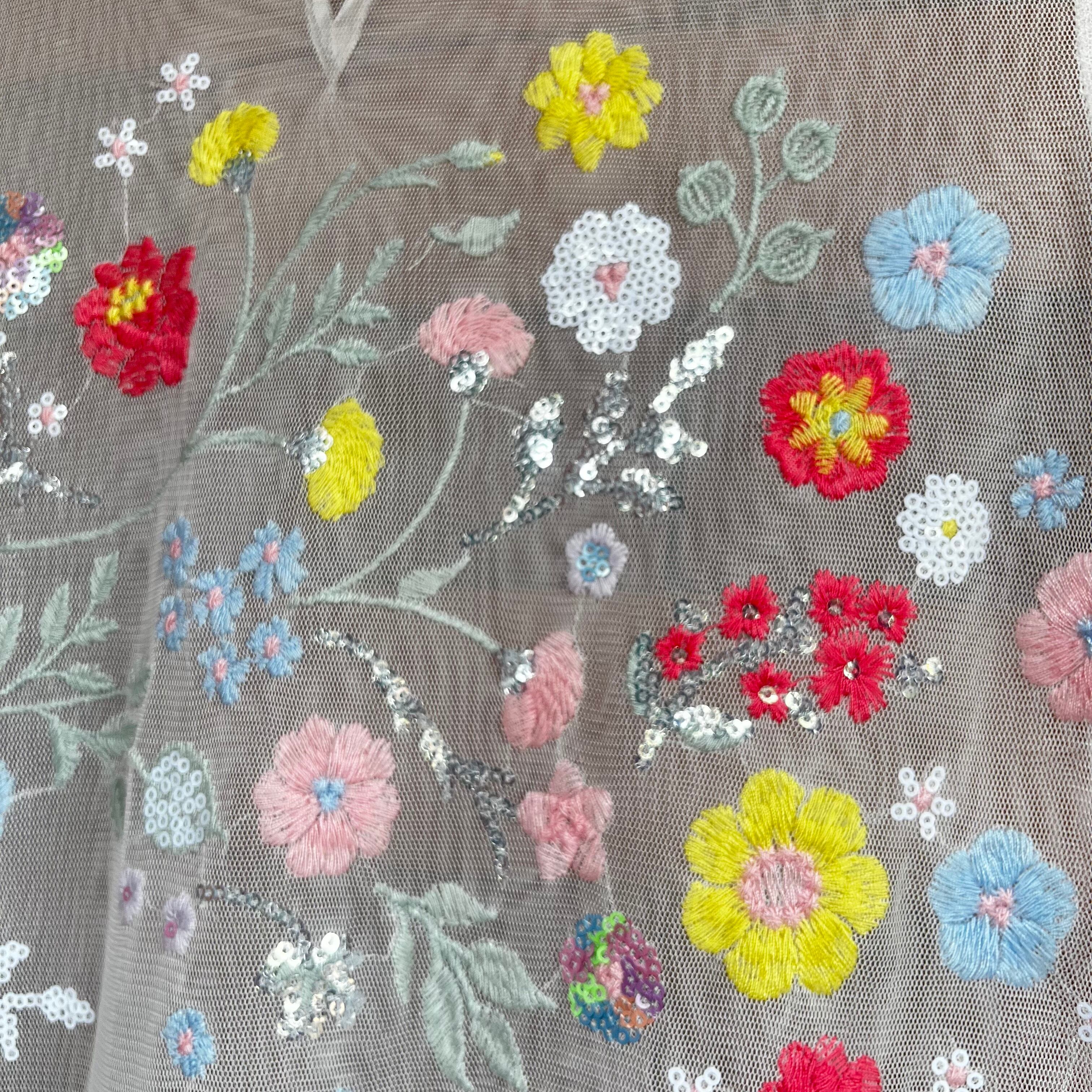 柔らかなチュールにお花刺繍やきらきらのスパンコールがほどこされた華やかな一着。