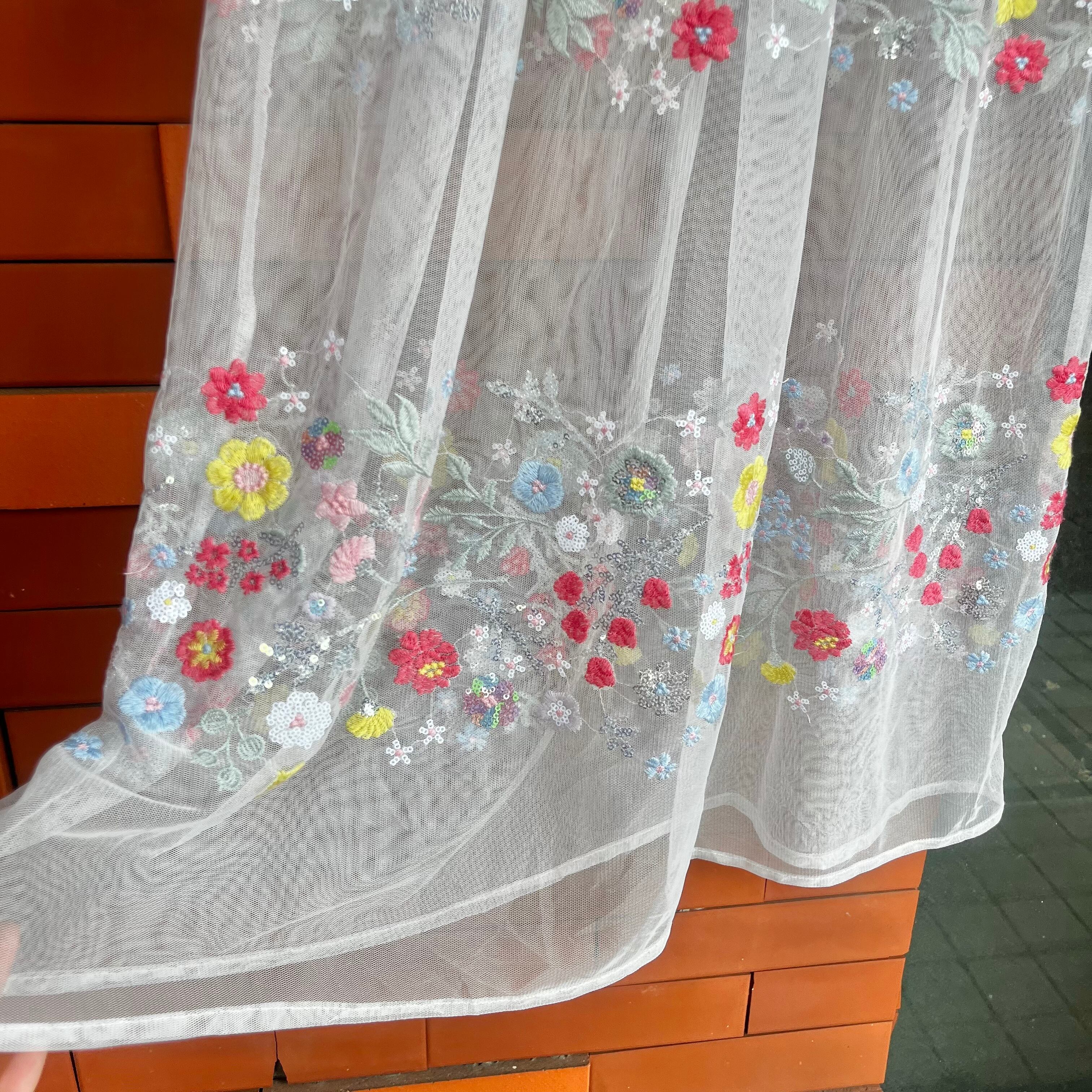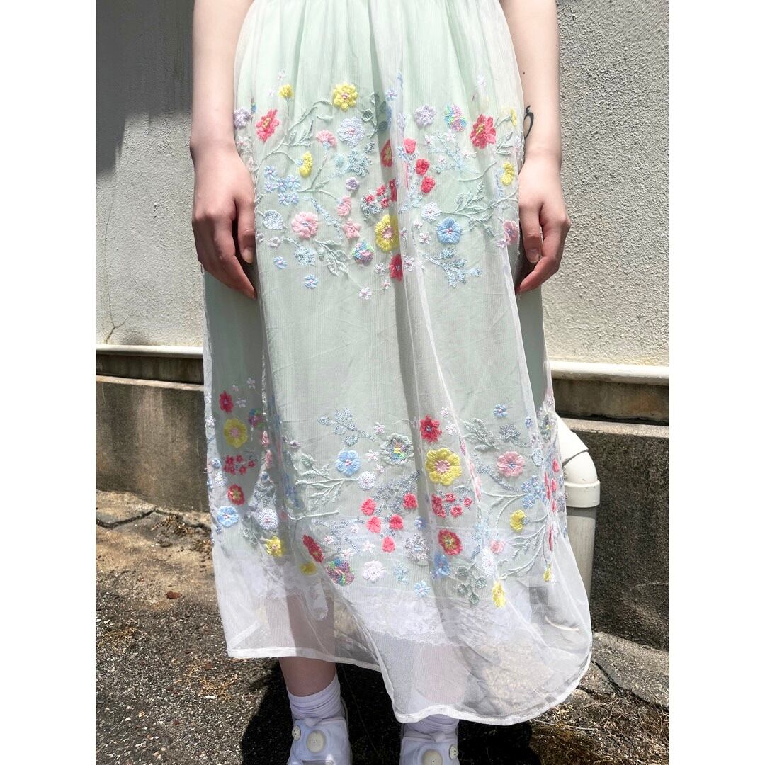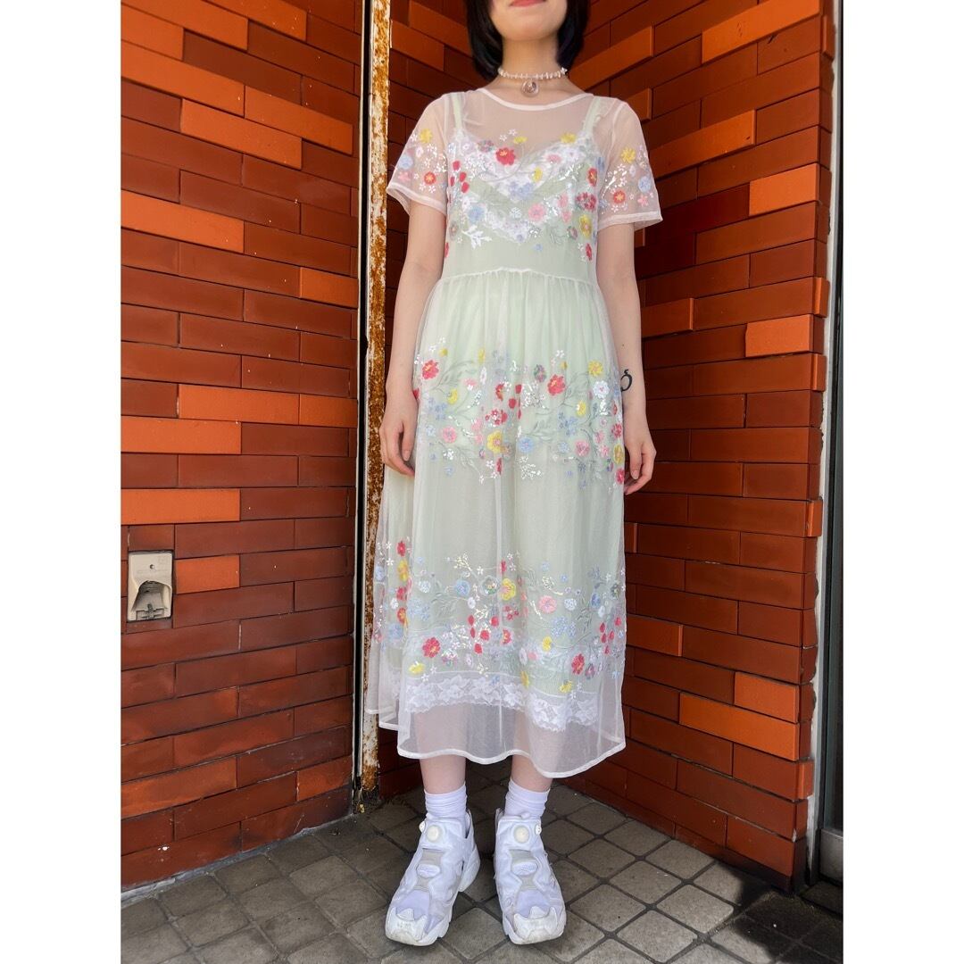 柔らかなチュールにお花刺繍やきらきらのスパンコールがほどこされた華やかな一着。
