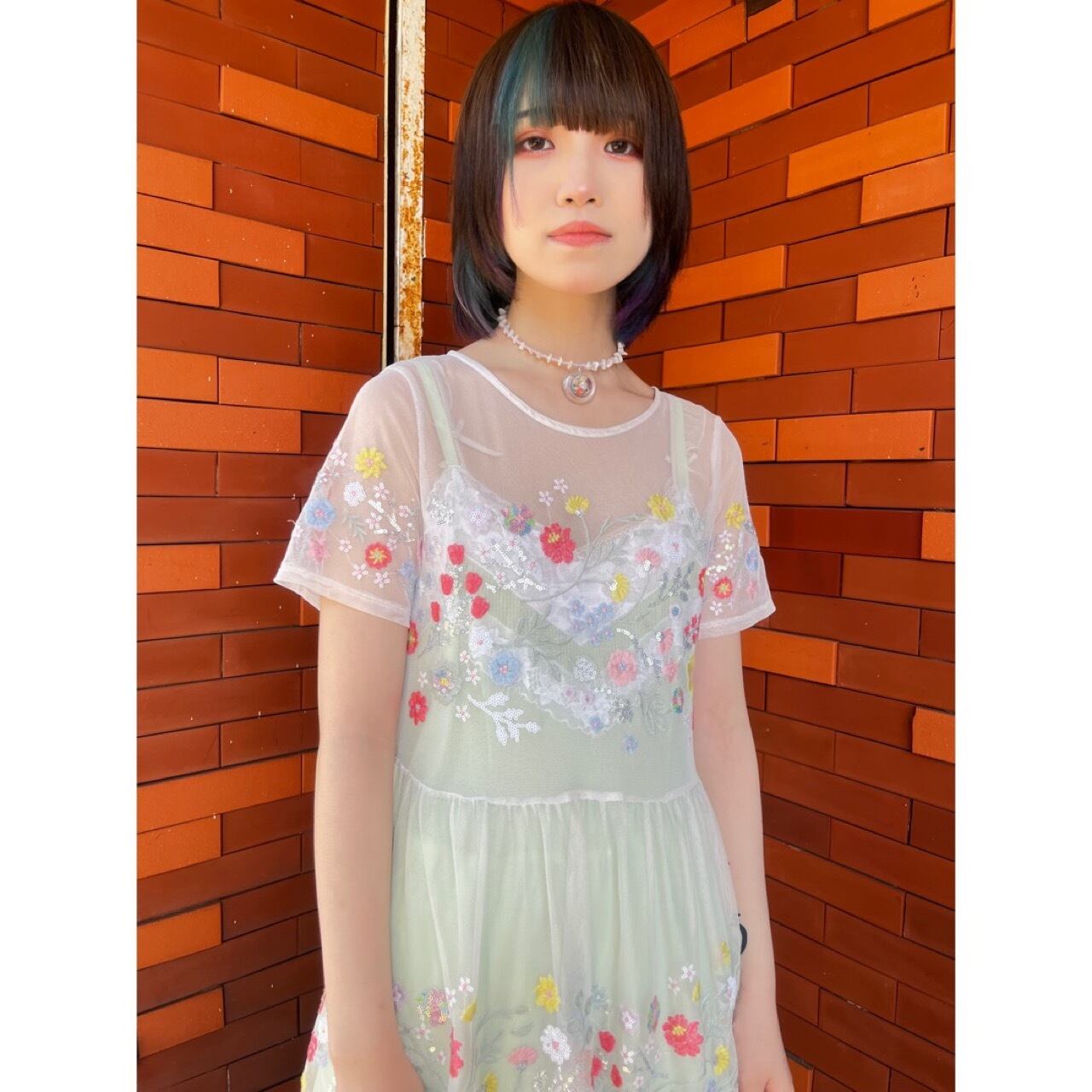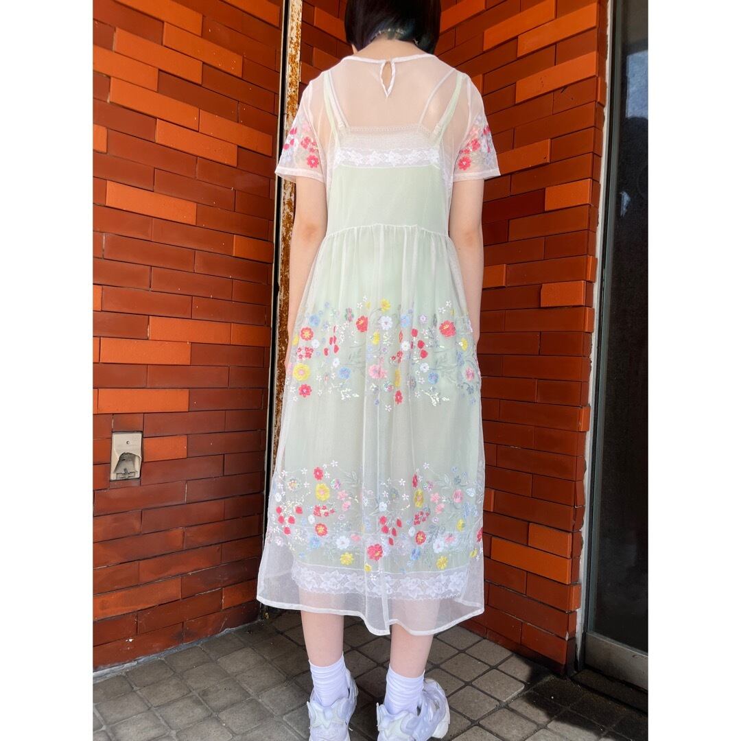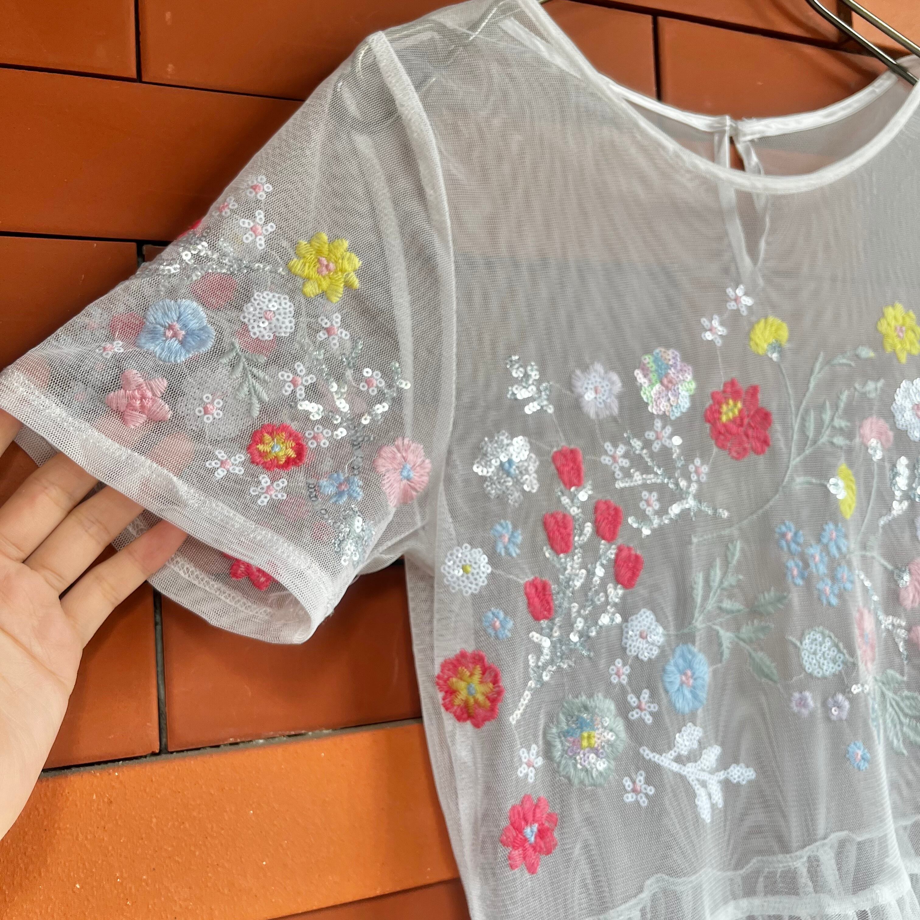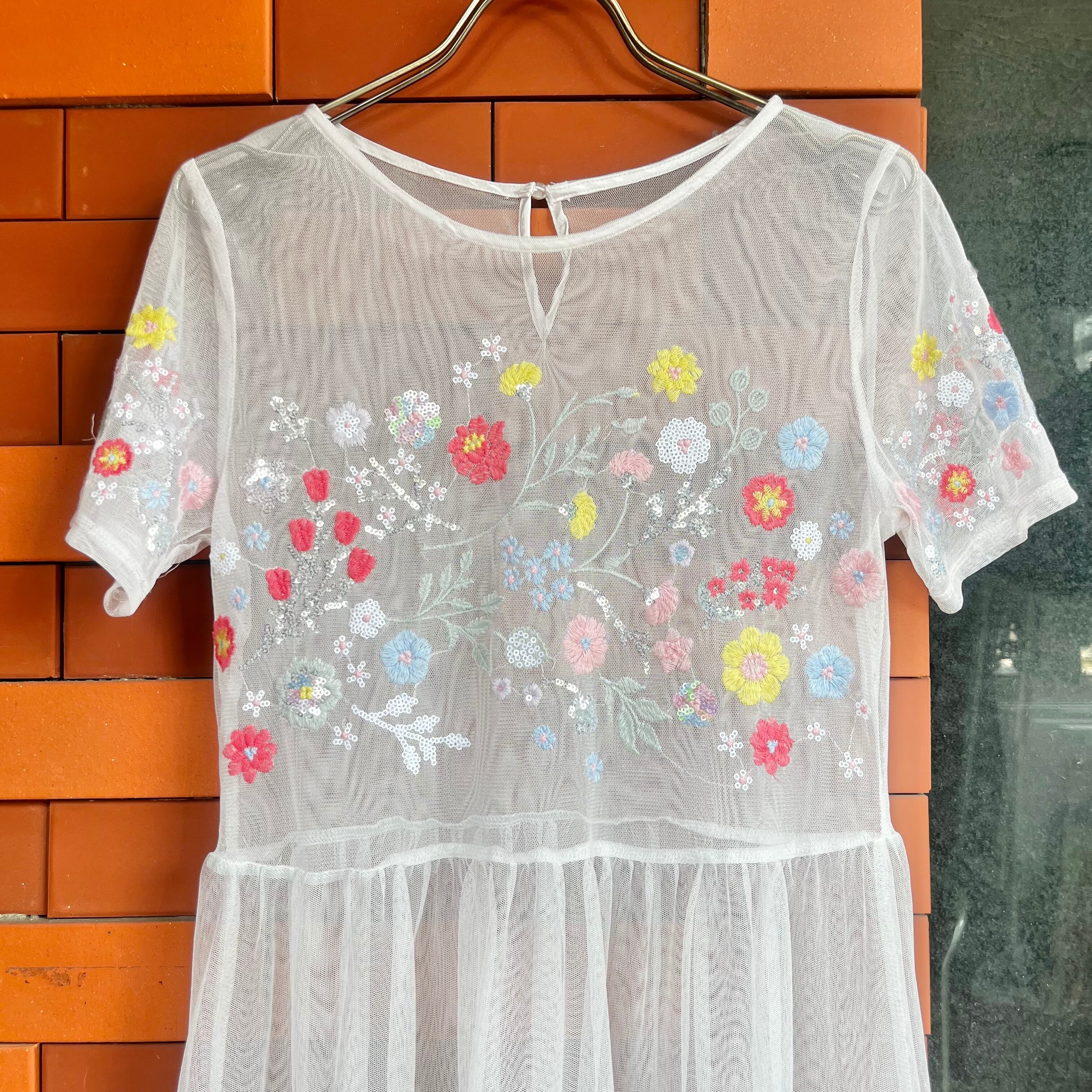 柔らかなチュールにお花刺繍やきらきらのスパンコールがほどこされた華やかな一着。