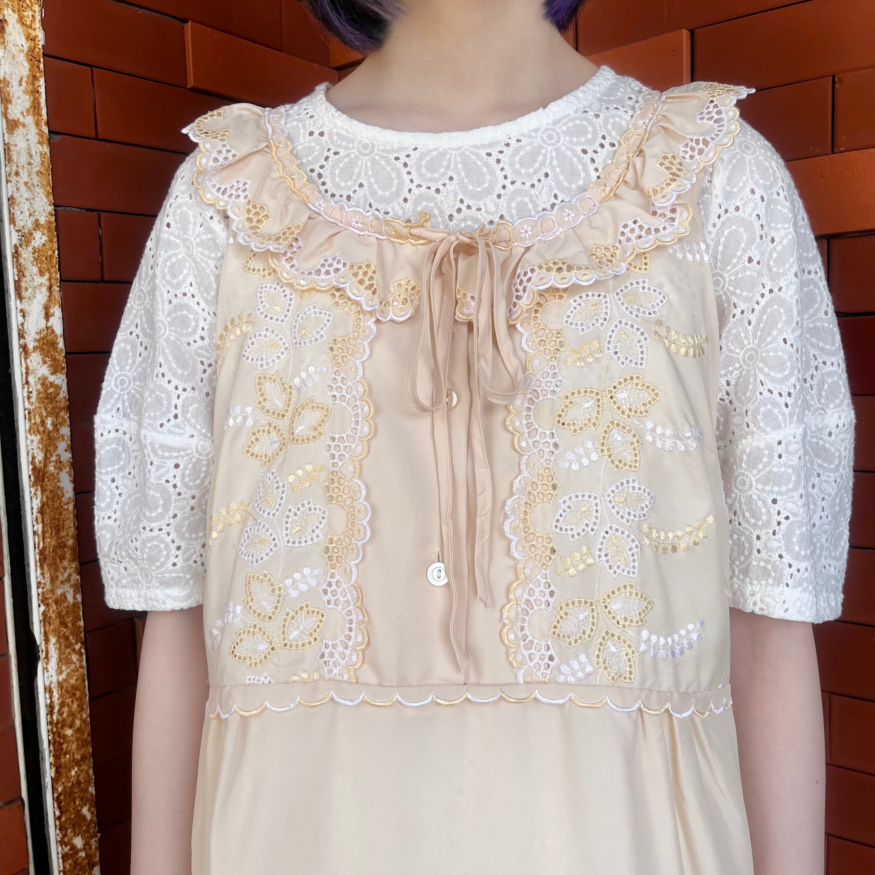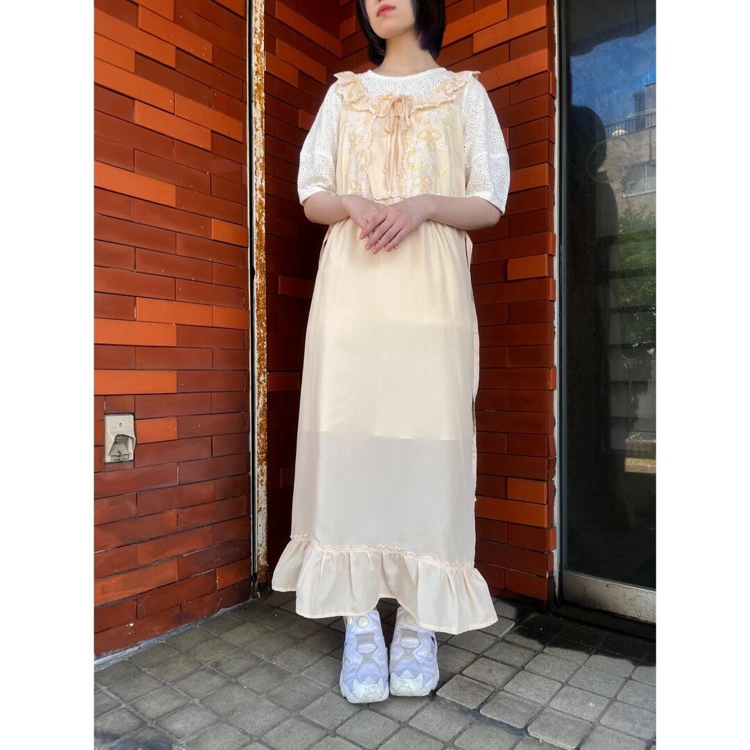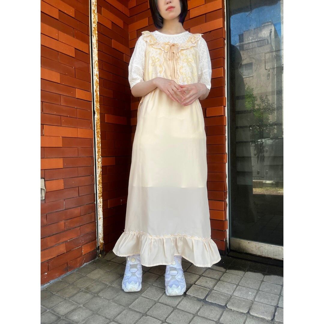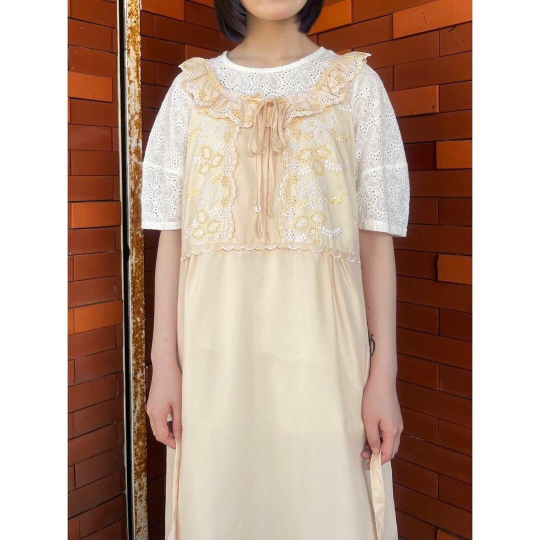肩のフリルと胸元リボン、草花の刺繍が可愛いワンピース。