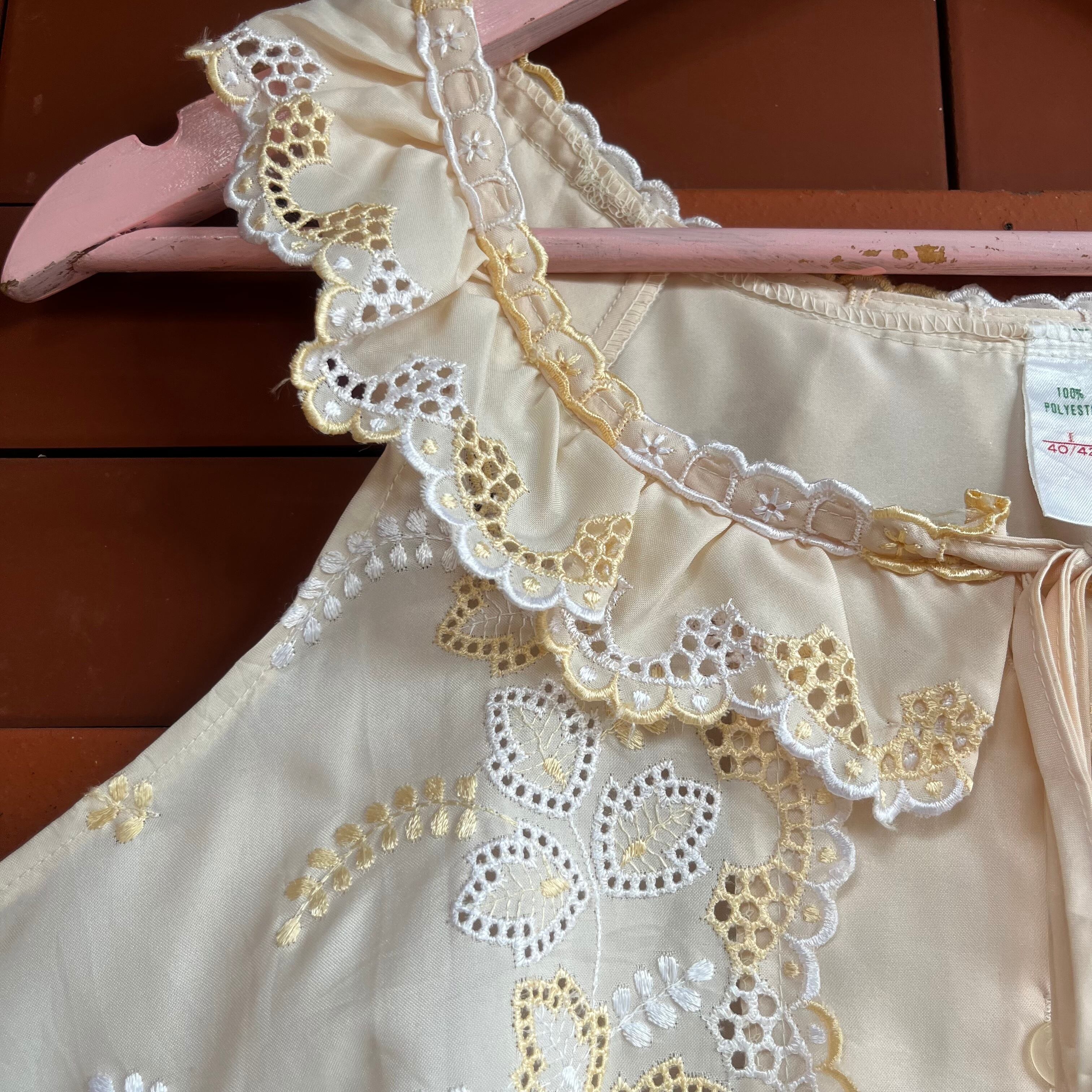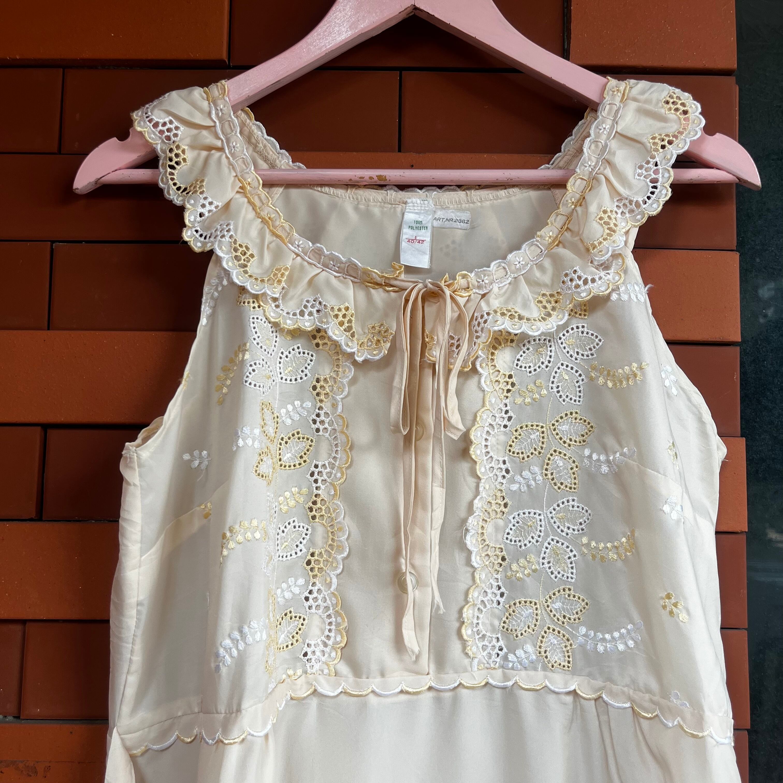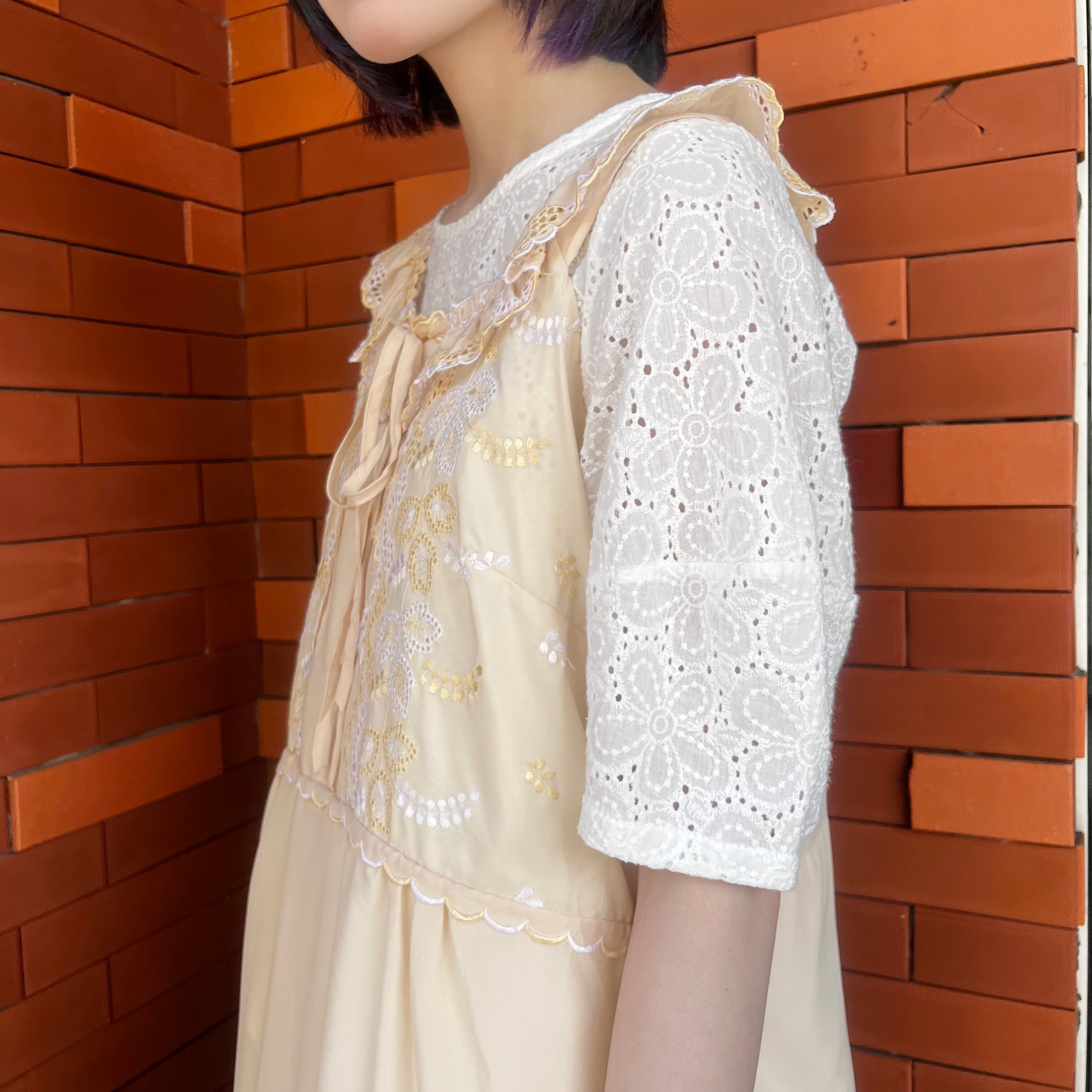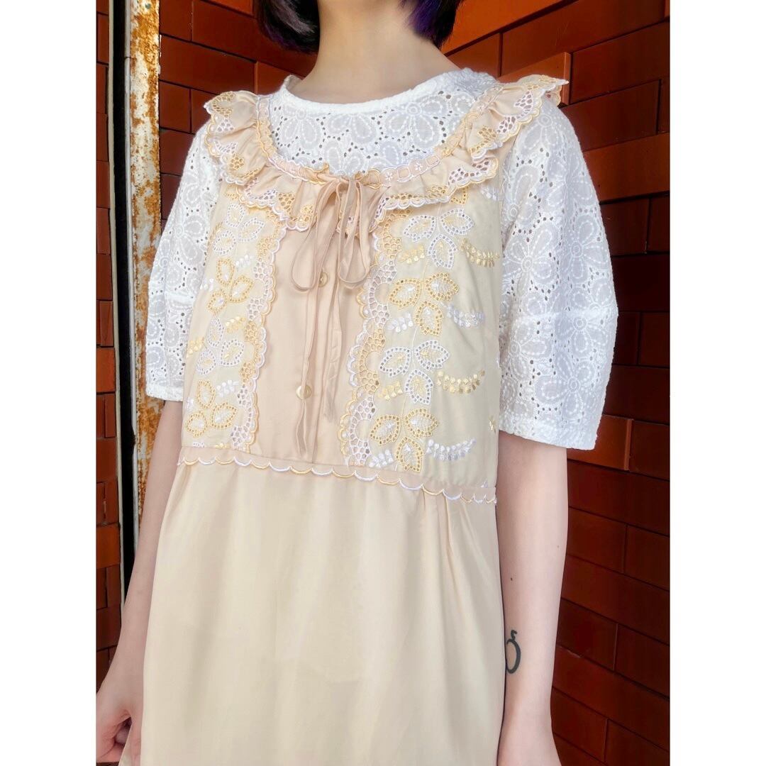 肩のフリルと胸元リボン、草花の刺繍が可愛いワンピース。