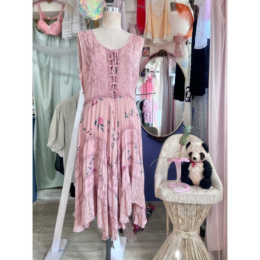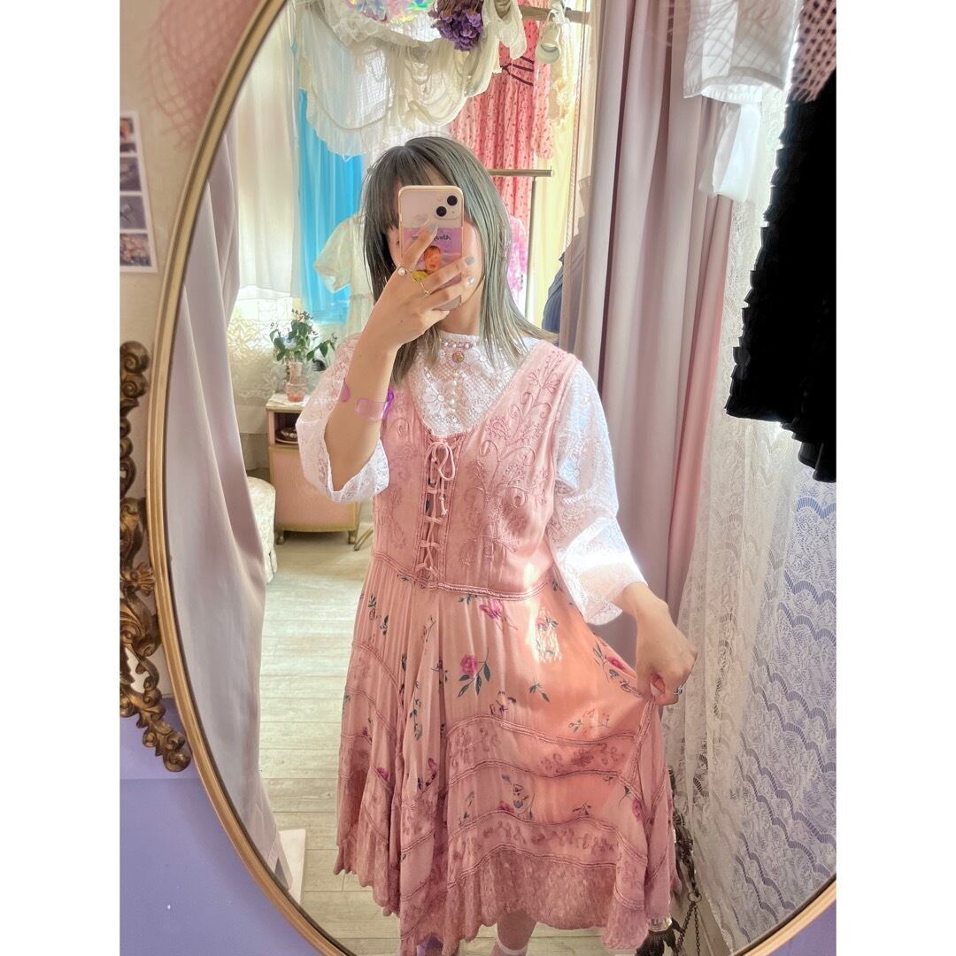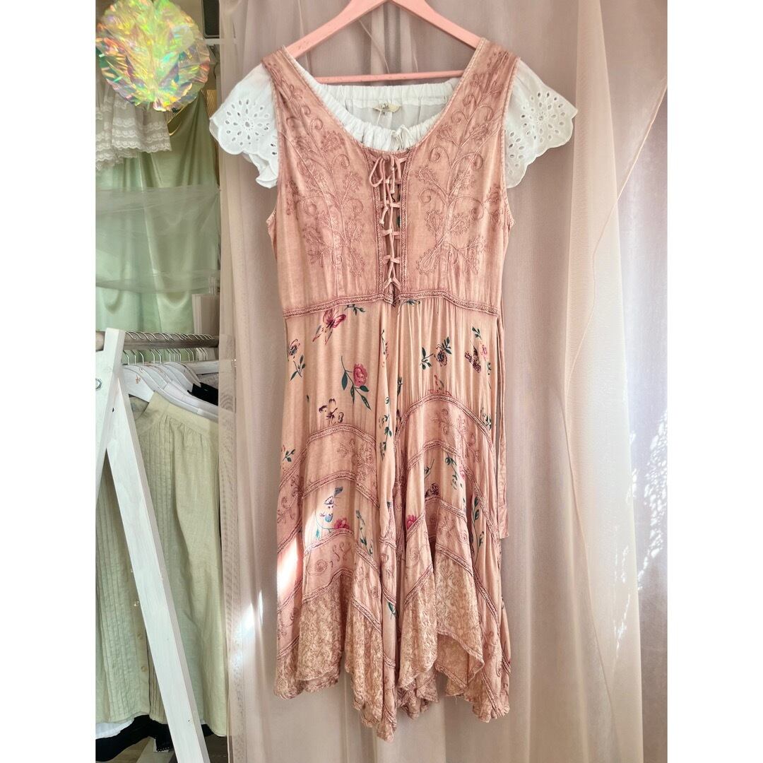 蝶々が舞っている花柄と刺繍が施された生地が段々になったスカート部分は華やかでデザインが凝っていて素敵です。