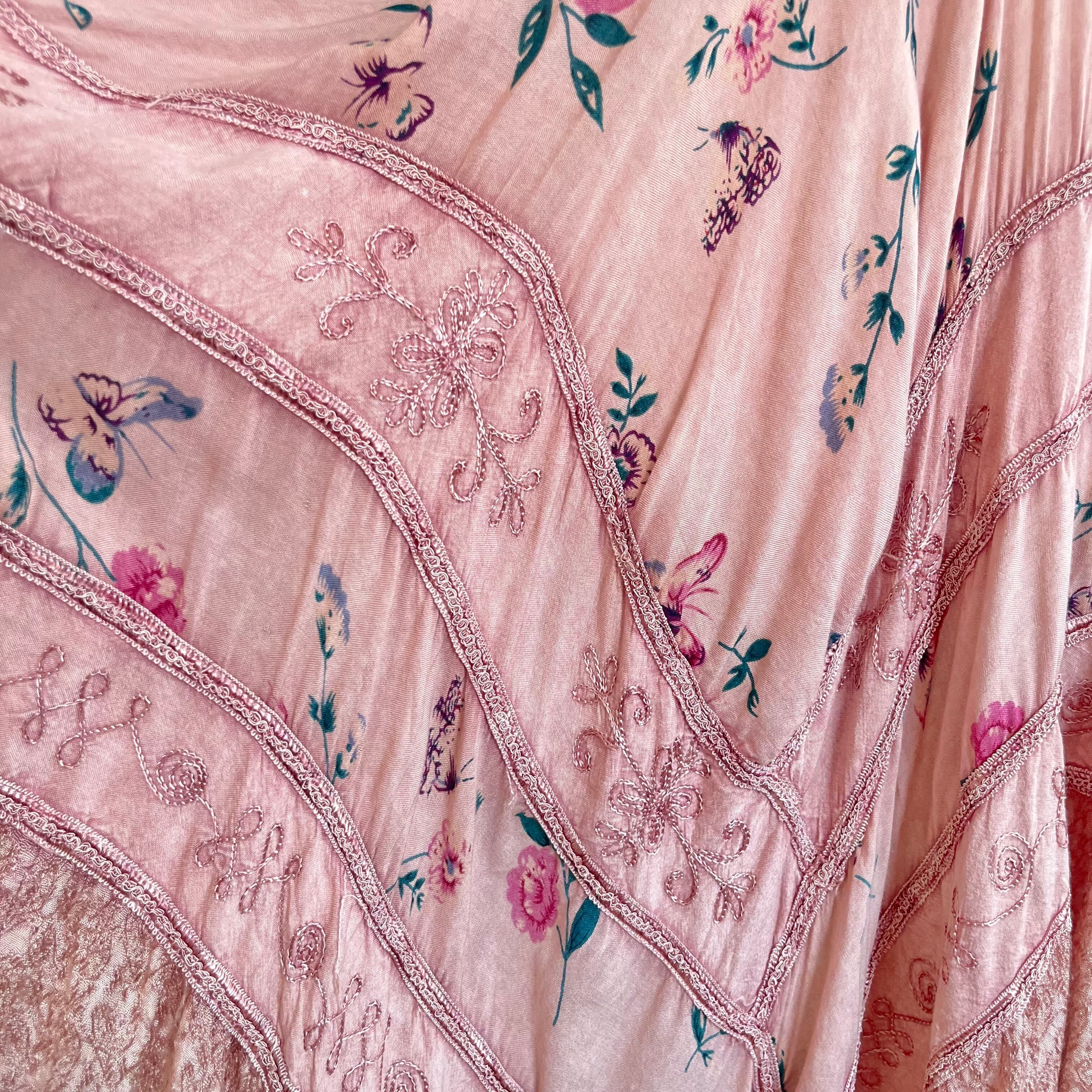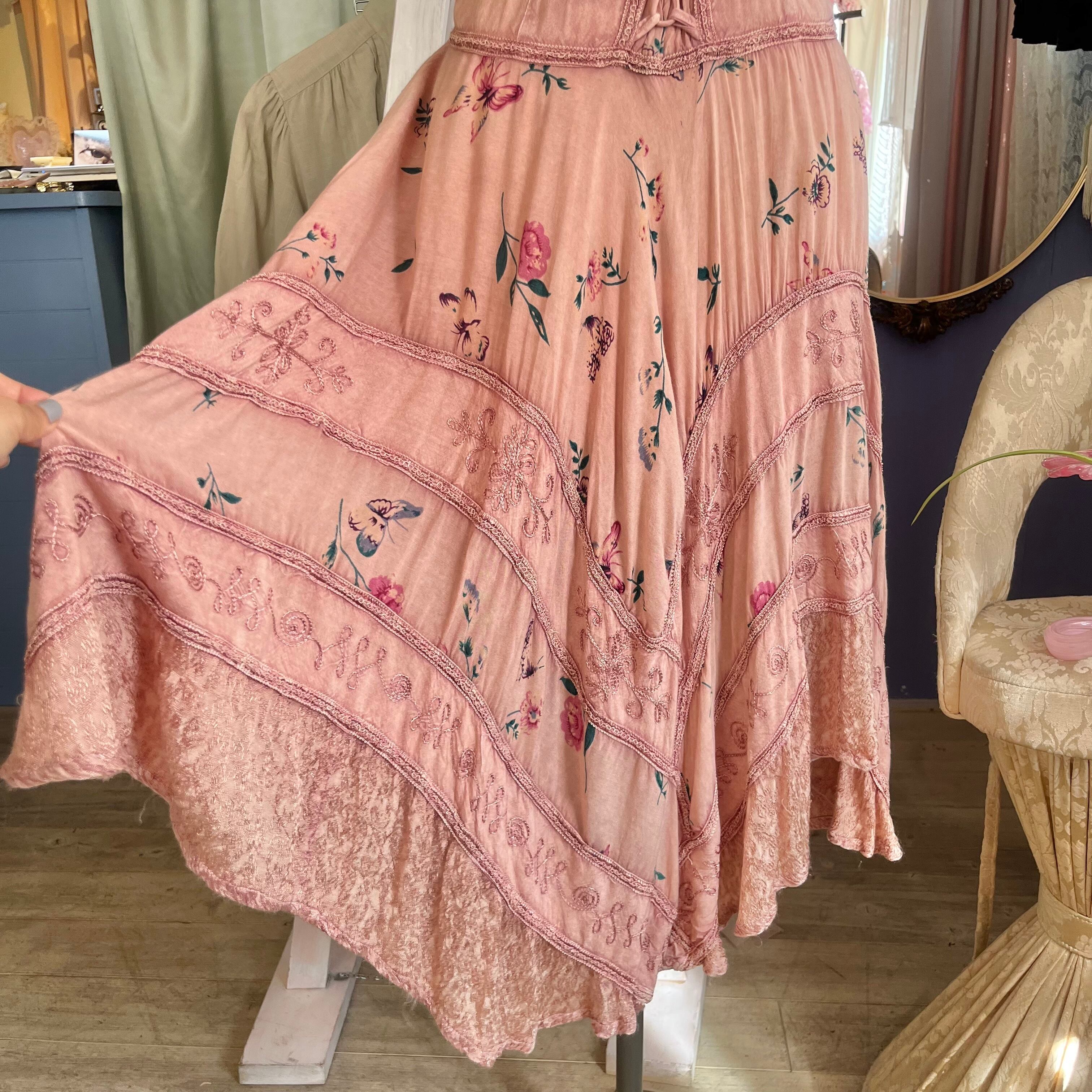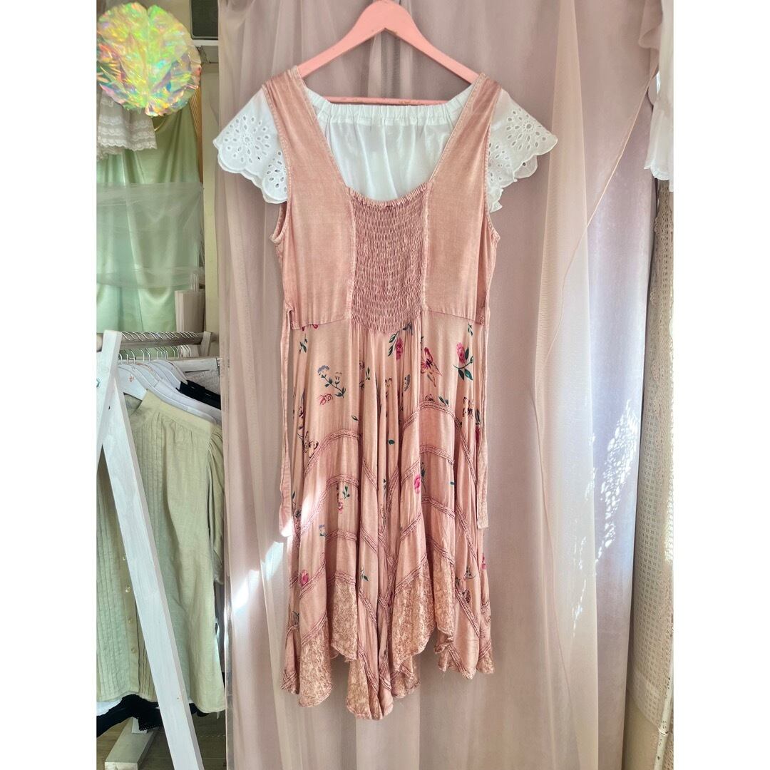 蝶々が舞っている花柄と刺繍が施された生地が段々になったスカート部分は華やかでデザインが凝っていて素敵です。