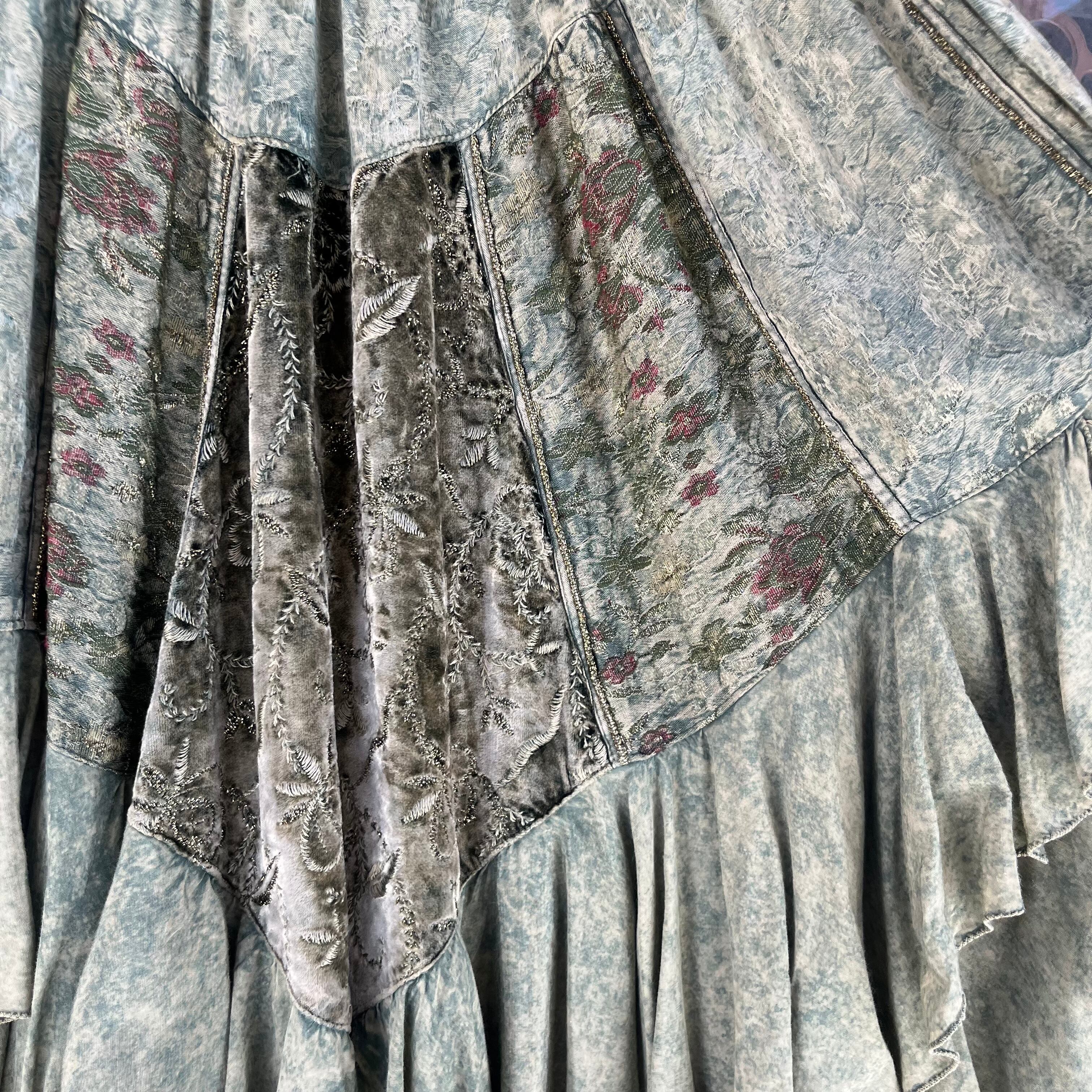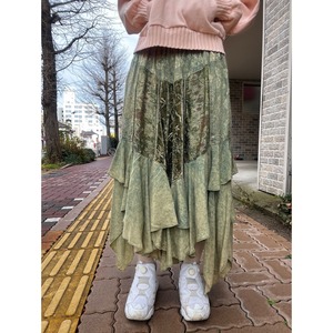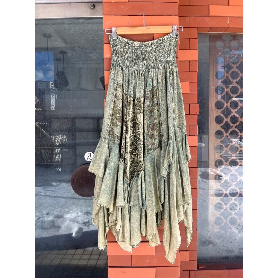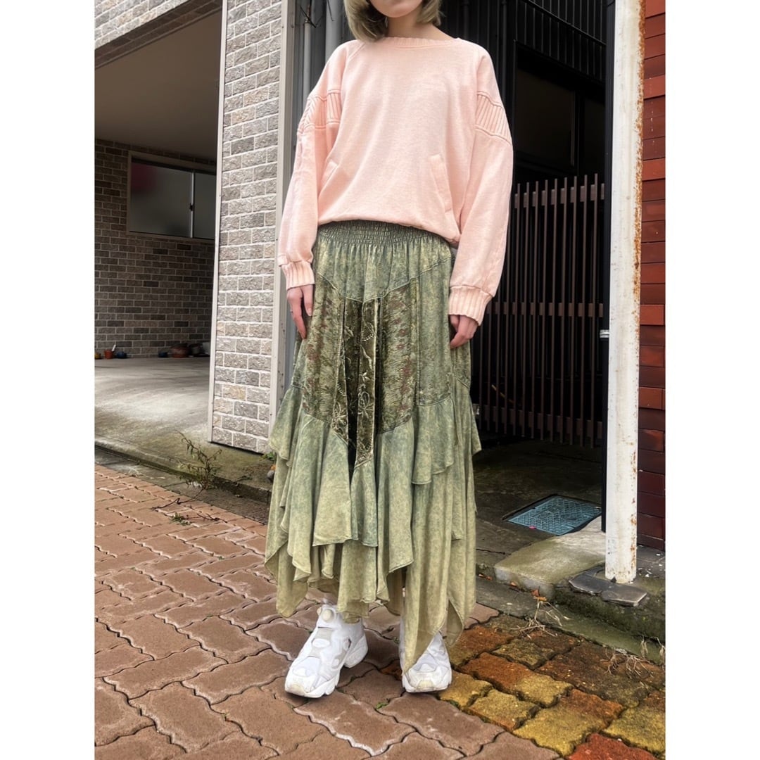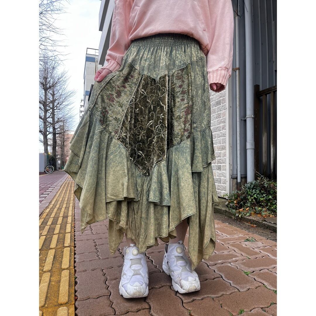 ふんだんに使われた生地が歩くたび足元で揺れて美しいお品。