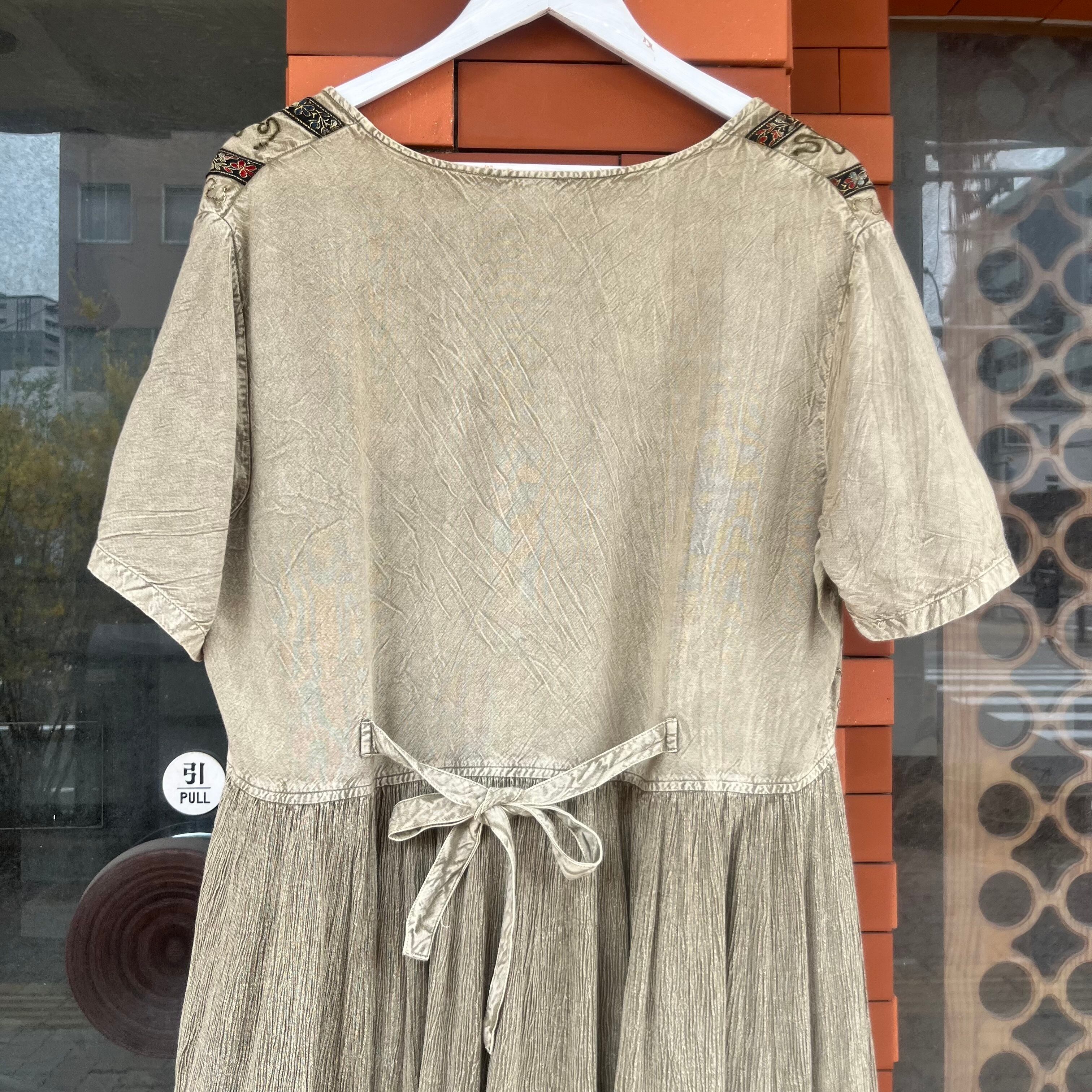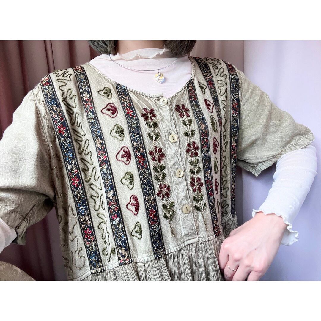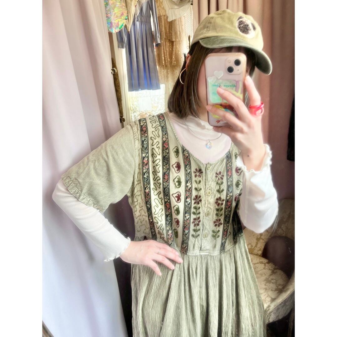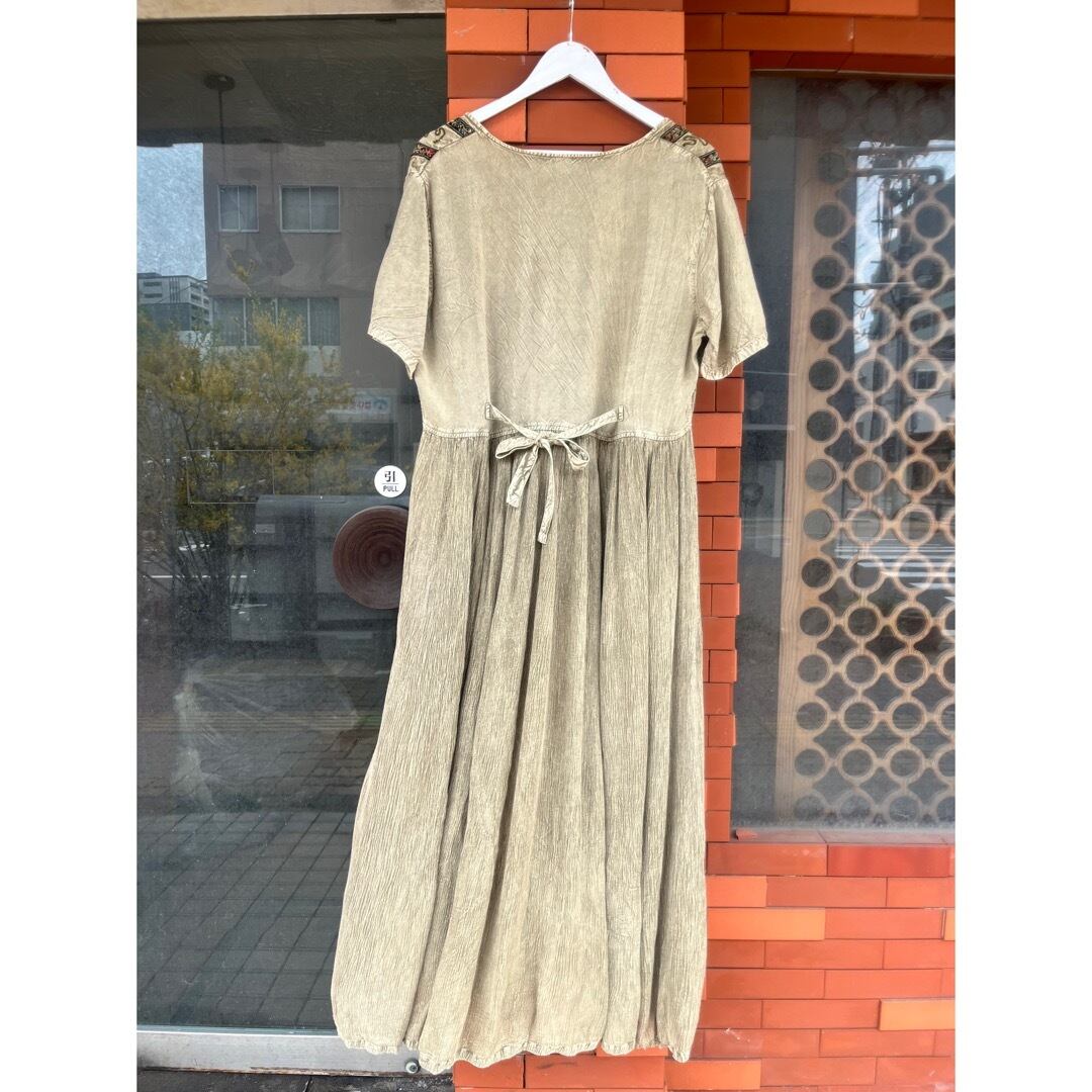グリーンのインディアンケミカルワンピース。まだらになったくすんだお色味でムードが感じられる一枚です。