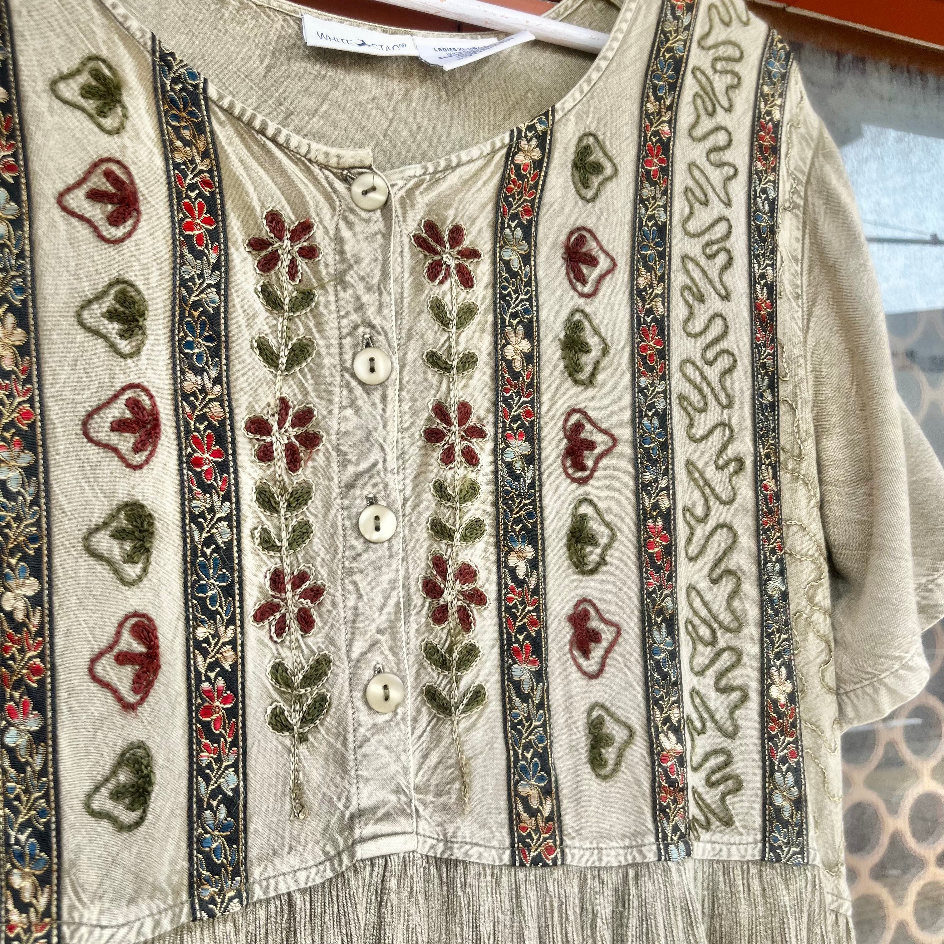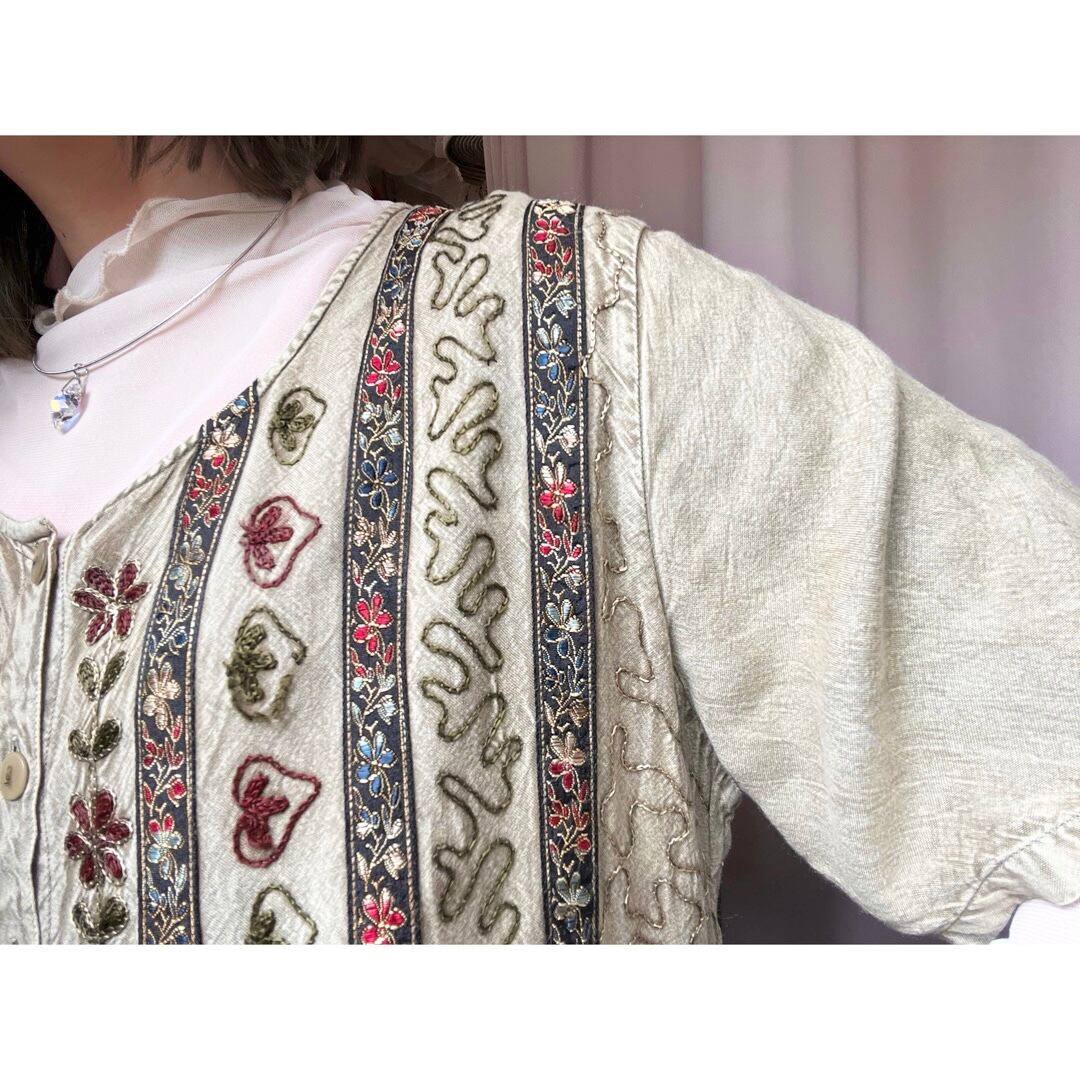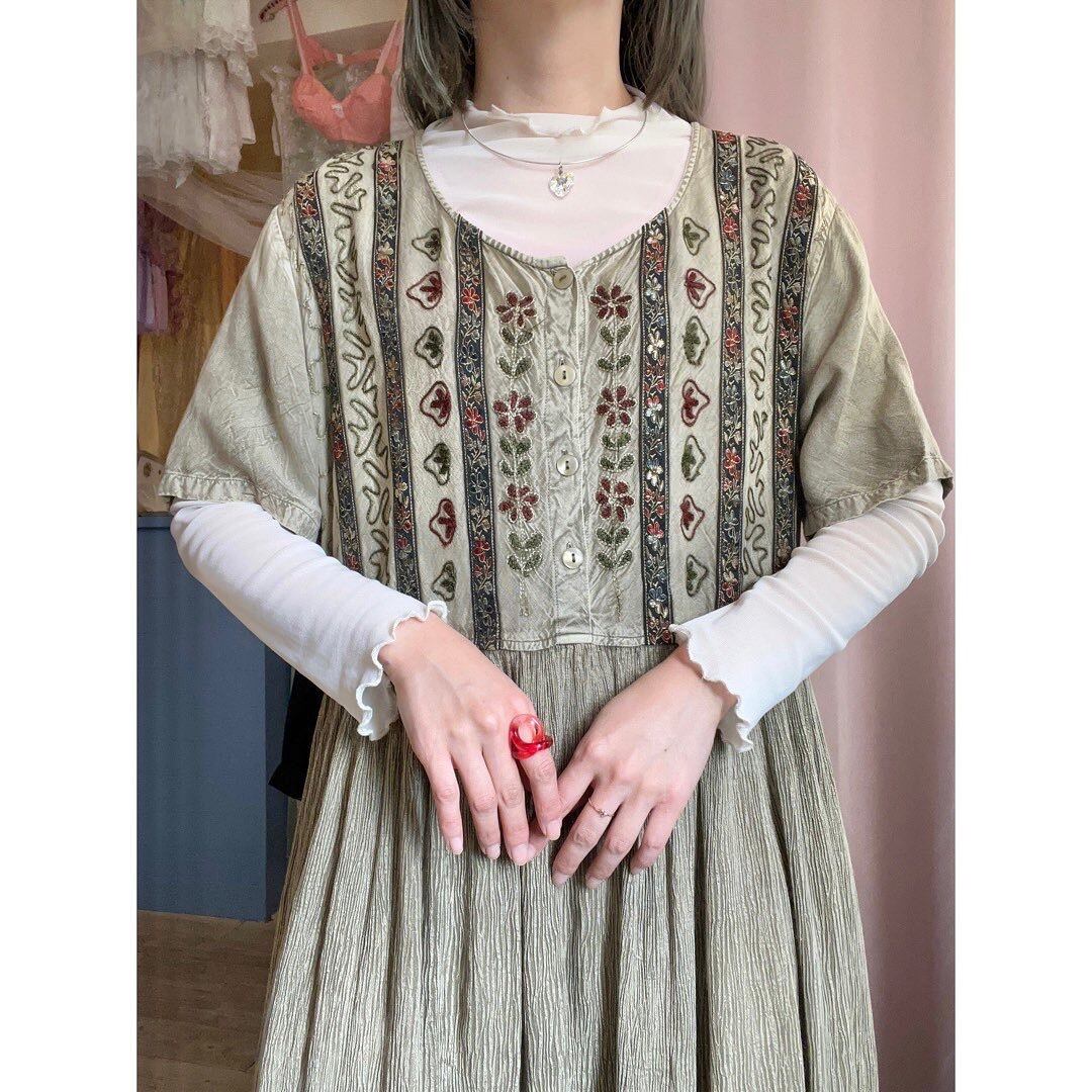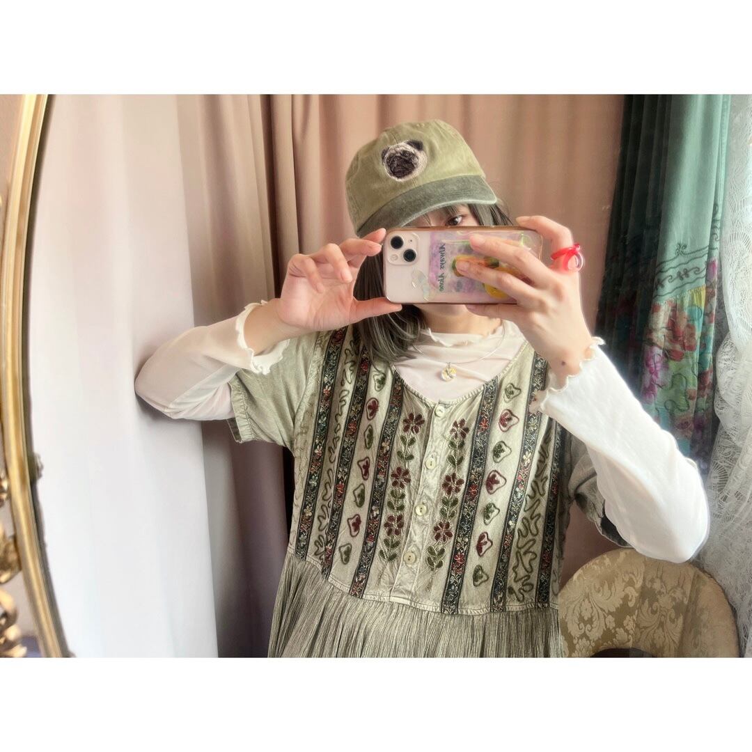グリーンのインディアンケミカルワンピース。まだらになったくすんだお色味でムードが感じられる一枚です。