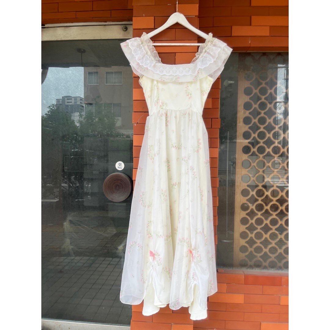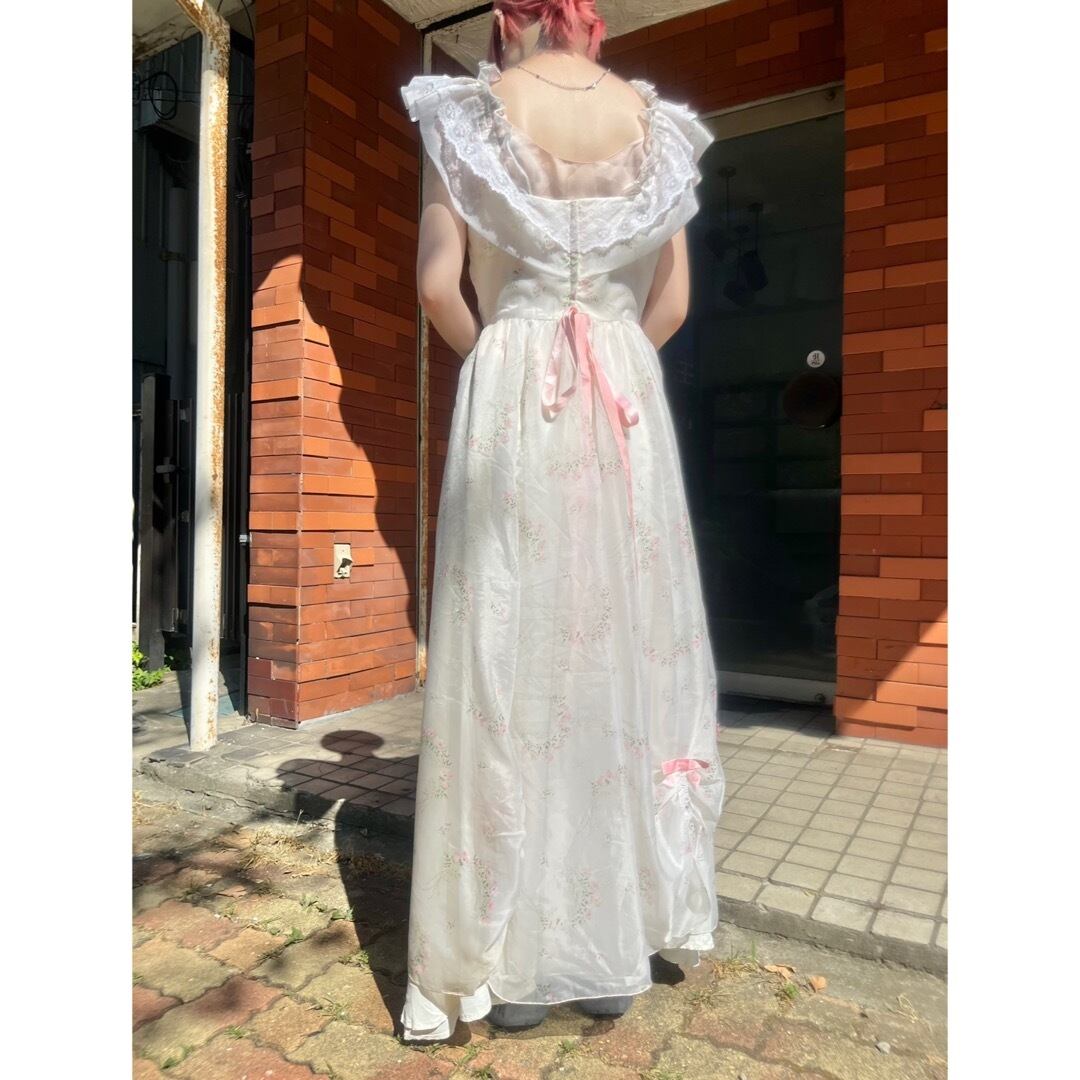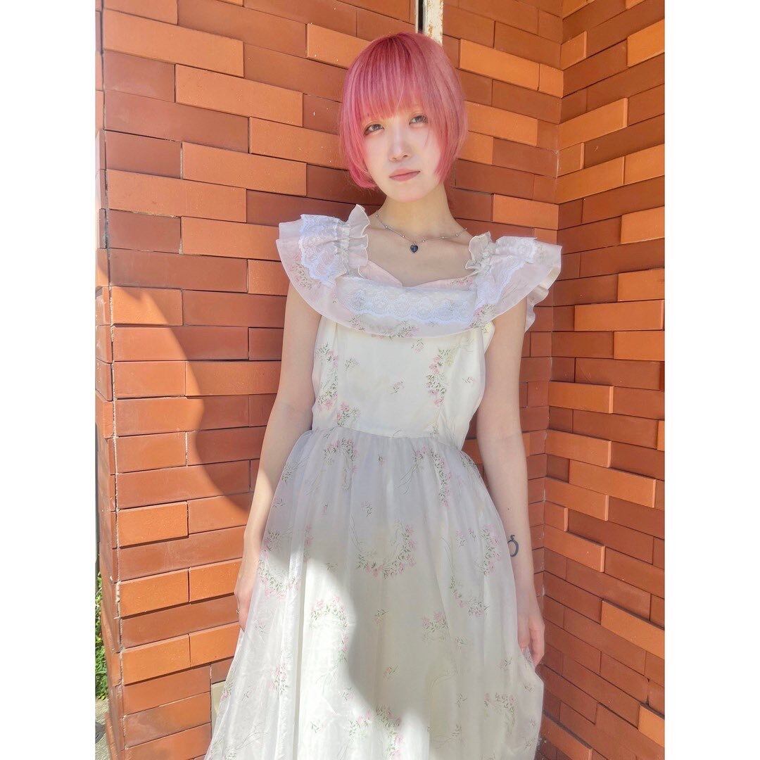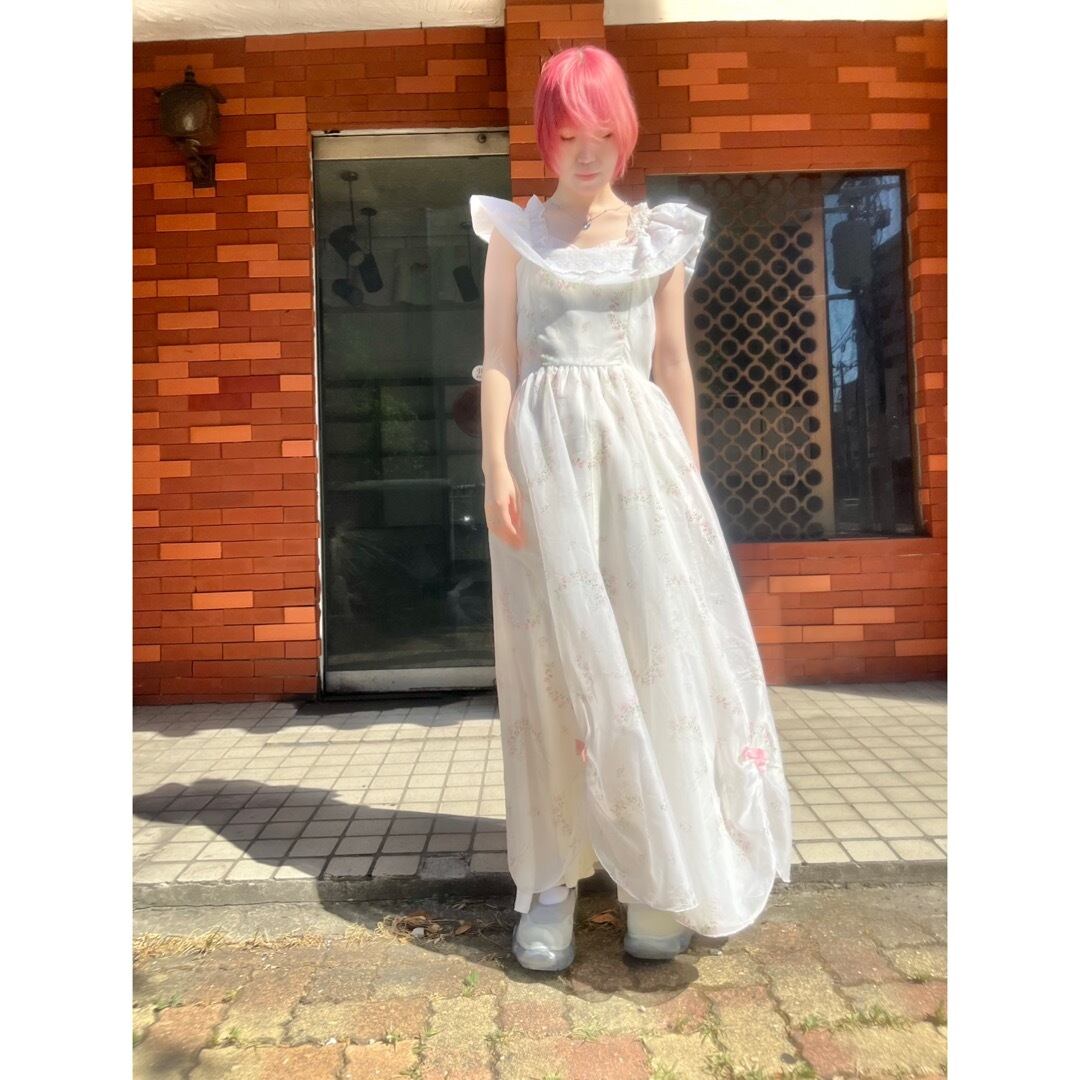 肩のフリルや生地をたっぷり使ったスカートが華やか。(裏地部分は両サイドが長く表地から出てみえるデザインです)