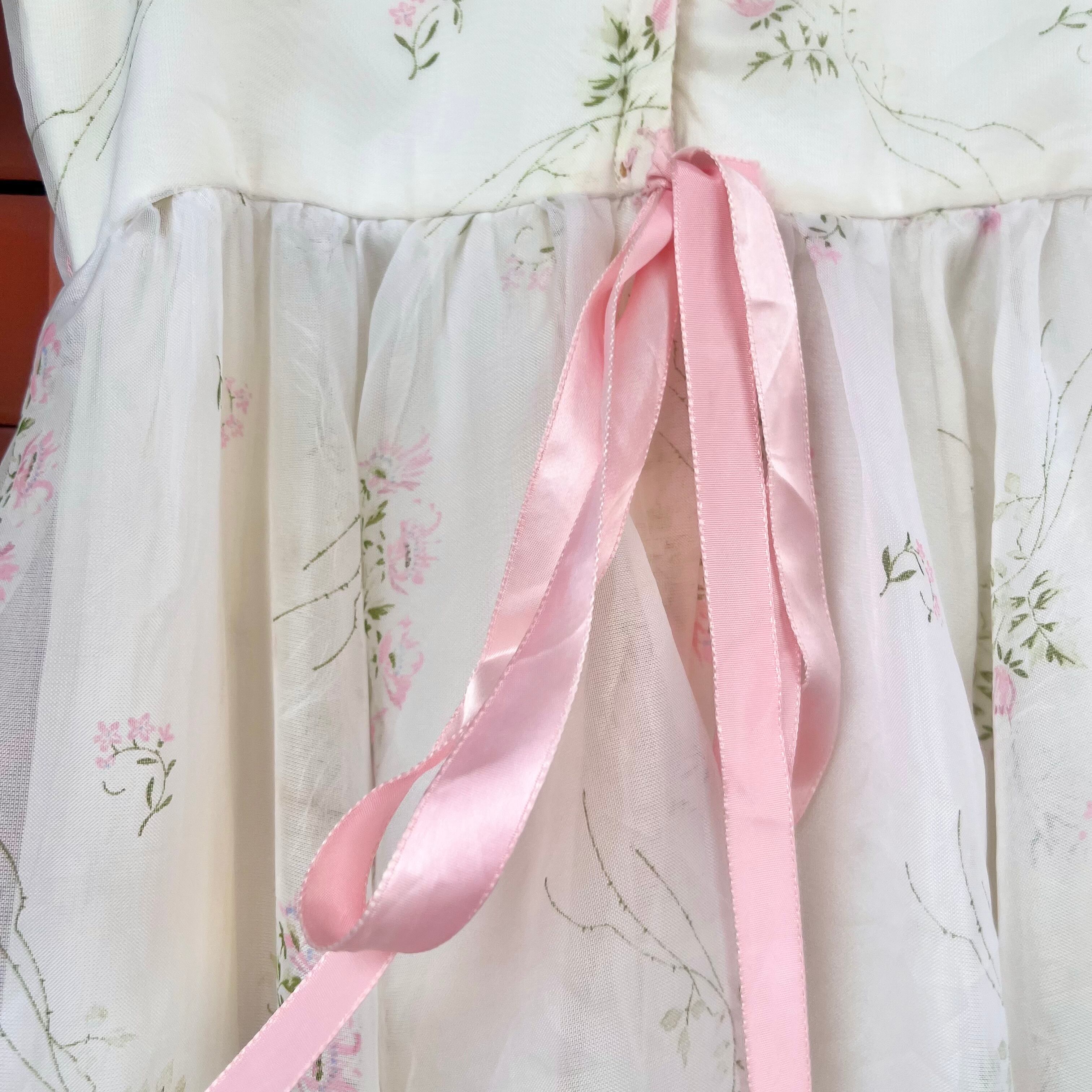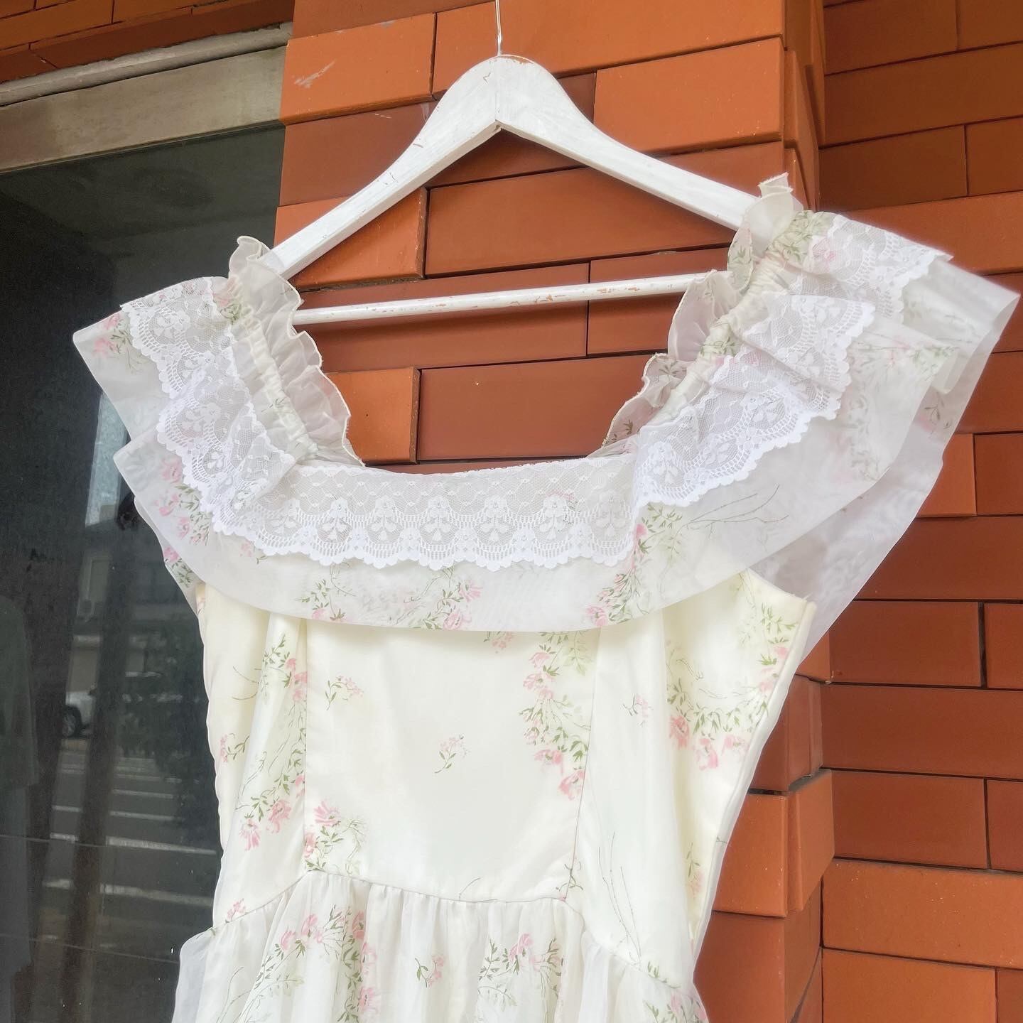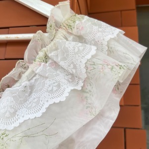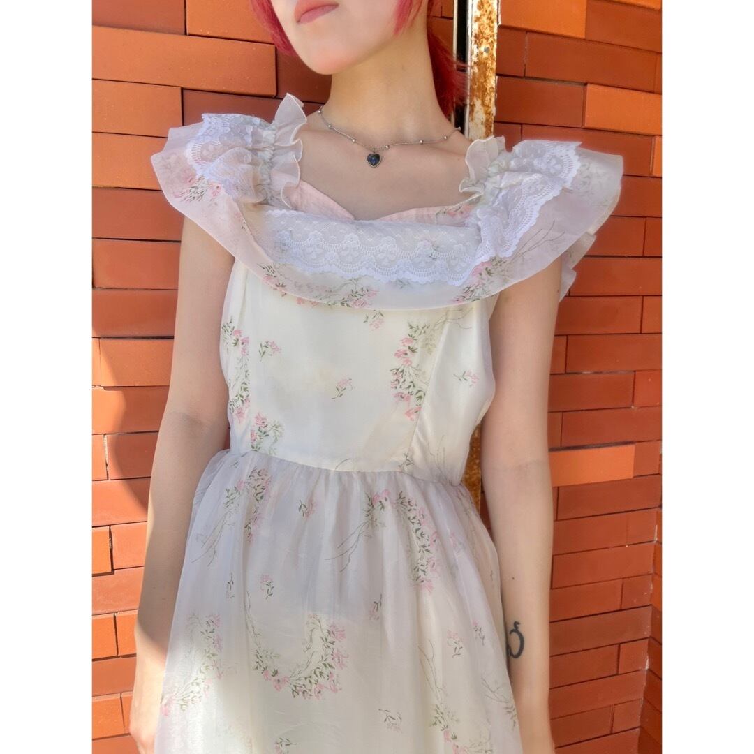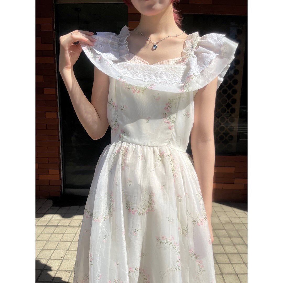 肩のフリルや生地をたっぷり使ったスカートが華やか。(裏地部分は両サイドが長く表地から出てみえるデザインです)